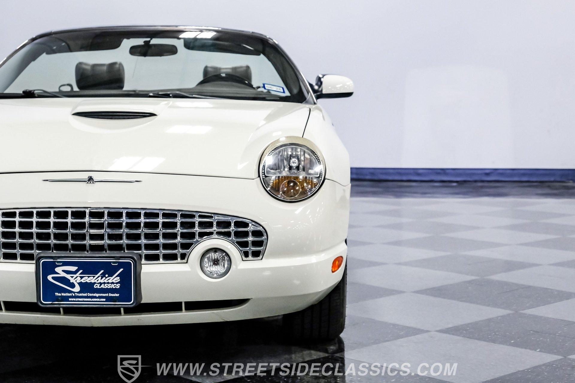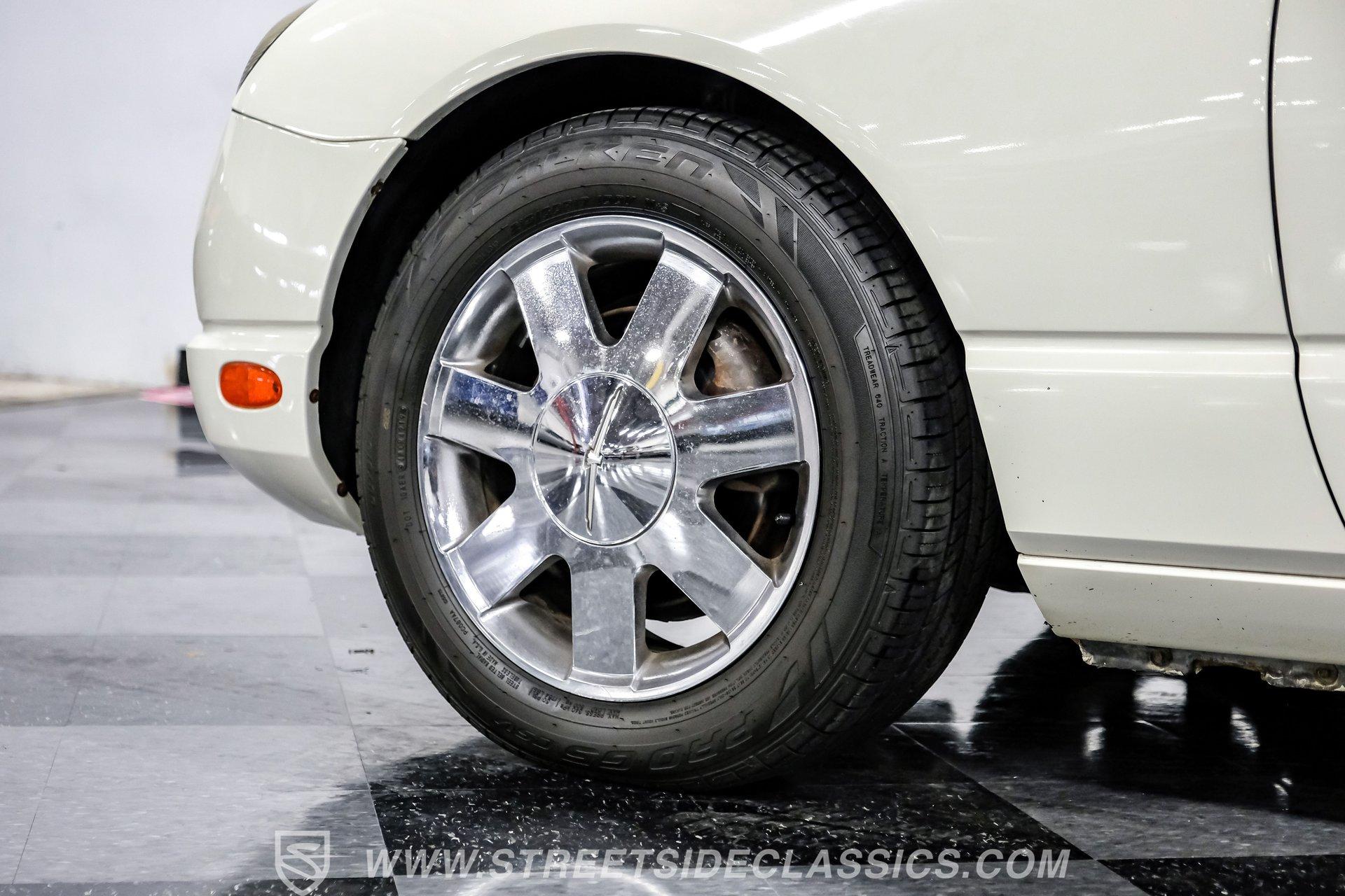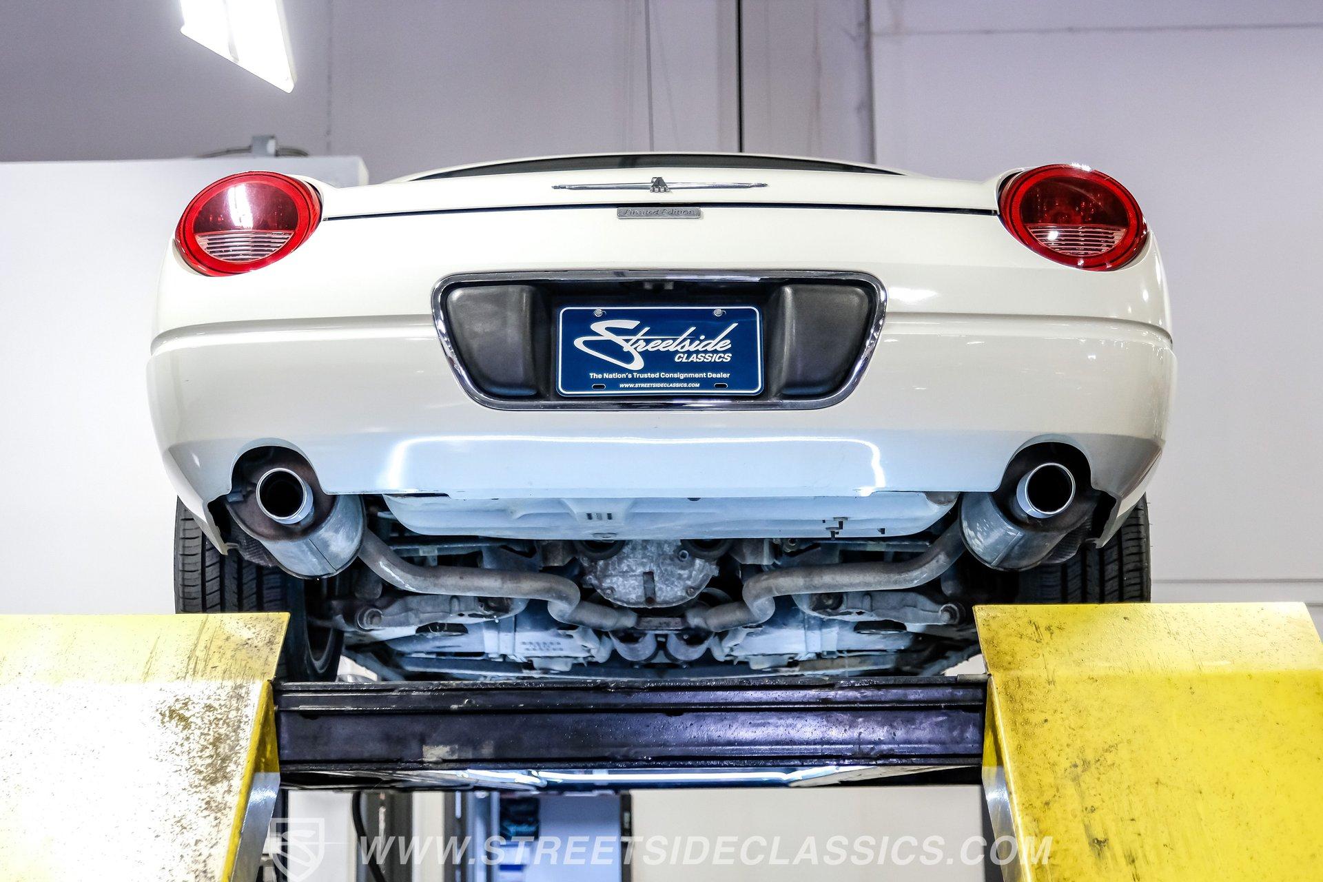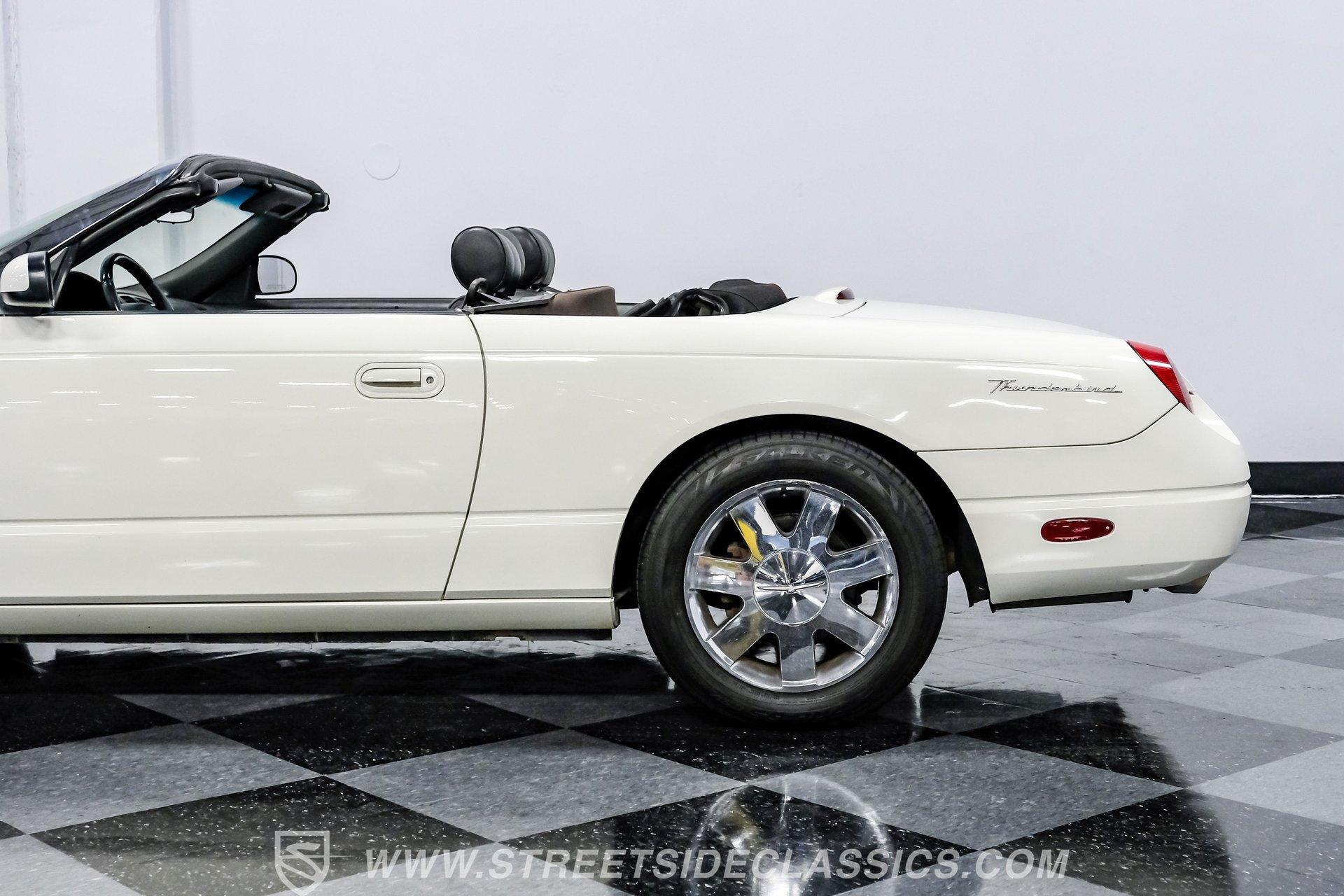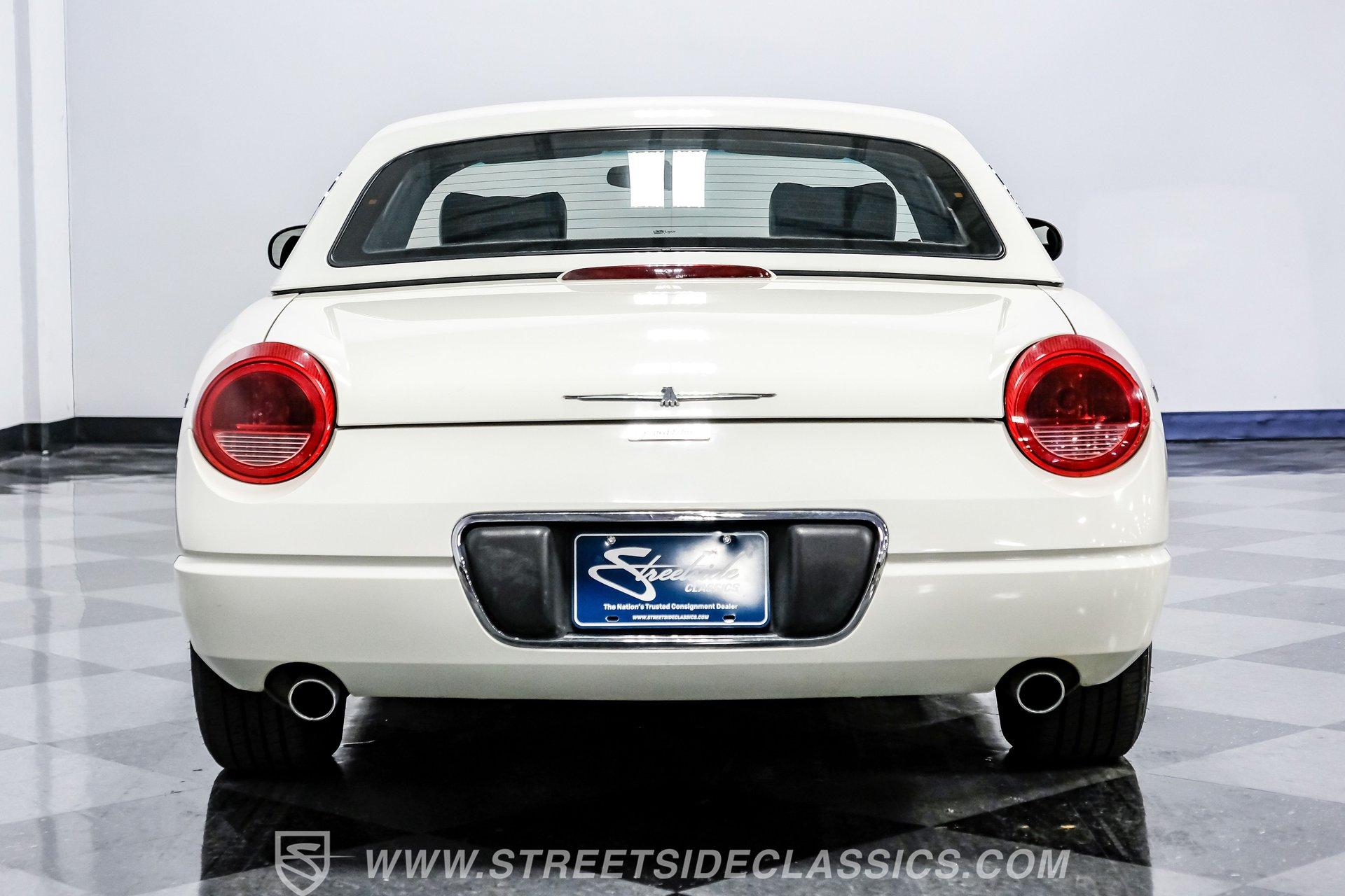 Cool style, luxurious features and proper V8 power are all what make this 2002 Ford Thunderbird awesome. The retro-cool look of this final generation Thunderbird has a timeless sense of style. Ford really took the time to integrate the best elements of the first-generation Thunderbird into this design. It can be seen in the long profile, hood scoop, subtle fender vents and afterburner-style tail lights. There are even great mirror-like brightwork elements, like the grille and the optional chrome seven-spoke factory alloy wheels. This generation Thunderbird, finished in Whisper White with a Midnight Black interior, features automatic A/C climate control and heated seats, allowing you to drive comfortably with the top down nearly all year round. This car was created to be a terrific cruiser loaded with power windows, power locks, keyless entry/alarm, dual front airbags, a premium AM/FM/6-CD changer stereo and cruise control. The leather seats feel comfy and have a well-respected style with the kind of use that goes with pride of ownership. The power driver's seat gets you in the right position to really see nice details such as the steering wheel's classic turquoise streak in the Thunderbird logo that is coordinated with the needles on the gauges. While the looks of the car are meant to be retro-cool, the engine bay is a pure modern motor. It is a fuel-injected DOHC 3.9-liter V8 that fires up readily, idles smoothly and delivers plenty of power when you want it, making it the ideal smooth cruiser from day one. You will love using this Thunderbird to drive near or far with its smooth five-speed automatic transmission, power steering, four-wheel disc brakes and fully-independent suspension. HIGHLIGHTS: First Year of the Last Generation of Thunderbirds Fuel-Injected DOHC 3.9-Liter V8 Automatic Transmission Factory Stereo with 6-CD Changer Air Conditioning Heated Seats Removable Hardtop Black Folding Soft Top Owner' Manual Power Windows Power Driver Seat Power Locks Factory Chrome 7-Spoke Wheels This may look like a vintage car, but this 2002 Ford Thunderbird certainly has modern moves. Call today!