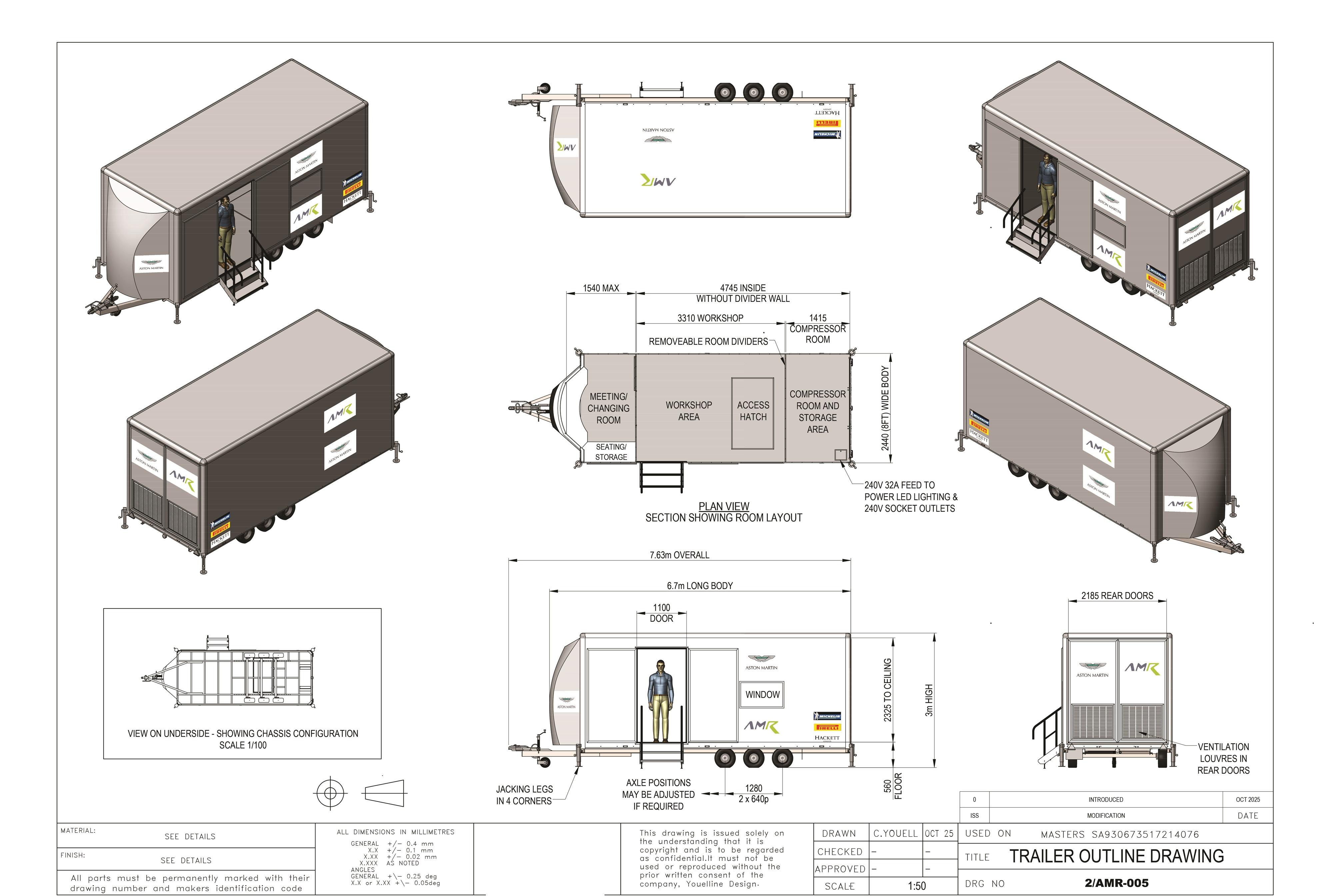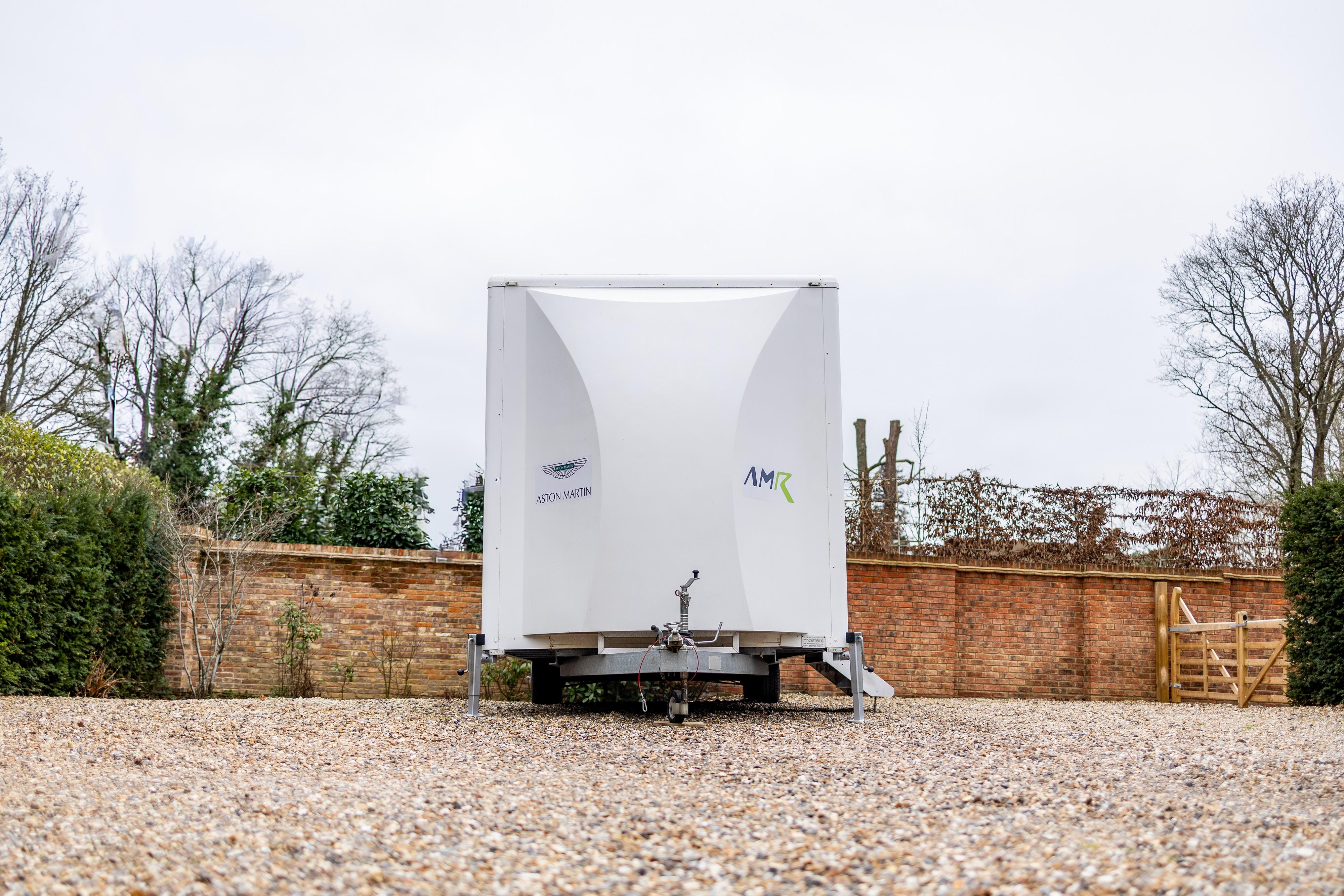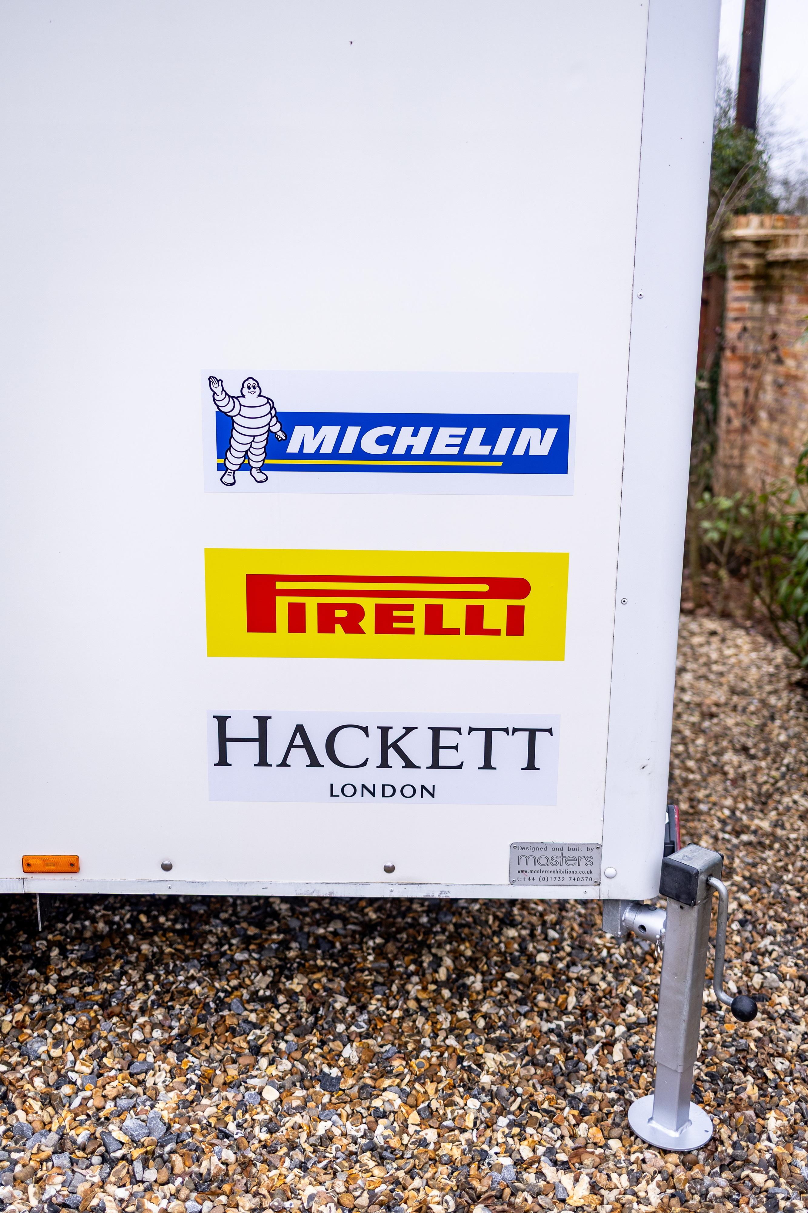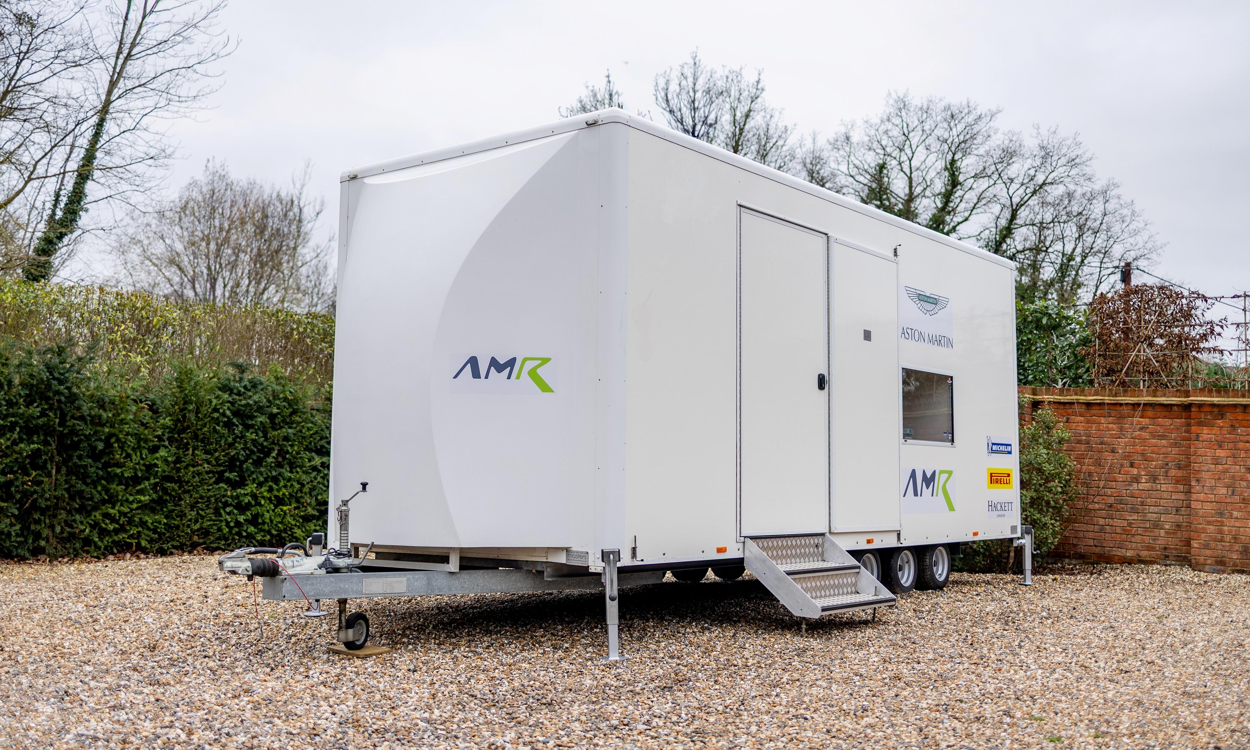 CAD drawings and 3D models are supplied to assist with any future modification or redesign. The trailer is constructed on a tri-axle chassis with adjustable axle mounting positions. Electrical provision includes a 240V / 32A hook-up and LED lighting throughout. New locks are fitted and the trailer is supplied with a full spare key set. Included are a portable stair access system for the pedestrian side door, four corner stabilising jacks, and a new spare wheel and tyre. The trailer has seen very light use and presents in clean, well-maintained condition, with the Aston Martin Racing livery remaining in excellent order. The interior height allows for racking or tyre storage installations, and the trailer is suitable for towing by larger 4x4 vehicles or light HGVs, depending on configuration, and is supplied with a Safety Inspection and Maintenance Report issued by the RHA in October 2025 and Tachodisc inspection certificate September 2024. Consigned by Mathew Priddy