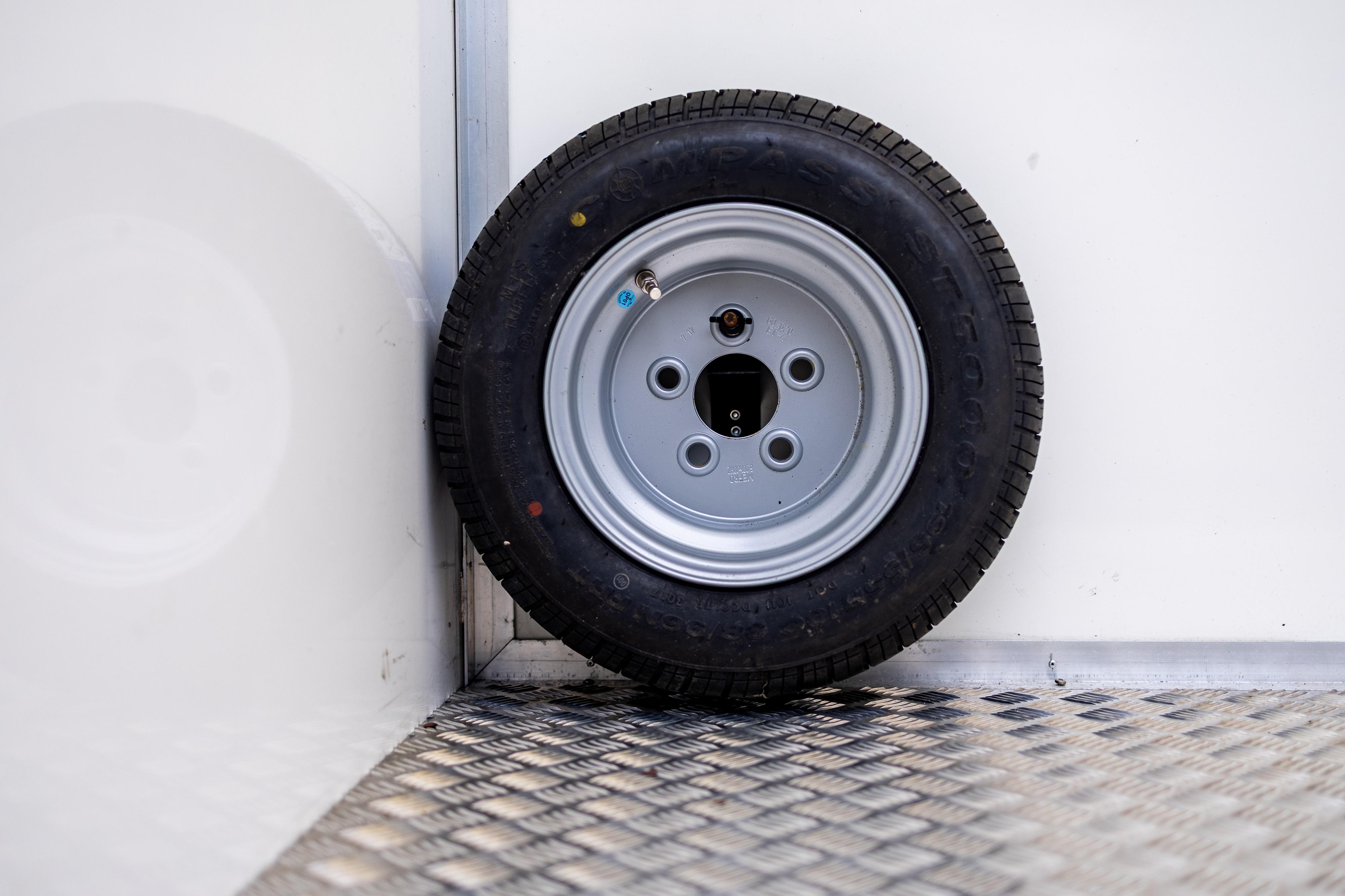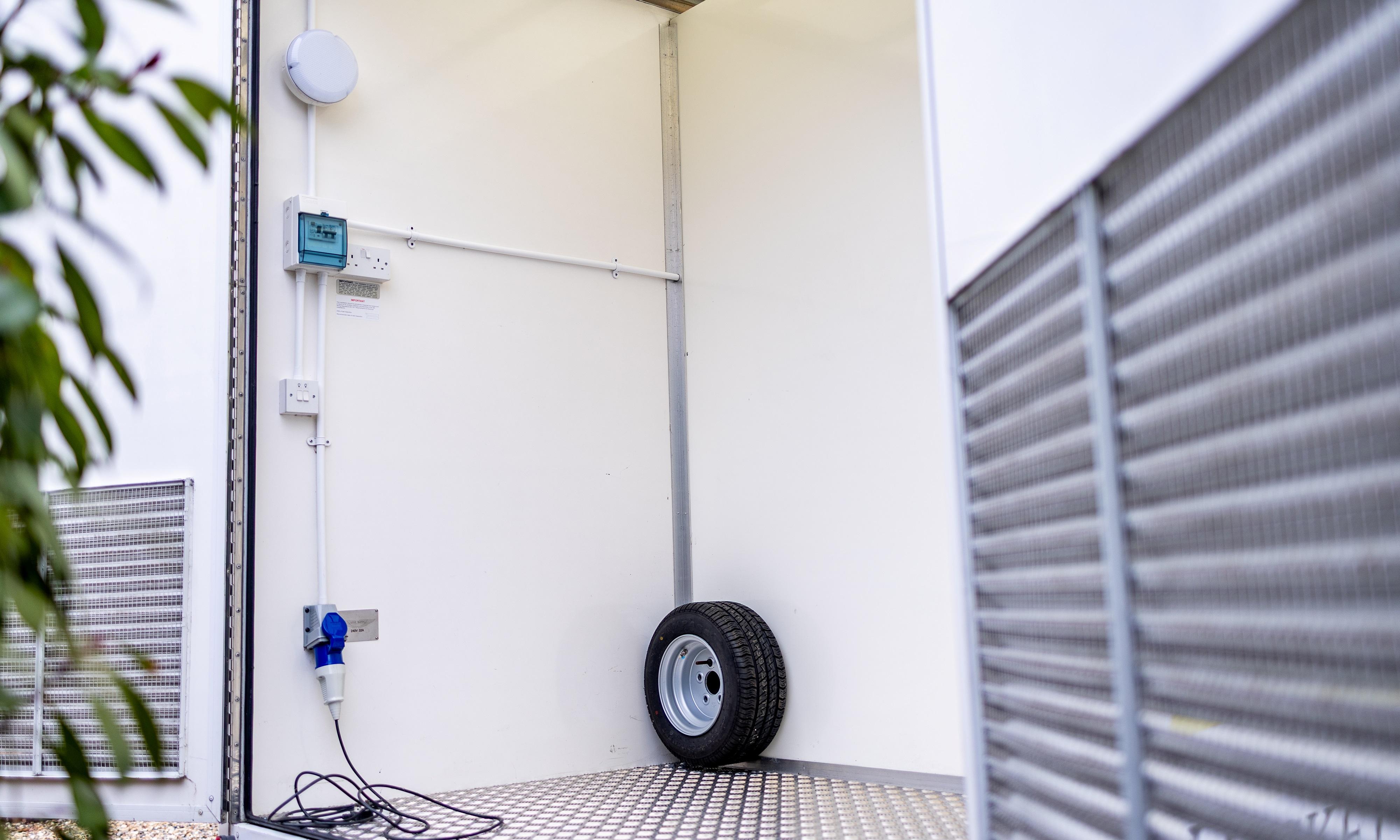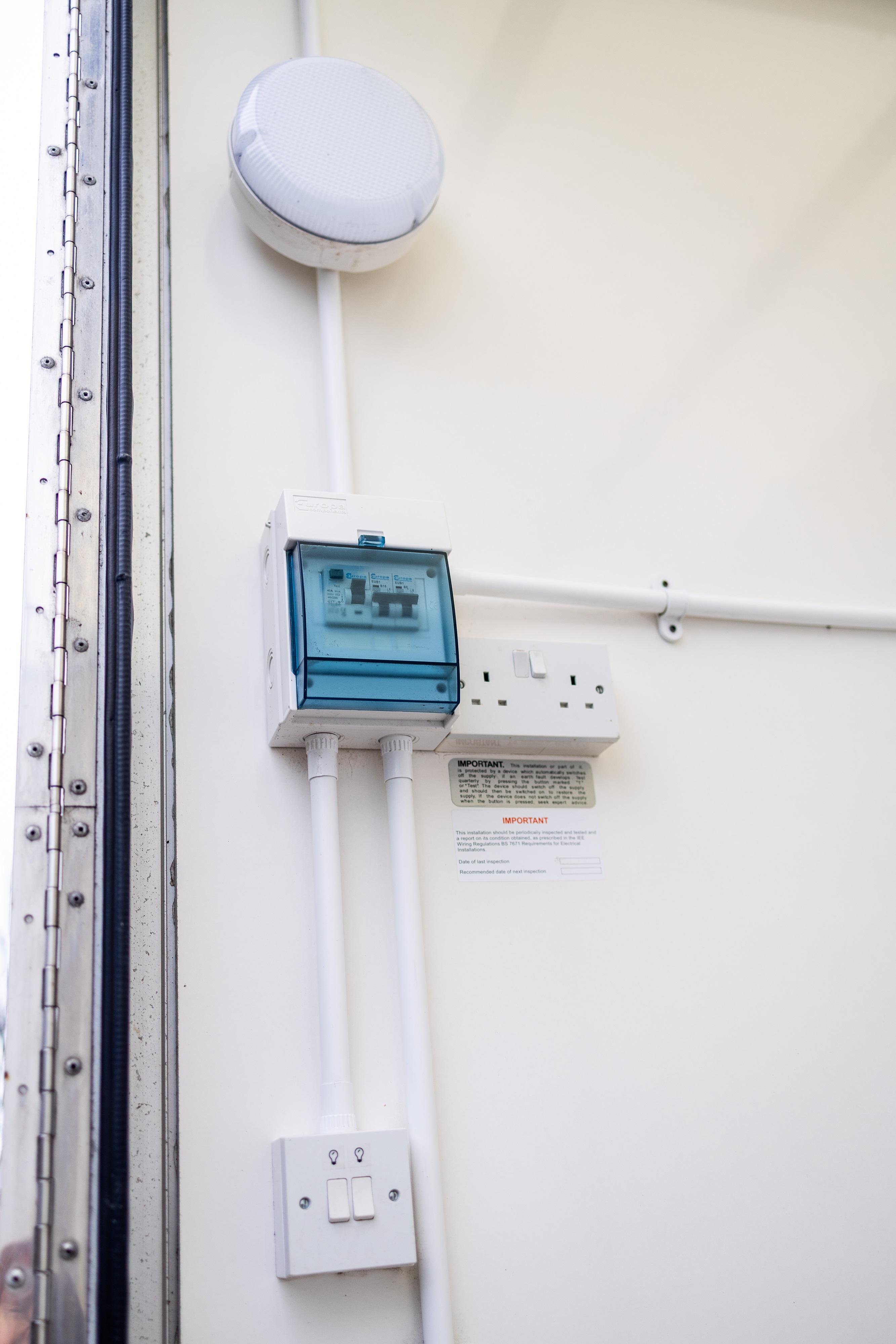 The interior is arranged into three distinct compartments. At the front is a changing and briefing room fitted with bench seating, coat hooks and a full-length mirror, together with ample overhead and under-bench storage. This area is suitable for driver preparation, kit changes or team briefings and is capable of accommodating portable climate-control equipment if required. The central section forms the main workshop area and benefits from a large external glazed window providing natural light. LED lighting is fitted throughout, along with multiple 16A twin electrical sockets. Two integrated bench seats incorporate internal helmet storage, creating a practical working environment for vehicle preparation, maintenance or equipment management during events. To the rear is a compressor and utility compartment, accessed via lockable louvred double doors measuring approximately 2.4 metres in width. This area currently houses a new spare wheel and tyre and includes an access hatch for external power connection.
