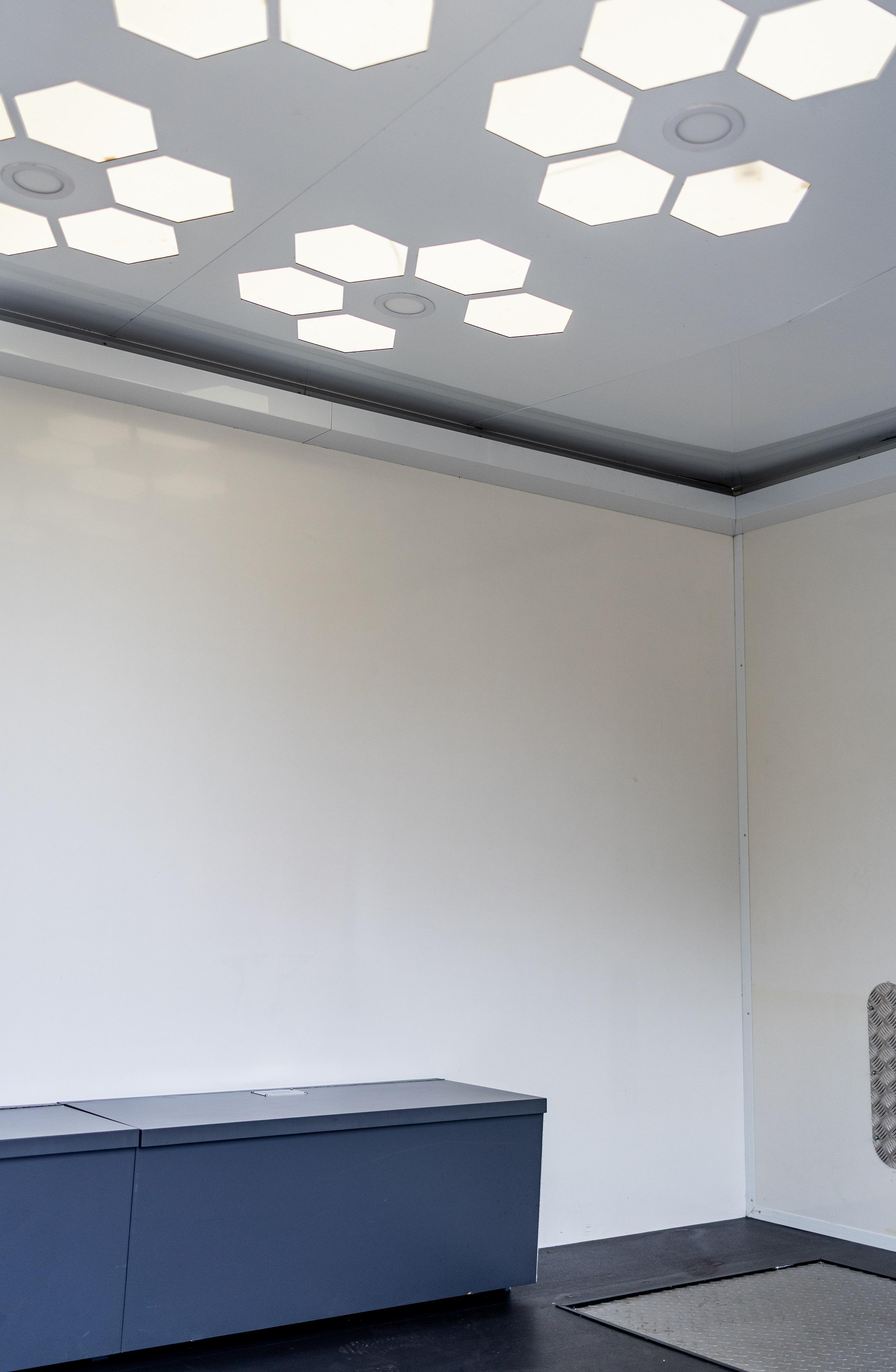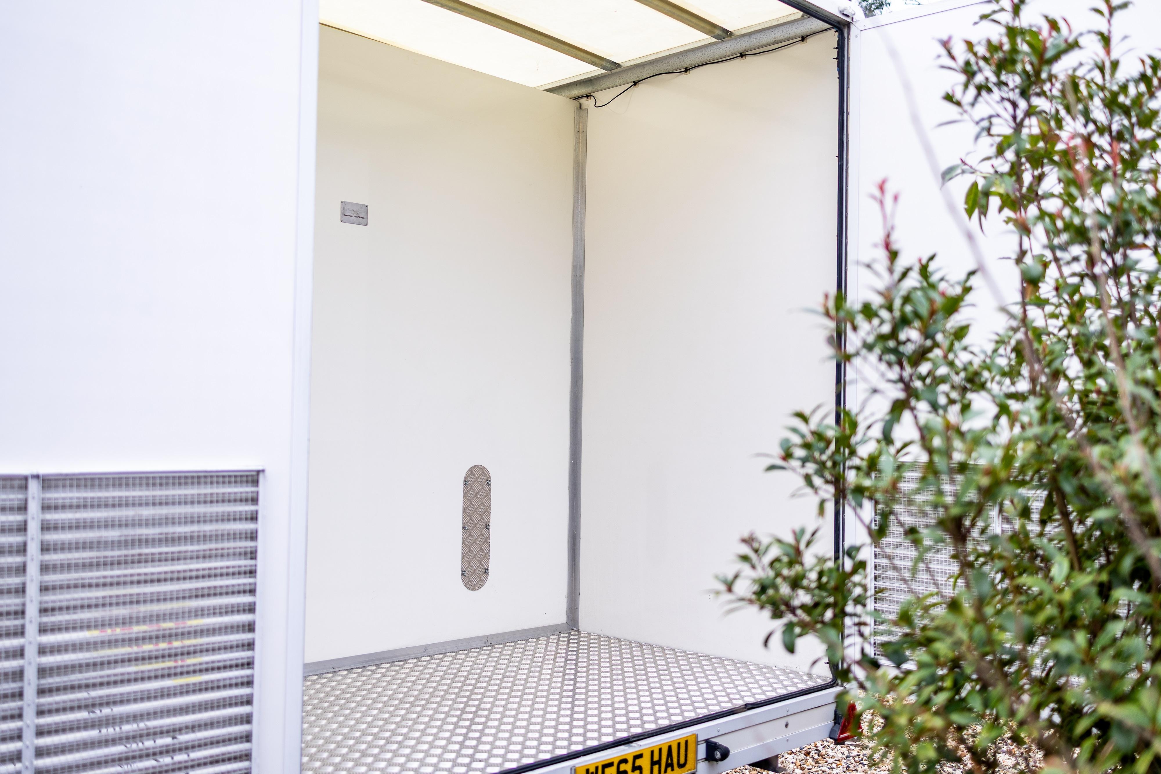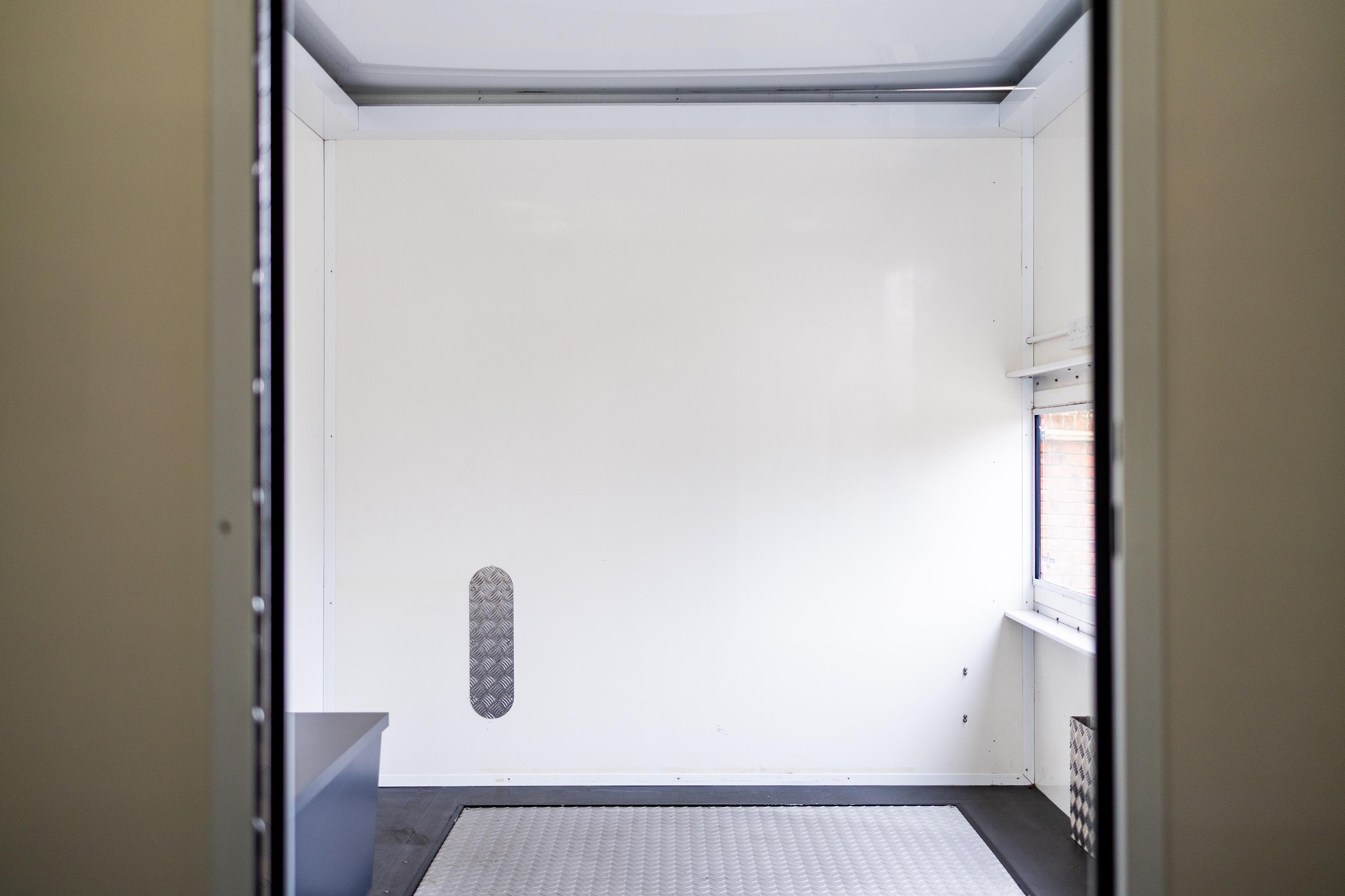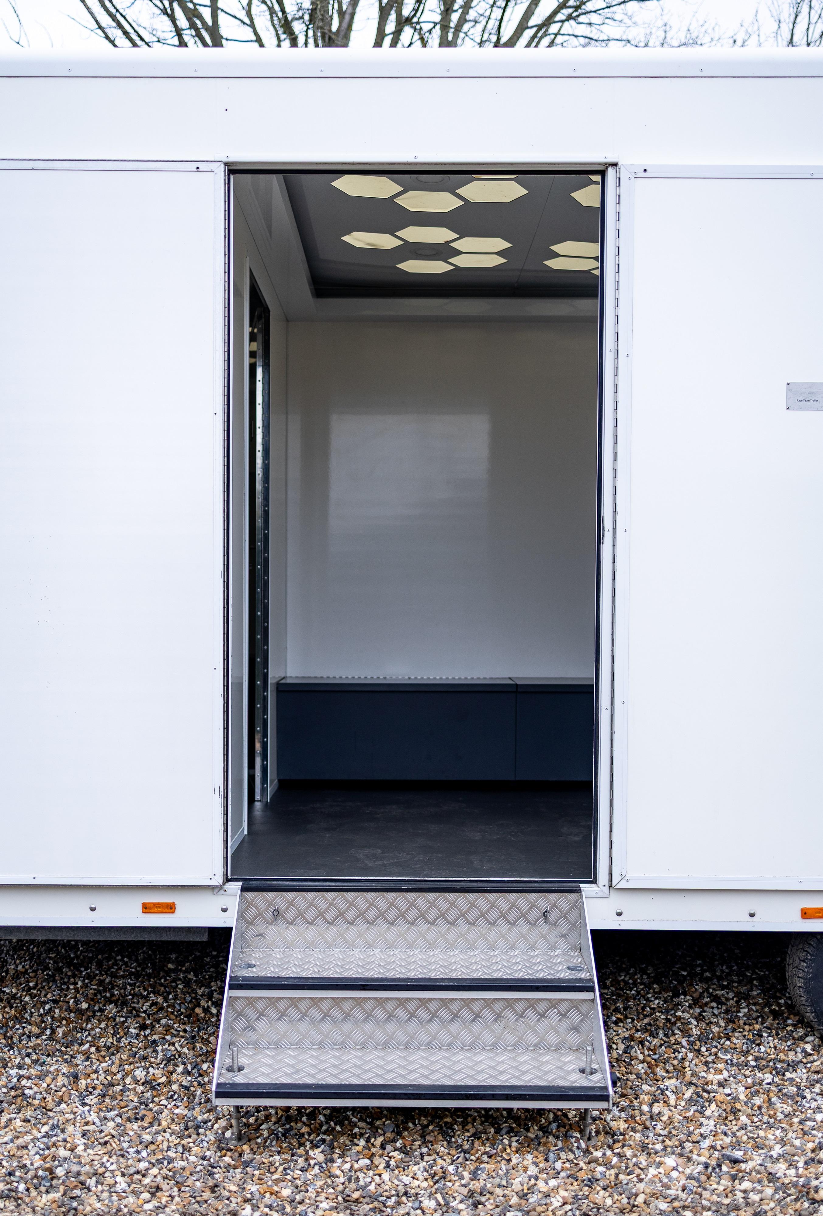 The internal partition between the workshop and rear compartment can be removed, allowing the creation of an enclosed internal vehicle bay measuring approximately 4.75 metres by 2.4 metres, suitable for transporting a GT, track or classic vehicle within the trailer. The flexible internal layout allows for alternative uses, including conversion to a mobile hospitality unit, team kitchen or rest area, tyre or heating storage pod, merchandising unit or mobile engineering facility.