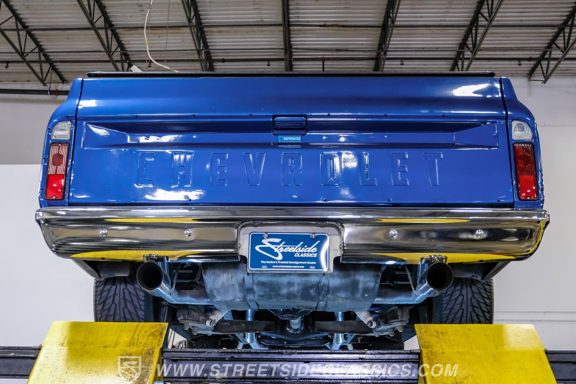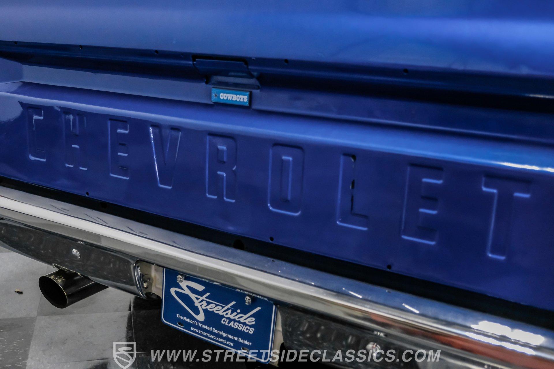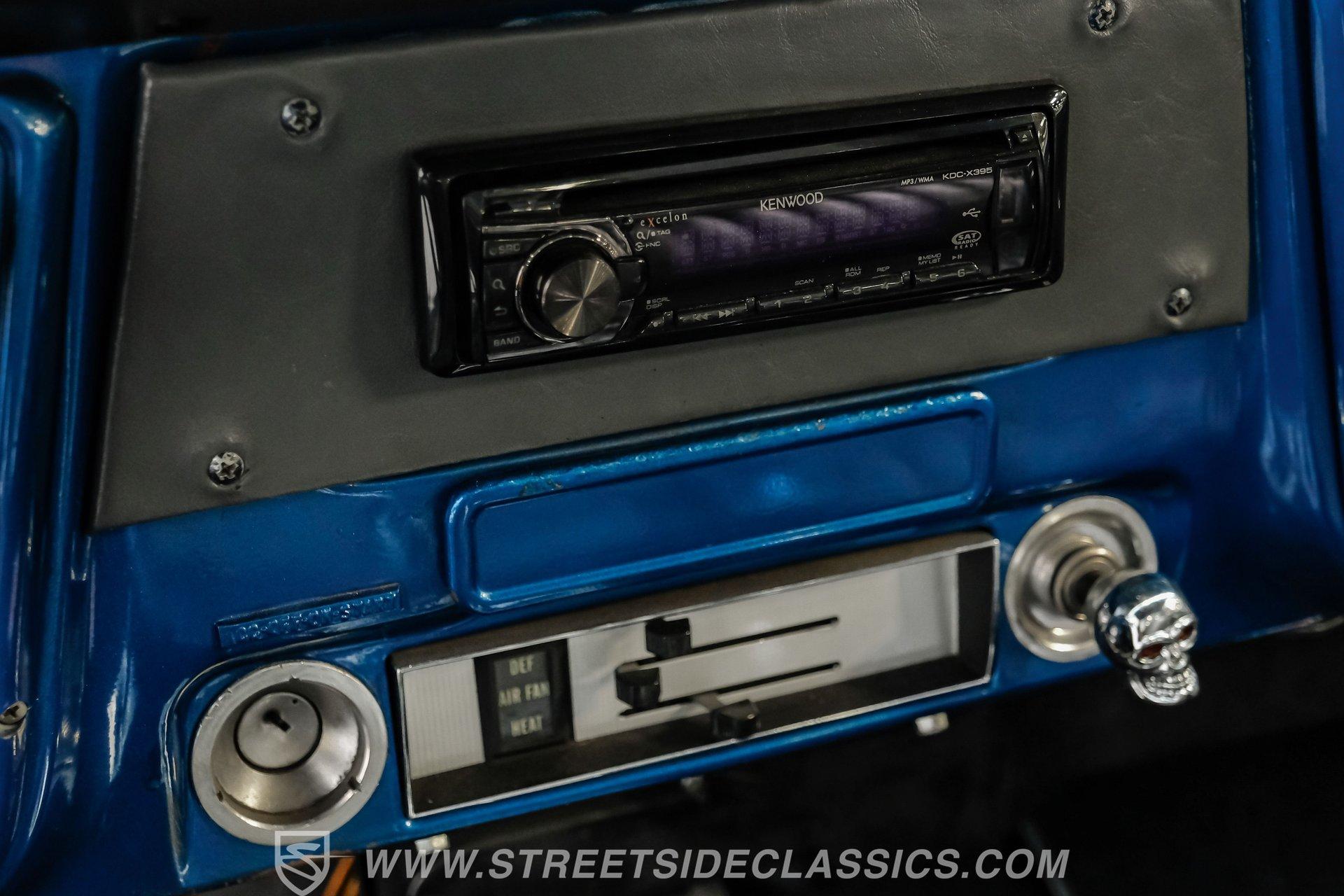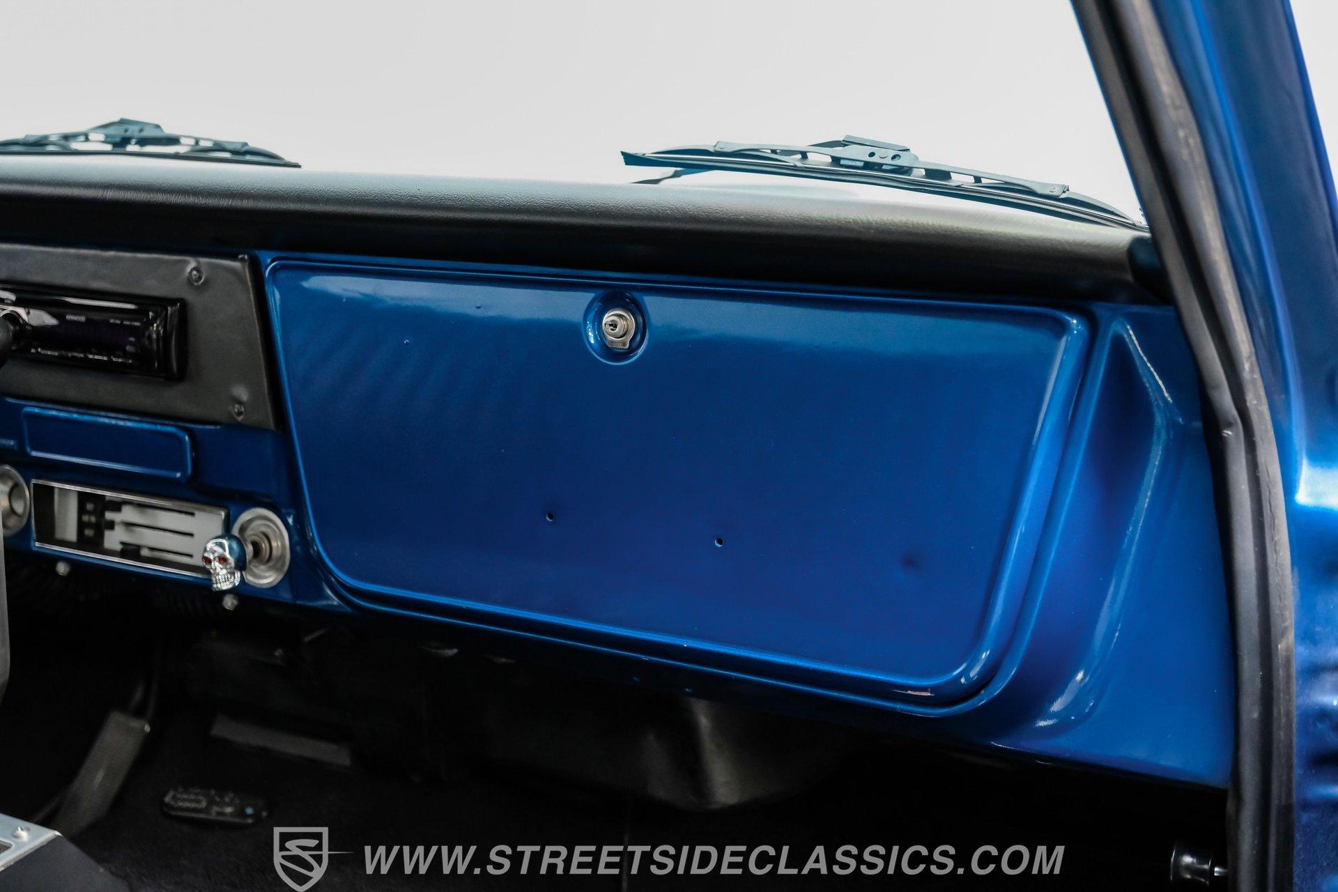 The 1971 Chevrolet C10 is a standout classic-part muscle, part utility, and full of American character. With its V8 rumble, iconic lines, and head turning presence, it captures the essence of a golden era. This example features an older blue repaint with chrome bumpers, a 1967 C10 front clip, and a lowered stance, offering vintage style with unmistakable personality. The interior features a factory-style black vinyl bench seat with added seat belts, Dakota Digital gauges that light up in cool blue, and a unique Kilduff ratchet floor shifter. Kick panels and floor mats have been upgraded for a fresh look, while a Kenwood single-DIN head unit with modern connectivity options keeps your favorite tunes rolling. Door speakers add to the immersive audio experience, making every drive an event. Under the hood, you'll find a robust 350 cubic inch V8, equipped with a Holley 4-barrel carburetor and Edelbrock intake. Paired with a TH350 3-speed automatic transmission and a healthy cam, this C10 offers plenty of muscle for the open road. Power steering and power brakes, including front disc and rear drum, provide confident handling, while a Magnaflow dual exhaust system delivers that unmistakable classic truck sound. HIGHLIGHTS 1967 C10 Front Clip 350 CI V8 Holley 4-Barrel Carburetor with Edelbrock Intake Manifold 3-Speed TH350 Automatic Transmission Power Steering Power Front Disc and Rear Drum Brakes 12-Bolt Rear Axle Lowered Factory-Style Suspension Chrome 17-Inch American Racing Wheels with Nitto Performance Tires Dakota Digital Gauges with Blue Backlighting Kilduff Ratchet Floor Shifter Kenwood AM/FM/CD/USB/Aux Head Unit "Realtruck Tuxedo" Vinyl Bed Cover Folder Of Receipts And Dyno Sheet Included Financing Available Vehicle Protection Plans Available Worldwide Shipping This 1971 Chevrolet C10 blends classic appeal with tasteful upgrades and a spirited V8, making it a fantastic choice for anyone seeking a standout pickup. Don't miss your chance to own a true American classic that's ready for the road and ready to impress. Call, email, or come visit our showroom today!