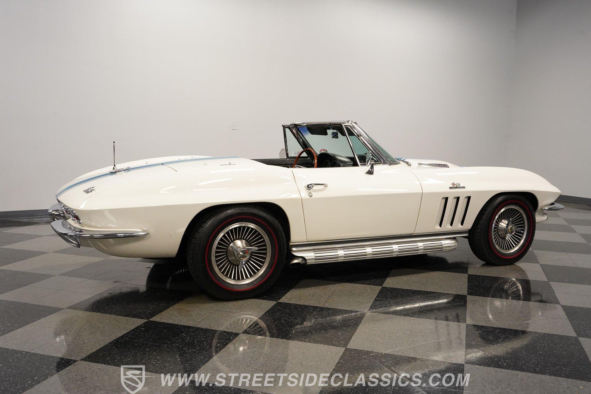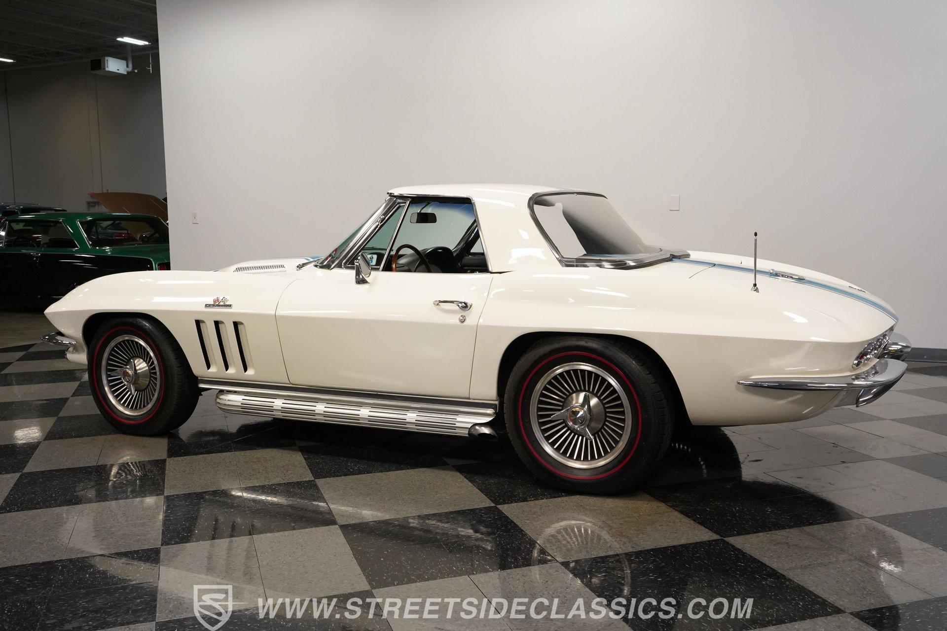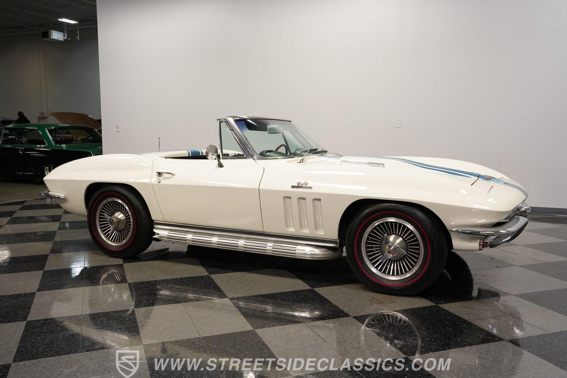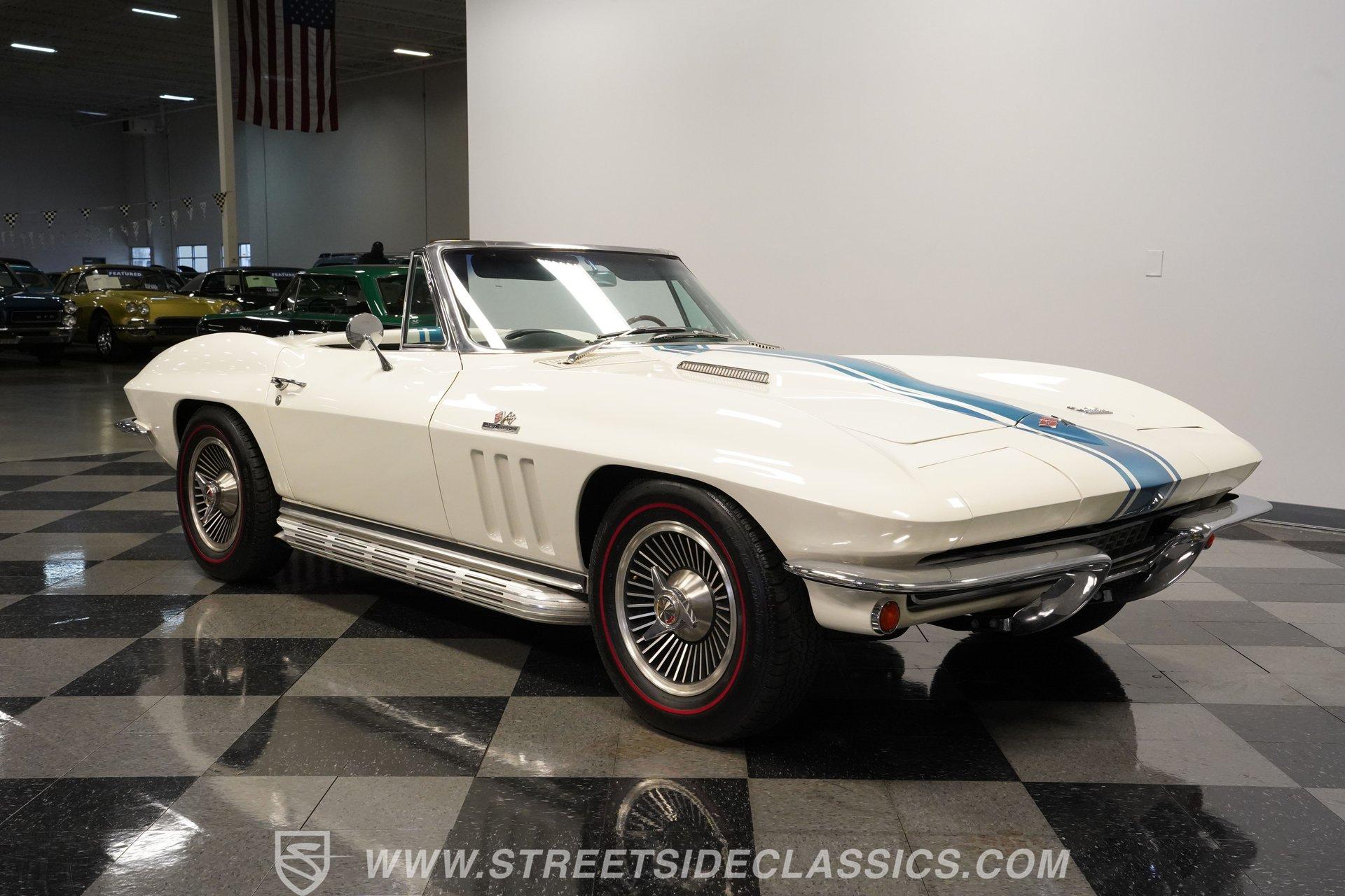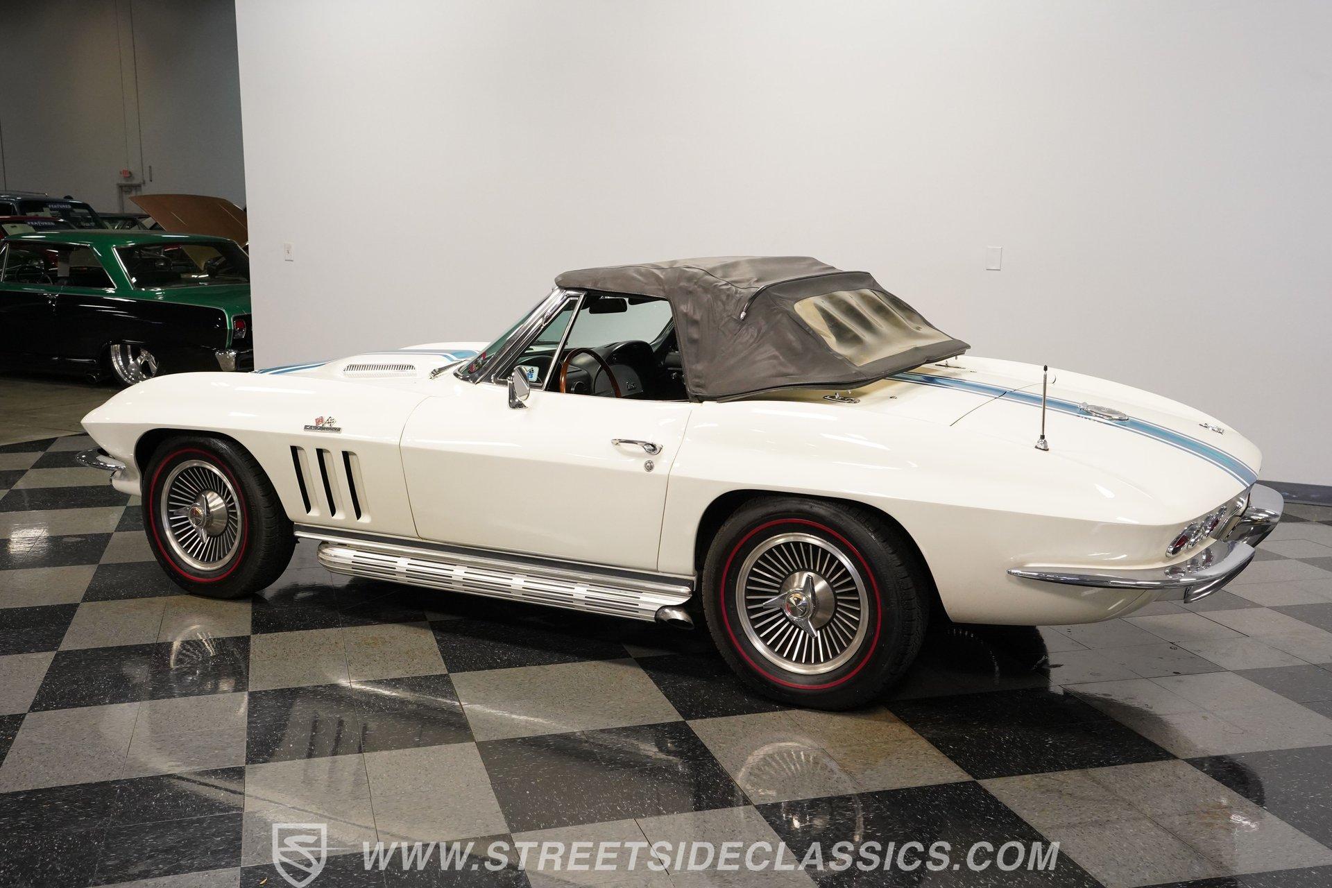 This low-mileage, highly original 1966 Chevrolet Corvette L72 427 Convertible is a rare find. With only 42,222 miles on the odometer and finished in what is believed to be its original Ermine White paint, this car is special. Period modifications include a blue full-length painted center stripe and the addition of two extra tail lights for a total six, which was a popular customization when these cars were new. Factory optional side-mounted exhaust and knock-off wheels wrapped with BF Goodrich Silvertown Redline tires add to this rare Corvette's allure. The black interior appears to be original as well, with the exception of correct replacement carpets, modern retro radio and wood steering wheel. The factory telescopic column helps and make this Stingray comfortable to operate. Additionally, this Corvette is optioned with a factory auxiliary removable hardtop, as well as a folding soft convertible top. Debuting for the 1966 model year, Chevrolet's L72 427 V-8 was a force to be reckoned with. Officially rated at 425 horsepower, its 11.0:1 compression, solid-lifter cam, forged crank, free-flowing rectangular-port cylinder heads, and virtually bulletproof block allowed for a number closer to 450 horsepower, making this one of the most potent engines used by an American automaker in the 1960s. Developed from a series of special Mark IV engines, field-tested by Zora Arkus-Duntov and his team, it was used in Don Yenko's famed Super Camaros and Super Chevelles, and they formed the basis of the GM-built COPO Camaro in 1969. It was especially potent when dropped into the relatively lightweight Corvette. With 42,222 miles, believed actual, this car is accessorized with a potent, highly-desirable, numbers-matching L72 V-8, as well as numbers-matching Muncie M-21 close-ratio four-speed manual transmission, positraction rear axle, F41 special suspension, vacuum power disc brakes, and upgraded HEI ignition system. A full engine rebuild was performed by County Corvette in Pennsylvania, that included bored .030 over, new pistons, hydraulic roller cam, and a new radiator. Engine bay looks largely authentic and period correct with painted valve covers, Winters aluminum intake, Holley carburetor and correct hose clamps. HIGHLIGHTS: 425HP, 427 Cubic Inch Matching Number L72 Engine Matching Number Muncie M21 Close-Ratio 4-Speed Transmission Factory Removable Hardtop and Soft Top Side Mounted Exhaust Knock-Off Wheels Redline Radial Tires F41 Suspension Option NCRS Shipping Data Report Engine Rebuilt by Corvette Specialist Positraction Axle Reproduction Window Sticker Six Tail Lights Custom Painted Center Stripe This desirable and exceptionally preserved 1966 Chevrolet Corvette L72 427 Sting Ray comes with its original owner's manual, reproduction window sticker, receipts, photos, and more. Well optioned and full of mid-sixties character and charm, this ready to drive high-horsepower Corvette presents a rare opportunity to acquire a very special car. Call today!