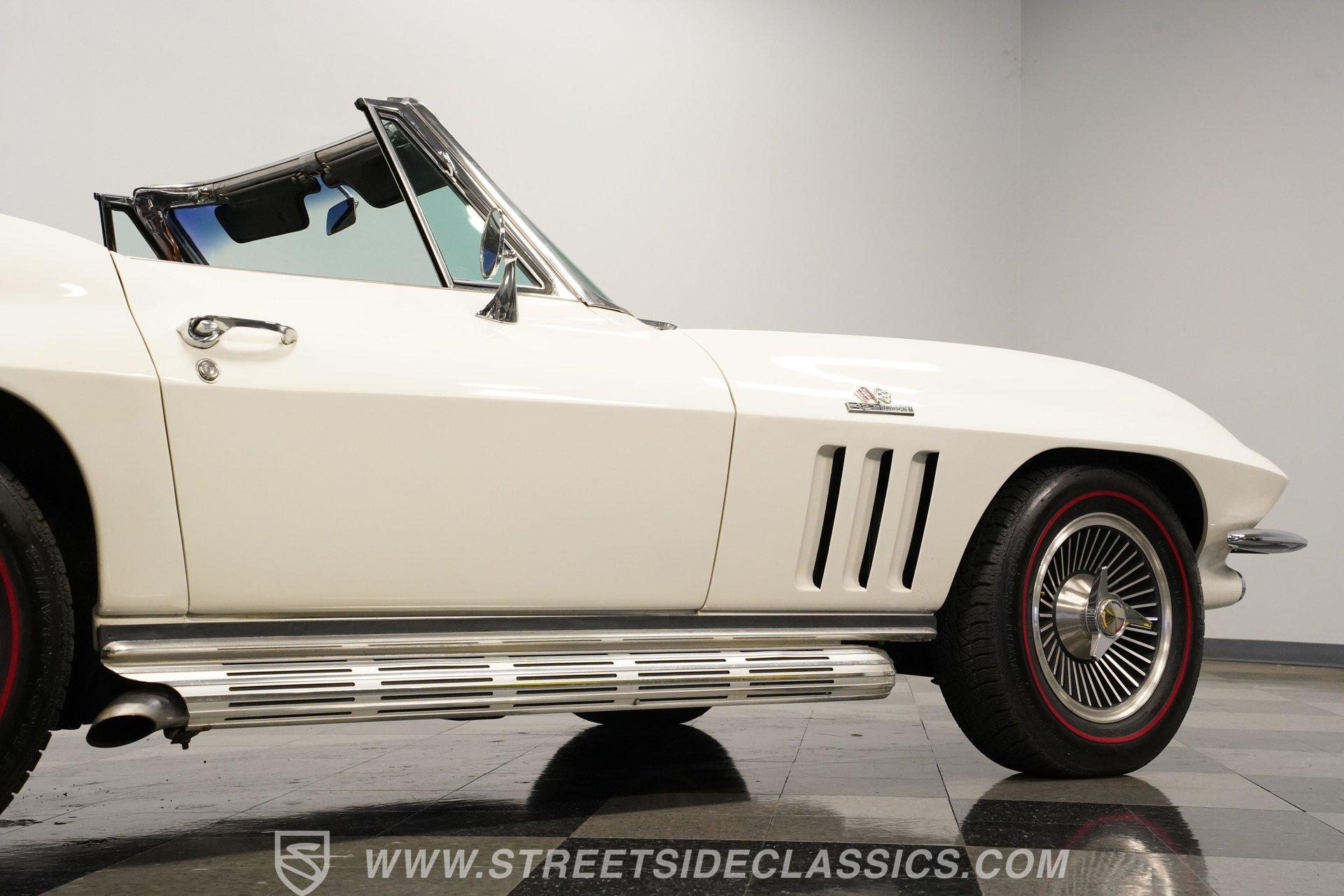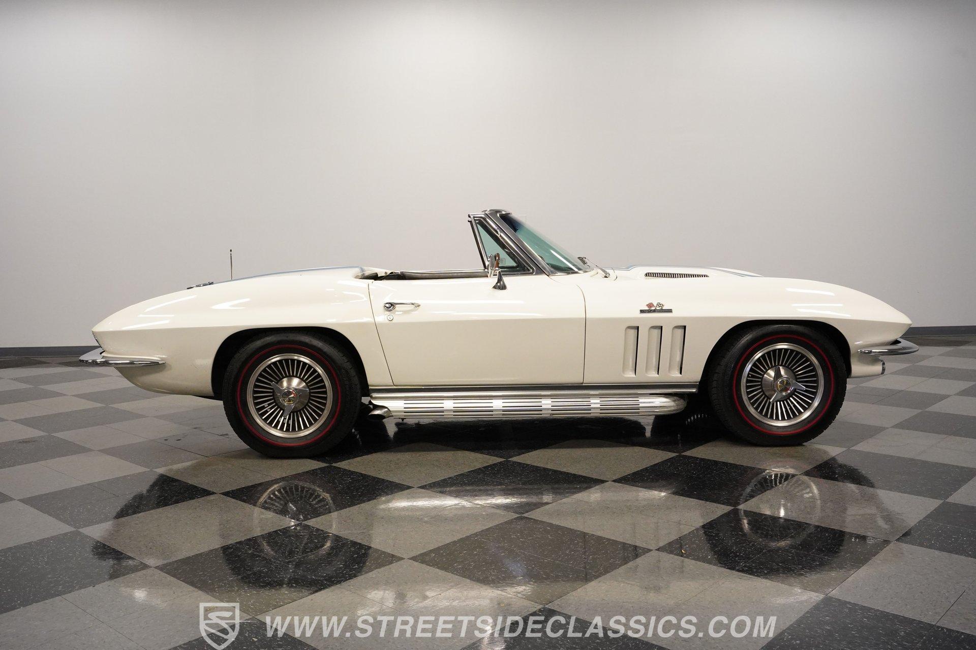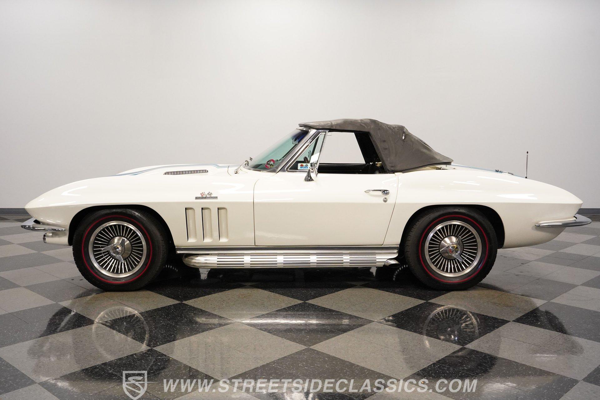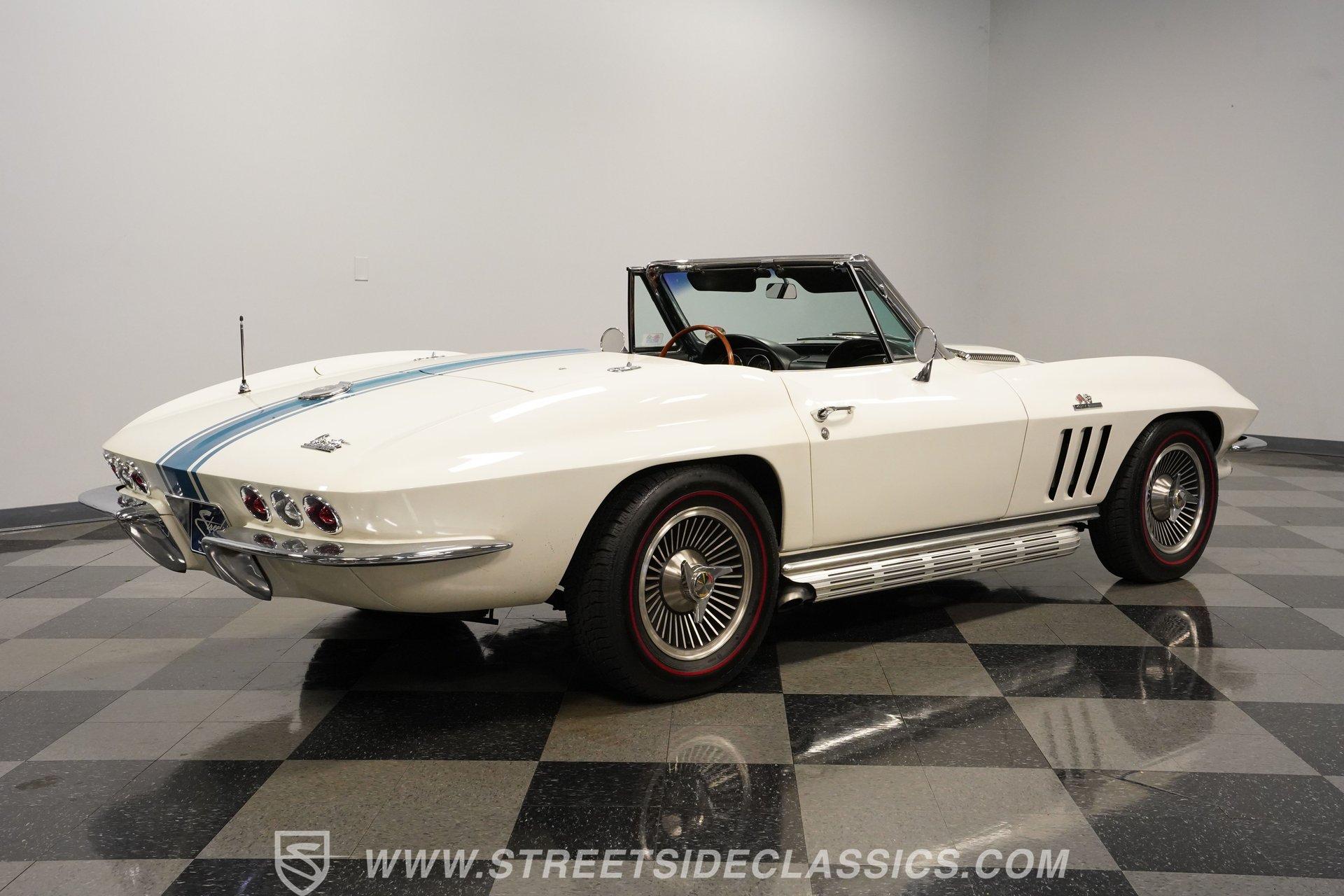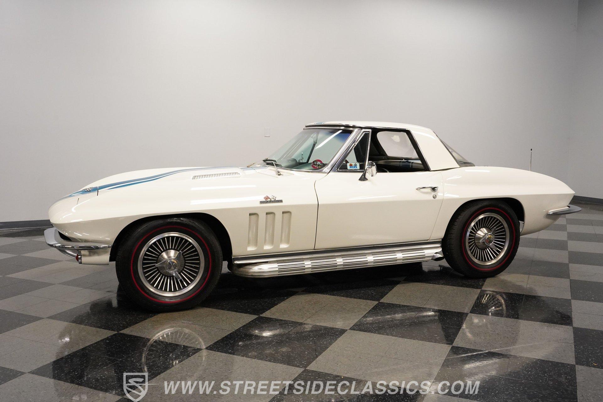 This low-mileage, highly original 1966 Chevrolet Corvette L72 427 Convertible is a rare find. With only 42,222 miles on the odometer and finished in what is believed to be its original Ermine White paint, this car is special. Period modifications include a blue full-length painted center stripe and the addition of two extra tail lights for a total six, which was a popular customization when these cars were new. Factory optional side-mounted exhaust and knock-off wheels wrapped with BF Goodrich Silvertown Redline tires add to this rare Corvette's allure. The black interior appears to be original as well, with the exception of correct replacement carpets, modern retro radio and wood steering wheel. The factory telescopic column helps and make this Stingray comfortable to operate. Additionally, this Corvette is optioned with a factory auxiliary removable hardtop, as well as a folding soft convertible top. Debuting for the 1966 model year, Chevrolet's L72 427 V-8 was a force to be reckoned with. Officially rated at 425 horsepower, its 11.0:1 compression, solid-lifter cam, forged crank, free-flowing rectangular-port cylinder heads, and virtually bulletproof block allowed for a number closer to 450 horsepower, making this one of the most potent engines used by an American automaker in the 1960s. Developed from a series of special Mark IV engines, field-tested by Zora Arkus-Duntov and his team, it was used in Don Yenko's famed Super Camaros and Super Chevelles, and they formed the basis of the GM-built COPO Camaro in 1969. It was especially potent when dropped into the relatively lightweight Corvette. With 42,222 miles, believed actual, this car is accessorized with a potent, highly-desirable, numbers-matching L72 V-8, as well as numbers-matching Muncie M-21 close-ratio four-speed manual transmission, positraction rear axle, F41 special suspension, vacuum power disc brakes, and upgraded HEI ignition system. A full engine rebuild was performed by County Corvette in Pennsylvania, that included bored .030 over, new pistons, hydraulic roller cam, and a new radiator. Engine bay looks largely authentic and period correct with painted valve covers, Winters aluminum intake, Holley carburetor and correct hose clamps. HIGHLIGHTS: 425HP, 427 Cubic Inch Matching Number L72 Engine Matching Number Muncie M21 Close-Ratio 4-Speed Transmission Factory Removable Hardtop and Soft Top Side Mounted Exhaust Knock-Off Wheels Redline Radial Tires F41 Suspension Option NCRS Shipping Data Report Engine Rebuilt by Corvette Specialist Positraction Axle Reproduction Window Sticker Six Tail Lights Custom Painted Center Stripe This desirable and exceptionally preserved 1966 Chevrolet Corvette L72 427 Sting Ray comes with its original owner's manual, reproduction window sticker, receipts, photos, and more. Well optioned and full of mid-sixties character and charm, this ready to drive high-horsepower Corvette presents a rare opportunity to acquire a very special car. Call today!