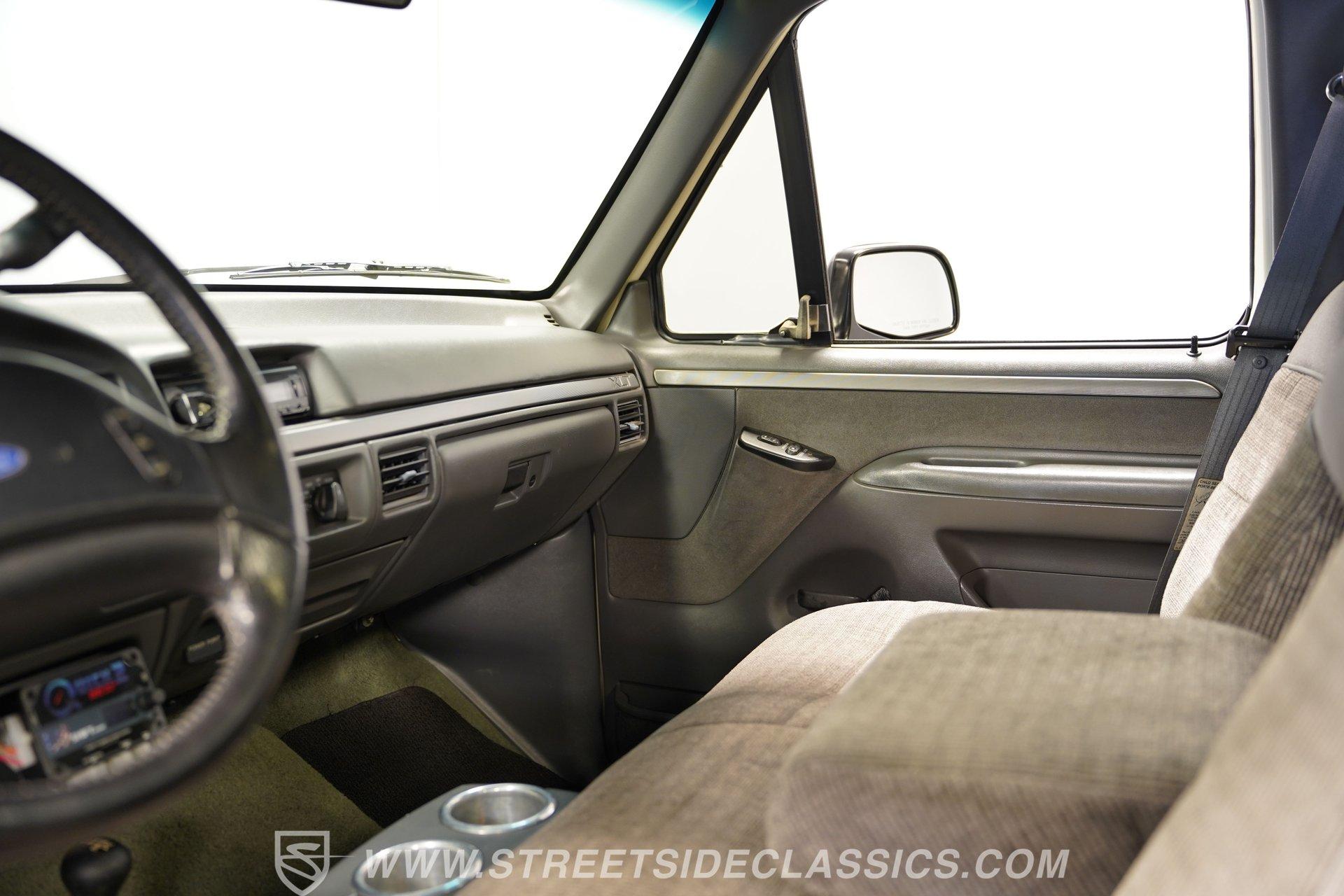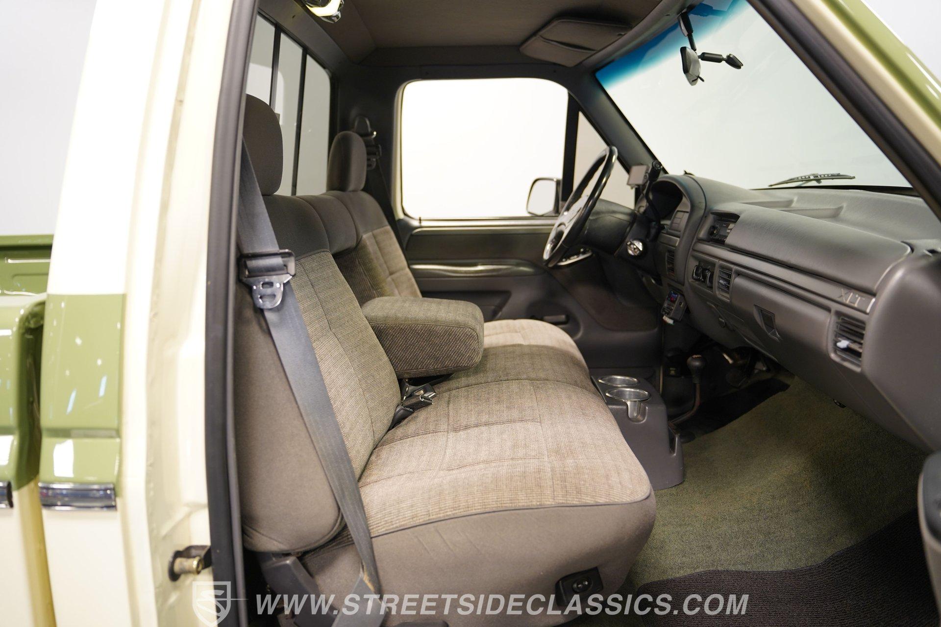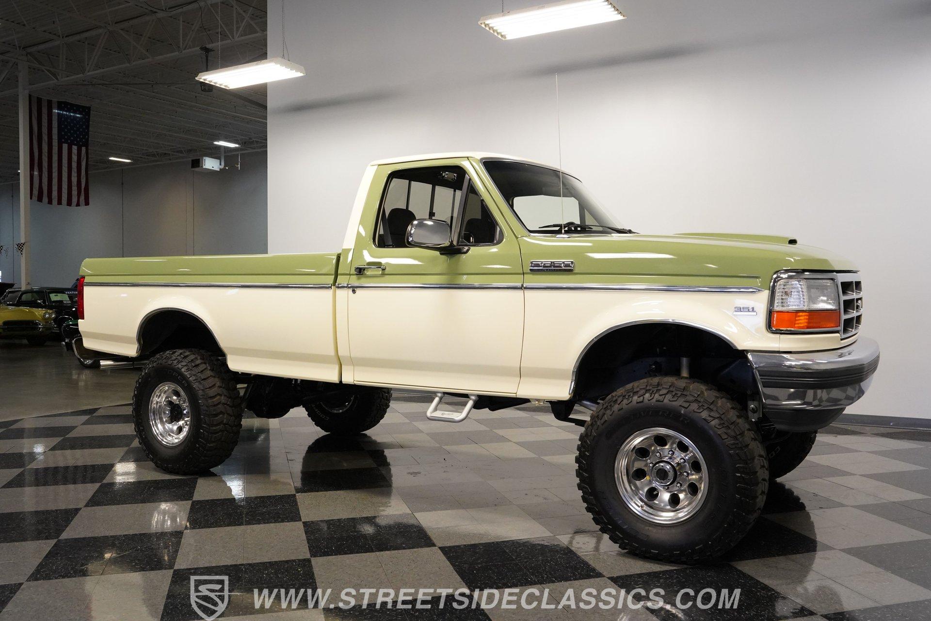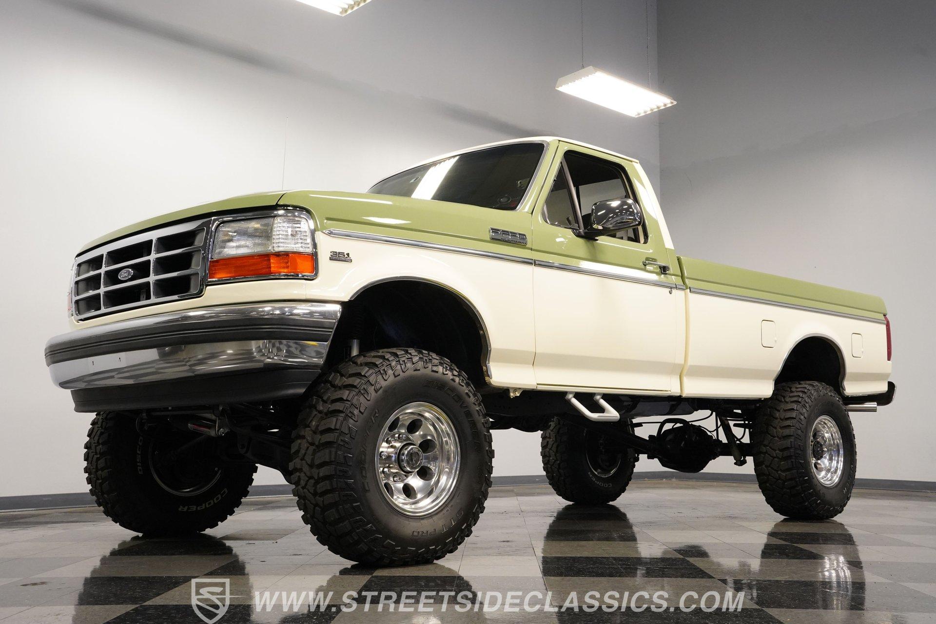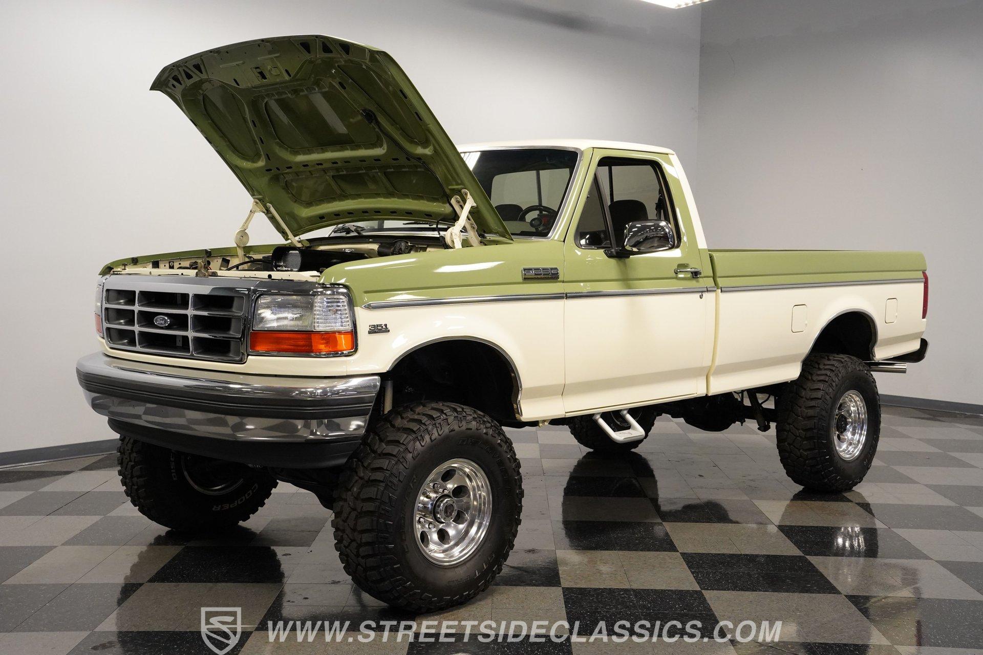 If you like big trucks and big fun, this 1996 Ford F-250 Custom XLT 4x4 Long Bed seriously delivers the total package. Finished in a sharp two-tone Wimbledon White and Boxwood Green, this truck has classic Ford style with a bold, no-nonsense presence. The big wheels and tires give it the right stance, while the custom functional hood, side steps, and clean installed brightwork and badges add both function and flash. With no rust, straight body lines, and an exceptionally clean underside, this F-250 clearly shows pride of ownership. Inside, the mostly gray cloth interior is clean and well-kept. The cloth seats are in good shape, the door panels are solid, and the dashboard is clean and intact. Carpet and headliner present well, and a folding center seat provides a handy armrest, while a mini floor center console provides large cup holders. The stock gauge cluster remains clear and easy to read. A Pioneer AM/FM/AUX stereo with Bluetooth handles modern audio needs. You'll also notice a Quick 2 transmission controller mounted low to the right of the driver, along with a FiTech fuel injection controller mounted high to the left of the driver. Under the hood sits a very clean engine bay housing a rebuilt 351 Windsor V8 with less than 100 miles since completion. Fuel delivery is handled by a FiTech fuel injection system. Engine power is sent through a rebuilt E4OD 4-speed automatic transmission, also with less than 100 miles. The drivetrain is completed with front and rear Dana axles, delivering dependable 4x4 capability when engaged. The suspension features a 4-inch lift with Rough Country shocks, leaf springs, and a front sway bar. The truck rolls on 16-inch aftermarket wheels wrapped in 315/75R16 tires that can take on anything. Power front disc brakes bring everything to a stop. Shorty headers, dual exhaust, and aftermarket mufflers give this Ford a strong, confident sound. Highlights: Rebuilt 351 Windsor FiTech Fuel Injection Rebuilt E40D 4-Speed Automatic Transmission Quick 2 Transmission Controller Front And Rear Dana Axles 4-Inch Lift With Rough Country Shocks 16-Inch Aftermarket Wheels Anti-Lock Power Front Disc Brakes Shorty Headers Power Steering Heat/Defrost/Air Conditioning Cruise Control Tilt Steering Wheel Power Locks/Windows/Mirrors Pioneer Head Unit AM/FM/AUX With Bluetooth Radio This big truck is ready for daily driving, back-road exploring, or downright nasty four-wheel fun. If a clean, built 1996 Ford F-250 Custom XLT 4x4 is on your short list, don't wait, trucks like this don't stick around. Call Today.