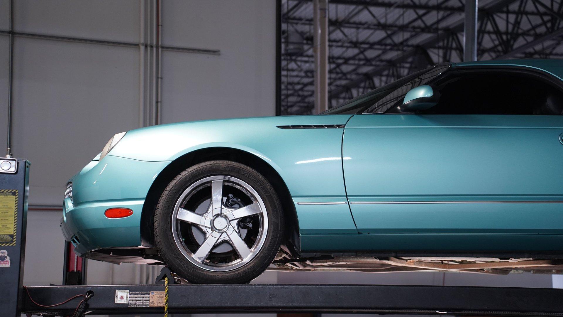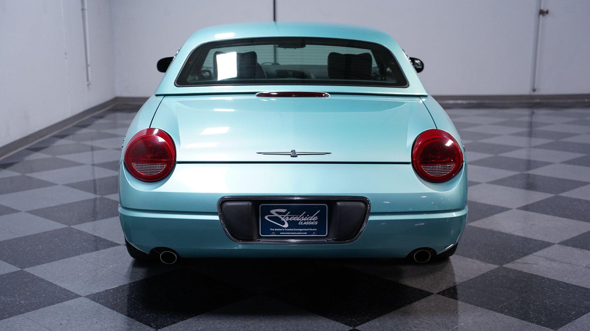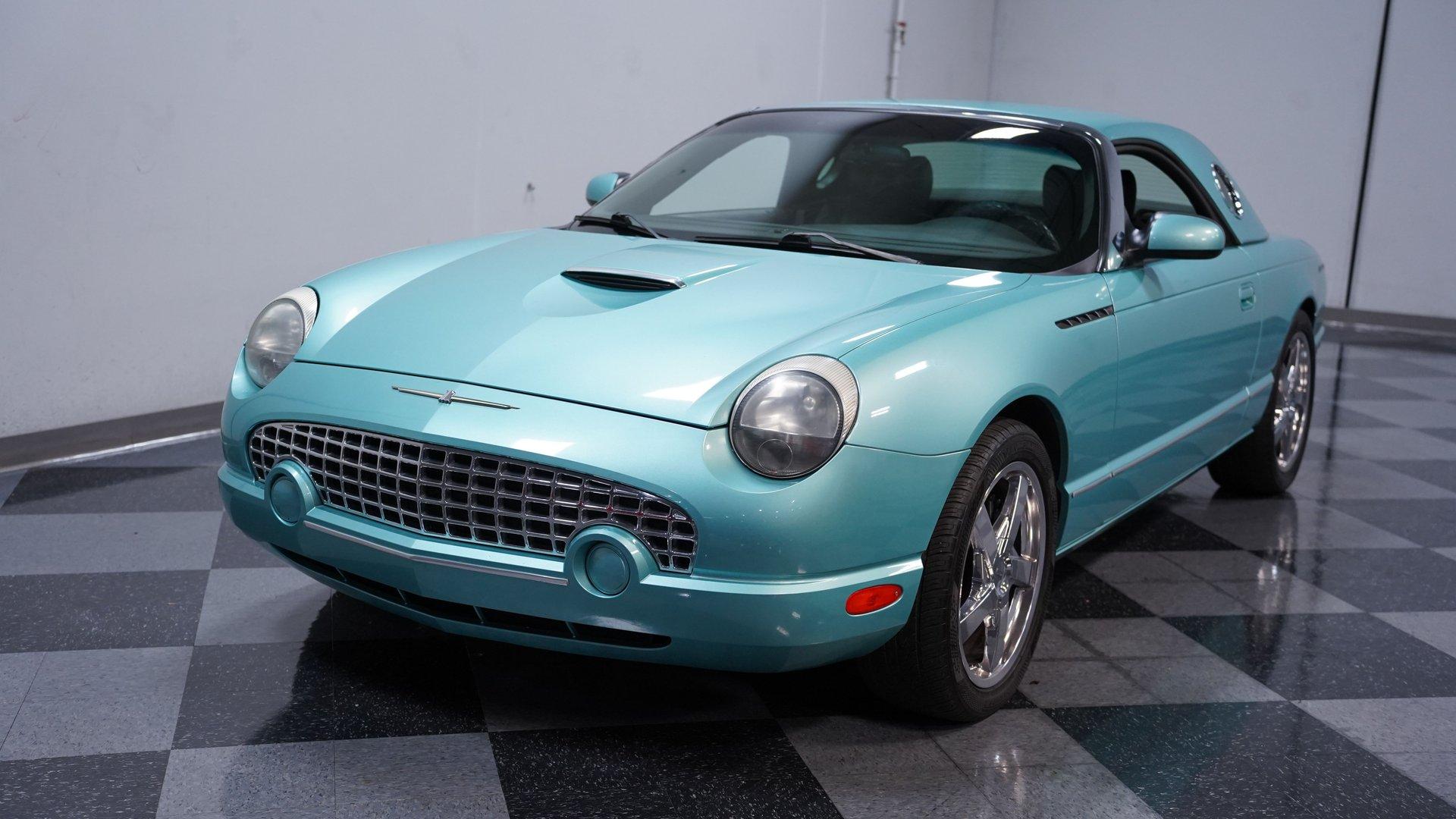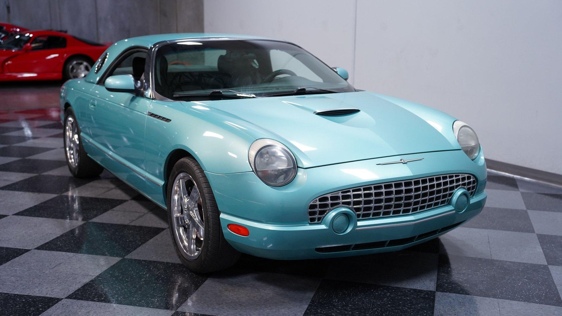 Classic style, luxurious features and V8 power are all what make this 2002 Ford Thunderbird awesome. The fact that this car has only been driven 68,166 miles from new adds to the allure of this beautiful T-Bird. The retro-cool look of this first model year of the final generation Thunderbird has a timeless sense of style. Ford really took the time to integrate the best elements of the first-generation Thunderbird into this design. It can be seen in the long profile, hood scoop, subtle fender vents and afterburner-style tail lights. A set of upgraded 18-inch chrome 5-spoke factory alloy wheels wrapped in 245/45ZR18 performance tires set this bird apart from the flock. This handsome Thunderbird, finished in classic Thunderbird Blue with a Midnight Black interior, features automatic A/C climate control and heated seats, allowing you to drive comfortably with the top down nearly all year round. This car was created to be a terrific cruiser loaded with power windows, power locks, keyless entry/alarm, dual front airbags, a premium AM/FM/6-CD changer stereo and cruise control. The leather seats feel comfy and have a well-respected style with the kind of use that goes with the low mileage. The power driver's seat gets you in the right position to really see nice details such as the steering wheel's classic turquoise streak in the Thunderbird logo that is coordinated with the needles on the gauges. While the looks of the car are meant to be retro-cool, the engine bay is a pure modern motor. It is a fuel-injected DOHC 3.9-liter V8 that fires up readily, idles smoothly and delivers plenty of power when you want it, making it the ideal smooth cruiser from day one. You will love using this Thunderbird to drive near or far with its smooth five-speed automatic transmission, power steering, four-wheel disc brakes and fully-independent suspension. HIGHLIGHTS: 3.9L DOHC V8 Engine 5-Speed Automatic Transmission Fuel Injection Power Disc Brakes Dual Exhaust Thunderbird Blue Exterior Paint Black Convertible Top Removable Hardtop Upgraded 18-inch Wheels Dual Exhaust Outlets Midnight Black Leather Bucket Seats Air Conditioning AM/FM Radio with CD Changer Power Windows This attractive 2002 Ford Thunderbird combines V8 power, advanced engineering, and classic American luxury. The 3.9L V8 engine and automatic transmission create an ideal balance of performance and comfort. The dual-top configuration offers year-round enjoyment. Call today!