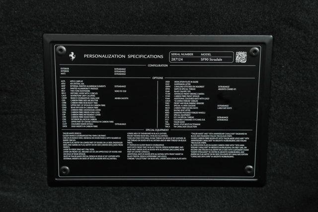 Ferrari SF90 Stradale- FERRARI TAILOR MADE - CAVALCADE COLLECTION -- $759,081 MSRP - $234,000 IN OPTIONAL EQUIPMENT -- FERRARI CERTIFIED PRE-OWNED - EXTENDED FERRARI WARRANTY TO 3/1/28 -- Bianco Courmayeur over Verde (Poltrona Frau Selva SC187) and Nero - Two Owners - Low Miles - Pristine Condition - Many Fine Options - Expertly Maintained by Our Factory Trained Technicians - Extended Ferrari Warranty to 3/1/28 - Complimentary Ferrari Genuine Maintenance Service to 3/1/30 -Special Equipment:- Ferrari Tailor Made Cavalcade Collection- Bianco Courmayeur Paint- Roundels in Bianco King- American Flag Motif on Driver Side Lower Door- Italian Flag Motif on Passenger Side Lower Door- Livery in Verde Pino- Seats in Special Design in Poltrona Frau Selva SC187 Leather- External Inserts of Sides of Seats in Silver 4978 Alcantara- Lower Area of Dashboard in Nero Leather- Pocket Behind Rear Wall in Nero Alcantara- Tone-on-Tone Stitching in Bespoke Thread- F1 Paddles Painted in Bianco Courmayeur- Floor Mats with Front Part in Black Trefoil Design Superfabric- Floor Mats with Rear Part in Silver 4978 Alcantara- Additional Mats in Silver 4978 Alcantara with Black Superfabric- Rear Center Console in Silver 4978 Alcantara- Chrome Galletone on Rear Wall with Engraved Logos and Tricolor Stripe- Carbon Fiber Sill Plates with Tailor Made Logos- XL Dedication Plate in Carbon Fiber with Tailor Made LogosFactory Options:- Special 4-Layer Paint Color- Two-Tone Bodywork- Historic Livery with Roundels- Suspension Lifter- Carbon Fiber Front Spoiler- Carbon Fiber Side Air Splitters- Carbon Fiber Rear Boot Trim- Carbon Fiber Upper Part of Spoiler- Carbon Fiber Rear Diffuser- Carbon Fiber Underdoor Covers- Carbon Fiber Driver Zone with LED Steering Wheel- Carbon Fiber Instrument Cover- Carbon Fiber Dashboard Inserts- Carbon Fiber Door Panels- Carbon Fiber Upper Center Console- Carbon Fiber Exterior Sill Kickplates- Carbon Fiber Racing Seats- Diamond-Polished Forged Wheels- Wheel Bolts in Titanium- Grigio Silverstone Brake Calipers- Scuderia Ferrari Shields- Racing Seat Lifter- Cavallino Stitched to Headrests- Painted Internal Aluminum Elements- Apple CarPlay- Advanced Frontlight System (AFS)- Advanced Front Driving Camera- Front and Rear Parking Sensors- Black Tailpipe TipsThis Ferrari has passed a multi-point inspection performed by our factory trained technicians, and has been enrolled in the Ferrari Approved Certified Pre-Owned Program. The Certified program makes available up to two years of additional Ferrari Power Approved Warranty coverage. Please see dealer for more details.