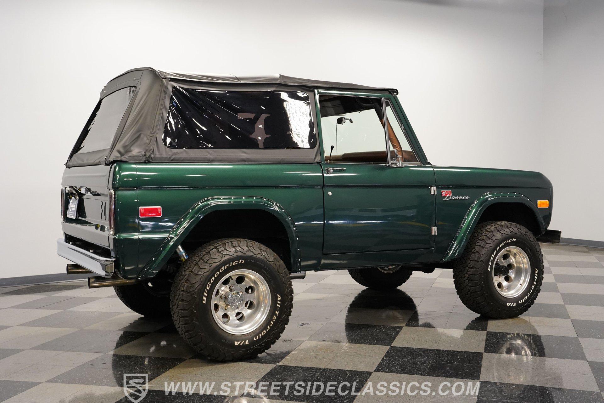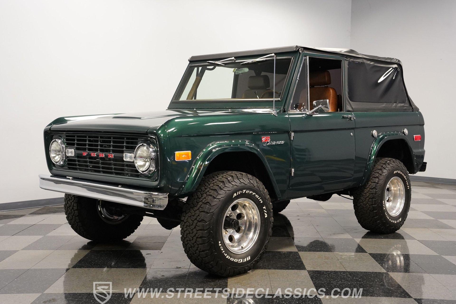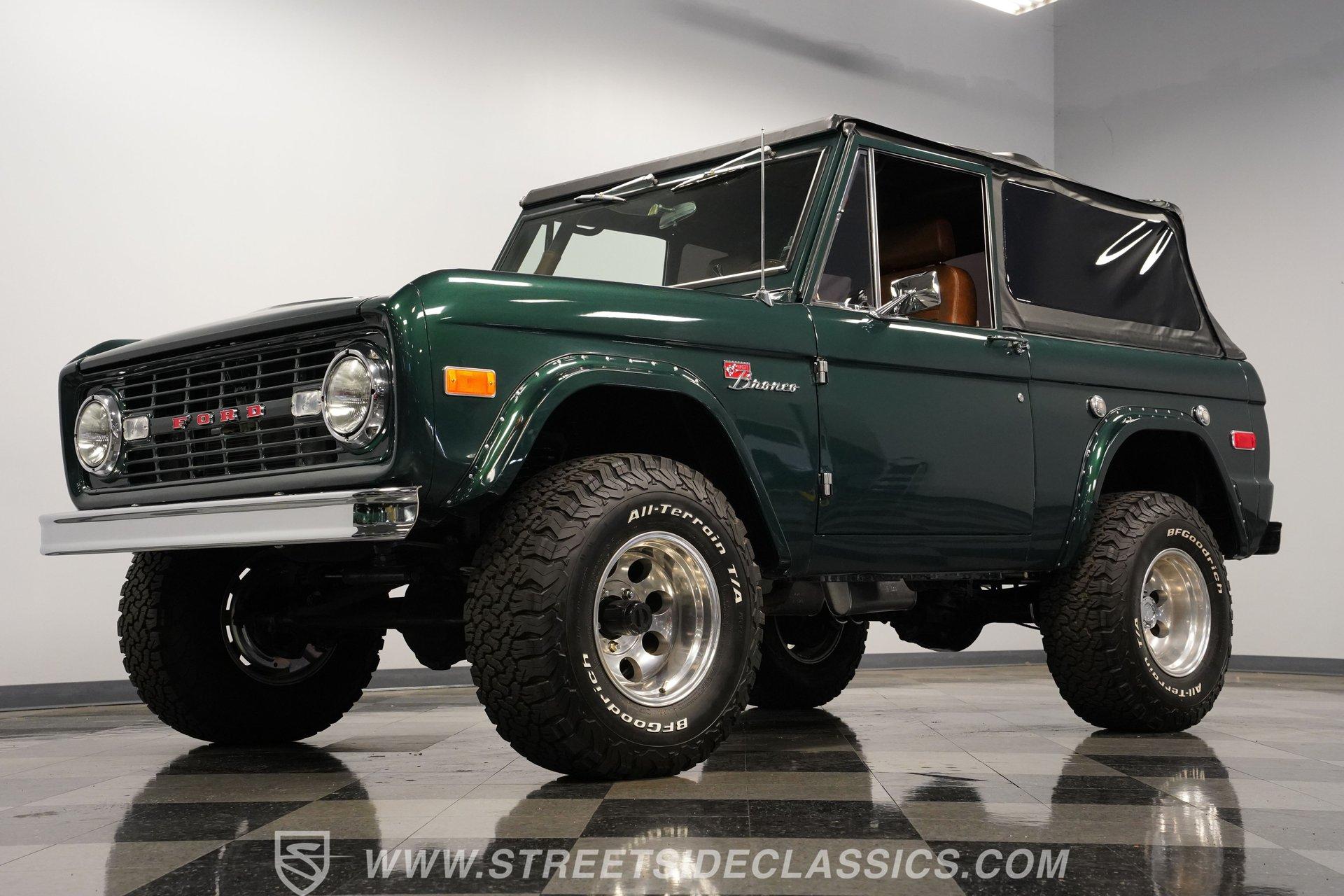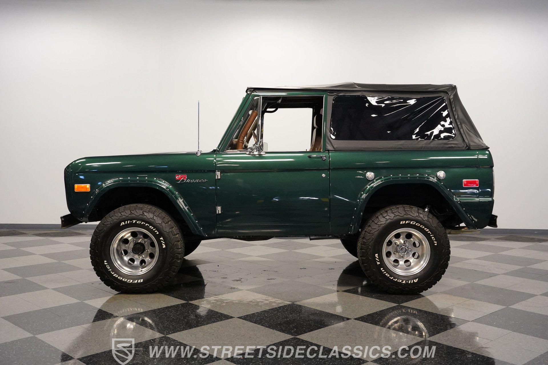Searching for a vintage SUV with its factory styling still intact, but don't want to have to cross your fingers every time you get behind the wheel? Then you'll definitely want to check out this 1973 Ford Bronco Sport 4x4. This first-generation Bronco is dressed in green paint that has a smooth texture and a decidedly vintage appearance, and the metal flake it contains nearly radiates when you bring it out in the sun. The accompanying bright work is in fine shape, with no dings to be found. This classic was said to have been restored by the professionals at Venice Broncos in California, and the results are undeniable. It looks and runs great. The interior is sure to impress, with tan vinyl upholstery covering front buckets and a rear bench seat that is virtually new. Between them is a locking Tuff storage box that comes in handy for stowing valuables. As you direct your attention forward, you'll notice that the color-matched dash area really pops, with its collection of clear functional gauges and a dash pad over the top that ties in perfectly with the other upholstery. The air conditioning system works flawlessly to keep you and your passengers comfortable throughout the year, and a touchscreen-operated AM/FM stereo with Bluetooth connectivity is on hand to offer plenty of audio options. This vintage SUV hasn't logged a lot of miles since its restoration, and its rock-solid running condition makes it a good match for frequent driving. Its 302-cubic-inch V8 starts up without a hitch, and armed with an Edelbrock 4-barrel carburetor and intake manifold, it idles smoothly and pulls with plenty of conviction. The engine pairs with a 3-speed automatic C4 transmission that shifts smoothly. With Bilstein shocks at all four corners, the ride is firm, but by no means harsh, and power brakes that include discs up front provide prompt, fade-resistant stops. Long tube headers allow for easy breathing and terminate in a pair of Thrush mufflers that add a nice, deep rumble. A look below will reveal steering and suspension components that are ready for plenty of future miles of driving enjoyment. HIGHLIGHTS 302-CUBIC-INCH V8 4-BARREL EDELBROCK CARBURETOR 3-SPEED AUTOMATIC C4 TRANSMISSION 4-WHEEL DRIVE POWER FRONT DISC BRAKES LONG TUBE HEADERS DUAL EXHAUST, WITH THRUSH MUFFLERS POWER STEERING BILSTEIN SHOCKS DANA 44 FRONT END FORD 9" REAR END 15" PROCOMP ALLOY WHEELS DEEP GREEN PAINT TAN VINYL INTERIOR BUCKET SEATS AIR CONDITIONING Looking razor sharp and running like a top, this 1973 Ford Bronco Sport 4x4 conquers terrain on a set of 15" Pro Comp Alloy wheels wrapped with BF Goodrich All-Terrain KO2 tires, and would be a great acquisition for any classic SUV enthusiast. Call today!