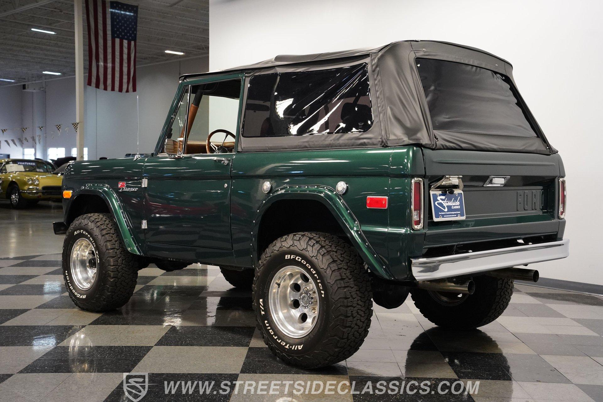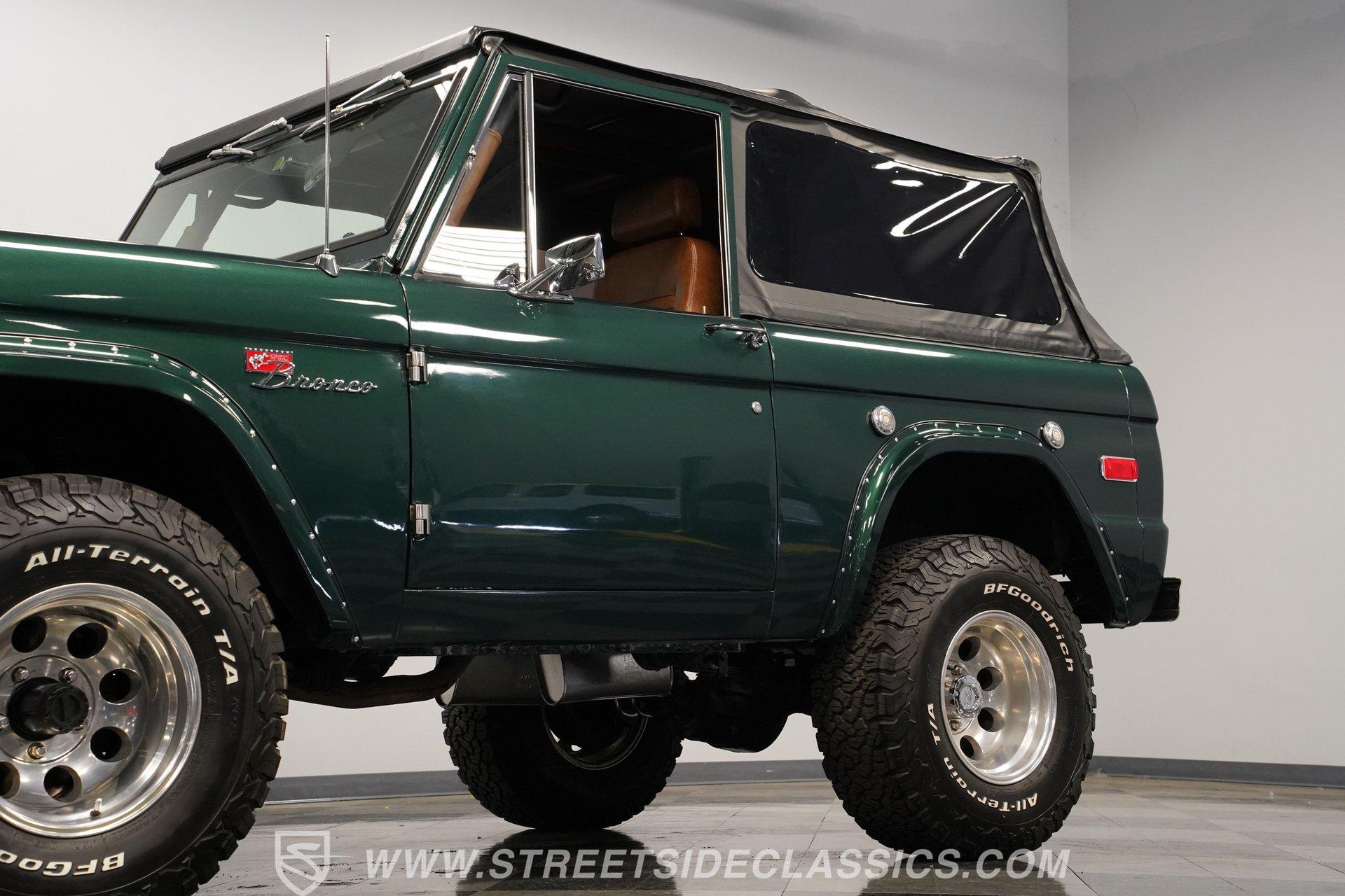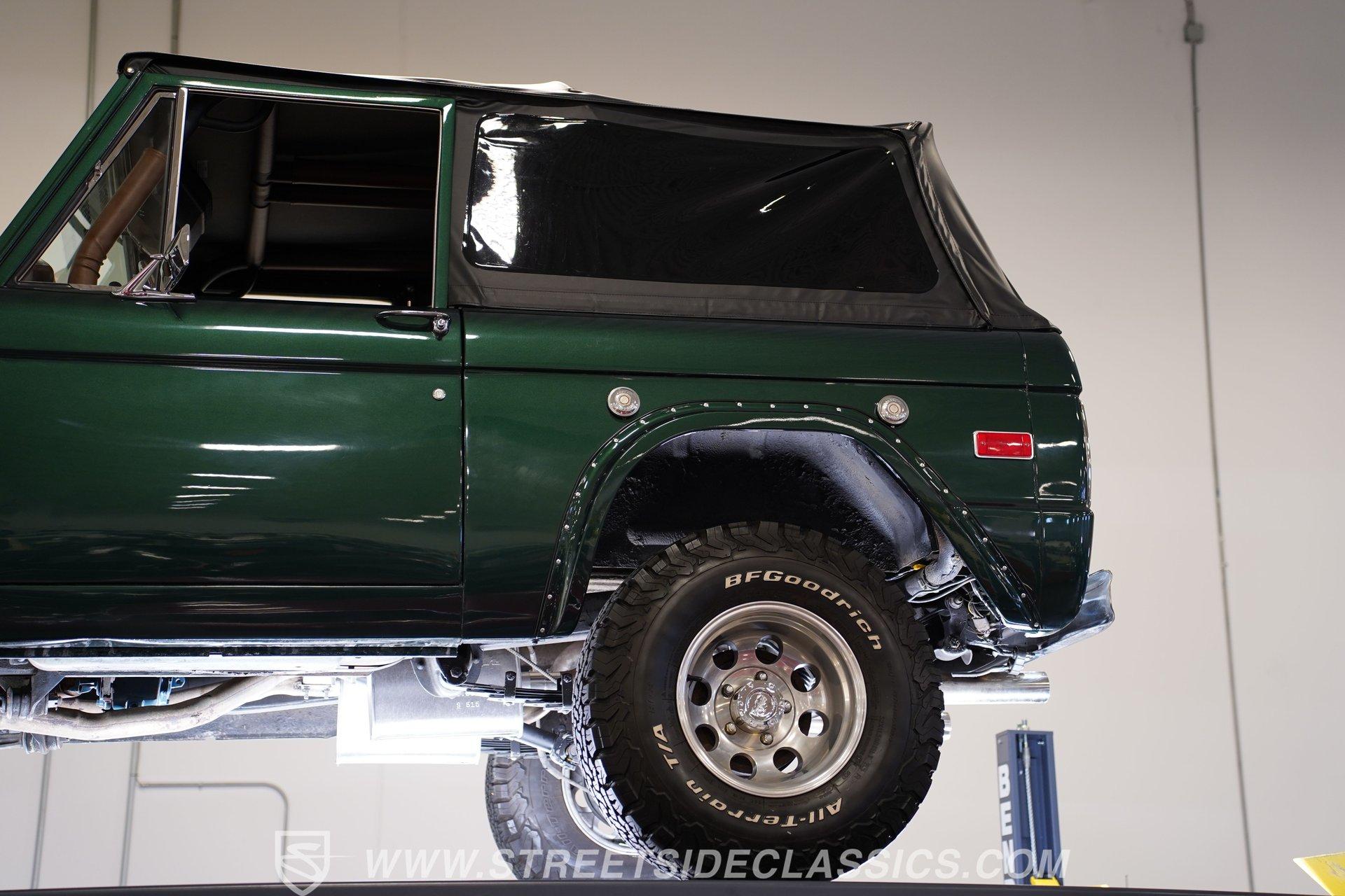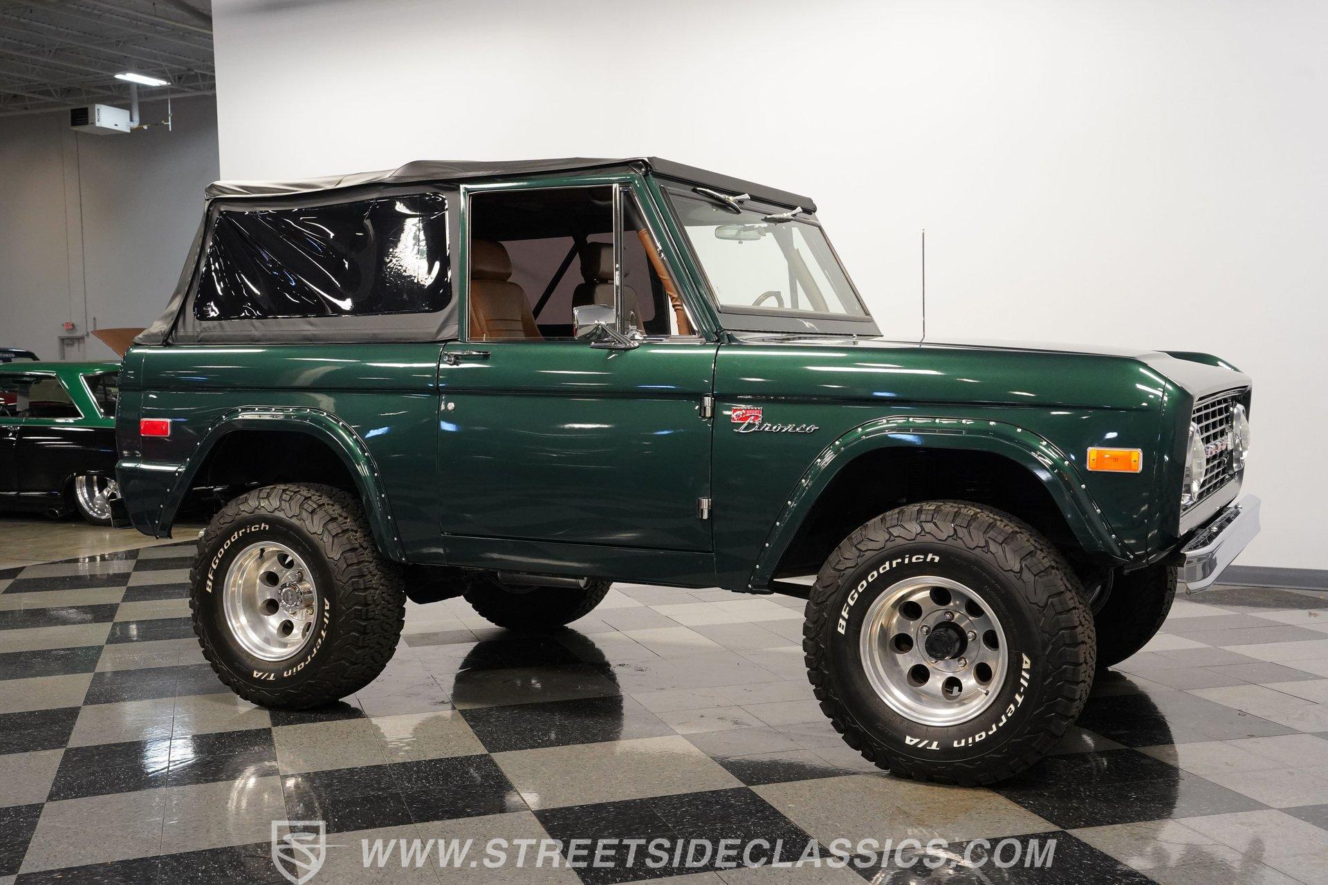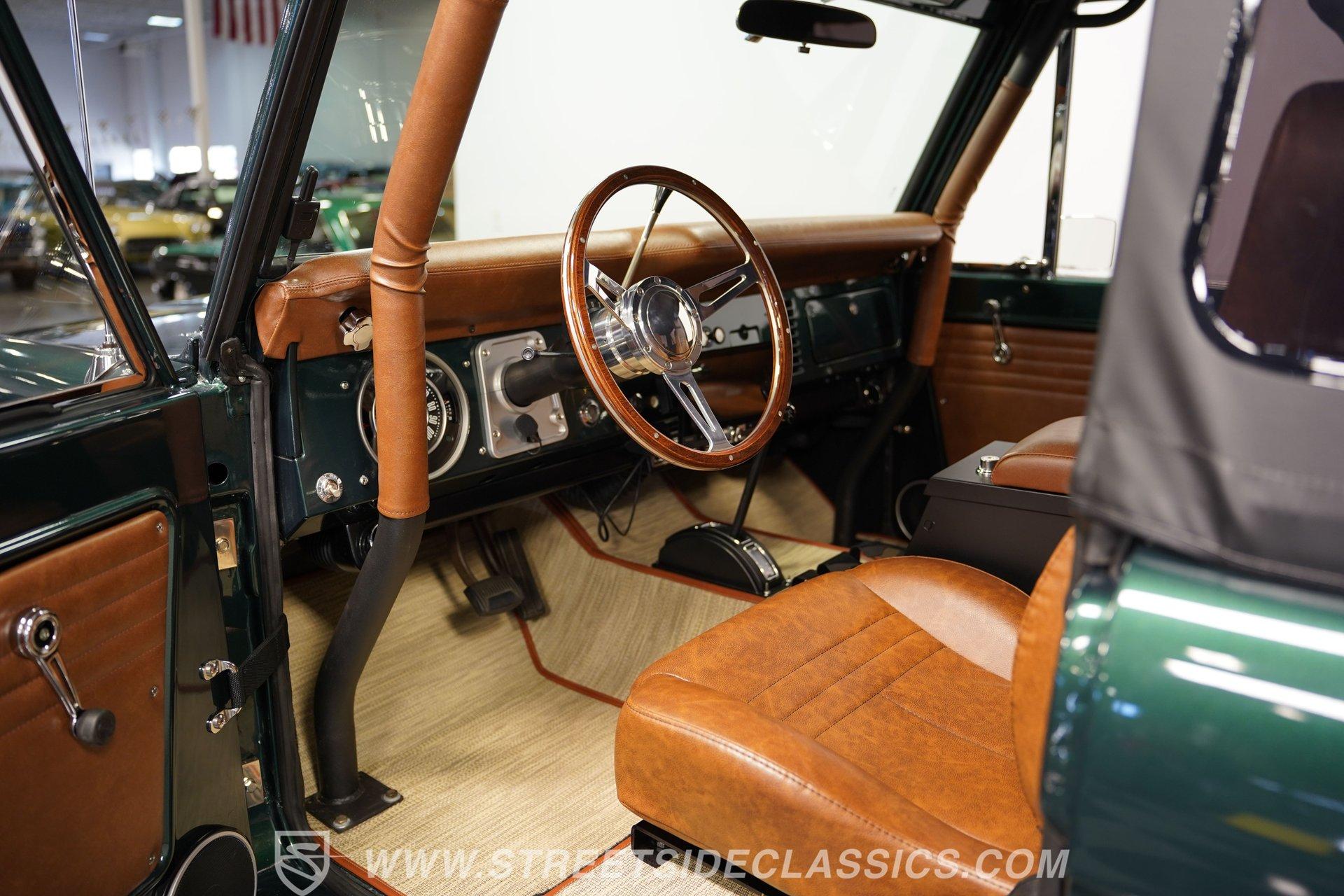 Searching for a vintage SUV with its factory styling still intact, but don't want to have to cross your fingers every time you get behind the wheel? Then you'll definitely want to check out this 1973 Ford Bronco Sport 4x4. This first-generation Bronco is dressed in green paint that has a smooth texture and a decidedly vintage appearance, and the metal flake it contains nearly radiates when you bring it out in the sun. The accompanying bright work is in fine shape, with no dings to be found. This classic was said to have been restored by the professionals at Venice Broncos in California, and the results are undeniable. It looks and runs great. The interior is sure to impress, with tan vinyl upholstery covering front buckets and a rear bench seat that is virtually new. Between them is a locking Tuff storage box that comes in handy for stowing valuables. As you direct your attention forward, you'll notice that the color-matched dash area really pops, with its collection of clear functional gauges and a dash pad over the top that ties in perfectly with the other upholstery. The air conditioning system works flawlessly to keep you and your passengers comfortable throughout the year, and a touchscreen-operated AM/FM stereo with Bluetooth connectivity is on hand to offer plenty of audio options. This vintage SUV hasn't logged a lot of miles since its restoration, and its rock-solid running condition makes it a good match for frequent driving. Its 302-cubic-inch V8 starts up without a hitch, and armed with an Edelbrock 4-barrel carburetor and intake manifold, it idles smoothly and pulls with plenty of conviction. The engine pairs with a 3-speed automatic C4 transmission that shifts smoothly. With Bilstein shocks at all four corners, the ride is firm, but by no means harsh, and power brakes that include discs up front provide prompt, fade-resistant stops. Long tube headers allow for easy breathing and terminate in a pair of Thrush mufflers that add a nice, deep rumble. A look below will reveal steering and suspension components that are ready for plenty of future miles of driving enjoyment. HIGHLIGHTS 302-CUBIC-INCH V8 4-BARREL EDELBROCK CARBURETOR 3-SPEED AUTOMATIC C4 TRANSMISSION 4-WHEEL DRIVE POWER FRONT DISC BRAKES LONG TUBE HEADERS DUAL EXHAUST, WITH THRUSH MUFFLERS POWER STEERING BILSTEIN SHOCKS DANA 44 FRONT END FORD 9" REAR END 15" PROCOMP ALLOY WHEELS DEEP GREEN PAINT TAN VINYL INTERIOR BUCKET SEATS AIR CONDITIONING Looking razor sharp and running like a top, this 1973 Ford Bronco Sport 4x4 conquers terrain on a set of 15" Pro Comp Alloy wheels wrapped with BF Goodrich All-Terrain KO2 tires, and would be a great acquisition for any classic SUV enthusiast. Call today!