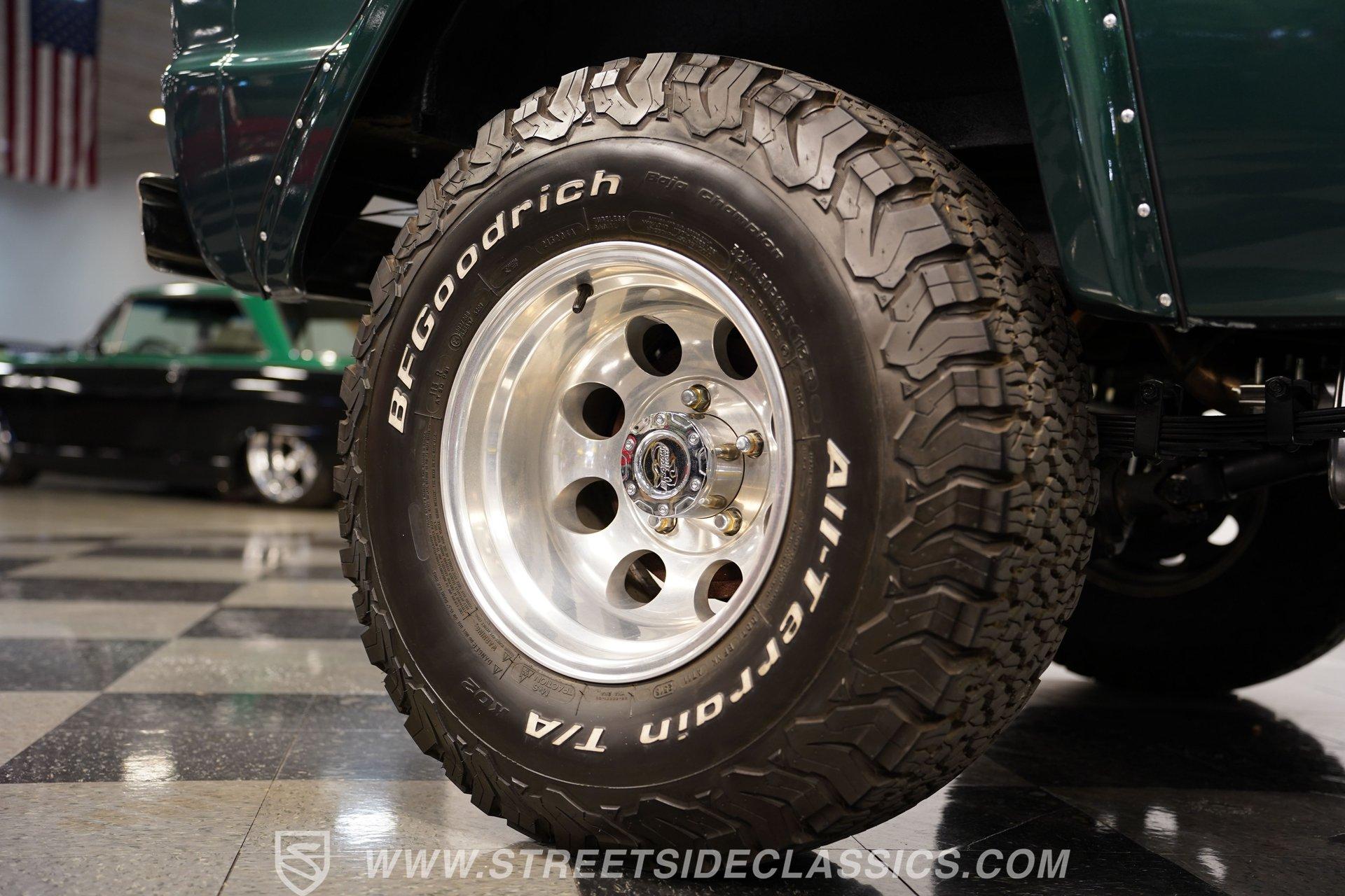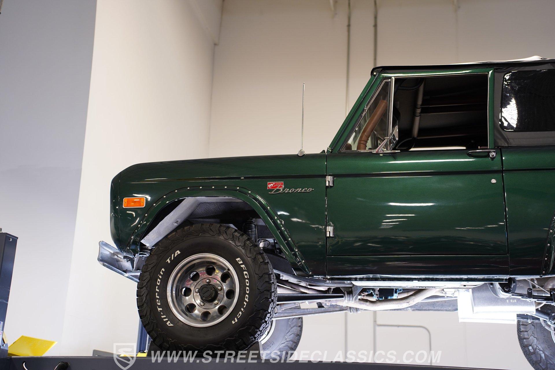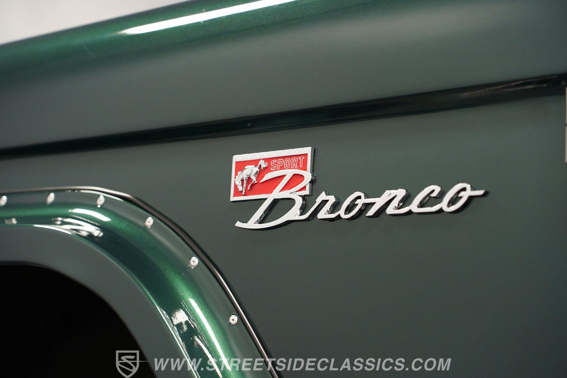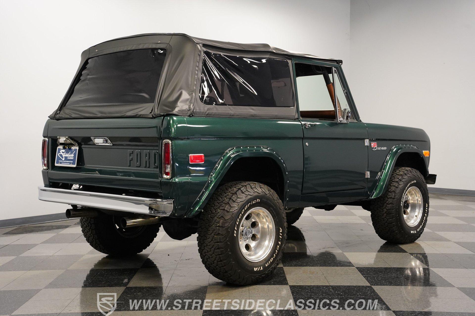Searching for a vintage SUV with its factory styling still intact, but don't want to have to cross your fingers every time you get behind the wheel? Then you'll definitely want to check out this 1973 Ford Bronco Sport 4x4. This first-generation Bronco is dressed in green paint that has a smooth texture and a decidedly vintage appearance, and the metal flake it contains nearly radiates when you bring it out in the sun. The accompanying bright work is in fine shape, with no dings to be found. This classic was said to have been restored by the professionals at Venice Broncos in California, and the results are undeniable. It looks and runs great. The interior is sure to impress, with tan vinyl upholstery covering front buckets and a rear bench seat that is virtually new. Between them is a locking Tuff storage box that comes in handy for stowing valuables. As you direct your attention forward, you'll notice that the color-matched dash area really pops, with its collection of clear functional gauges and a dash pad over the top that ties in perfectly with the other upholstery. The air conditioning system works flawlessly to keep you and your passengers comfortable throughout the year, and a touchscreen-operated AM/FM stereo with Bluetooth connectivity is on hand to offer plenty of audio options. This vintage SUV hasn't logged a lot of miles since its restoration, and its rock-solid running condition makes it a good match for frequent driving. Its 302-cubic-inch V8 starts up without a hitch, and armed with an Edelbrock 4-barrel carburetor and intake manifold, it idles smoothly and pulls with plenty of conviction. The engine pairs with a 3-speed automatic C4 transmission that shifts smoothly. With Bilstein shocks at all four corners, the ride is firm, but by no means harsh, and power brakes that include discs up front provide prompt, fade-resistant stops. Long tube headers allow for easy breathing and terminate in a pair of Thrush mufflers that add a nice, deep rumble. A look below will reveal steering and suspension components that are ready for plenty of future miles of driving enjoyment. HIGHLIGHTS 302-CUBIC-INCH V8 4-BARREL EDELBROCK CARBURETOR 3-SPEED AUTOMATIC C4 TRANSMISSION 4-WHEEL DRIVE POWER FRONT DISC BRAKES LONG TUBE HEADERS DUAL EXHAUST, WITH THRUSH MUFFLERS POWER STEERING BILSTEIN SHOCKS DANA 44 FRONT END FORD 9" REAR END 15" PROCOMP ALLOY WHEELS DEEP GREEN PAINT TAN VINYL INTERIOR BUCKET SEATS AIR CONDITIONING Looking razor sharp and running like a top, this 1973 Ford Bronco Sport 4x4 conquers terrain on a set of 15" Pro Comp Alloy wheels wrapped with BF Goodrich All-Terrain KO2 tires, and would be a great acquisition for any classic SUV enthusiast. Call today!