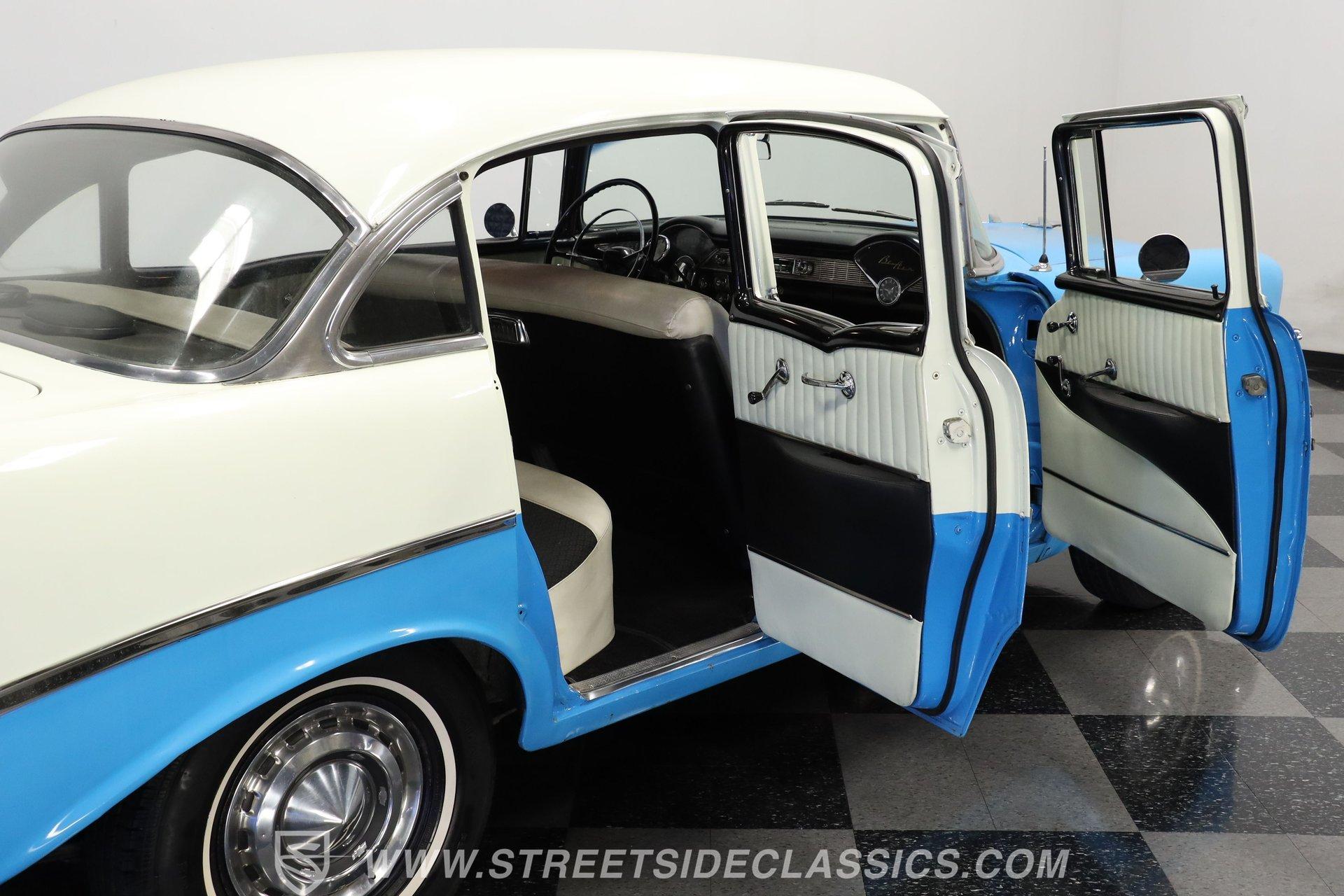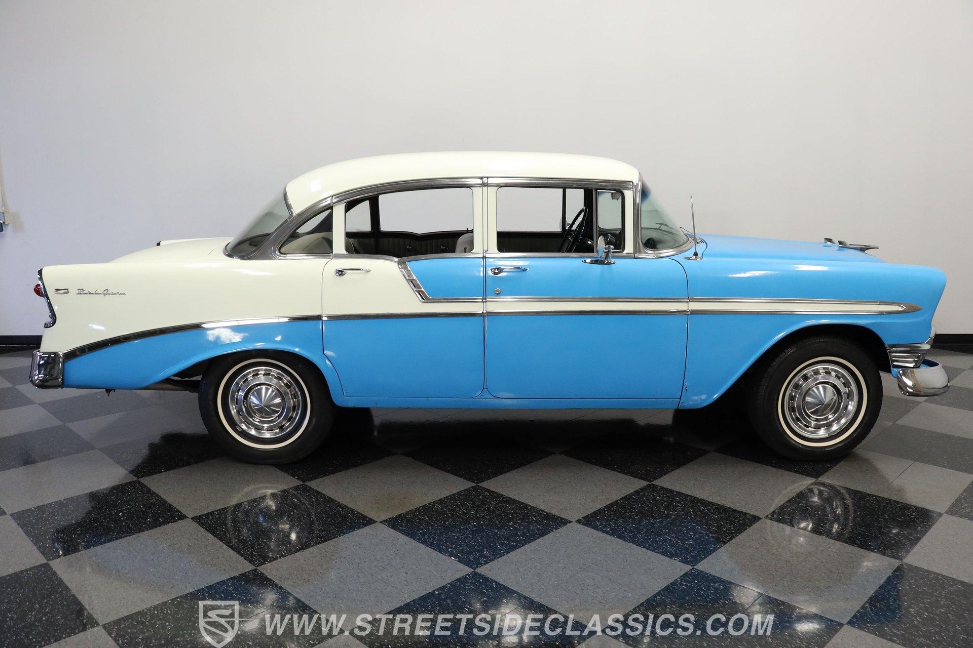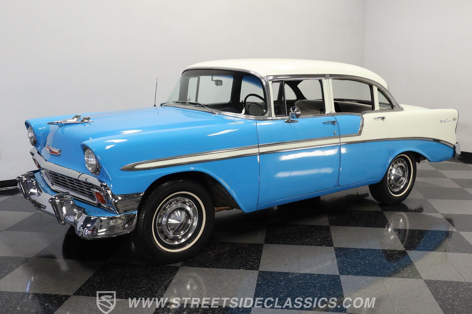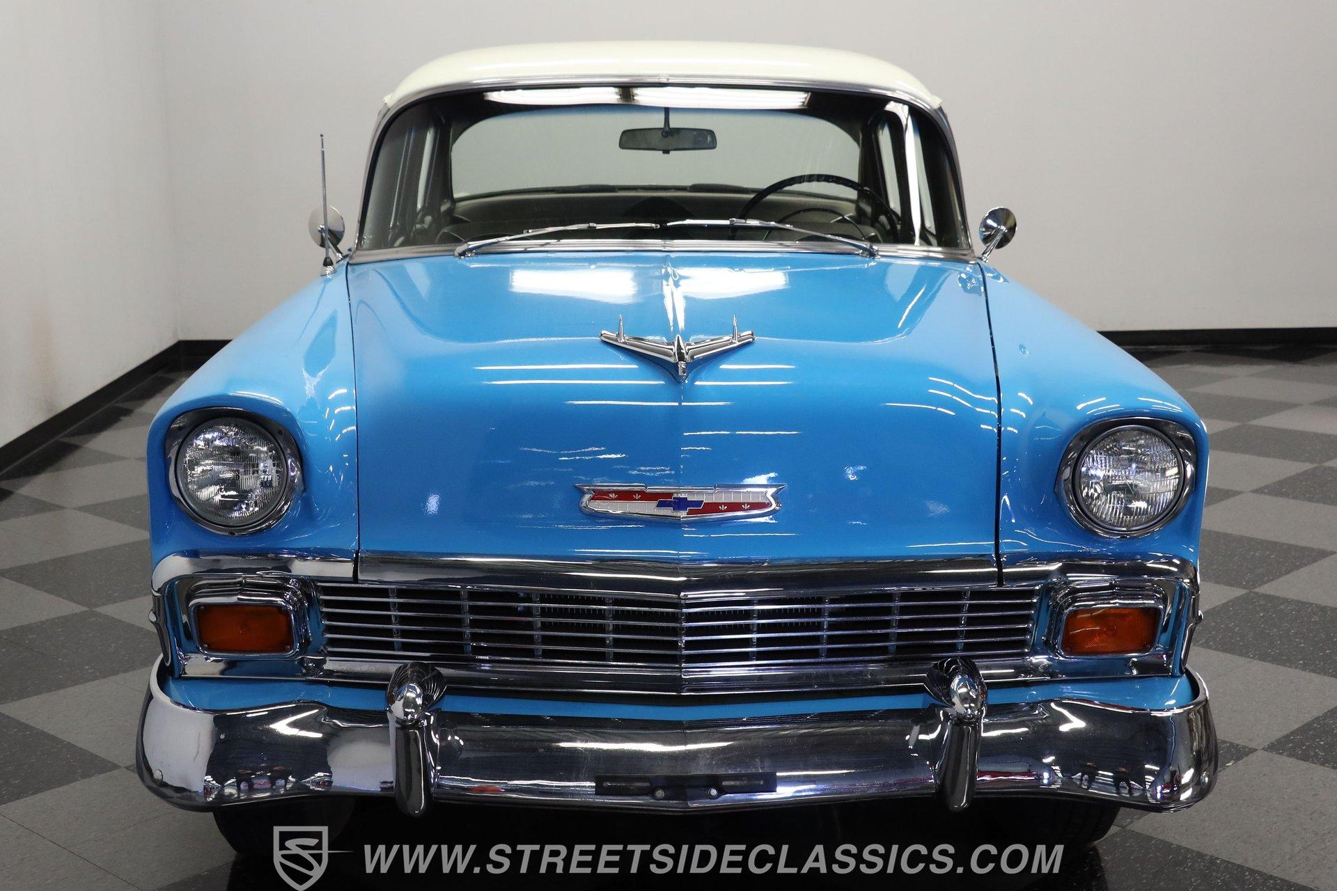 This 1956 Chevrolet Bel Air 4 Door Sedan captures the essence of 1950s automotive design. The Nassau Blue and India Ivory paint job isn't just eye-candy - it's a time machine on wheels. Stretching a full 200 inches, this Bel Air flaunts more chrome than a '50s diner. The iconic side spear splits the colors like a lightning bolt, pure automotive electricity. Perched on 15-inch wheels hugged by 235/75R15 whitewalls, this Chevy's stance is pure '50s cool with a dash of modern grip. From its hooded headlights to those rocket-inspired taillights and features the now-iconic "Dagmar" front bumper guards. Step into a time capsule of mid-century design. The interior, finished in black and white, perfectly complements the exterior. Bench seats upholstered in a combination of vinyl and cloth offer ample room for six passengers. The dashboard, a marvel of 1950s styling, features an arched speedometer and chrome accents that sparkle like jewelry. A column-mounted Sunpro Super Tach ll and a set of under-dash Autogauge gauges monitor engine functions. The floor shifter and manual windows maintain the car's nostalgic feel, while an upgraded AM/FM/cassette radio adds a touch of convenience to the driving experience. Under the hood, a 350 cubic inch V8 engine breathes through a Edelbrock intake and Holley four-barrel carburetor, delivering smooth, reliable power. The floor-shifted TH350 three-speed automatic transmission offers direct control over the drivetrain. Other upgrades include an Excel Power coil, chrome alternator, and black Chevrolet Performance valve covers with matching open-element air cleaner. Power front disc brakes provide improved stopping power and safety. A set of long-tube Hedman headers flow back through a dual exhaust system with Pypes Street Pro mufflers, giving this Bel Air a subtle rumble. HIGHLIGHTS: 350 V8 Engine TH350 3-Speed Automatic Transmission Edelbrock Intake Manifold Front Power Disc brakes Holley Carburetor Headers Excel Coil Dual Exhaust with Pypes Street Pro mufflers Nassau Blue and India Ivory Two-Tone Paint Chrome Bumpers and Trim 15-inch Wheels in 205/75R15 Whitewall Tires Front Seat Belts Black and White Interior with Bench seats Sunpro Super Tach and Under-Dash Gauges Floor Shifter Aluminum Radiator Hedman Headers This 1956 Chevrolet Bel Air 4 Door Sedan combines classic '50s style with thoughtful upgrades. Its healthy 350 V8 engine, eye-catching two-tone paint, and spacious interior make it perfect for cruising in vintage American luxury. Experience the golden age of Detroit iron. Call today! Be sure to ask about our services offered; Financing, Vehicle Protection Plan, Insurance, and Transportation to your driveway!