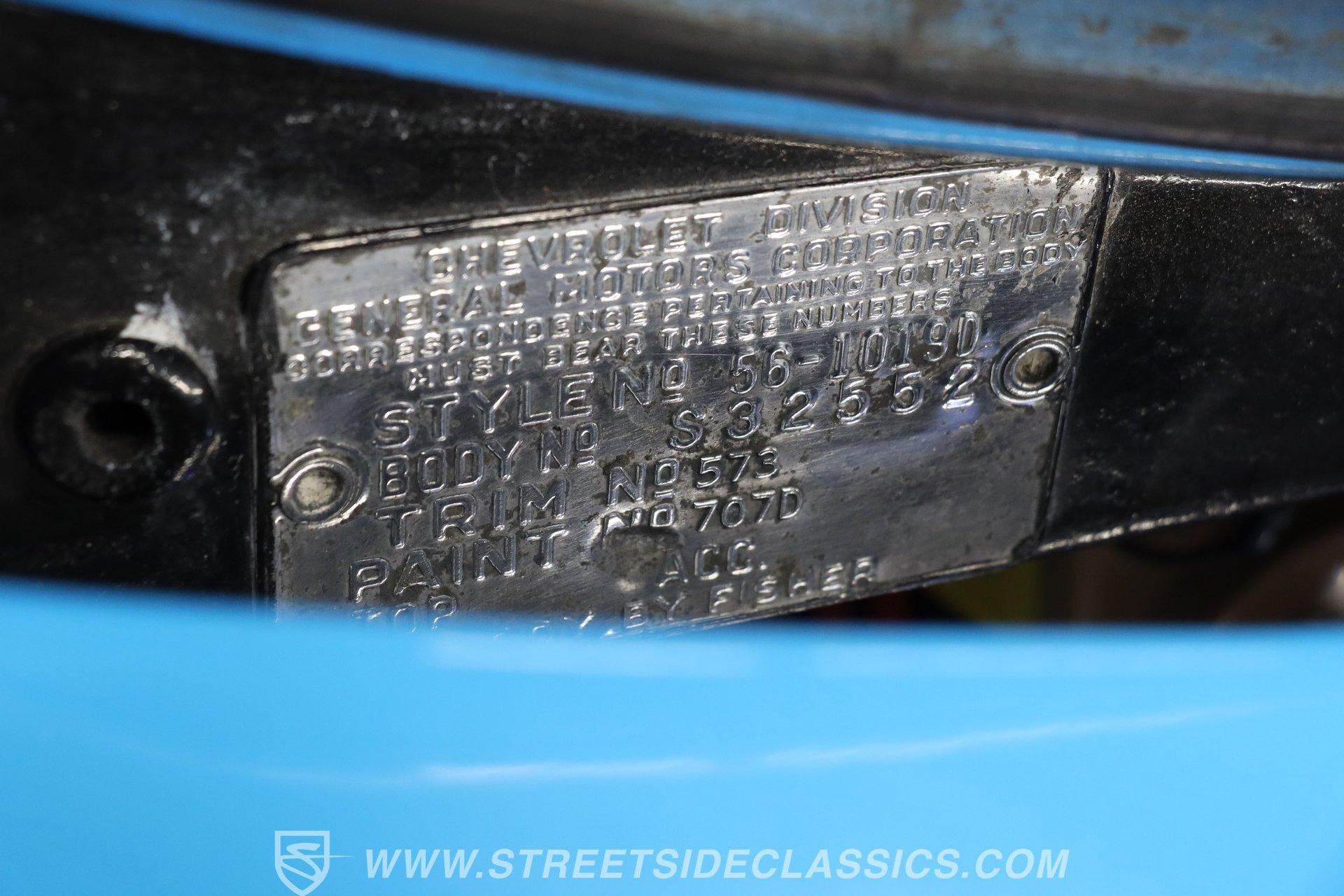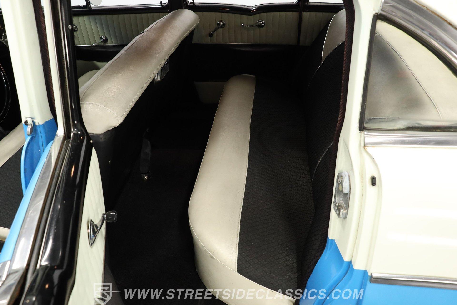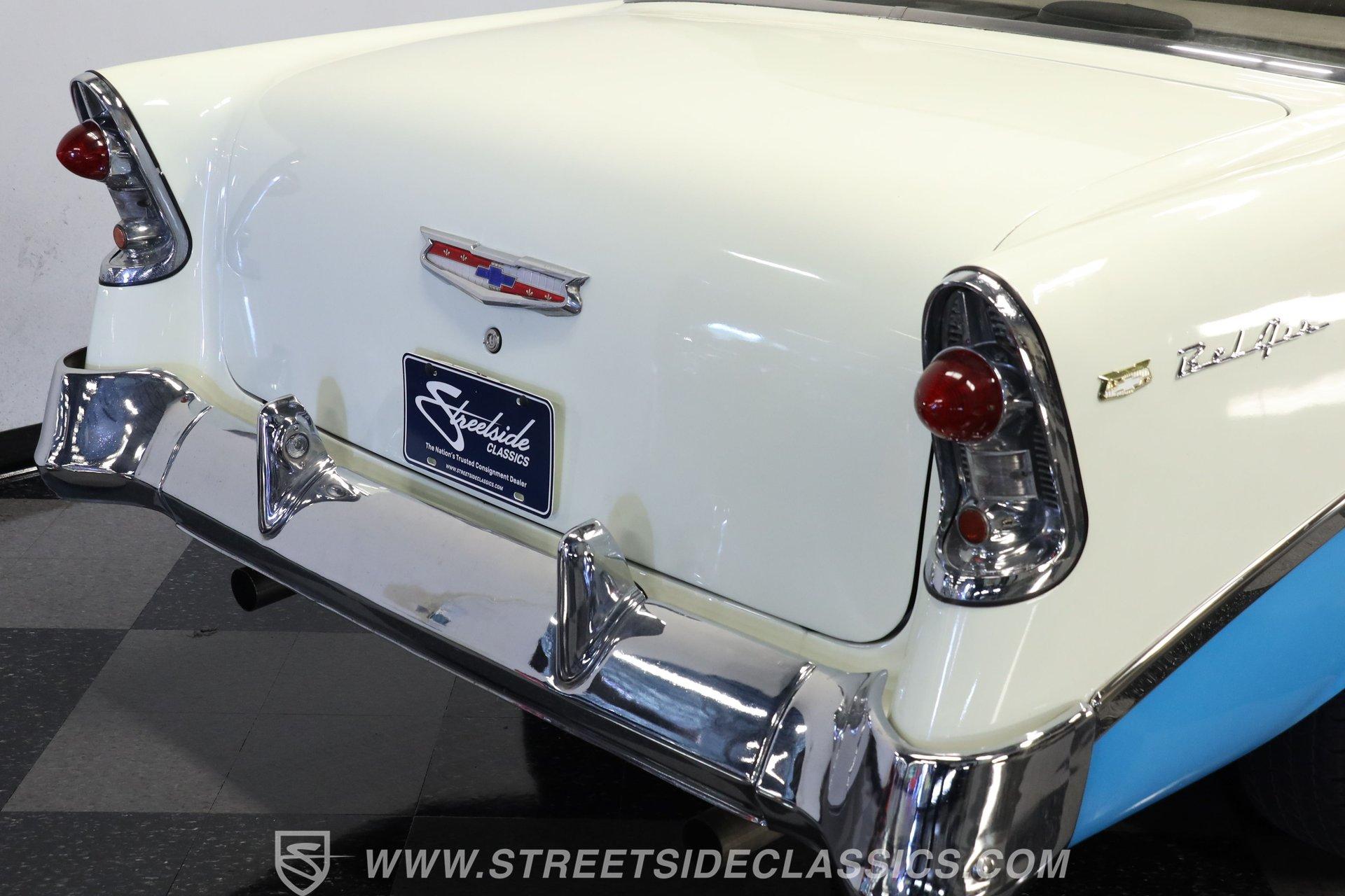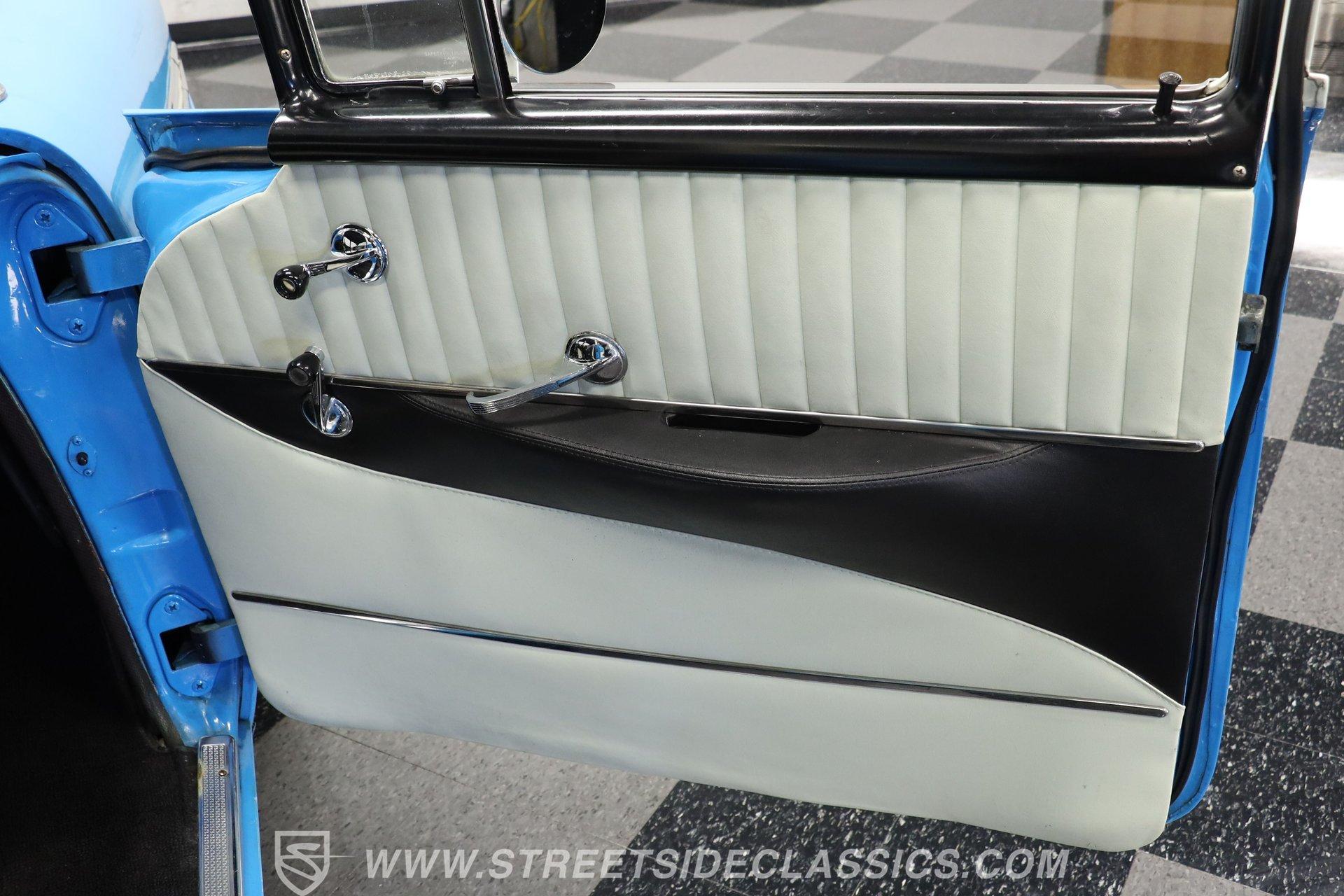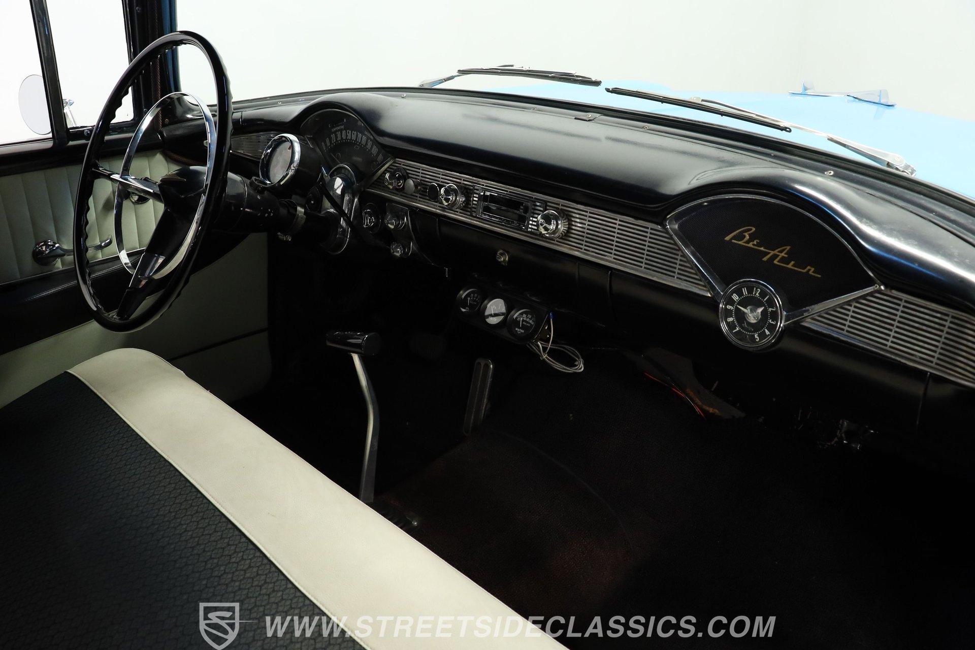 This 1956 Chevrolet Bel Air 4 Door Sedan captures the essence of 1950s automotive design. The Nassau Blue and India Ivory paint job isn't just eye-candy - it's a time machine on wheels. Stretching a full 200 inches, this Bel Air flaunts more chrome than a '50s diner. The iconic side spear splits the colors like a lightning bolt, pure automotive electricity. Perched on 15-inch wheels hugged by 235/75R15 whitewalls, this Chevy's stance is pure '50s cool with a dash of modern grip. From its hooded headlights to those rocket-inspired taillights and features the now-iconic "Dagmar" front bumper guards. Step into a time capsule of mid-century design. The interior, finished in black and white, perfectly complements the exterior. Bench seats upholstered in a combination of vinyl and cloth offer ample room for six passengers. The dashboard, a marvel of 1950s styling, features an arched speedometer and chrome accents that sparkle like jewelry. A column-mounted Sunpro Super Tach ll and a set of under-dash Autogauge gauges monitor engine functions. The floor shifter and manual windows maintain the car's nostalgic feel, while an upgraded AM/FM/cassette radio adds a touch of convenience to the driving experience. Under the hood, a 350 cubic inch V8 engine breathes through a Edelbrock intake and Holley four-barrel carburetor, delivering smooth, reliable power. The floor-shifted TH350 three-speed automatic transmission offers direct control over the drivetrain. Other upgrades include an Excel Power coil, chrome alternator, and black Chevrolet Performance valve covers with matching open-element air cleaner. Power front disc brakes provide improved stopping power and safety. A set of long-tube Hedman headers flow back through a dual exhaust system with Pypes Street Pro mufflers, giving this Bel Air a subtle rumble. HIGHLIGHTS: 350 V8 Engine TH350 3-Speed Automatic Transmission Edelbrock Intake Manifold Front Power Disc brakes Holley Carburetor Headers Excel Coil Dual Exhaust with Pypes Street Pro mufflers Nassau Blue and India Ivory Two-Tone Paint Chrome Bumpers and Trim 15-inch Wheels in 205/75R15 Whitewall Tires Front Seat Belts Black and White Interior with Bench seats Sunpro Super Tach and Under-Dash Gauges Floor Shifter Aluminum Radiator Hedman Headers This 1956 Chevrolet Bel Air 4 Door Sedan combines classic '50s style with thoughtful upgrades. Its healthy 350 V8 engine, eye-catching two-tone paint, and spacious interior make it perfect for cruising in vintage American luxury. Experience the golden age of Detroit iron. Call today! Be sure to ask about our services offered; Financing, Vehicle Protection Plan, Insurance, and Transportation to your driveway!