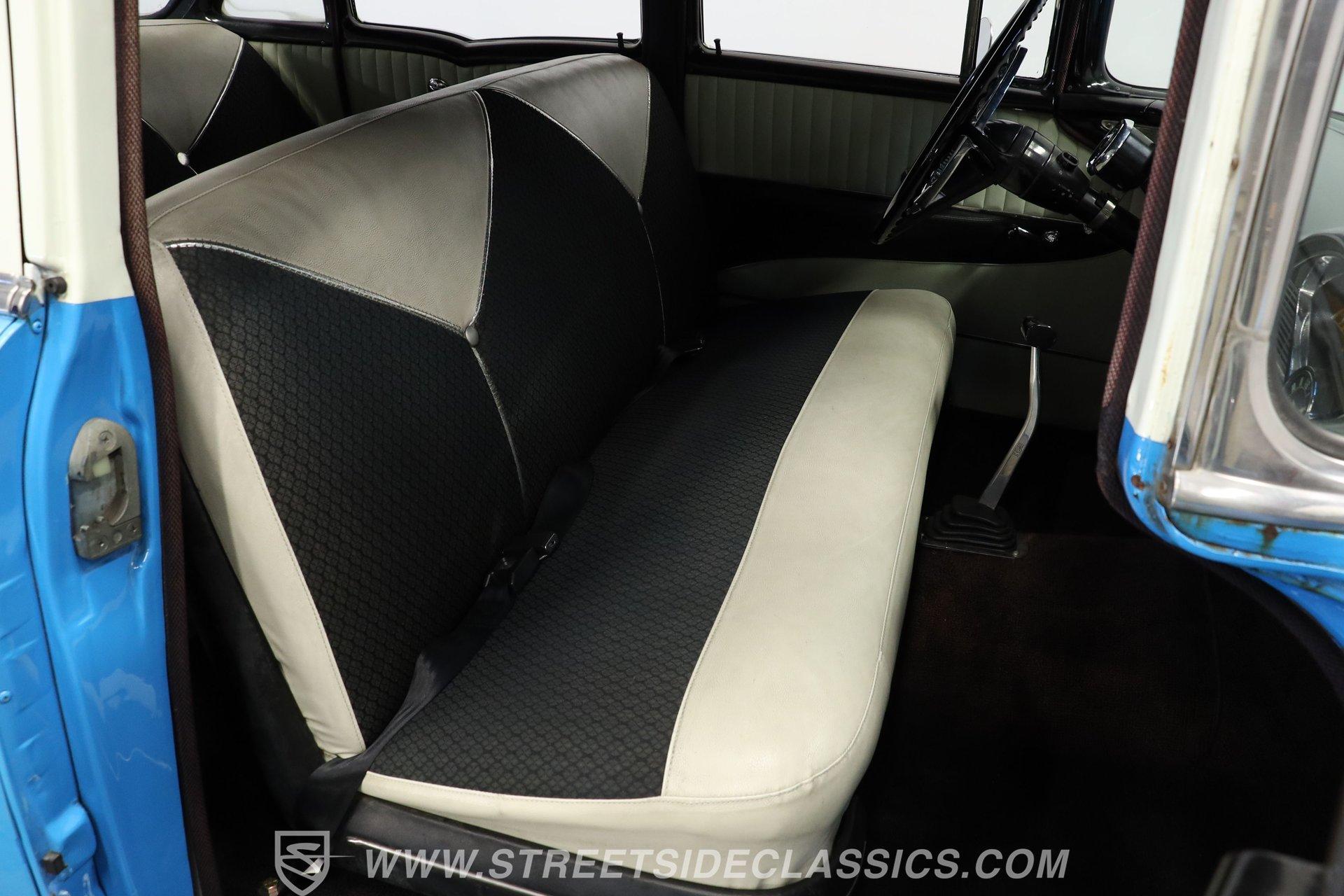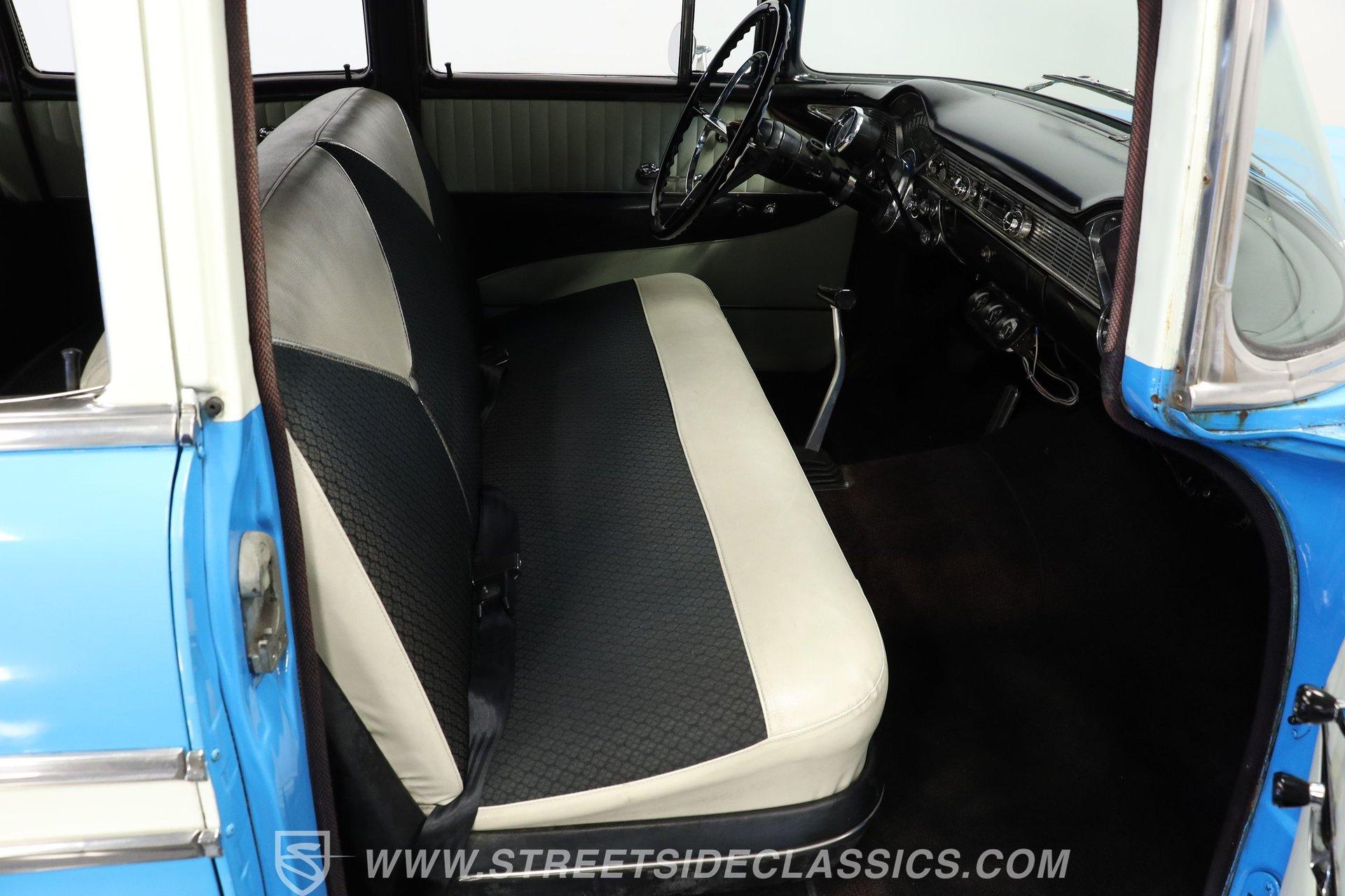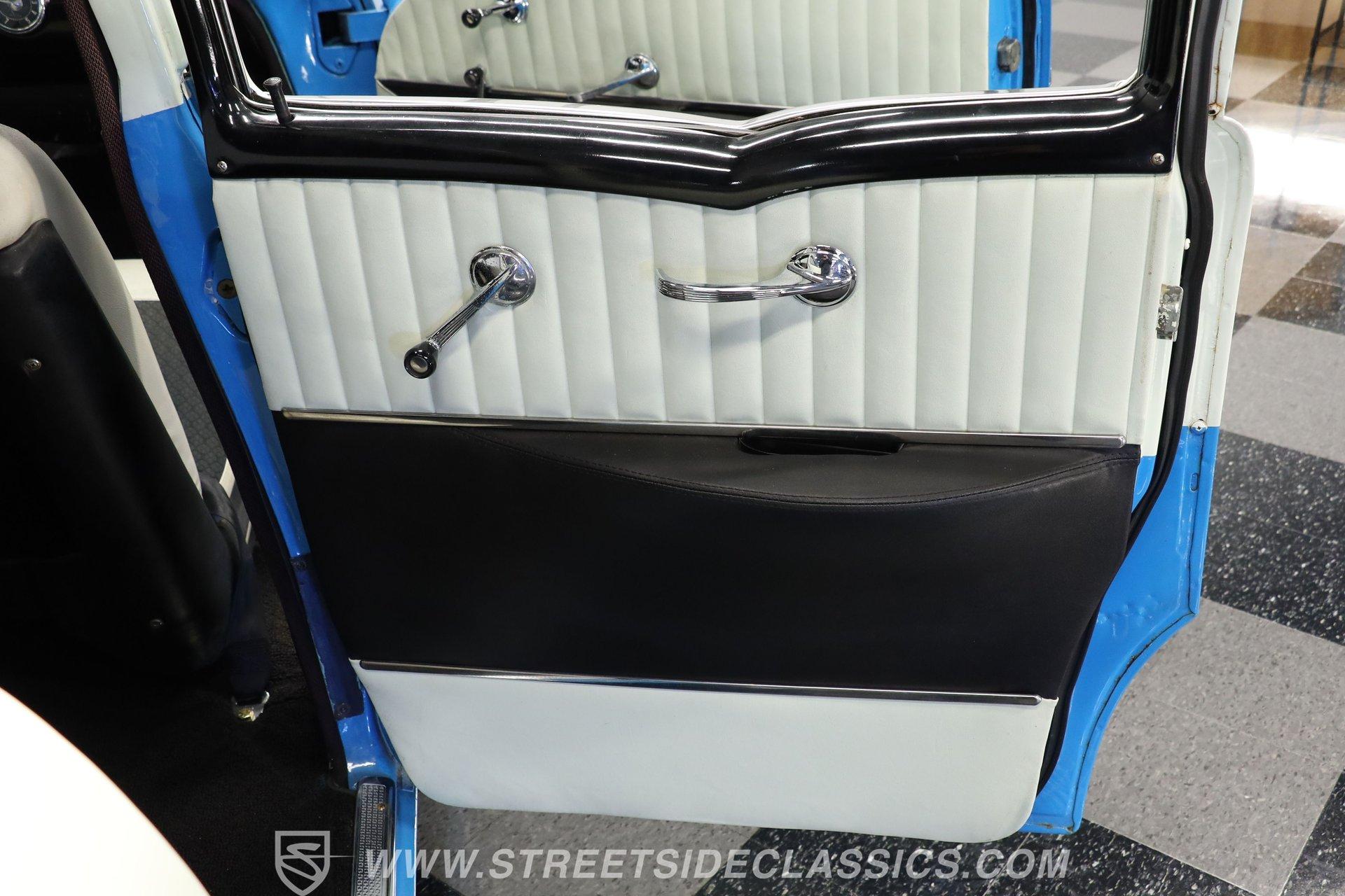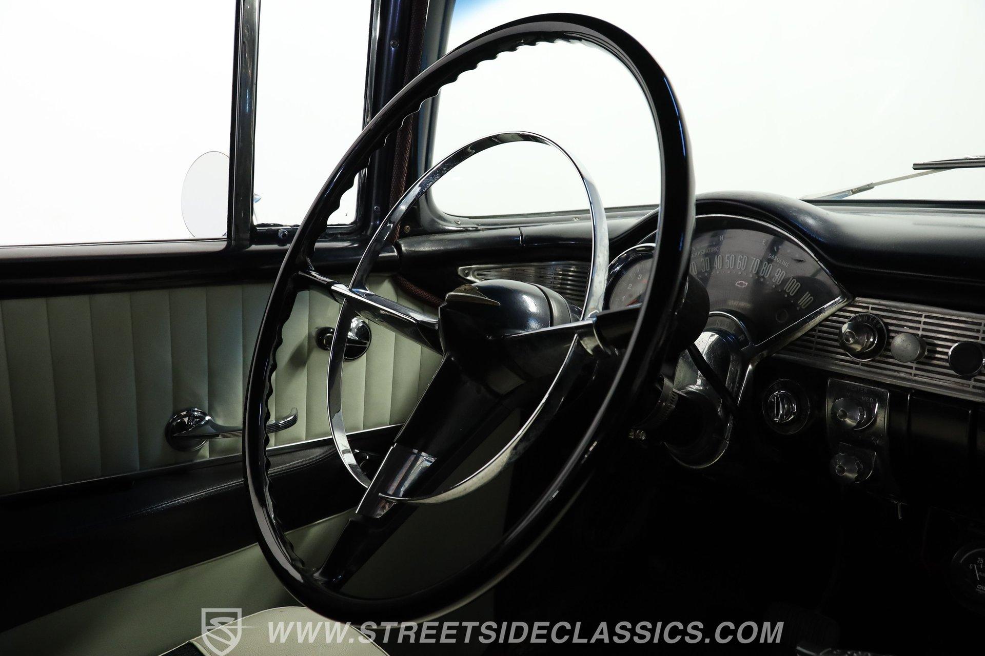 This 1956 Chevrolet Bel Air 4 Door Sedan captures the essence of 1950s automotive design. The Nassau Blue and India Ivory paint job isn't just eye-candy - it's a time machine on wheels. Stretching a full 200 inches, this Bel Air flaunts more chrome than a '50s diner. The iconic side spear splits the colors like a lightning bolt, pure automotive electricity. Perched on 15-inch wheels hugged by 235/75R15 whitewalls, this Chevy's stance is pure '50s cool with a dash of modern grip. From its hooded headlights to those rocket-inspired taillights and features the now-iconic "Dagmar" front bumper guards. Step into a time capsule of mid-century design. The interior, finished in black and white, perfectly complements the exterior. Bench seats upholstered in a combination of vinyl and cloth offer ample room for six passengers. The dashboard, a marvel of 1950s styling, features an arched speedometer and chrome accents that sparkle like jewelry. A column-mounted Sunpro Super Tach ll and a set of under-dash Autogauge gauges monitor engine functions. The floor shifter and manual windows maintain the car's nostalgic feel, while an upgraded AM/FM/cassette radio adds a touch of convenience to the driving experience. Under the hood, a 350 cubic inch V8 engine breathes through a Edelbrock intake and Holley four-barrel carburetor, delivering smooth, reliable power. The floor-shifted TH350 three-speed automatic transmission offers direct control over the drivetrain. Other upgrades include an Excel Power coil, chrome alternator, and black Chevrolet Performance valve covers with matching open-element air cleaner. Power front disc brakes provide improved stopping power and safety. A set of long-tube Hedman headers flow back through a dual exhaust system with Pypes Street Pro mufflers, giving this Bel Air a subtle rumble. HIGHLIGHTS: 350 V8 Engine TH350 3-Speed Automatic Transmission Edelbrock Intake Manifold Front Power Disc brakes Holley Carburetor Headers Excel Coil Dual Exhaust with Pypes Street Pro mufflers Nassau Blue and India Ivory Two-Tone Paint Chrome Bumpers and Trim 15-inch Wheels in 205/75R15 Whitewall Tires Front Seat Belts Black and White Interior with Bench seats Sunpro Super Tach and Under-Dash Gauges Floor Shifter Aluminum Radiator Hedman Headers This 1956 Chevrolet Bel Air 4 Door Sedan combines classic '50s style with thoughtful upgrades. Its healthy 350 V8 engine, eye-catching two-tone paint, and spacious interior make it perfect for cruising in vintage American luxury. Experience the golden age of Detroit iron. Call today! Be sure to ask about our services offered; Financing, Vehicle Protection Plan, Insurance, and Transportation to your driveway!