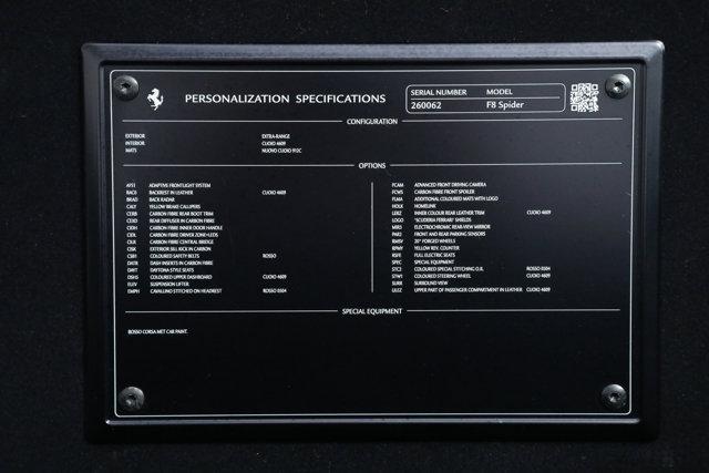 Ferrari F8 Spider- FERRARI CERTIFIED PRE-OWNED - AVAILABLE EXTENDED FERRARI WARRANTY -- Rosso Corsa Metallic over Cuoio - Pristine Condition - Many Fine Options - Expertly Maintained by Authorized Ferrari Dealers - Available Extended Ferrari Warranty - Complimentary Ferrari Genuine Maintenance Service to 12/12/27 -Factory Options:- Suspension Lifter- Special Paint Color- Carbon Fiber Front Spoiler- Carbon Fiber Rear Diffuser- Carbon Fiber Rear Boot Trim- Carbon Fiber Driver Zone with LED Steering Wheel- Carbon Fiber Dashboard Inserts- Carbon Fiber Central Bridge- Carbon Fiber Inner Door Handles- Carbon Fiber Exterior Sill Kicks- 20-inch Forged Wheels- Yellow Brake Calipers- Scuderia Ferrari Shields- Full Electric Seats- Daytona Style Seats- Cavallino Stitched to Headrests in Rosso- Special Stitching in Rosso- Colored Seatbelts in Rosso- Leather Seat Backrests in Cuoio- Colored Steering Wheel in Cuoio- Colored Upper Dashboard in Cuoio- Leather Upper Part in Cuoio- Leather Rear Trim in Cuoio- Surround View- Adaptive Frontlight System (AFS)- Advanced Front Driving Camera- Rear Radar- HomeLink- Electrochromic Rearview Mirror- Front and Rear Parking Sensors- Embroidered Mats with LogoIf you are in the market for a Ferrari F8 Spider, please call or email us today.This Ferrari has passed a multi-point inspection performed by our factory trained technicians, and has been enrolled in the Ferrari Approved Certified Pre-Owned Program. The Certified program makes available up to two years of additional Ferrari Power Approved Warranty coverage. Please see dealer for more details.