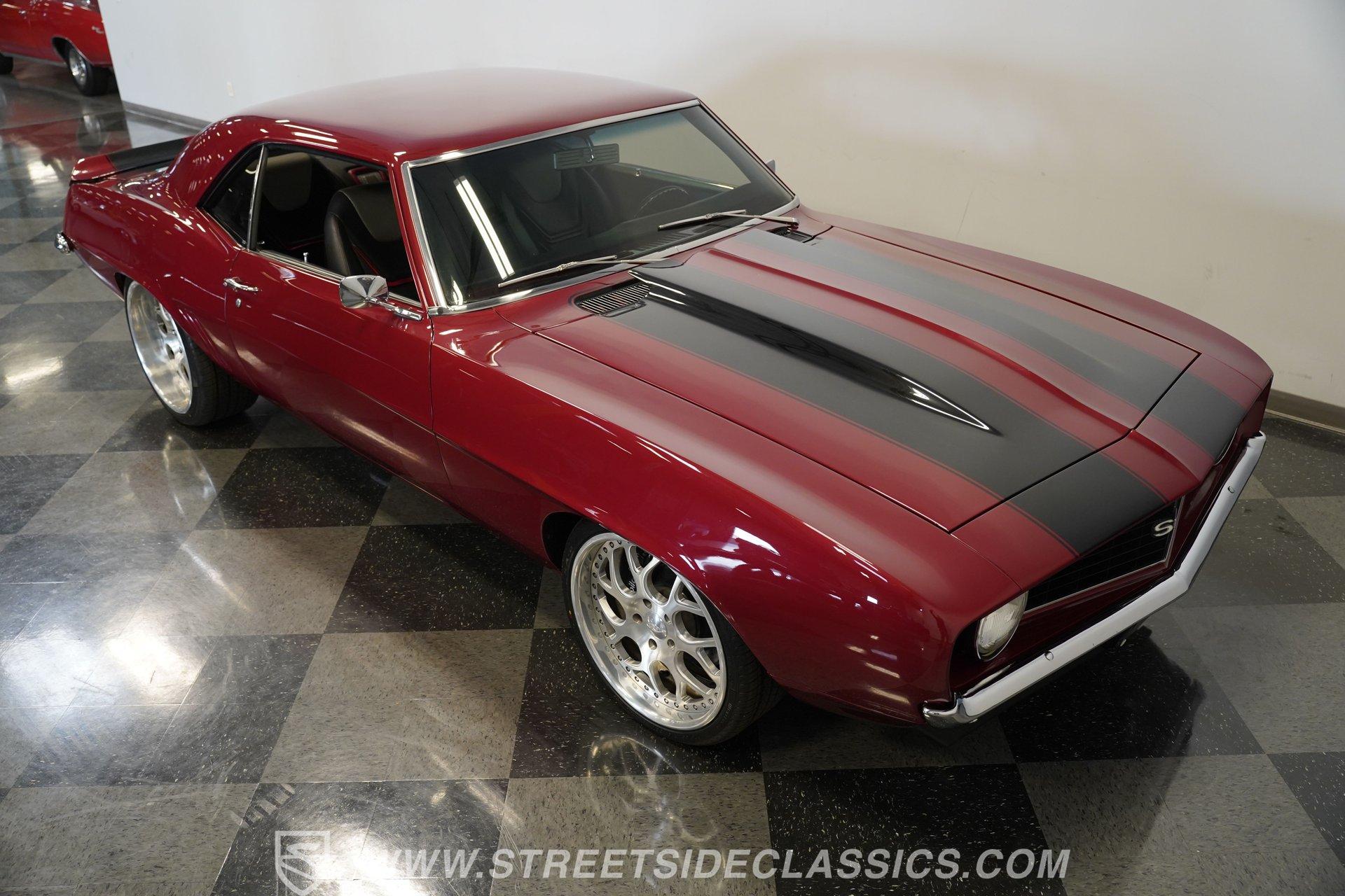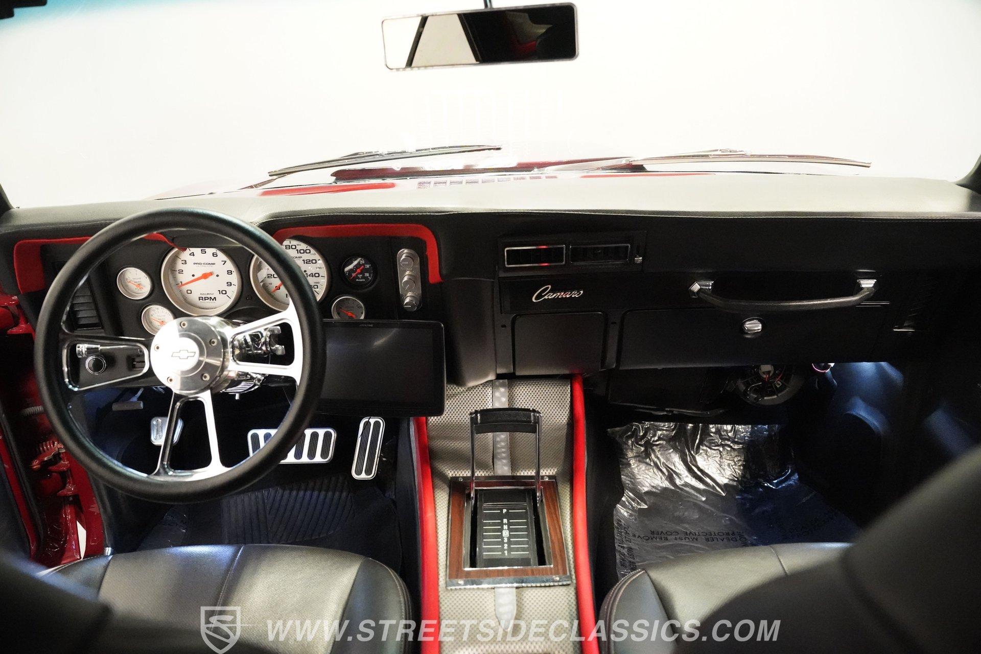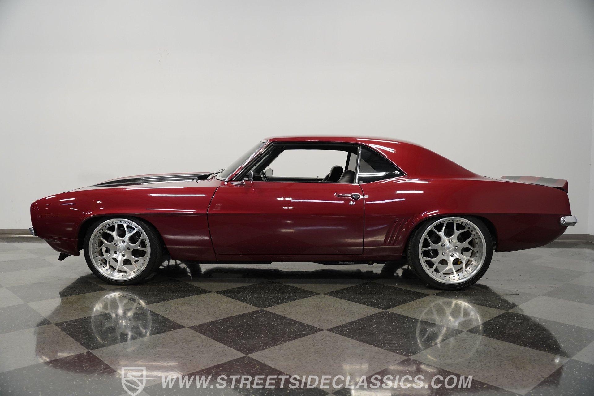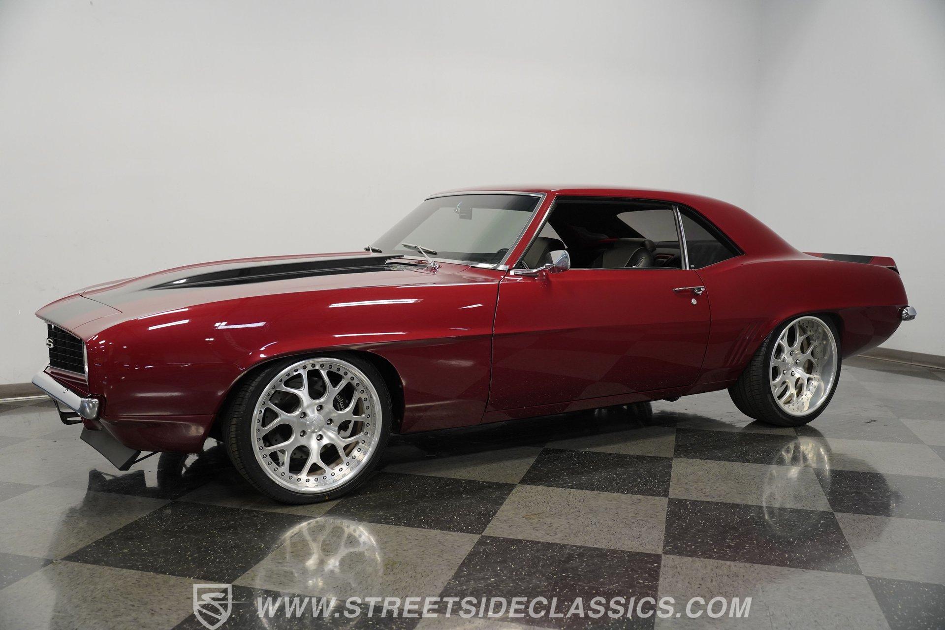 When it comes to muscle cars, there is nothing quite like a first-generation Camaro. Power, prestige, and pizazz begin to describe this beautiful 1969 Chevrolet Camaro SS Tribute. Fully repainted in a deep burgundy red exterior, complete with twin full-length black racing stripes, this racy restomod sports the correct grille and rear SS badges, along with its ducktail spoiler, cowl hood, and lowered stance, all complemented by its big polished Intro wheels. But before we get to the powerplant part of the fun, first let us introduce you to this exquisitely redone custom interior. Upgraded with premium black vinyl with red inserts for both the front and rear seats, this Camaro also features a power-assisted, six-spoke steering wheel that sits just ahead of a set of white-faced Auto Meter gauges set against a matte black dash panel. An Alpine AM/FM/AUX/Satellite touchscreen offers Bluetooth connectivity, giving you all of the entertainment options available to modern vehicles. A staple-style shifter and padded expletive handle give both the driver and passenger something to hold onto when this Pony Car really digs in. Under that aggressive hood, we find a clean engine bay with a powerful 350 cubic-inch V-8. A single four-barrel Holley Quick Fuel carburetor feeds an aluminum Weiland intake manifold, while a set of Patriot long-tube headers channels exhaust gases through a true dual exhaust, complete with FlowMaster mufflers for that unmistakably authentic muscle car sound. Power from that small block gets funneled through a 700R4 four-speed automatic transmission before heading out to the ten-bolt rear end. The aforementioned 20-inch Intro wheels are shod in 265/35ZR-120 in the rear, while staggered 225/35ZR-19 Westlake SA-07 rubber covers 19-inch wheels up front. HIGHLIGHTS: Full Burgundy Red Repaint Black Racing Stripes SS Badges SS Spoiler Cowl Hood 350ci V8 Holley QFT Carb Weiland Intake Patriot Long Tubes Dual Exhaust FlowMasters 700R4 Four Speed Auto Ten Bolt Rear Four Wheel Discs Cross Drilled Slotted Rotors Wilwood Calipers Tubular A-arm Front Suspension Front Coilovers Sway Bars Rear Hotchkis Sport Suspension Lowered Power Steering Fully Redone Custom Interior Premium Vinyl Seats AC Auto Meter Gauges Custom Wheel Alpine Touchscreen Satellite Radio Bluetooth This 1969 Chevrolet Camaro SS Tribute isn't just a straight-line monster. Thanks to a tubular A-Arm front end suspension, complete with adjustable coilovers and a sway car, and a rear setup featuring a Hotchkis Sport Suspension, sway bar, and Bilstein shocks, this Pony Car can gallop through the twisties too. A set of four-wheel disc brakes featuring cross-drilled and slotted rotors and Wilwood calipers stands ready to scrub off speed whenever necessary. If you enjoy the thrill of a first-gen Camaro as much as we do, then don't wait any longer because this beautiful burgundy boulevard bruiser won't be around long. Call today!