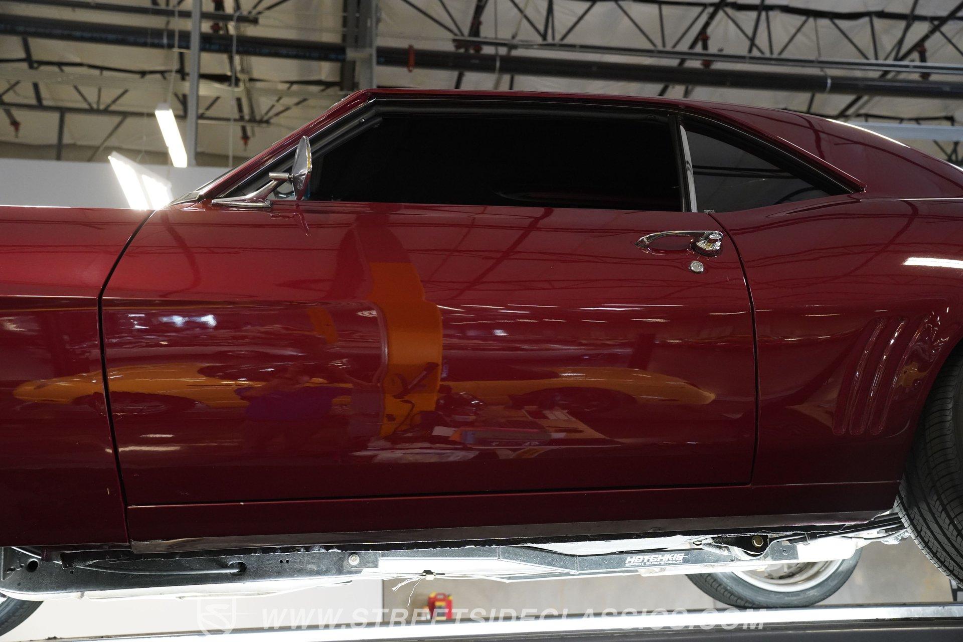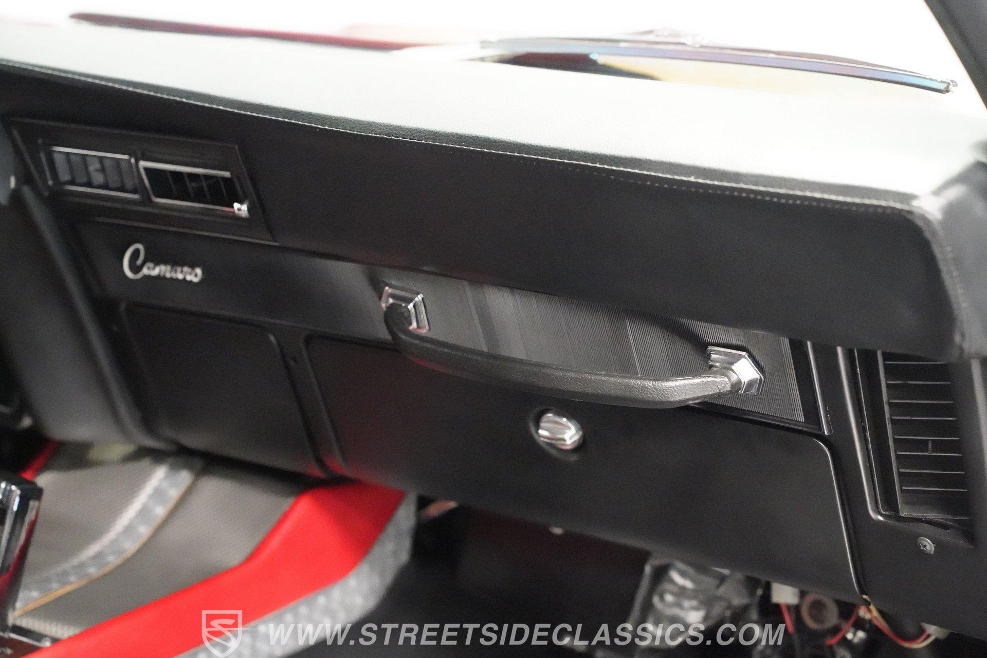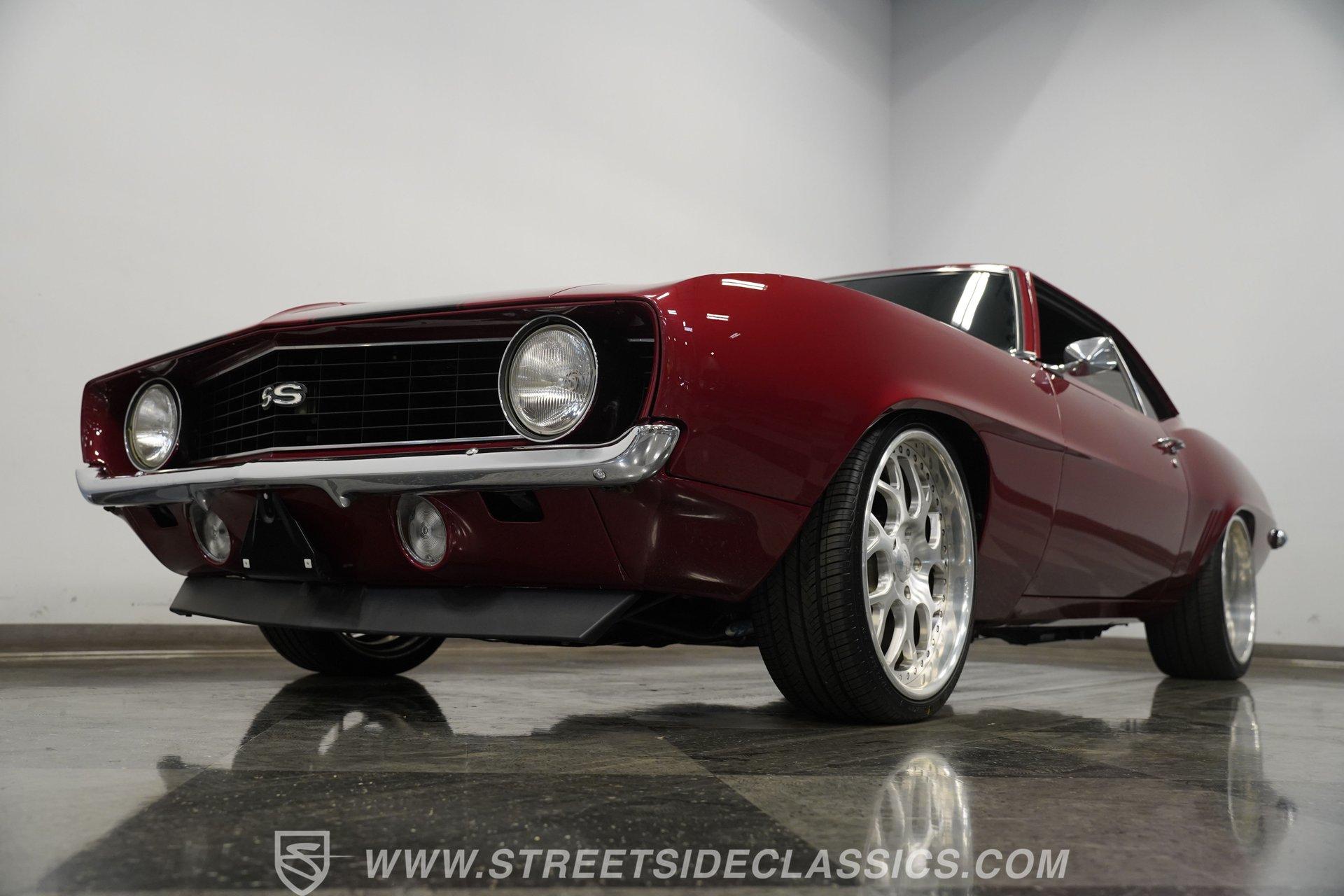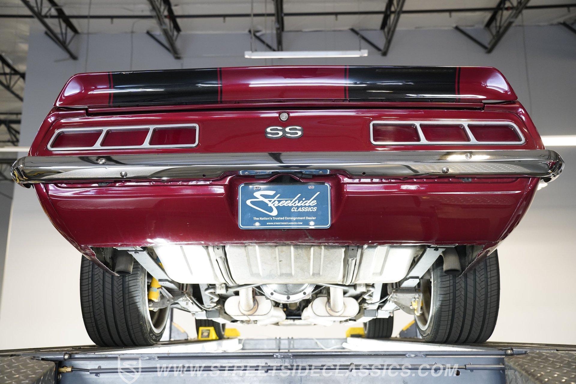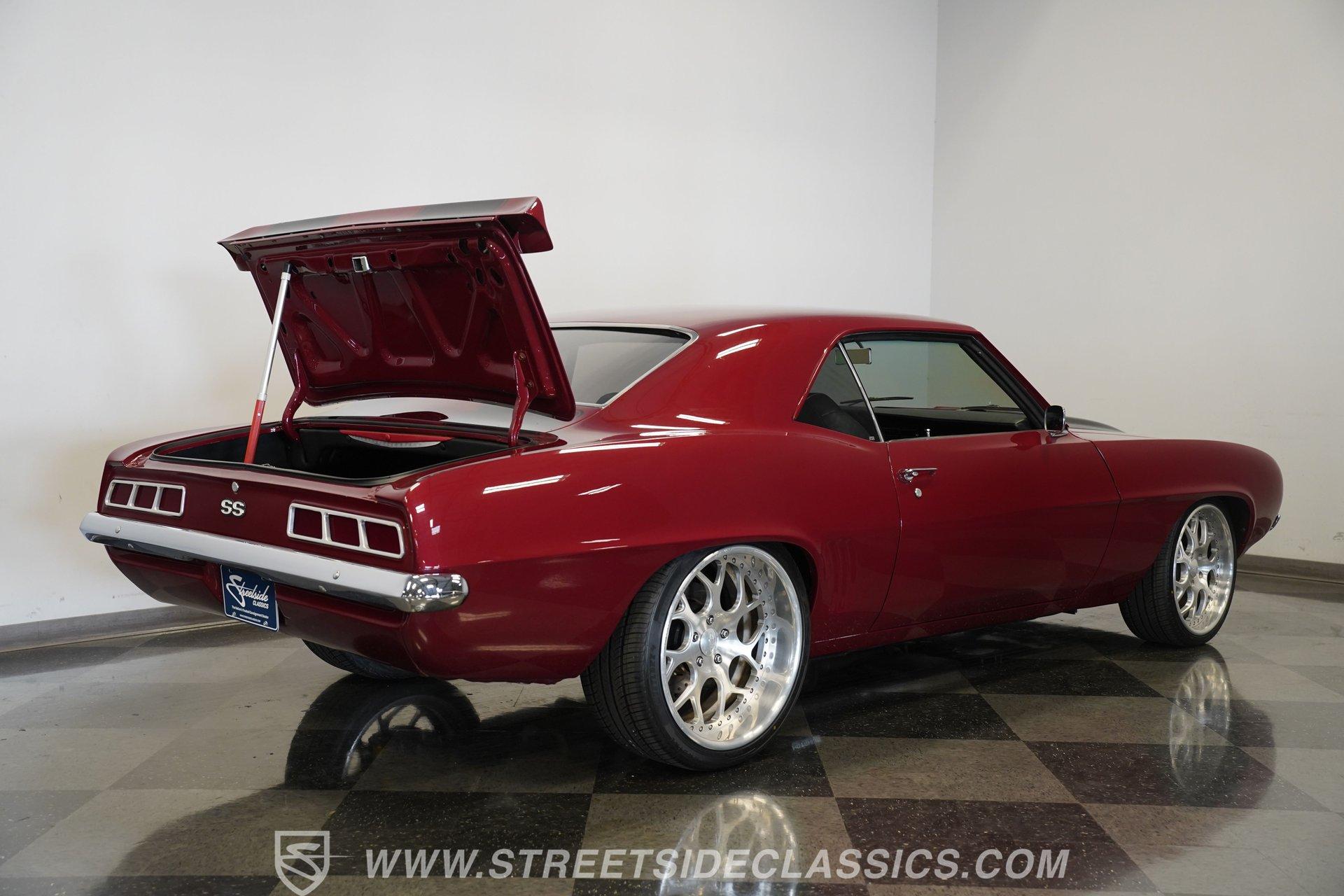 When it comes to muscle cars, there is nothing quite like a first-generation Camaro. Power, prestige, and pizazz begin to describe this beautiful 1969 Chevrolet Camaro SS Tribute. Fully repainted in a deep burgundy red exterior, complete with twin full-length black racing stripes, this racy restomod sports the correct grille and rear SS badges, along with its ducktail spoiler, cowl hood, and lowered stance, all complemented by its big polished Intro wheels. But before we get to the powerplant part of the fun, first let us introduce you to this exquisitely redone custom interior. Upgraded with premium black vinyl with red inserts for both the front and rear seats, this Camaro also features a power-assisted, six-spoke steering wheel that sits just ahead of a set of white-faced Auto Meter gauges set against a matte black dash panel. An Alpine AM/FM/AUX/Satellite touchscreen offers Bluetooth connectivity, giving you all of the entertainment options available to modern vehicles. A staple-style shifter and padded expletive handle give both the driver and passenger something to hold onto when this Pony Car really digs in. Under that aggressive hood, we find a clean engine bay with a powerful 350 cubic-inch V-8. A single four-barrel Holley Quick Fuel carburetor feeds an aluminum Weiland intake manifold, while a set of Patriot long-tube headers channels exhaust gases through a true dual exhaust, complete with FlowMaster mufflers for that unmistakably authentic muscle car sound. Power from that small block gets funneled through a 700R4 four-speed automatic transmission before heading out to the ten-bolt rear end. The aforementioned 20-inch Intro wheels are shod in 265/35ZR-120 in the rear, while staggered 225/35ZR-19 Westlake SA-07 rubber covers 19-inch wheels up front. HIGHLIGHTS: Full Burgundy Red Repaint Black Racing Stripes SS Badges SS Spoiler Cowl Hood 350ci V8 Holley QFT Carb Weiland Intake Patriot Long Tubes Dual Exhaust FlowMasters 700R4 Four Speed Auto Ten Bolt Rear Four Wheel Discs Cross Drilled Slotted Rotors Wilwood Calipers Tubular A-arm Front Suspension Front Coilovers Sway Bars Rear Hotchkis Sport Suspension Lowered Power Steering Fully Redone Custom Interior Premium Vinyl Seats AC Auto Meter Gauges Custom Wheel Alpine Touchscreen Satellite Radio Bluetooth This 1969 Chevrolet Camaro SS Tribute isn't just a straight-line monster. Thanks to a tubular A-Arm front end suspension, complete with adjustable coilovers and a sway car, and a rear setup featuring a Hotchkis Sport Suspension, sway bar, and Bilstein shocks, this Pony Car can gallop through the twisties too. A set of four-wheel disc brakes featuring cross-drilled and slotted rotors and Wilwood calipers stands ready to scrub off speed whenever necessary. If you enjoy the thrill of a first-gen Camaro as much as we do, then don't wait any longer because this beautiful burgundy boulevard bruiser won't be around long. Call today!