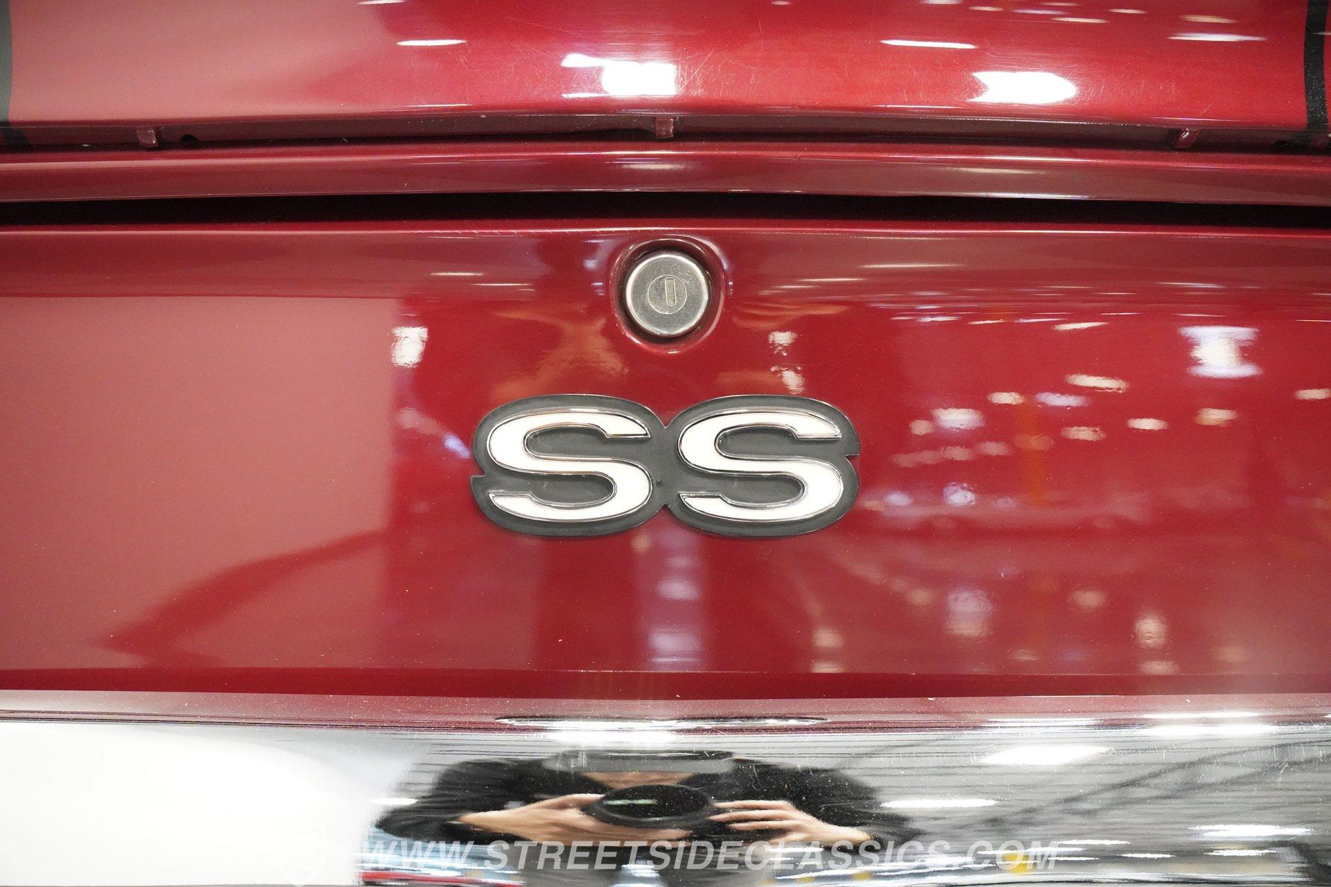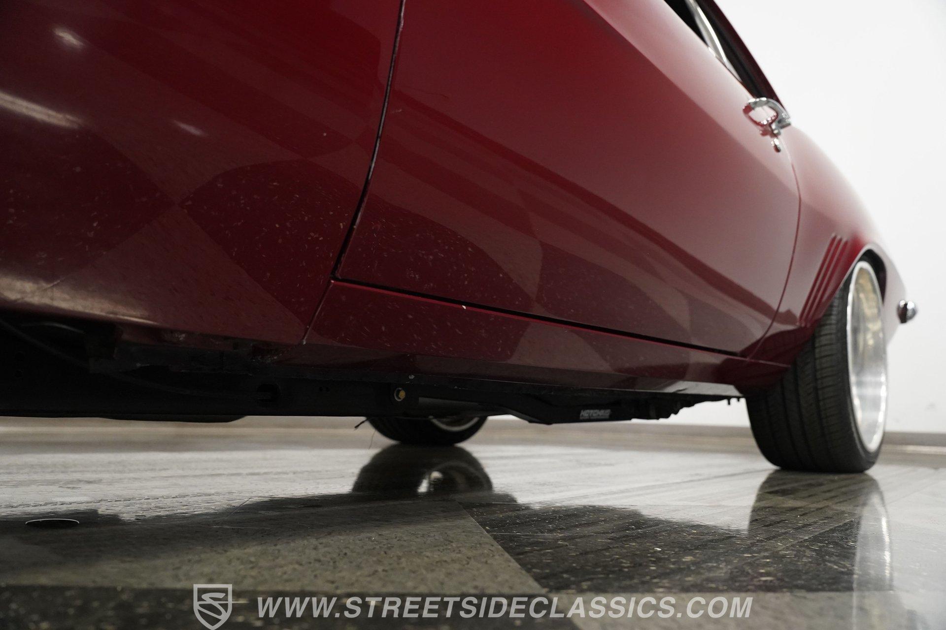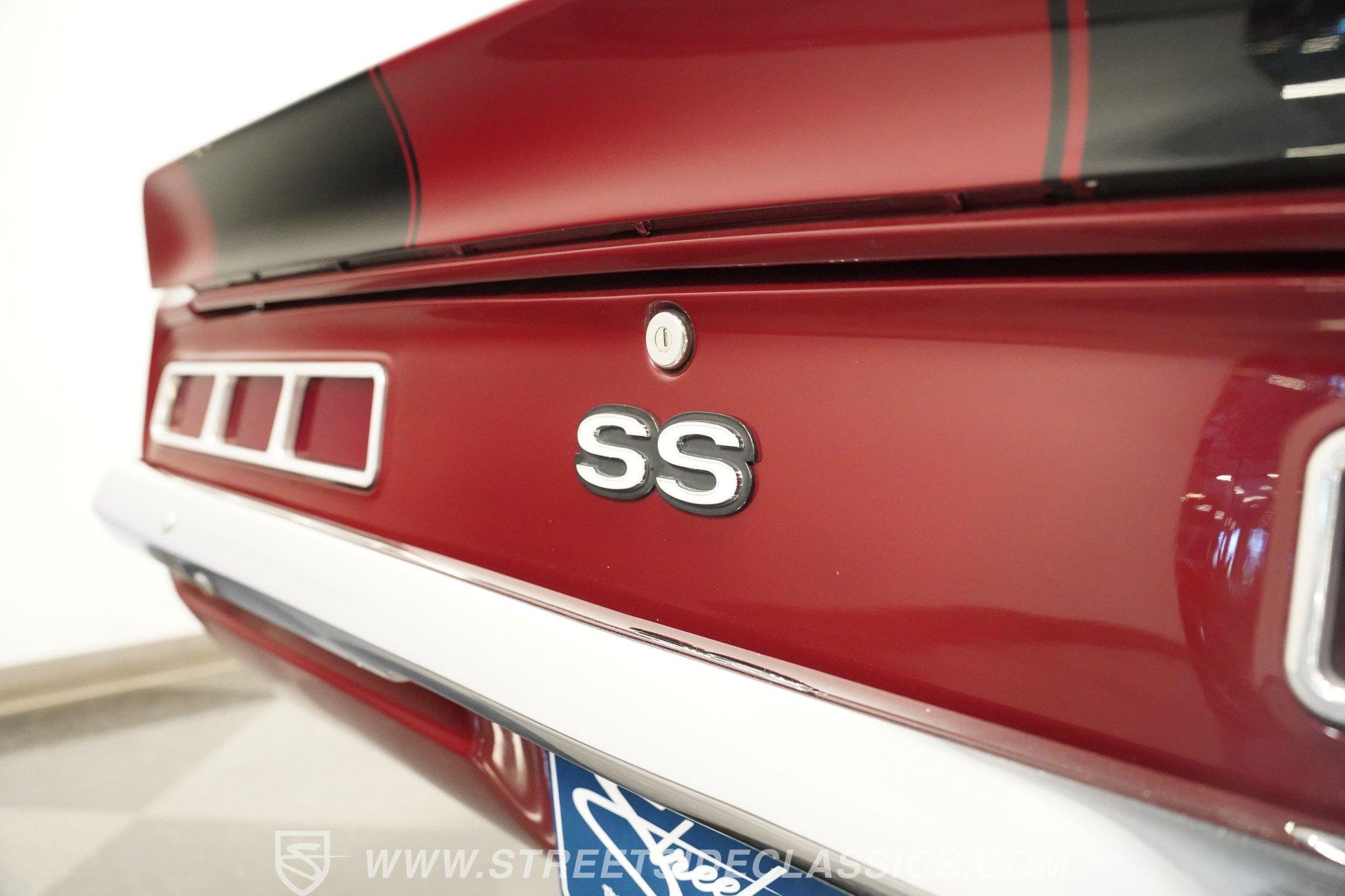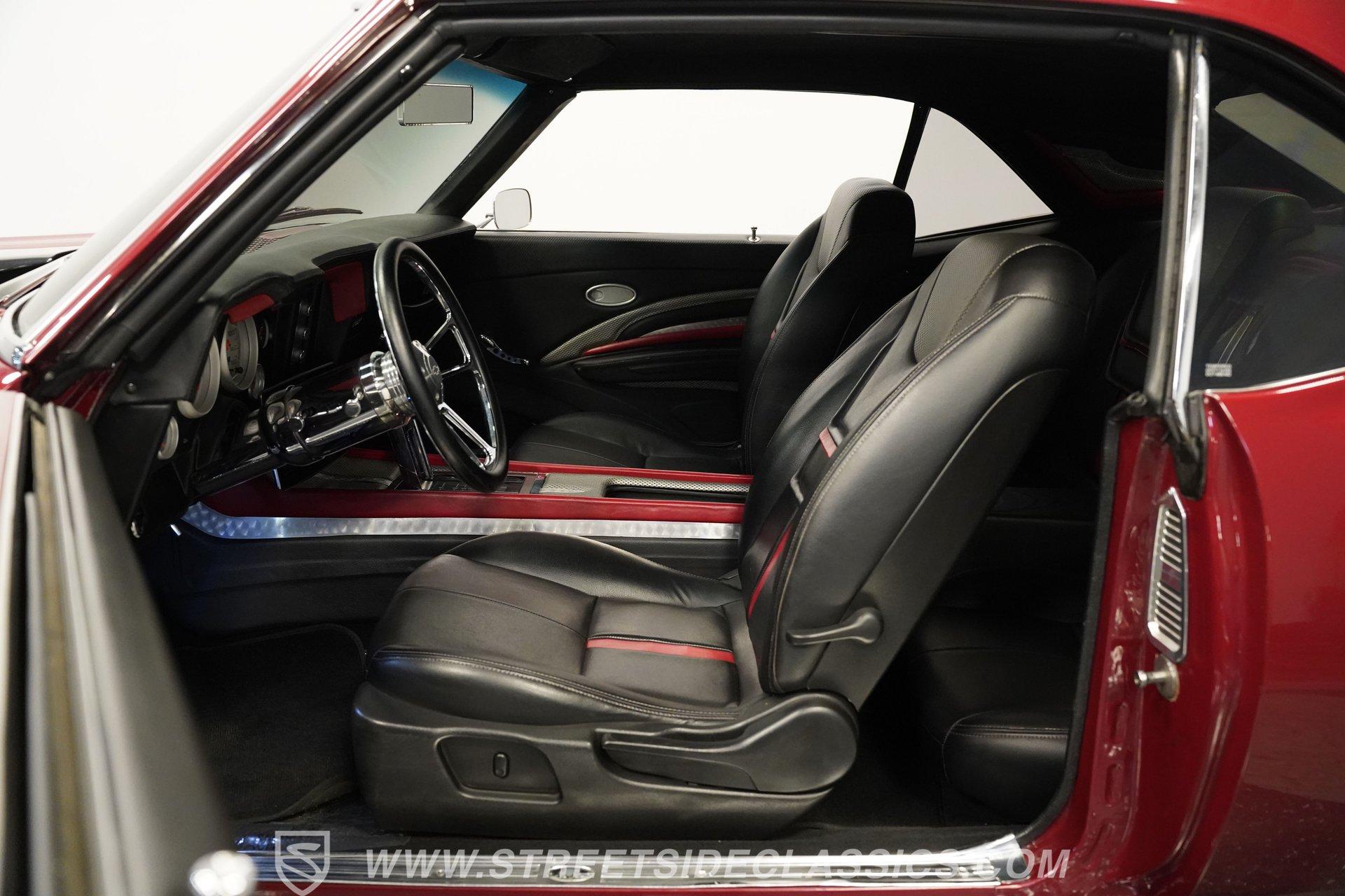 When it comes to muscle cars, there is nothing quite like a first-generation Camaro. Power, prestige, and pizazz begin to describe this beautiful 1969 Chevrolet Camaro SS Tribute. Fully repainted in a deep burgundy red exterior, complete with twin full-length black racing stripes, this racy restomod sports the correct grille and rear SS badges, along with its ducktail spoiler, cowl hood, and lowered stance, all complemented by its big polished Intro wheels. But before we get to the powerplant part of the fun, first let us introduce you to this exquisitely redone custom interior. Upgraded with premium black vinyl with red inserts for both the front and rear seats, this Camaro also features a power-assisted, six-spoke steering wheel that sits just ahead of a set of white-faced Auto Meter gauges set against a matte black dash panel. An Alpine AM/FM/AUX/Satellite touchscreen offers Bluetooth connectivity, giving you all of the entertainment options available to modern vehicles. A staple-style shifter and padded expletive handle give both the driver and passenger something to hold onto when this Pony Car really digs in. Under that aggressive hood, we find a clean engine bay with a powerful 350 cubic-inch V-8. A single four-barrel Holley Quick Fuel carburetor feeds an aluminum Weiland intake manifold, while a set of Patriot long-tube headers channels exhaust gases through a true dual exhaust, complete with FlowMaster mufflers for that unmistakably authentic muscle car sound. Power from that small block gets funneled through a 700R4 four-speed automatic transmission before heading out to the ten-bolt rear end. The aforementioned 20-inch Intro wheels are shod in 265/35ZR-120 in the rear, while staggered 225/35ZR-19 Westlake SA-07 rubber covers 19-inch wheels up front. HIGHLIGHTS: Full Burgundy Red Repaint Black Racing Stripes SS Badges SS Spoiler Cowl Hood 350ci V8 Holley QFT Carb Weiland Intake Patriot Long Tubes Dual Exhaust FlowMasters 700R4 Four Speed Auto Ten Bolt Rear Four Wheel Discs Cross Drilled Slotted Rotors Wilwood Calipers Tubular A-arm Front Suspension Front Coilovers Sway Bars Rear Hotchkis Sport Suspension Lowered Power Steering Fully Redone Custom Interior Premium Vinyl Seats AC Auto Meter Gauges Custom Wheel Alpine Touchscreen Satellite Radio Bluetooth This 1969 Chevrolet Camaro SS Tribute isn't just a straight-line monster. Thanks to a tubular A-Arm front end suspension, complete with adjustable coilovers and a sway car, and a rear setup featuring a Hotchkis Sport Suspension, sway bar, and Bilstein shocks, this Pony Car can gallop through the twisties too. A set of four-wheel disc brakes featuring cross-drilled and slotted rotors and Wilwood calipers stands ready to scrub off speed whenever necessary. If you enjoy the thrill of a first-gen Camaro as much as we do, then don't wait any longer because this beautiful burgundy boulevard bruiser won't be around long. Call today!