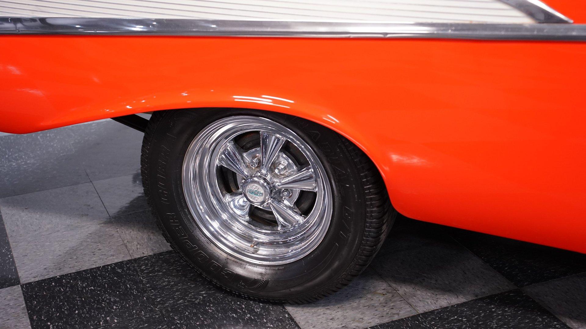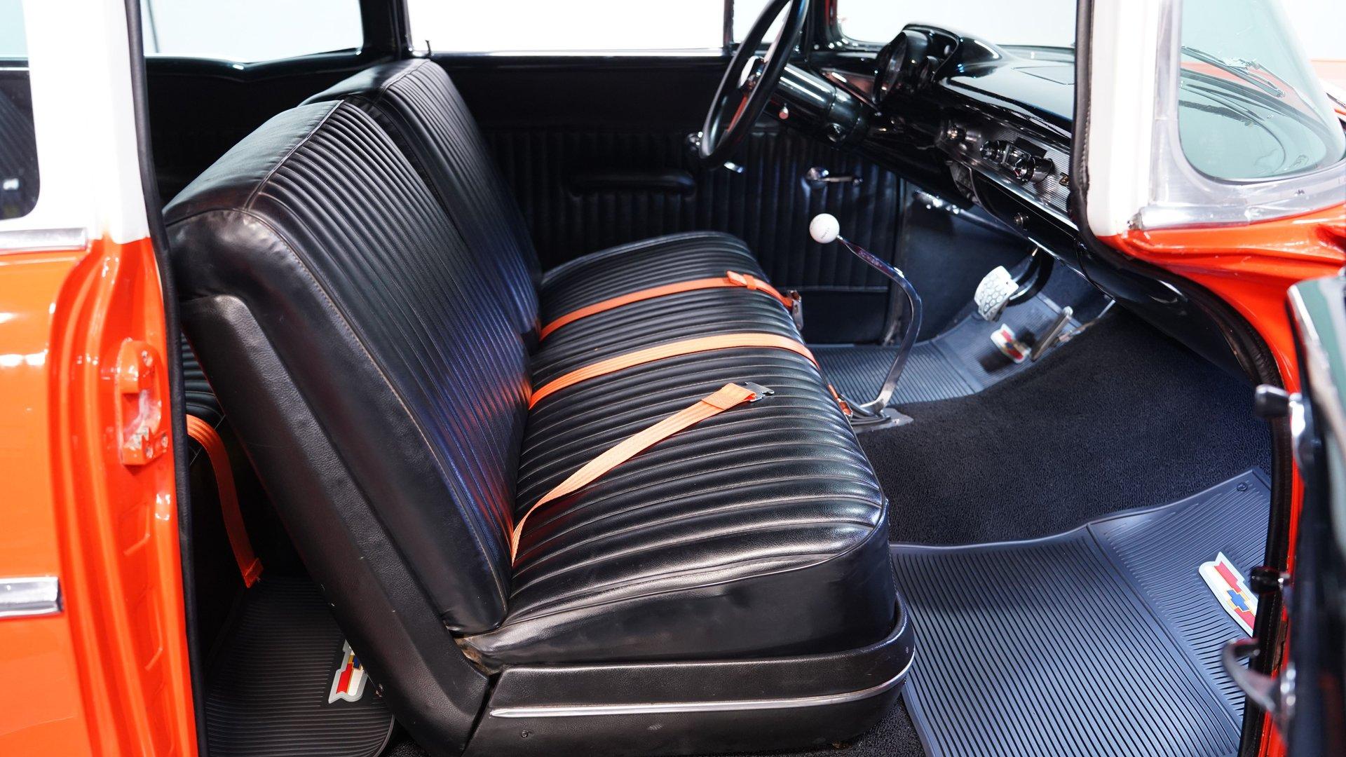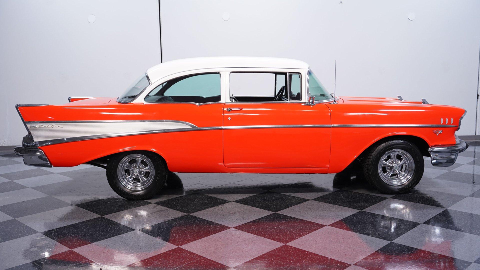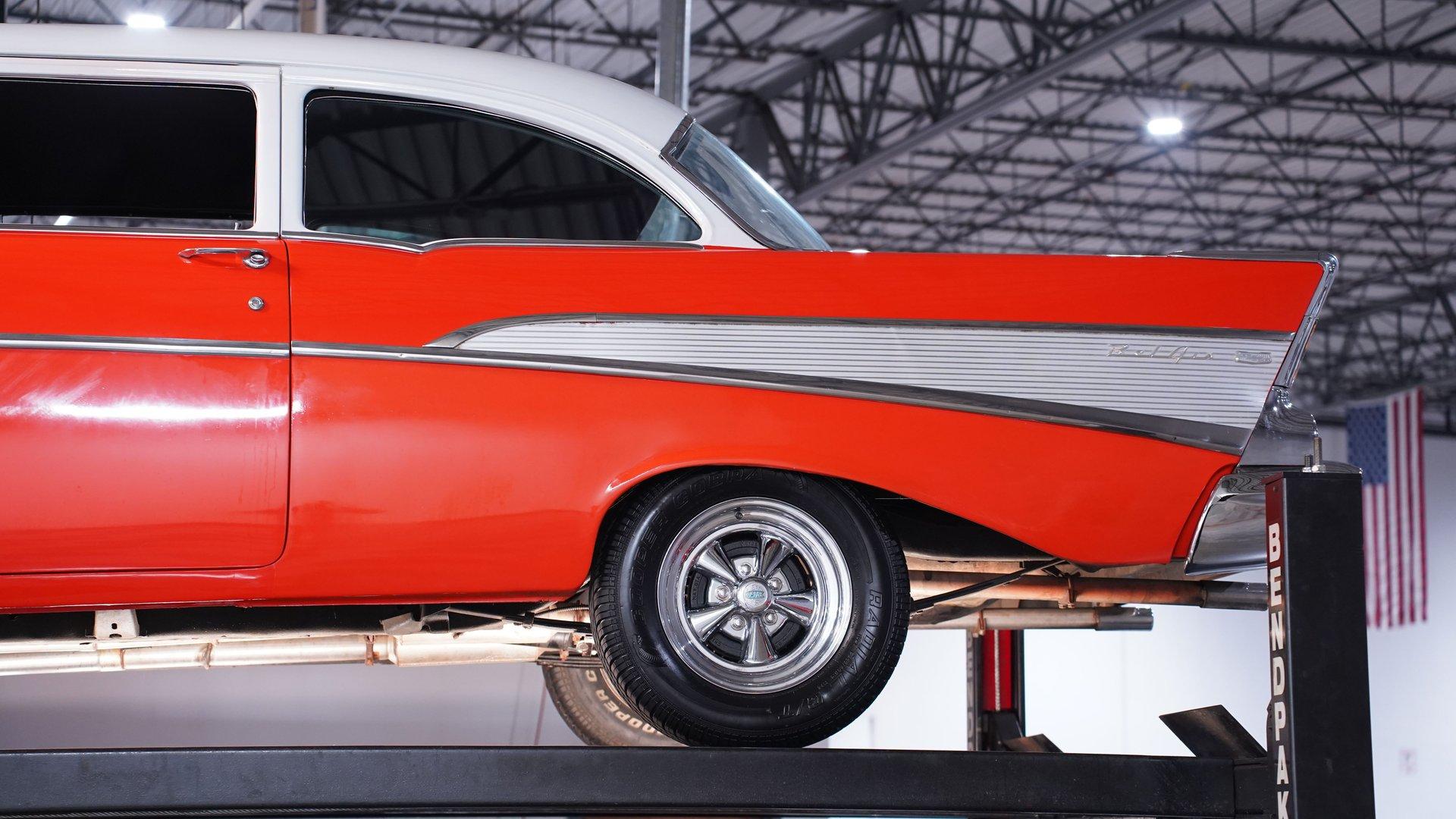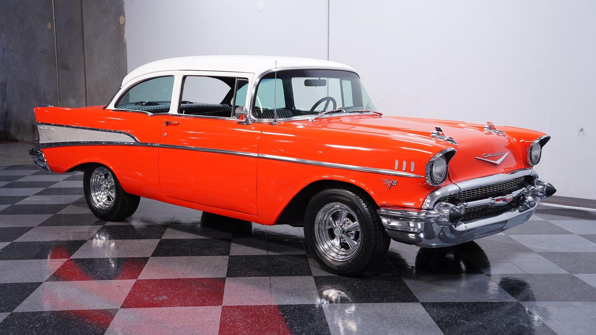 If you're on this site browsing cars, odds are that at some point, you have probably fantasized about owning a Tri-Five Chevy like this, fully repainted orange and white 1957 Chevrolet 210. Tastefully and thoughtfully modified, this two-door post has been upgraded to a Bel Air-level trim, with all its polished chrome in the right places, and retains its classically sporty look, which so many of us have fallen in love with over the years. Inside, we find a well-done tuck-and-roll style upholstery. Black leather seating is contrasted with orange seatbelts, while a matching orange insert is in the four-spoke power-assisted steering wheel. The traditional three-pod cluster has been upgraded with a set of Classics Instruments gauges. Push/pull HVAC knobs handle cabin temperature, while an old-school analog clock and Bel Air logo fill up the passenger side of the expansive dashboard. An upgraded AM/FM radio sits in its production spot, but offers the added benefit of Bluetooth connectivity. Under that signature '57 hood, we find a Summit 383 cubic-inch crate V-8. A single four-barrel Holley carburetor sits atop a high-rise intake manifold and lightweight aluminum heads, while spent gases are sent through a set of long-tube headers, and true dual exhaust capped off with a pair of FlowMaster mufflers gives this '57 the sound it should have had all along. If even more volume and efficiency are desired, then the dual electric cut-outs allow you to make a truly grand entrance. That power is routed through a T10 four-speed manual transmission before heading out to the twelve-bolt rear. HIGHLIGHTS: Upgraded Bel Air Trim Full Orange and White Repaint 383ci Stroker V8 Aluminum Heads Holley Four Barrel High Rise Intake Long Tubes FlowMaster Dual Exhaust Electronic Cutouts T10 Four Speed Manual 12 Bolt Rear Coilover Suspension Cragar SS Wheels Power Brakes Front Disc Brakes Power Steering Tuck and Roll Interior Leather Classics Instruments Gauges Hurst Shifter Orange Accents Sony Speakers AM/FM Stereo Bluetooth This 1957 Chevrolet 210 rides on a coilover suspension, with polished Cragar SS wheels shod in Cooper Cobra tires. Power brakes featuring front discs are ready to rein in speed whenever necessary, allowing you to simply enjoy cruising to the car show or down the interstate without a worry. If you're here, it probably means you've been set on a Tri-Five Chevy for a while, or have had a lingering thought about what it might be like to get behind the wheel of one of the most iconic cars in the history of the autoverse. So, what else are you waiting for? Call today!