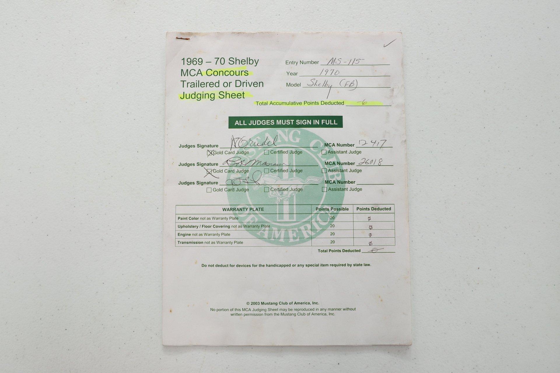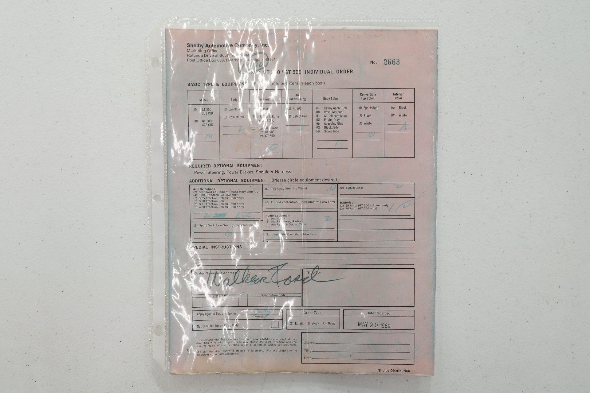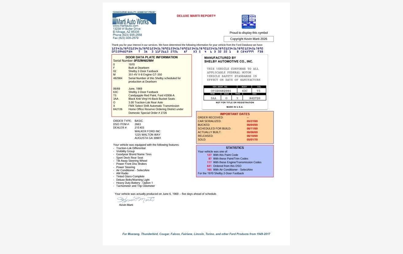 INTRODUCTION: Highly documented, VIN #s matching motor! Concours restored to factory condition and the judging sheets are included, it scored 655 points out of 661! There were only 789 Shelbys total in 1970, of those only 117 were GT350s with an automatic and only 87 were in these colors. Factor in air conditioning and how many survived- this is an extremely rare car! Documented with original invoice, order report, concours judging sheets, Marti Report and it is listed in the Shelby Registry. EXTERIOR: The Shelby styling changes truly separated itself from the Mustangs. Distinctive fiberglass features were on everything except the roof and the doors! Upfront a wide open grill and a hood with 5 air ducts feed as much air as possible to the 351. The extended front fenders, dovetail trunk and quarter panel scoops are also fiberglass and add to the good looks of this car. Upfront features correct Lucas fog lamps and in back is a set of sequential taillights borrowed from the 65 Thunderbird. The body is in excellent shape on this one, no rust and it fits nicely. Repainted its original beautiful Candy Apple Red which is polished smooth and glossy. The chrome, weatherstrips and glass look great. It's also sitting on Shelby wheels, has Shelby emblems and the unique Shelby exhaust port. INTERIOR: Shelby’s upgrades werent just limited to the exterior, there's plenty inside too! The deluxe interior is in great shape from carpet to headliner. The most notable Shelby feature is the roll bar with shoulder harnesses, actually all the seatbelts have Shelby logos. The consoles were also upgraded with a padded armrest, toggle switches and gauges. Shelby logos are throughout including on the wood shift handle. This one also features a factory tachometer, fold down rear seat, tilt away wheel and red mats sewn into the carpet. The radio is upgraded to a retro stereo that looks original with factory style door speakers. ENGINE COMPARTMENT: This is where the car really separates itself from the others, aside from having power steering, power brakes and factory air conditioning it has its actual VIN number matching motor! So many times people say they have the original motor and when it comes down to it they don't. This one has the VIN number stamped on the back of the engine below the head that matches the car. The entire engine compartment is restored and detailed. On top of the 351 is the complete ram air system including the heat riser tube. It's correct down to the details: cloth wrapped choke tube, reproduction hose clamps and stickers, Ford washer fluid bottle, Autolite breather cap, reproduction plug wires and more. A correct Autolite battery is even included for show purposes. All the finishes are proper, smooth and neatly applied. TRUNK COMPARTMENT: It is clean and complete, everything's painted real nice in red. It is finished off with reproduction stickers, weatherstrip and trunk mat. The original collapsible spare and jack assembly is included along with a working trunk light. UNDERSIDE: At the time of restoration everything under the car was rebuilt, restored and detailed to original condition. The floors, frame rails, inner rockers all appear to be clean metal painted a clean semi gloss finish. It even has the little rubber drain grommets in the lower 1/4s. The steering and Competition suspension with Shelby shocks was completely gone through, so were the brakes. It has discs up front, drum in back and the e-brake is all hooked up. It has a correct exhaust system with crossover pipe, resonators, transverse muffler and the unique Shelby manifold that goes out through the center of the valence. The fuel system was redone. Looking up at the motor it is clean, the components look proper. It has its original FMXautomatic transmission, the tag is still attached. The properly detailed driveshaft goes back to the original rear end with 3.00 locker gears. SERVICE: We take pride in our cars and reputation. Therefore, we built a 2 million dollar, 10,000 square ft service center, and hired a team of technicians to service the essentials on every car we sell. CONCLUSION: This Shelby checks all the boxes! Whether you're in it for the hobby or your a purebred collector this is the car to have. It's documented, judged, numbers matching and yet it's beautiful and full of very desirable features. Interest in Shelby's are as strong as ever, it's a great investment you will enjoy! Vehicles are displayed in a museum setting. Admission applies without an appointment and is refunded with purchase, including a one-year museum membership. 815 385 3644 9-5 central Sales@volocars.com Answered ASAP Air conditioning Ram Air Power steering Power disc brakes 3.00 traction lock Competition suspension Swing away wheel Roll bar Shoulder harnesses Am-Fm stereo Tachometer Console Lucas fog lamps Front spoiler Shelby wheels Original invoice Marti Report