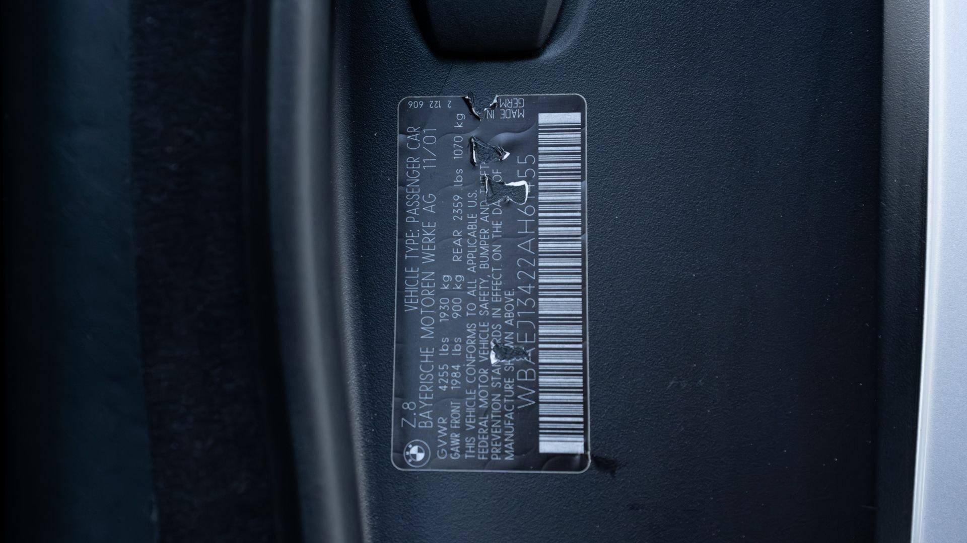 Chassis No. WBAEJ13422AH61455 The BMW Z8 was a clean-sheet, halo roadster that translated Henrik Fisker’s Z07 concept into a production vehicle, while also channeling the elegant spirit of the 1950s 507 with its chrome side vents and delightfully retro cabin details. Built in limited numbers, the Z8 paired well-executed minimalist Bauhaus design with M Power performance, courtesy of the 4.9-liter, 394-horsepower S62 V8 from the contemporary M5 and an analog six-speed manual transmission. Combined with its generous standard equipment including power seats, a Harman Kardon sound system, and ample storage space, the Z8 was the sophisticated touring sports car for the 21st century. This particular Z8 was completed at the factory in Munich, Germany, destined for the U.S. market and finished in popular Titanium Silver Metallic with a matching hardtop over a Black Nappa leather interior. The accompanying CARFAX Vehicle History Report indicates that the car was initially titled in New Jersey, where it remained until changing hands to a new owner in Connecticut in 2005, showing 6,796 miles at the time. The Z8 received routine maintenance from BMW of Ridgefield over the following years before passing to the current Rhode Island-based caretaker in 2012 with approximately 29,500 miles. Since then, the car has been diligently maintained by BMW of Newport and Metric Motors, with major items completed within the last 7,000 miles including four new tires, a clutch service with new pressure plate, disc, and release bearing, refinished wheels, powder-coated brake calipers with new rotors, pads, and hardware, and installation of a desirable front strut brace with updated heavy-duty strut mounts. Now offered with 36,386 miles at the time of cataloging, this Z8 with its potent V8 and engaging six-speed manual transmission is primed for enjoyment on quick, twisty roads with the top down. It is offered with factory delivery accessories including its owner’s manuals, tools, BMW battery charger, first aid kit, tonneau cover, and more.