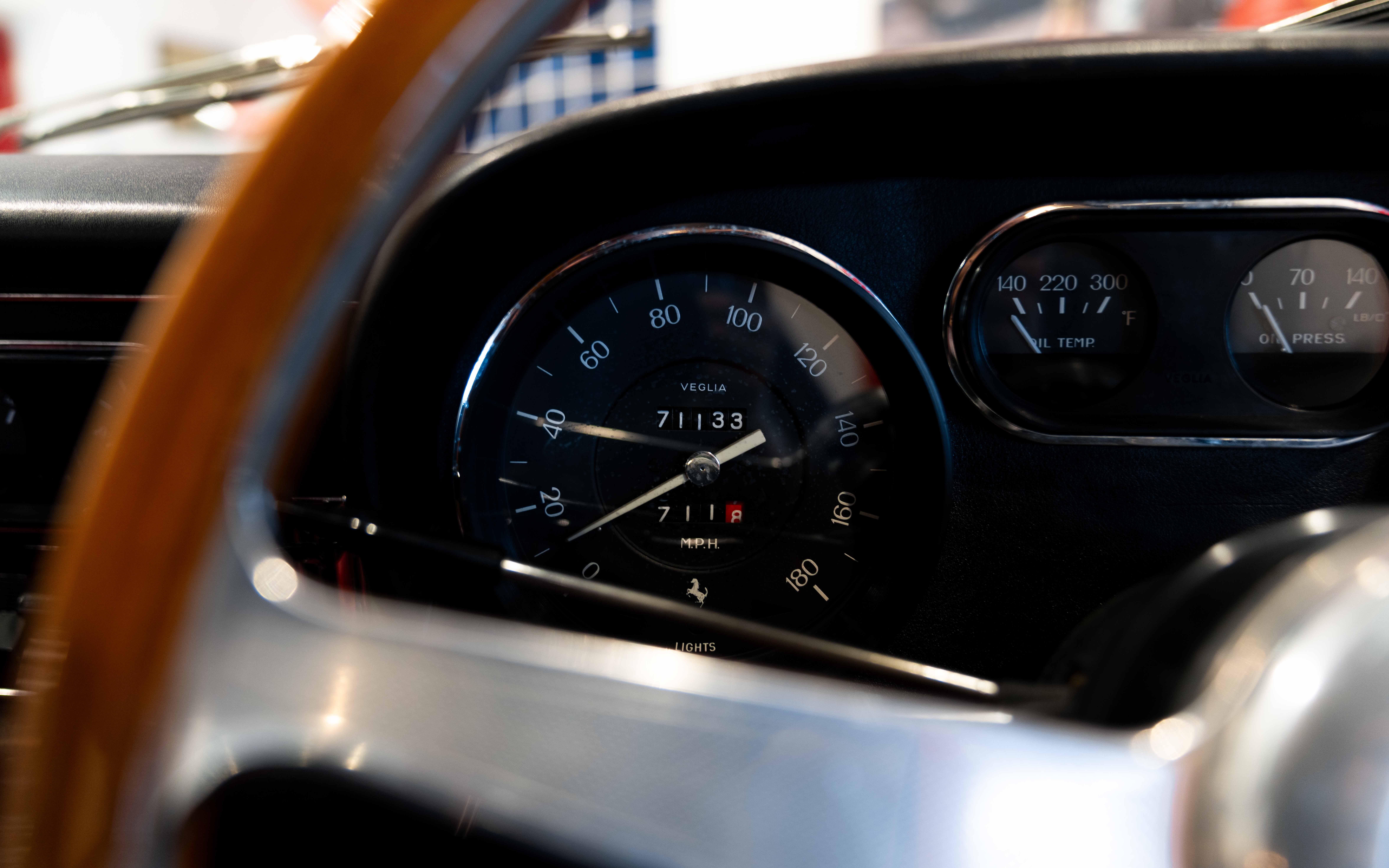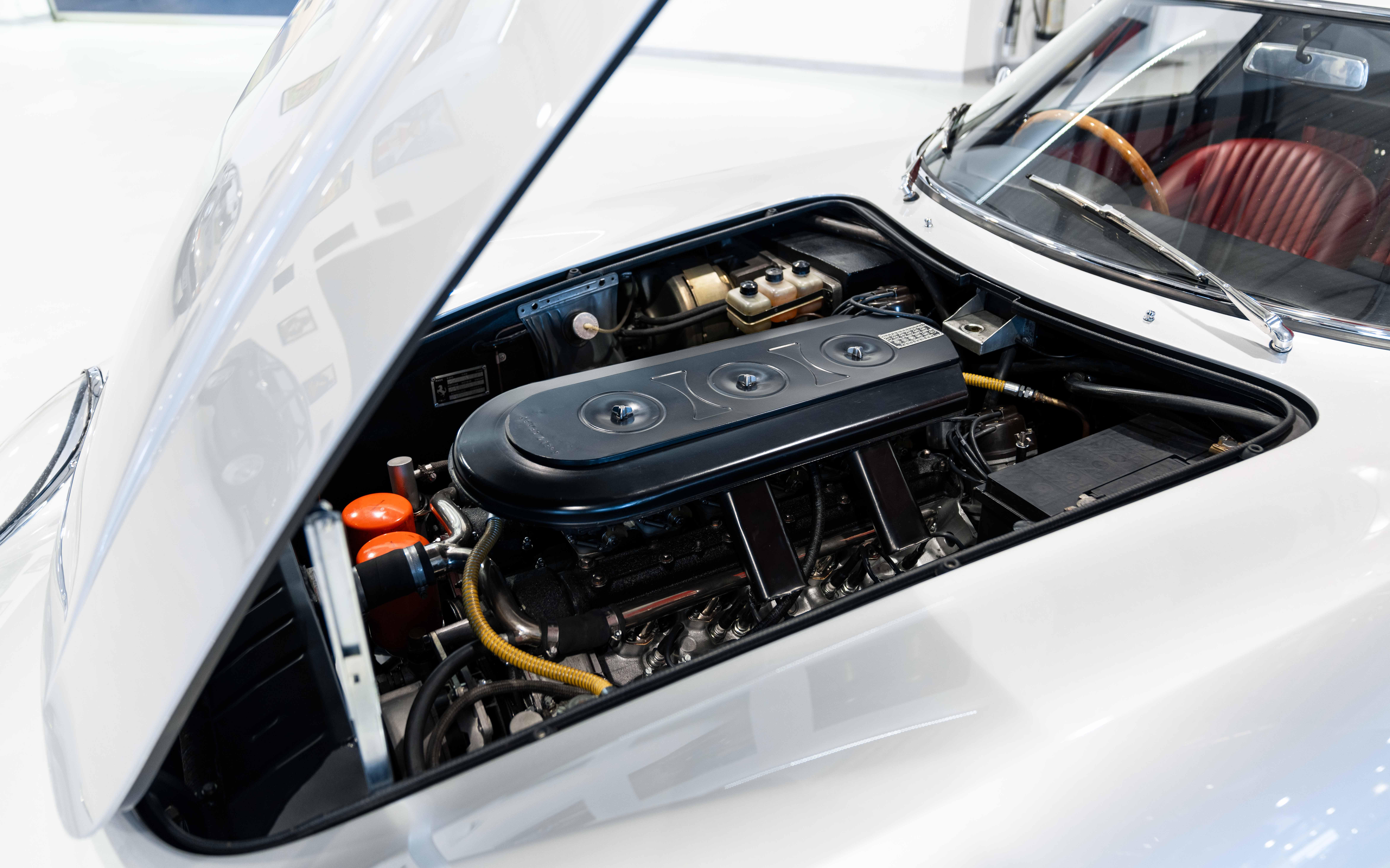 The major difference in the new car was under the hood, where an upgraded version of Gioacchino Colombo’s short-block, 3.3-liter V-12 engine was fitted with four overhead camshafts. The new engine developed 20 more horsepower than its predecessor, giving the nimble 275 chassis an added jolt of performance. The GTB/4 was also standard equipped with a revised arrangement of the driveshaft in a solid torque tube, effectively eliminating vibration issues that often plagued the earlier variants.