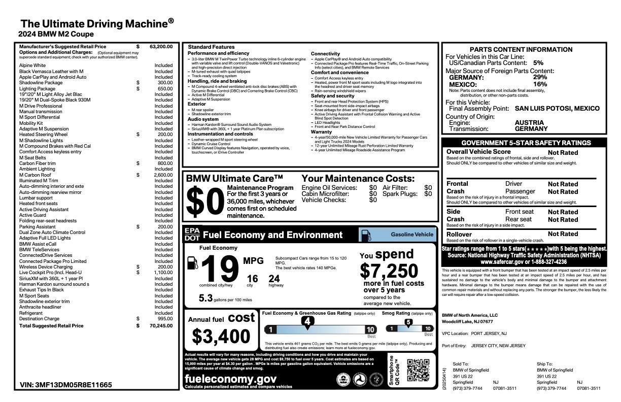2024 BMW M2 G87 Coupe- Alpine White over Black Leather with M Accents- S58 3.0L Twin Turbo Inline 6 Cylinder- 6 Speed Manual Gearbox- Dinan Experience Package, Installed Summer 2025 by German Auto Service LTD- 537 Horsepower and 513 lb-ft of Torque- Dinan Factory Matching 4-Year/50K Mile Warranty- Dinan Experience Package Includes: Dinan+ PCU, Gloss Carbon Fiber Cold Air Intake, High Flow Exhaust and Mid Pipe, Gloss Carbon Fiber Strut Tower Brace, Dinan Pedal Covers ($12k)- Apex VS-5RS Wheels ($4k)- Michelin Pilot Sport Cup 2 Tires ($2,600)- STEK Front End PPF ($2k)- Oil Cooler and Vent Grille Set ($800)- Noteworthy Factory Options: Shadowline and Lighting Packages, Carbon Fiber Roof and Trim, Heated Steering Wheel, Parking Assistant, Wireless Device Charging, Live Cockpit Pro with Heads Up Display- Always Serviced at BMW Dealer or German Auto- Both Keys, All Records, Books, and Window Sticker- Non-Smoker, No Accidents, Clean Title - Needs Nothing- All Factory Components Included with Sale- 13k MilesThis 2024 BMW M2 G87 Coupe represents a tastefully modified example from our ownership, combining factory M performance with thoughtfully selected upgrades that elevate an already exceptional platform. Finished in timeless Alpine White over a Black leather interior with M accents, the M2's aggressive proportions, wide stance, and purposeful design are further enhanced by carbon fiber details and Shadowline trim, giving the car a clean yet unmistakably motorsport-inspired presence.At its core is BMW's renowned S58 3.0-liter twin-turbocharged inline-six, paired with a highly sought-after 6-speed manual gearbox. This setup delivers an engaging, driver-focused experience that modern performance cars rarely offer. Enhanced with the Dinan Experience Package installed in Summer 2025 by German Auto LTD, output is elevated to an impressive 537 horsepower and 513 lb-ft of torque (more HP than the new M2 CS), transforming the M2 into a truly formidable performer while retaining everyday drivability.The Dinan Experience Package is comprehensive and premium, featuring the Dinan+ PCU, gloss carbon fiber cold air intake, high-flow exhaust with mid pipe, carbon fiber strut tower brace, and Dinan pedal covers, over $12,000 in upgrades. Importantly, these enhancements are backed by a Dinan factory-matching 4-year/50,000-mile warranty, offering peace of mind alongside exhilarating performance. An upgraded oil cooler and vent grille set further support consistent performance under spirited driving conditions.Handling and grip are equally well addressed with lightweight Apex VS-5RS wheels wrapped in Michelin Pilot Sport Cup 2 tires, a combination that dramatically sharpens turn-in and maximizes traction. A STEK front-end paint protection film has been professionally installed to preserve the Alpine White finish, ensuring the car remains as striking as it is capable.Inside, the cabin blends modern technology with motorsport flair. Noteworthy factory options include the carbon fiber roof and interior trim, Shadowline and Lighting Packages, heated steering wheel, parking assistant, wireless device charging, and Live Cockpit Professional with heads-up display. Every detail reinforces the M2's dual nature as both a serious performance machine and a refined daily driver.With just 13,000 miles, this M2 has been meticulously maintained, always serviced at a BMW dealer or respected German automotive specialist. It is a non-smoker vehicle with no accidents and a clean title, complete with both keys, all service records, books, window sticker, and all original factory components included in the sale. Turn-key and needing nothing, this G87 M2 stands as a standout example for the enthusiast seeking a modern, manual-equipped BMW M car done right.