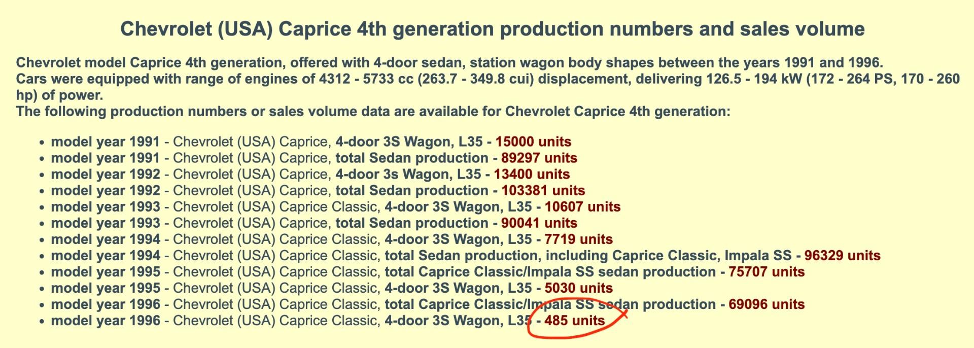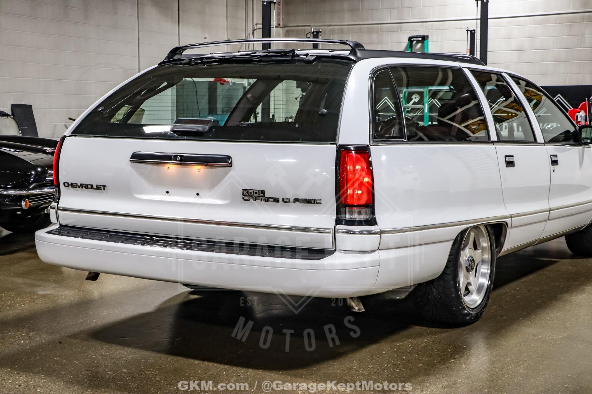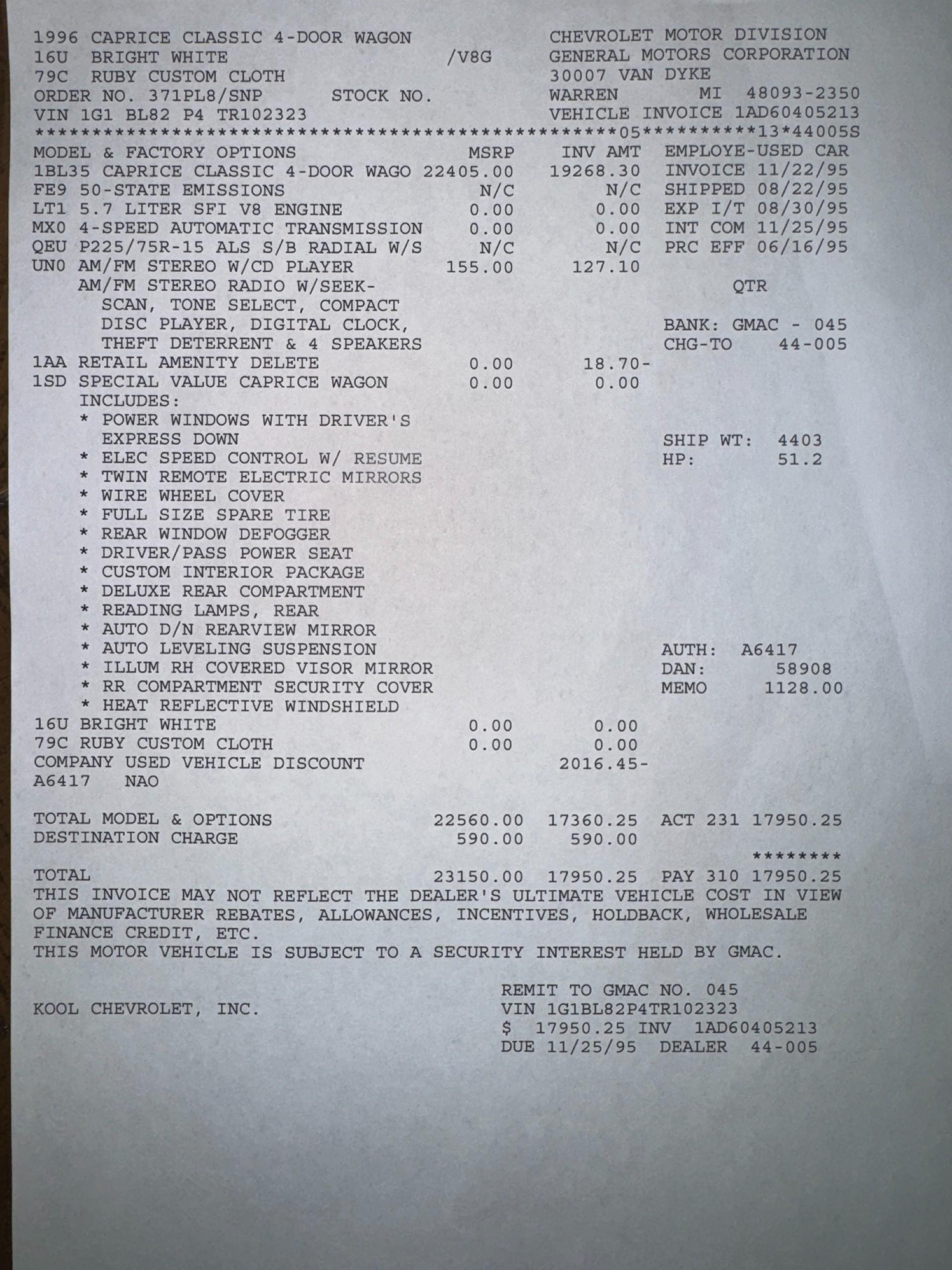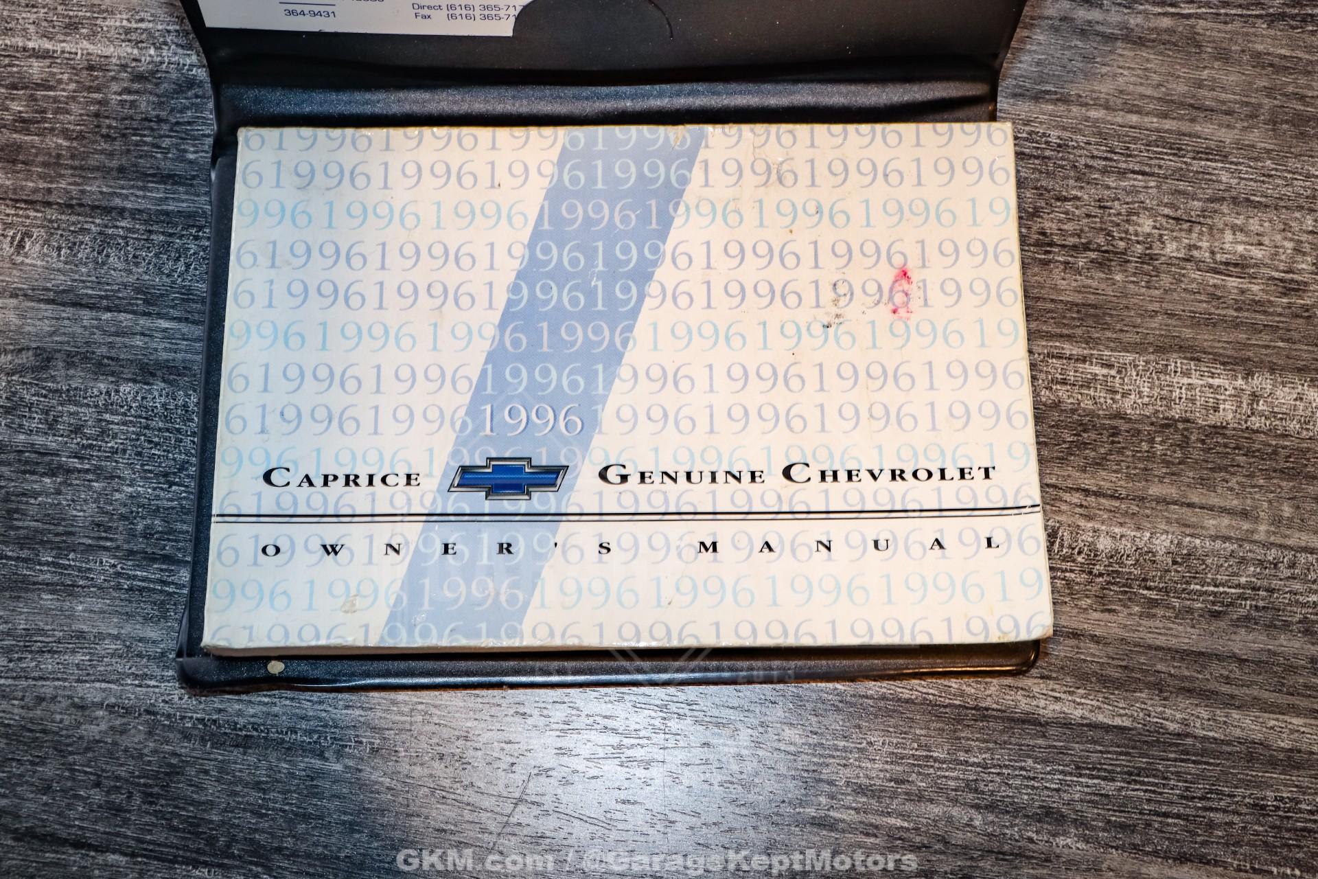 1996 Chevrolet Caprice Classic4-Door Station Wagon- Final Year of Chevrolet Caprice Production- One of Only 485 Caprice Wagon's Built in 1996 (8,962 Roadmasters Made)- Purchased New at Kool Chevrolet of Grand Rapids, MI- Bright White (16U) over Ruby Custom Cloth (79C)- LT1 5.7L SFI V8- 4 Speed Automatic Transmission- Rear Facing 3rd Row Seat (8 Passenger Capacity)- Dual Swinging Tailgate - Roof Rack and Dual Exhaust- Power Windows and Power Locks- Driver and Passenger Power Seats- Upgraded Impala SS Wheels with New Hankook Tires (original wire wheels accompany sale)- Fall 2025 Service at Kool Chevrolet: Front and Rear Shocks, Rear Pinion Seal, Oil, Transmission Fluid, Filters, Rear Brake Lines- Books, Manuals, and Copy of Original Dealer Invoice- 68k Original Miles- Clean CarFax and Title- Road Trip Ready! VIN Decoder:1 - Country Built: U.S.AG - Manufacturer: General Motors1 - Make: ChevroletBL - Carline/Series: Caprice Classic8 - Body Style: Four Door Station Wagon2 - Restraint Code: Active (Manual) Belts with Driver and Passenger Inflatable Restraint SystemP - Engine Type: LT1 5.7L V84 - Check DigitT - Model Year: 1996R - Assembly Plant: Arlington, Texas102323 - Production SequenceThis 1996 Chevrolet Caprice Classic Station Wagon represents the final chapter of an American automotive icon. As the last year of Caprice production, this full-size wagon stands as a rare and increasingly collectible example of Chevrolet's body-on-frame, V8-powered family hauler. Even more impressive, only 485 Caprice wagons were built for the 1996 model year, making it far rarer than its Buick Roadmaster sibling and a true standout among 1990s domestic wagons.Purchased new at Kool Chevrolet in Grand Rapids, Michigan, this Caprice has remained a well-documented and carefully preserved example throughout its life. Finished in Bright White (16U) over Ruby Custom Cloth (79C), the color combination is period-correct and quintessentially Chevrolet, offering a clean and classic appearance that highlights the wagon's long, elegant profile. With just 68,000 original miles, it presents as an honest, unmolested survivor from a bygone era.Power comes from the legendary LT1 5.7-liter SFI V8, paired with a smooth-shifting 4-speed automatic transmission. Known for its durability and torque-rich performance, the LT1 provides effortless highway cruising and confident passing power, making this Caprice as enjoyable to drive today as it was when new. Rear-wheel drive and traditional full-size proportions deliver the kind of ride quality and road presence modern vehicles simply no longer offer.One of the defining features of this Caprice wagon is its exceptional utility. The rear-facing third-row seat offers classic wagon charm and genuine seating for the whole family (8 passengers), while the dual-swinging tailgate provides unmatched versatility for cargo or passenger access. A factory roof rack and dual exhaust further enhance both function and appearance, underscoring this wagon's road-trip-ready character.Inside, the Caprice is generously equipped with power windows, power locks, and both driver and passenger power seats, ensuring comfort and convenience for long journeys. The interior remains inviting and original, reflecting the care this vehicle has received over the years. Books, manuals, and a copy of the original dealer invoice accompany the sale, adding significant provenance and appeal for collectors and enthusiasts alike.Tasteful upgrades include Impala SS wheels wrapped in new Hankook tires, giving the wagon a subtle performance-inspired stance while retaining its classic look. The original wire wheels are included with the sale for those who value factory originality. A comprehensive service performed at Kool Chevrolet in Fall 2025, covering shocks, rear pinion seal, fluids, filters, and rear brake lines, ensures this Caprice is mechanically sorted and ready for immediate enjoyment. With a clean CarFax and title, this exceptionally rare 1996 Caprice Classic Wagon is a turn-key, nostalgia-rich cruiser that's truly ready for the open road.