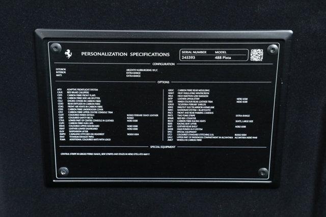 Ferrari 488 Pista- FERRARI CERTIFIED PRE-OWNED - FERRARI POWER WARRANTY TO 9/23/27 -- Argento Nurburgring over Nero - Two Owners - Low Miles - Pristine Condition - Many Fine Options - Expertly Maintained by our Factory Trained Technicians - Ferrari Power Warranty to 9/23/27 - Complimentary Ferrari Genuine Maintenance Service to 5/31/26 -Factory Options:- Suspension Lifter- Two-Tone Stripe in Grigio Ferro and Nero Stellato- Carbon Fiber Wheels- Carbon Fiber Front Air Vents- Carbon Fiber Front Flaps- Carbon Fiber Side Air Splitters- Carbon Fiber Engine Covers- Carbon Fiber Rear Diffuser- Carbon Fiber Rear Moulding- Carbon Fiber Underdoor Covers- Carbon Fiber Upper Center Console- Carbon Fiber Wheel Caps- Carbon Fiber Racing Seats- Red Brake Calipers- Scuderia Ferrari Shields- Leather Upholstery in Nero- Leather Lower Center Console in Nero- Leather Lower Dashboard in Nero- Leather Rear Trim in Nero- Leather Rear Shelf in Nero- Alcantara Upper Part in Nero- Leather Colored Inner Details in Rosso Ferrari- Cavallino Stitched to Headrests in Rosso- Stitching in Rosso- Colored Seatbelts in Rosso- Racing Seat Lifter- High Power HiFi Sound System- Navigation System with Bluetooth- Adaptive Frontlight System (AFS)- Inner and Outer Electrochromic Mirrors with HomeLink- Front and Rear Parking Cameras- Red Rev Counter- Titanium Exhaust Pipes- Heat Insulating Windscreen- Embroidered Mats with Logo- High Emotion Low Emission (HELE) SystemIf you are in the market for a Ferrari 488 Pista, please call or email us today.This Ferrari has passed a multi-point inspection performed by our factory trained technicians, and has been enrolled in the Ferrari Approved Certified Pre-Owned Program. The Certified program makes available up to two years of additional Ferrari Approved Warranty coverage. Please see dealer for more details.