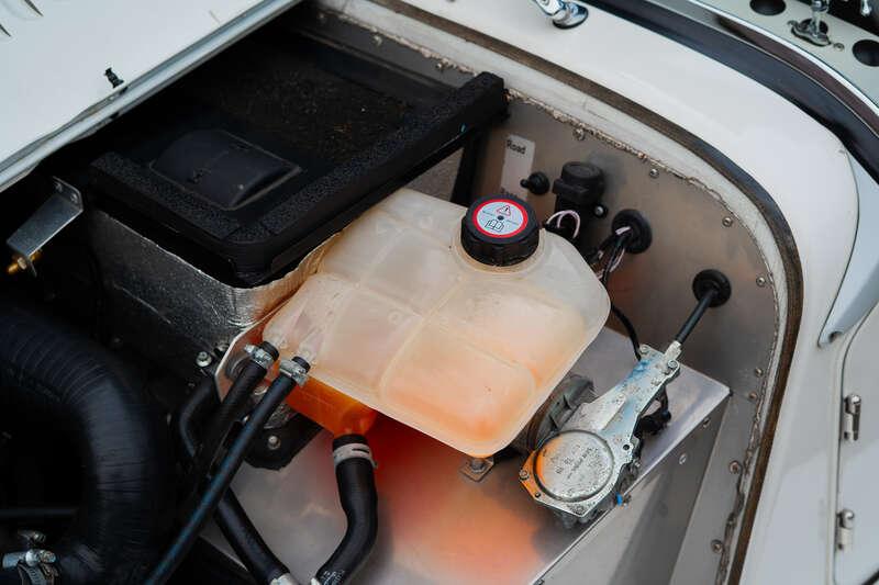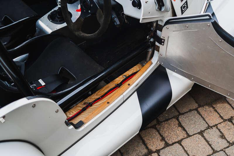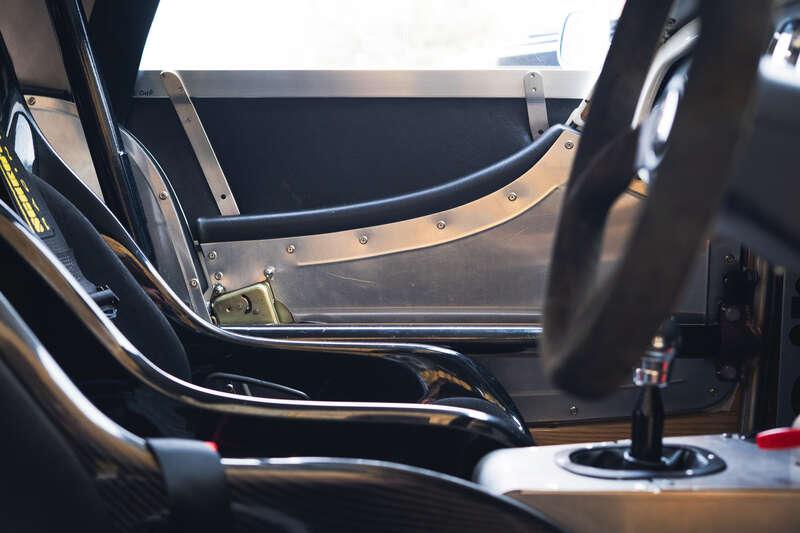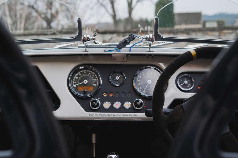 - Lightweight interior style with no interior trim or carpet, interior surfaces finished in aluminium, body-coloured painted dashboard, suede 14" racing steering wheel, integral seat belt bar