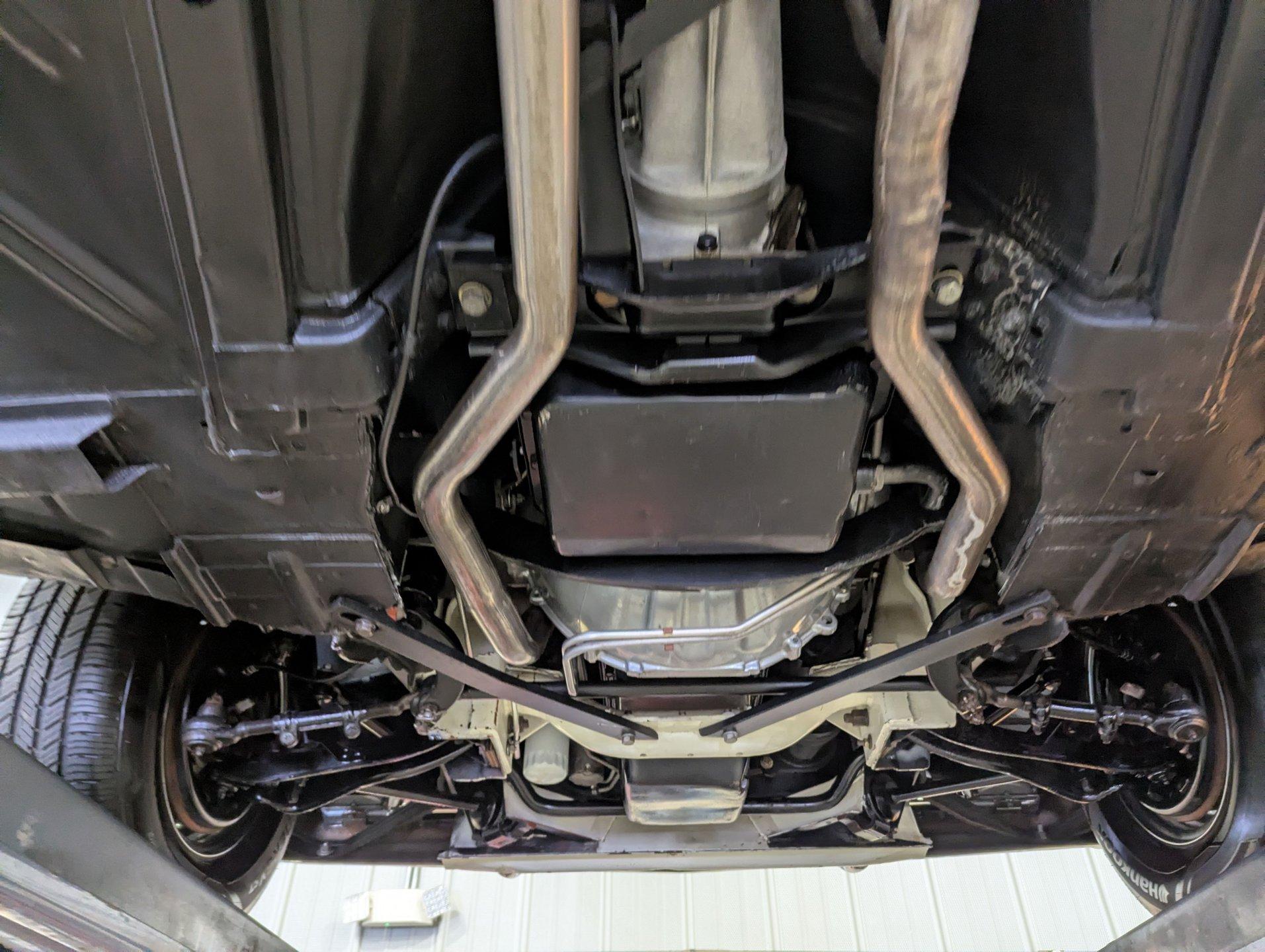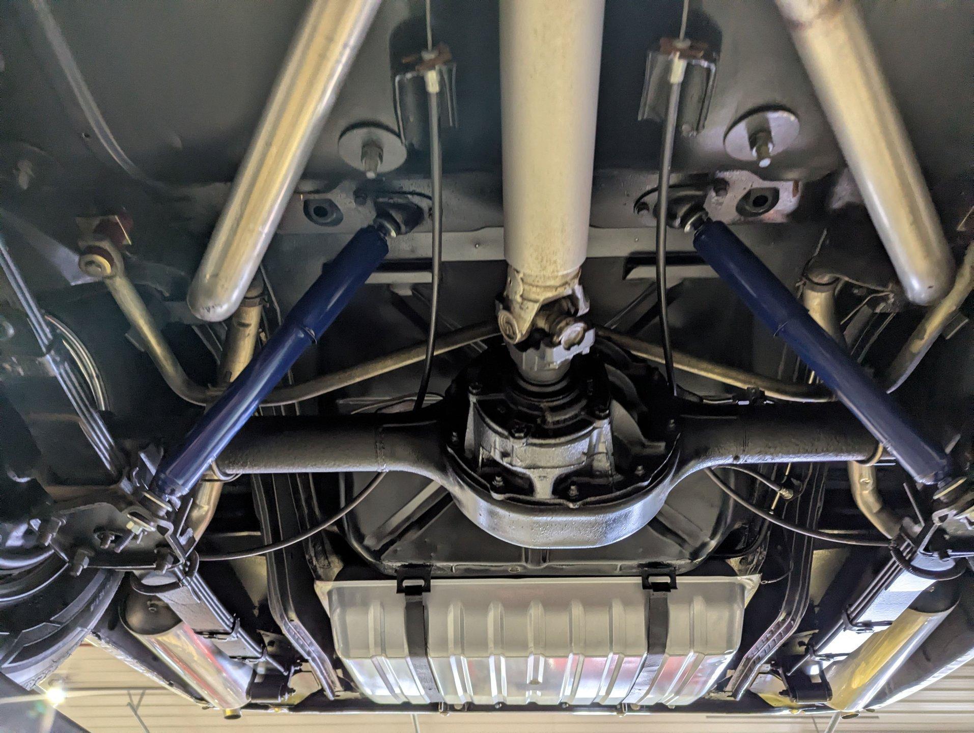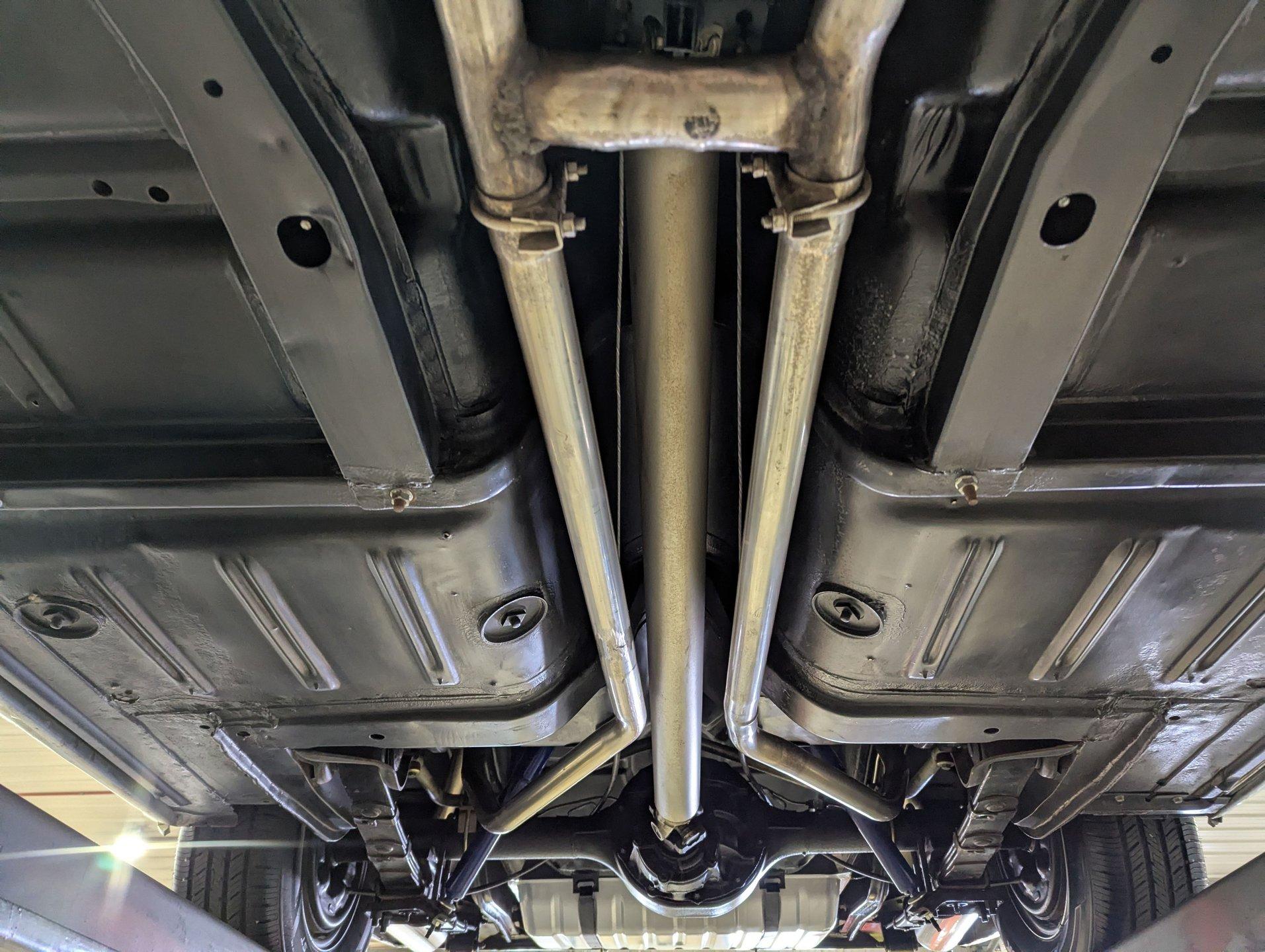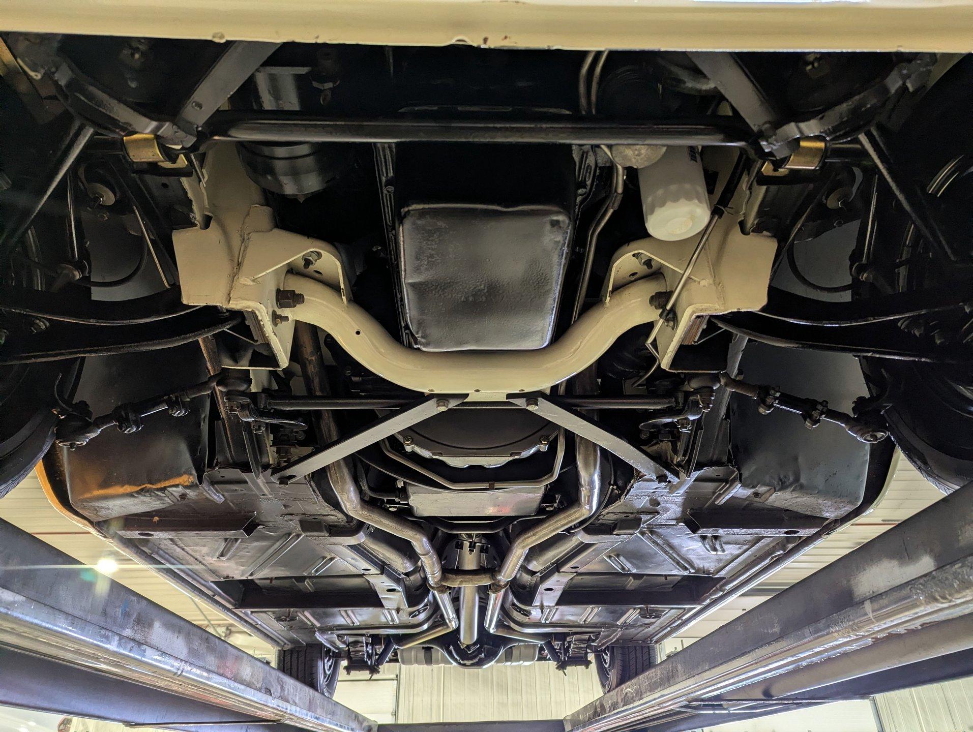 UNDERSIDE: The restoration wasn't just on top, they did a nice job underneath too! The front end steering looks rebuilt and detailed. It has 4 new shocks and in back the leaf spring bushings were replaced. New swaybars were installed front and back. The brakes were gone through, new brake cylinders were just installed. It has a new fuel tank and filler neck. The dual exhaust looks fresh, has a crossover pipe and stainless mufflers. Looking up at the motor it looks clean, the Cruise-O-Matic trans looks fresh. The floors are clean metal nicely painted semi gloss black.