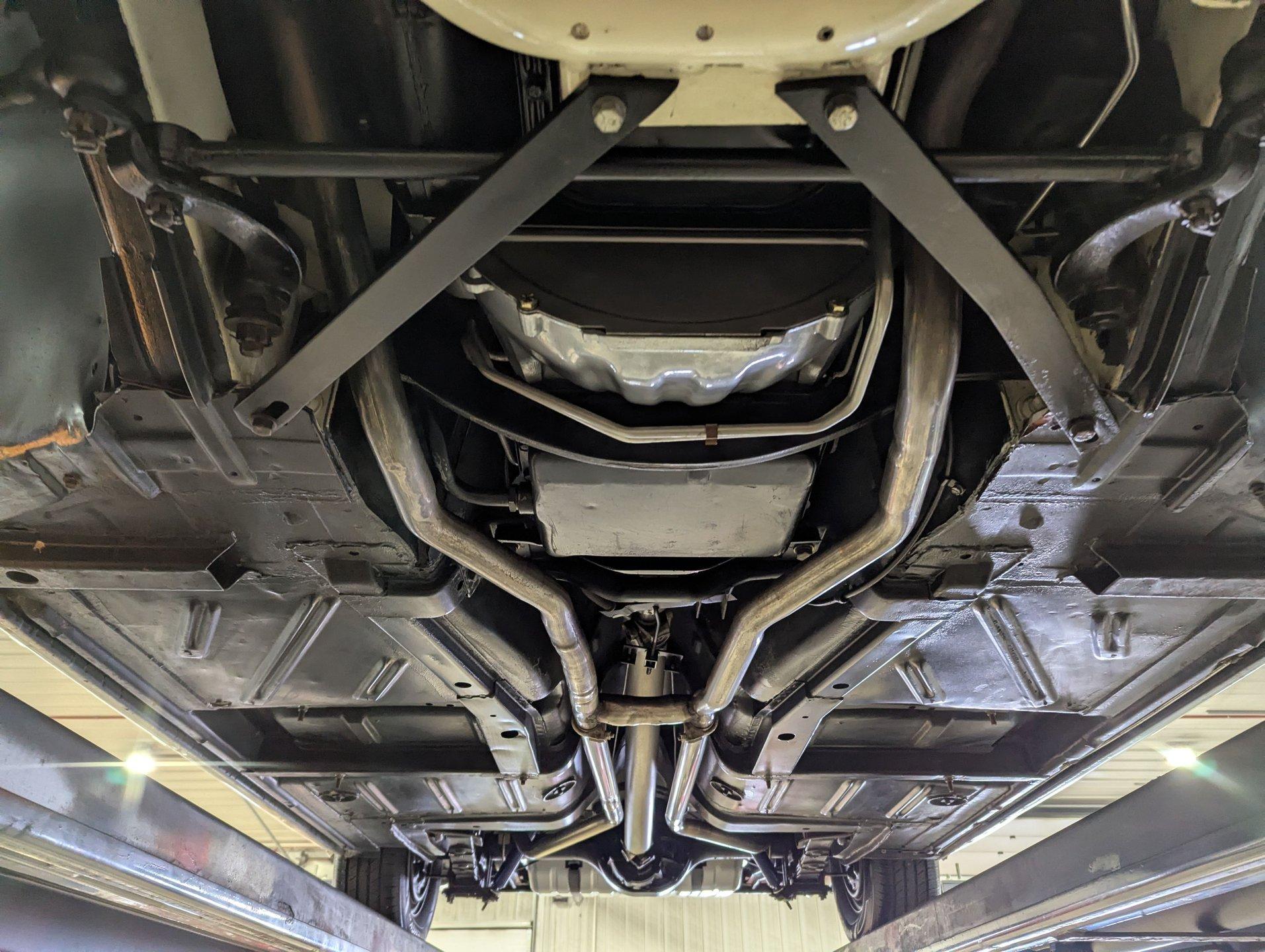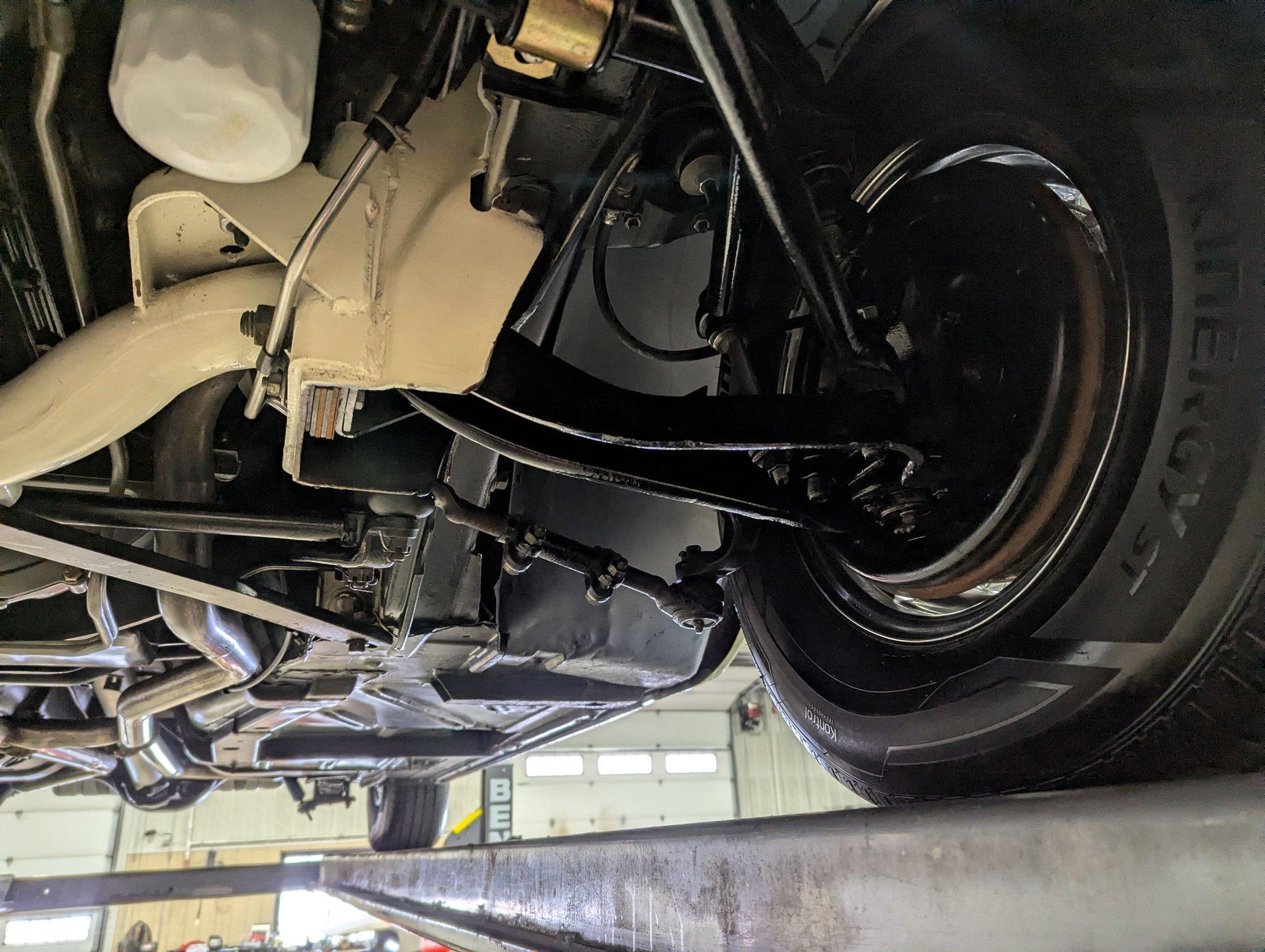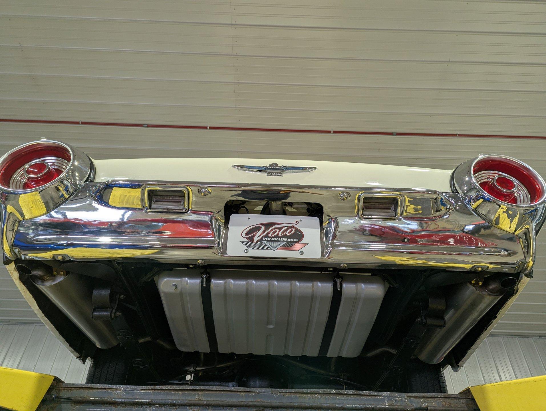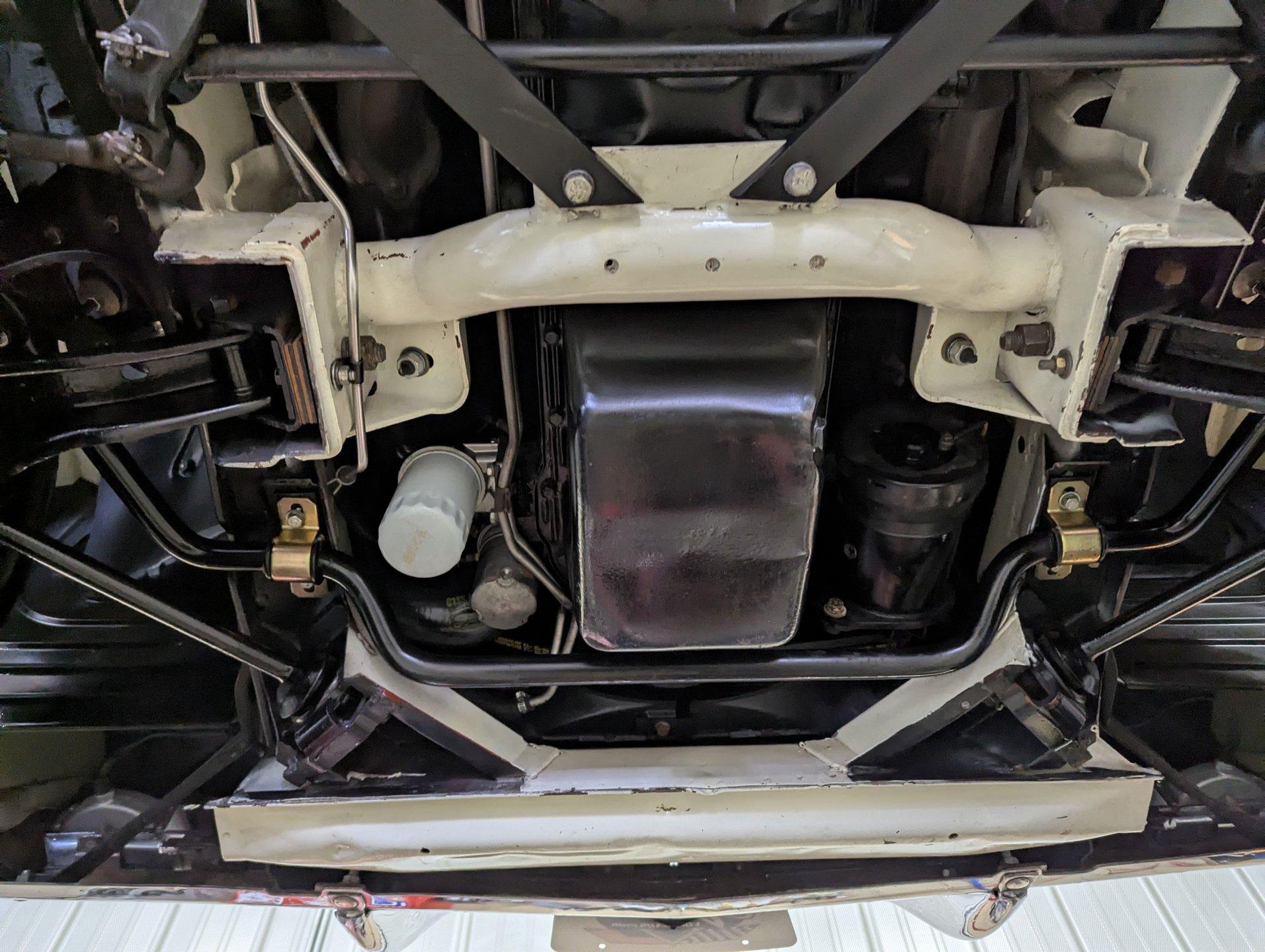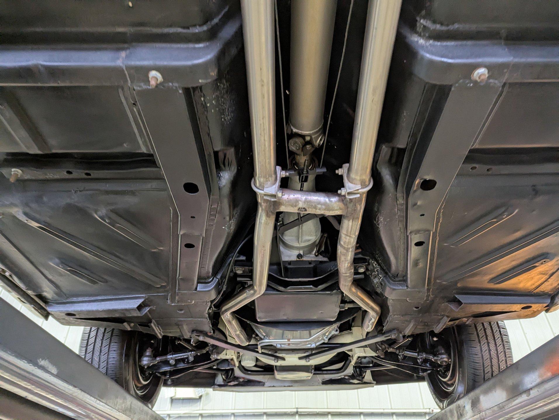 UNDERSIDE: The restoration wasn't just on top, they did a nice job underneath too! The front end steering looks rebuilt and detailed. It has 4 new shocks and in back the leaf spring bushings were replaced. New swaybars were installed front and back. The brakes were gone through, new brake cylinders were just installed. It has a new fuel tank and filler neck. The dual exhaust looks fresh, has a crossover pipe and stainless mufflers. Looking up at the motor it looks clean, the Cruise-O-Matic trans looks fresh. The floors are clean metal nicely painted semi gloss black.