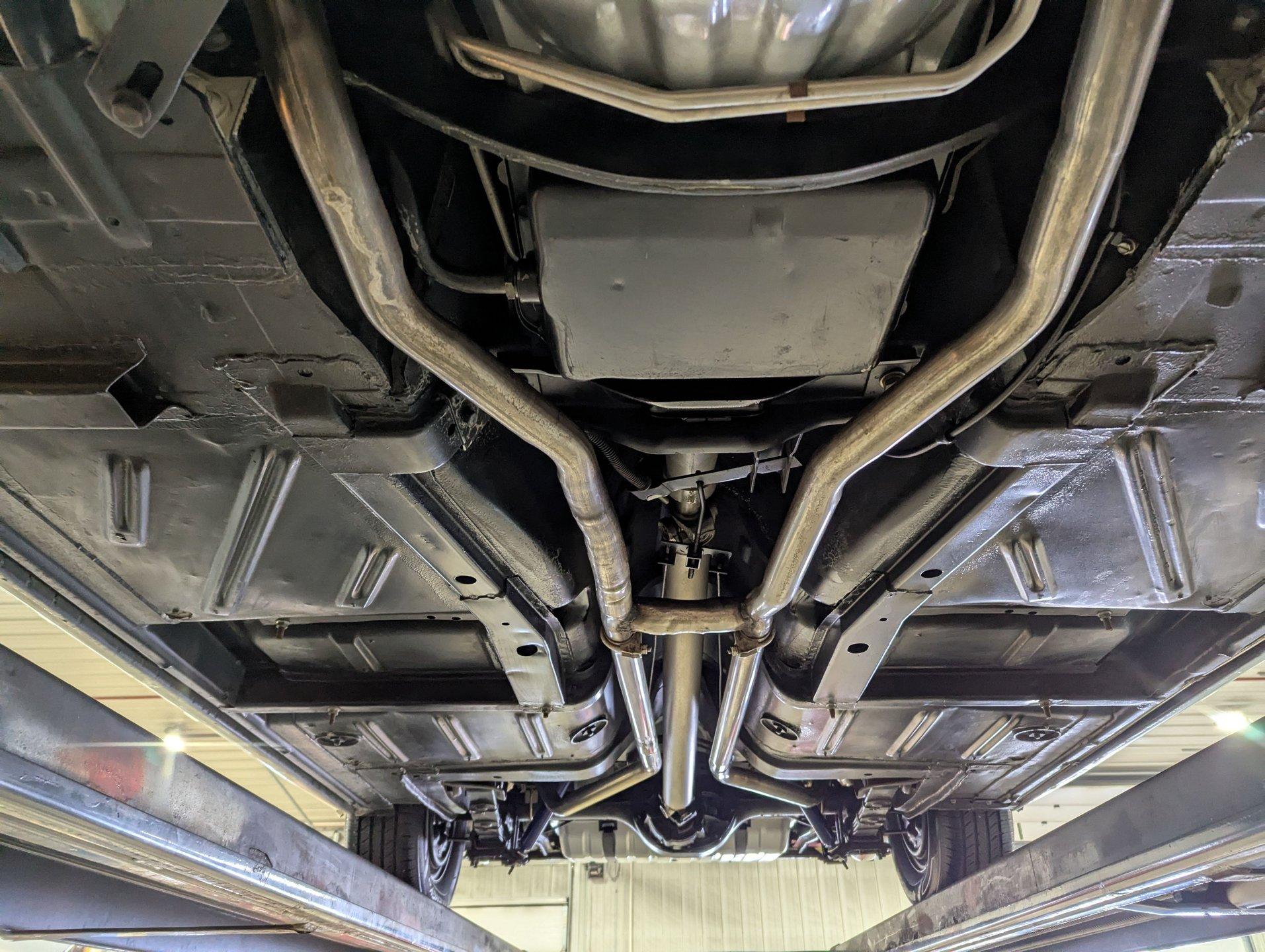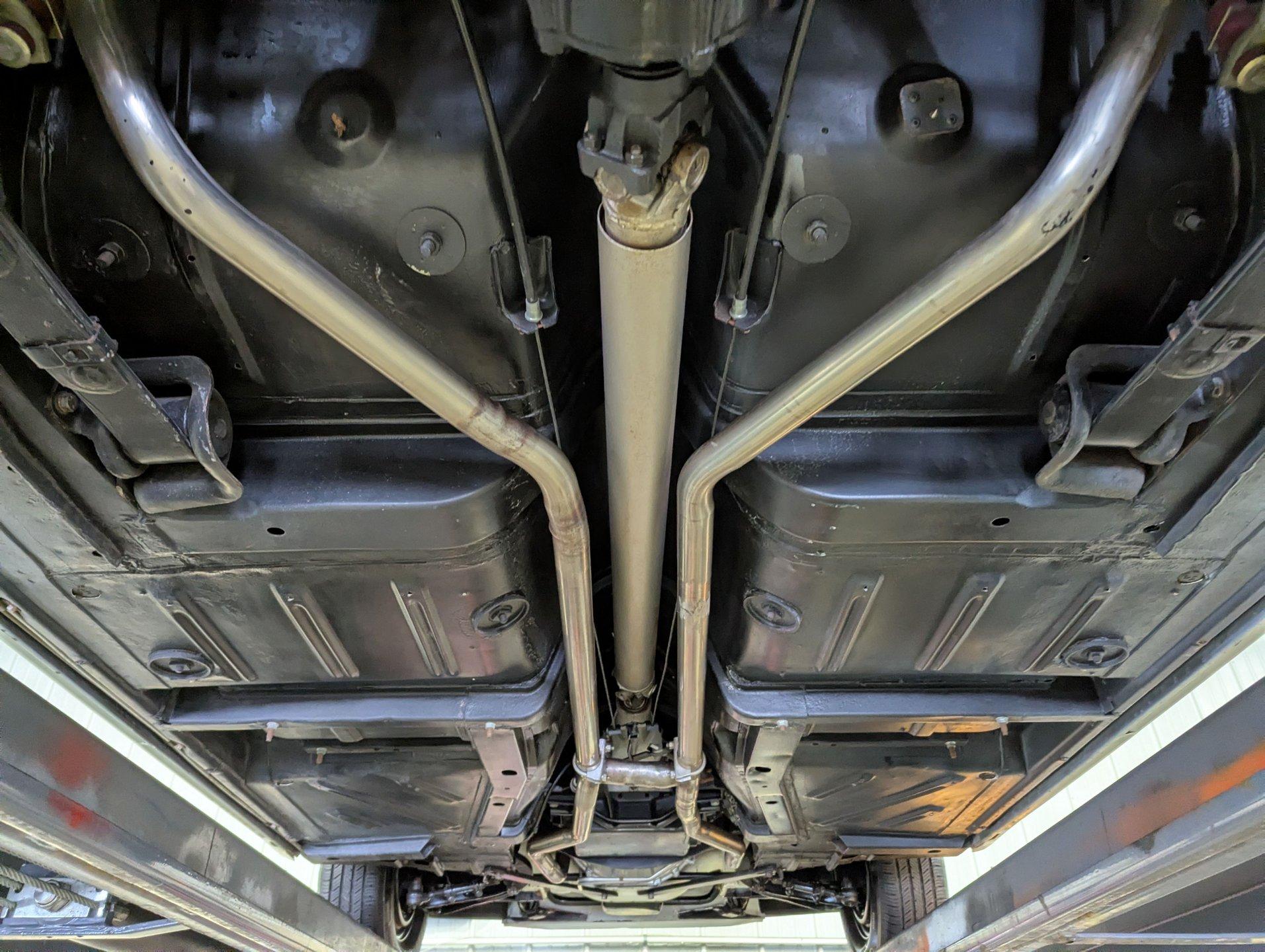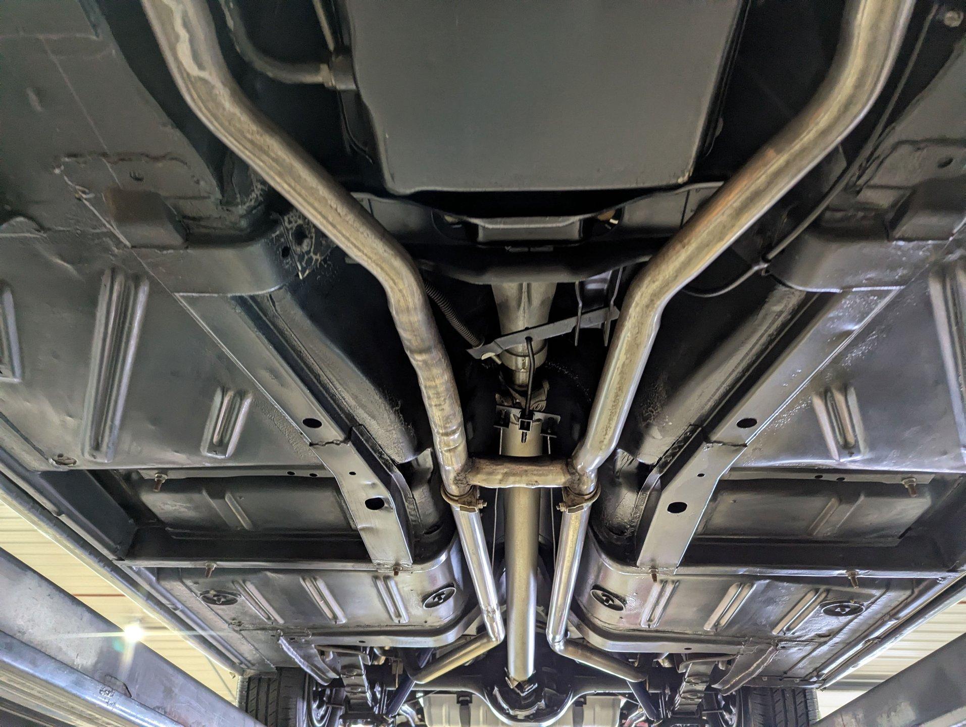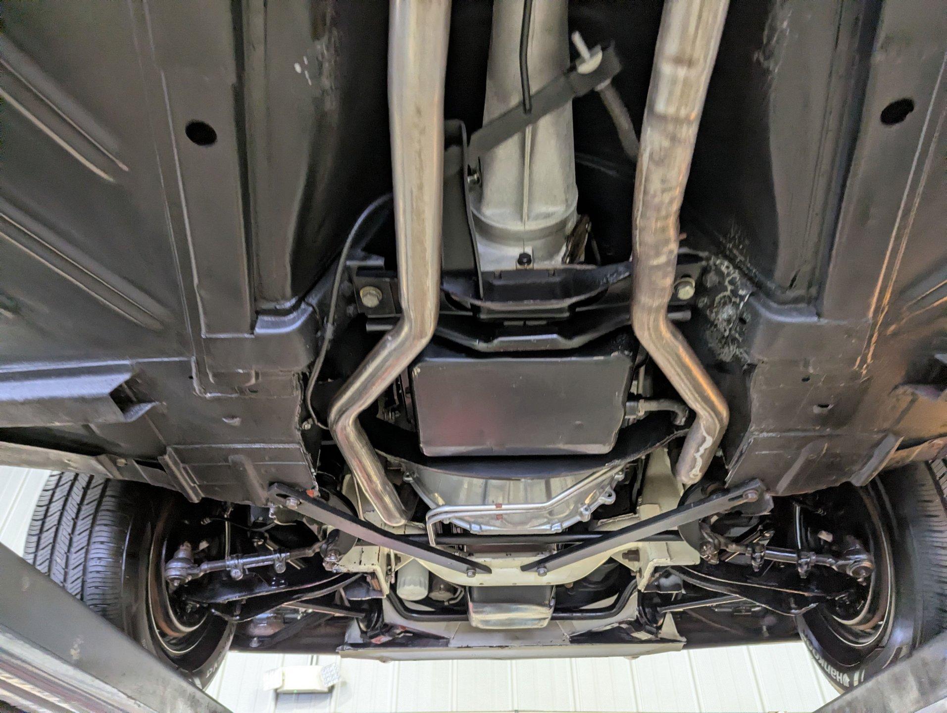 UNDERSIDE: The restoration wasn't just on top, they did a nice job underneath too! The front end steering looks rebuilt and detailed. It has 4 new shocks and in back the leaf spring bushings were replaced. New swaybars were installed front and back. The brakes were gone through, new brake cylinders were just installed. It has a new fuel tank and filler neck. The dual exhaust looks fresh, has a crossover pipe and stainless mufflers. Looking up at the motor it looks clean, the Cruise-O-Matic trans looks fresh. The floors are clean metal nicely painted semi gloss black.