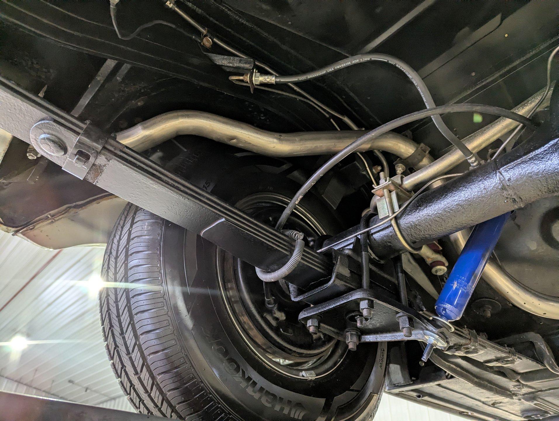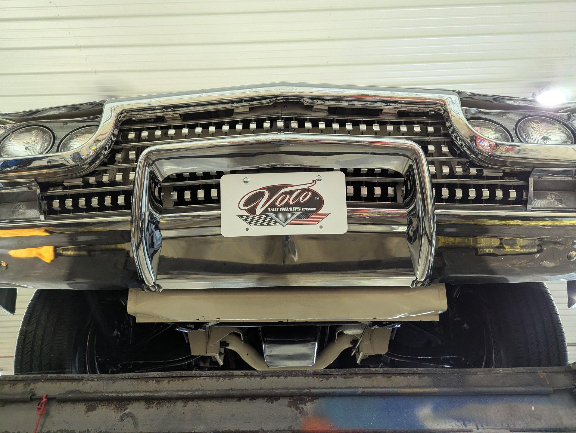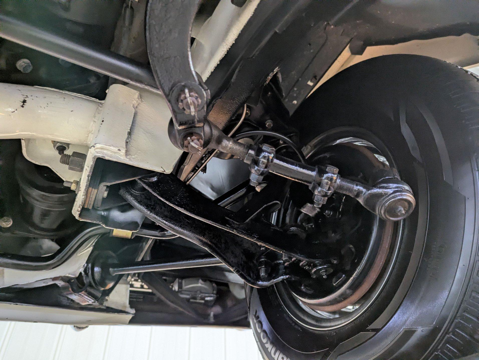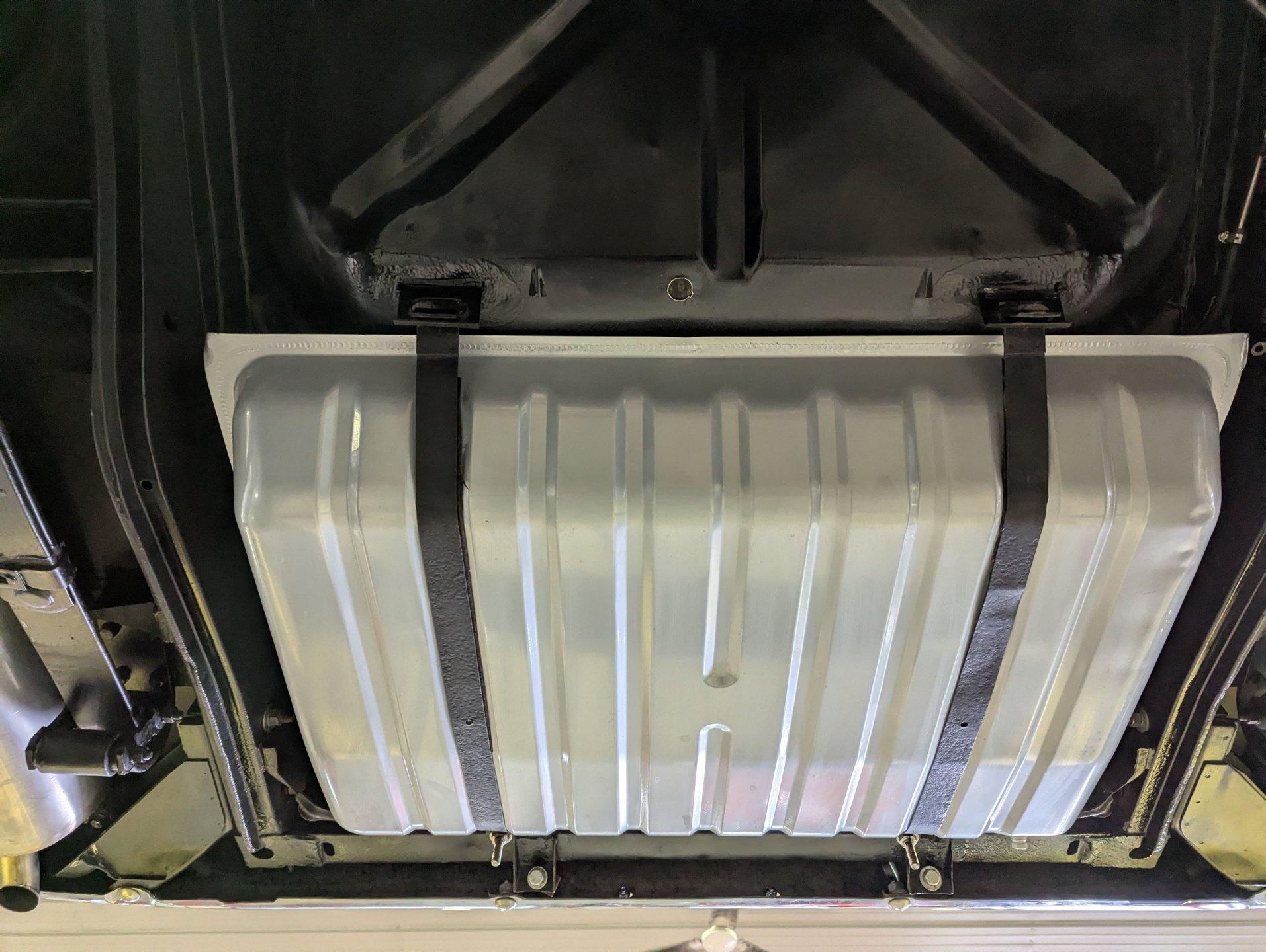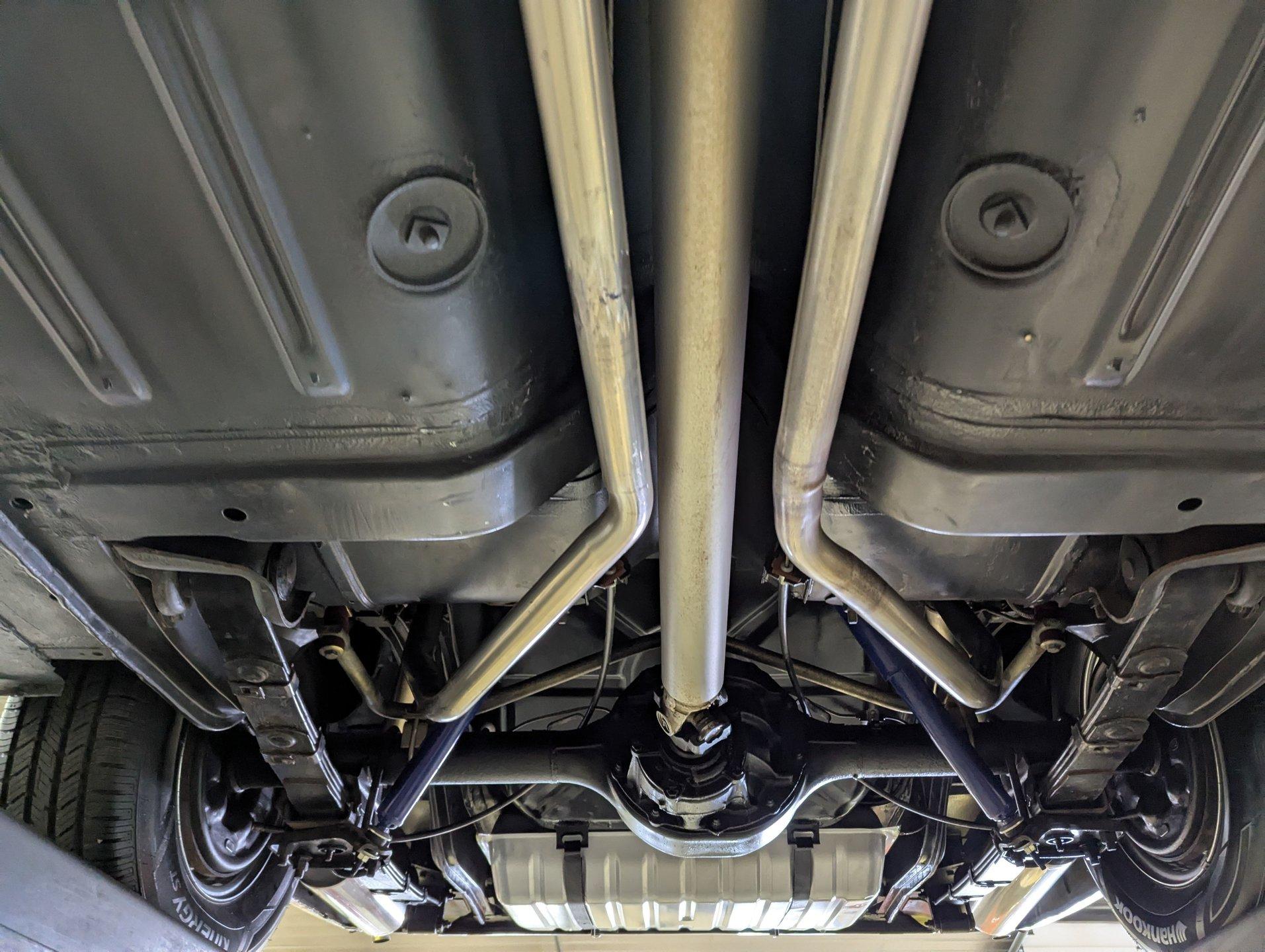 UNDERSIDE: The restoration wasn't just on top, they did a nice job underneath too! The front end steering looks rebuilt and detailed. It has 4 new shocks and in back the leaf spring bushings were replaced. New swaybars were installed front and back. The brakes were gone through, new brake cylinders were just installed. It has a new fuel tank and filler neck. The dual exhaust looks fresh, has a crossover pipe and stainless mufflers. Looking up at the motor it looks clean, the Cruise-O-Matic trans looks fresh. The floors are clean metal nicely painted semi gloss black.