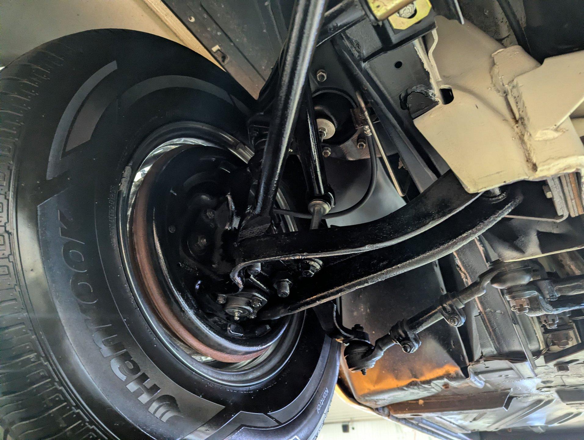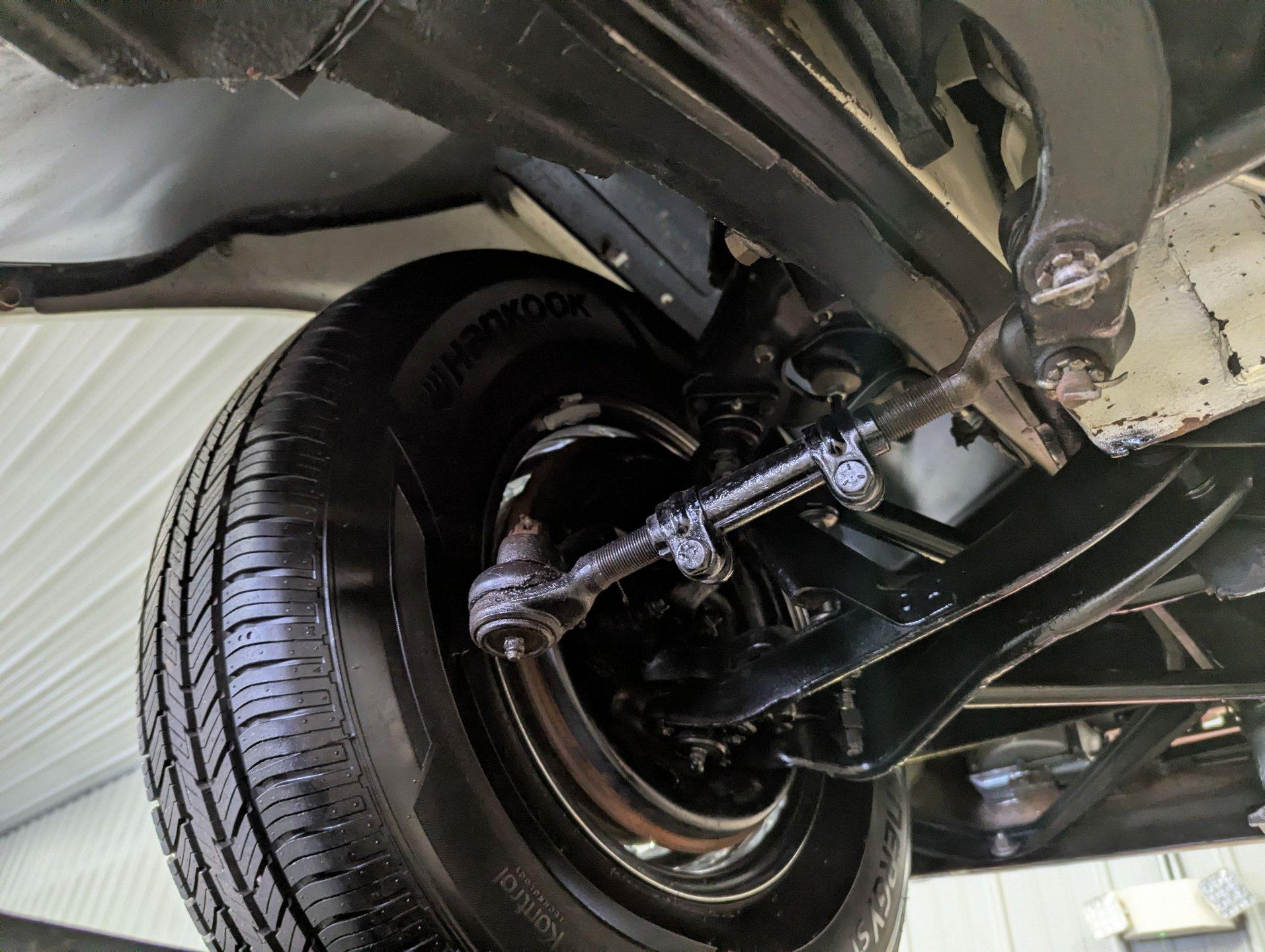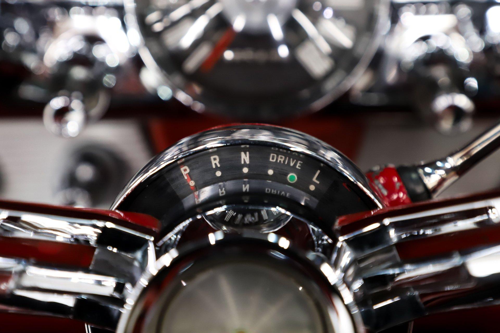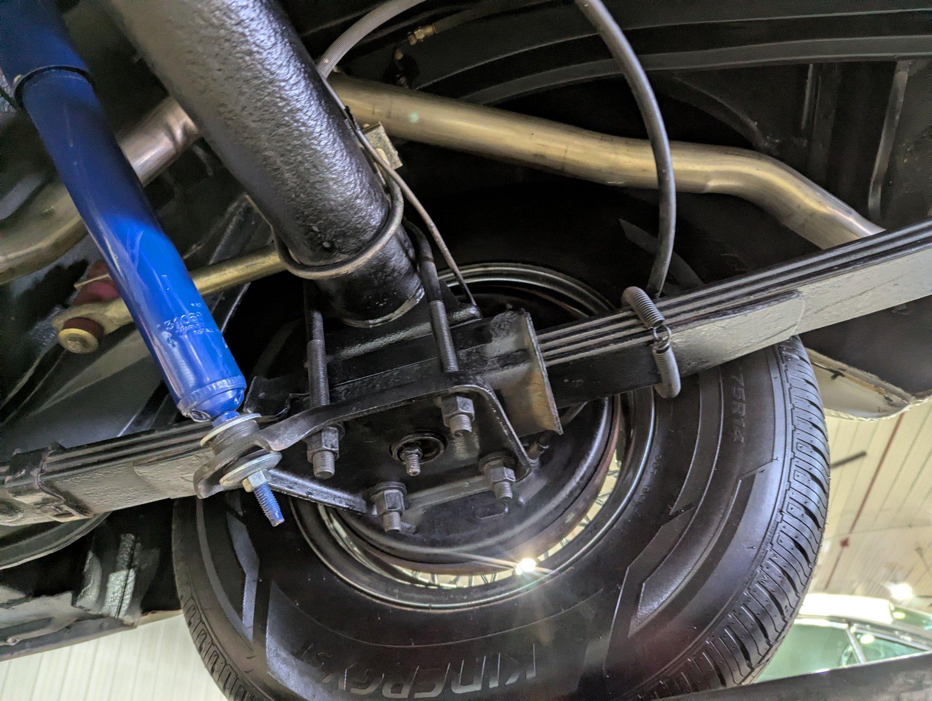 UNDERSIDE: The restoration wasn't just on top, they did a nice job underneath too! The front end steering looks rebuilt and detailed. It has 4 new shocks and in back the leaf spring bushings were replaced. New swaybars were installed front and back. The brakes were gone through, new brake cylinders were just installed. It has a new fuel tank and filler neck. The dual exhaust looks fresh, has a crossover pipe and stainless mufflers. Looking up at the motor it looks clean, the Cruise-O-Matic trans looks fresh. The floors are clean metal nicely painted semi gloss black.