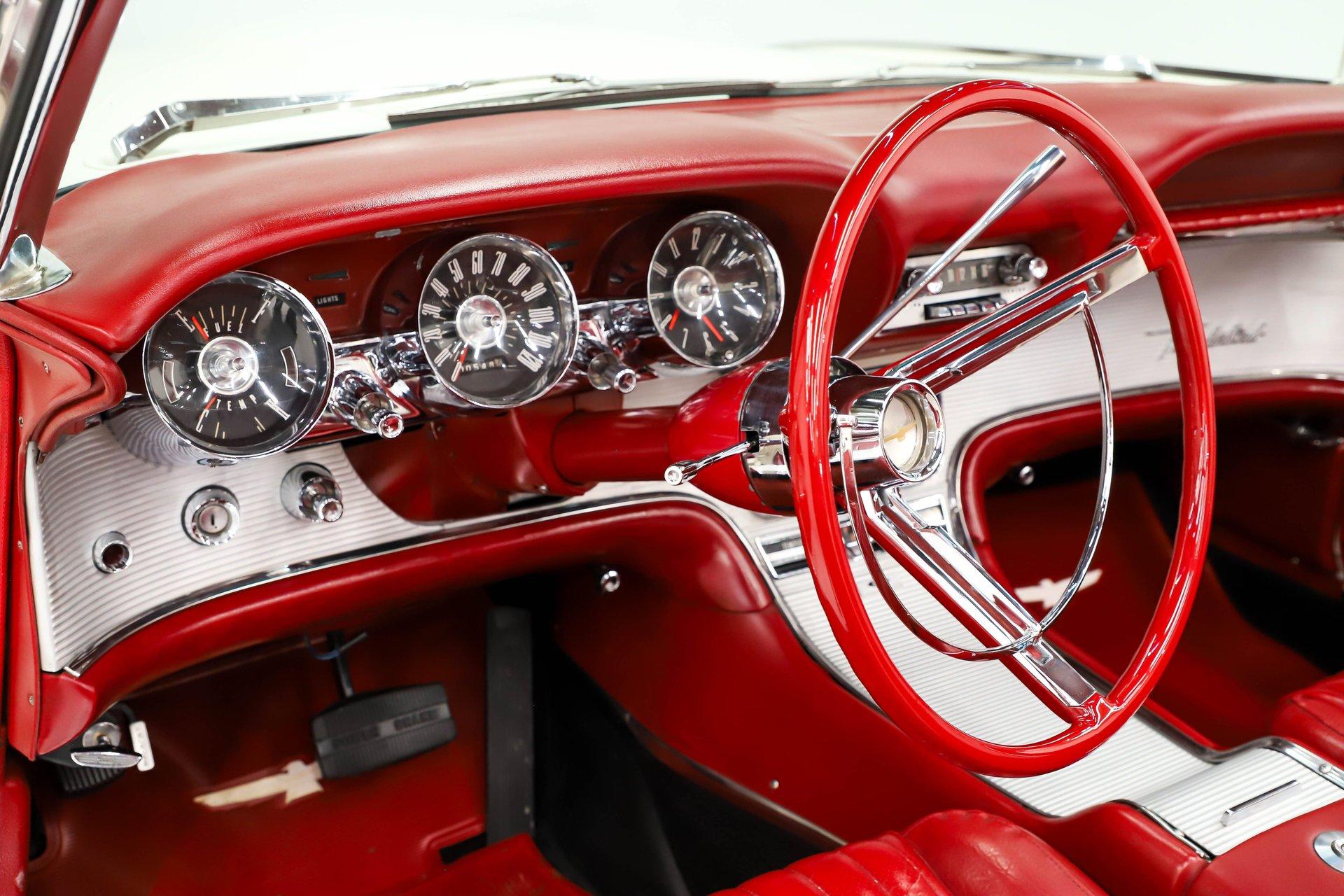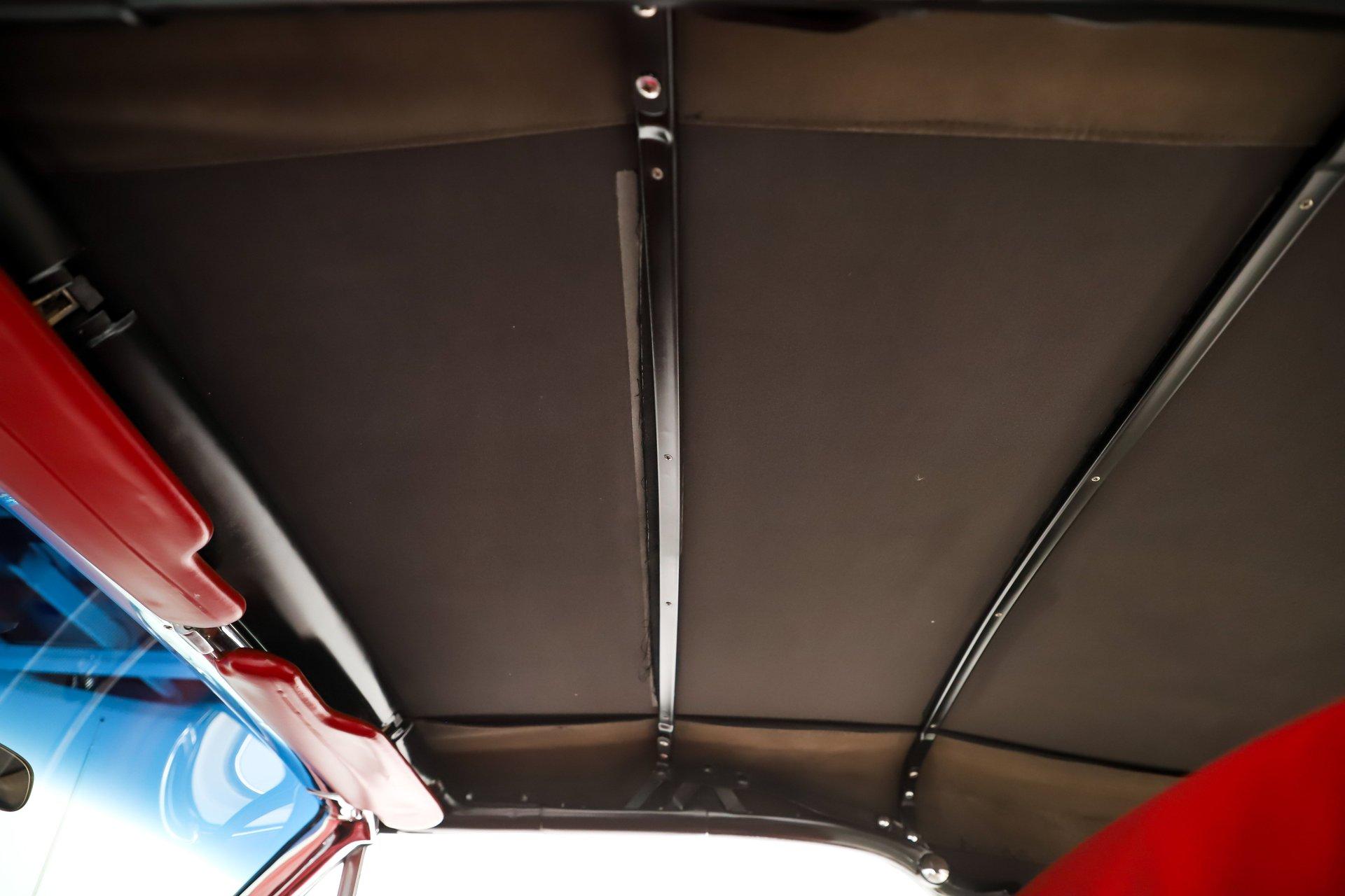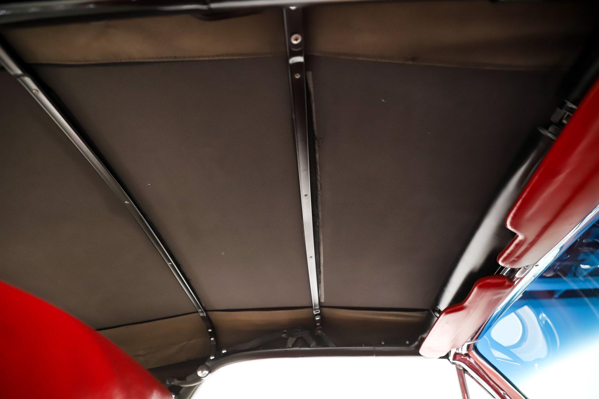 INTERIOR: The red interior is a great contrast to the white paint. The dash pad and the door panels are in remarkably good shape, so is all the chrome and trim. The gauge area is really cool and so is the center console. Another neat feature is the swing away steering wheel. Down on the floor it has nice carpet with reproduction mats and seat belts. Under the tonneau cover (easily removable) is a full back seat. The power windows are very convenient, especially when the tonneau is on. It's a stylish, sporty yet roomy interior!
