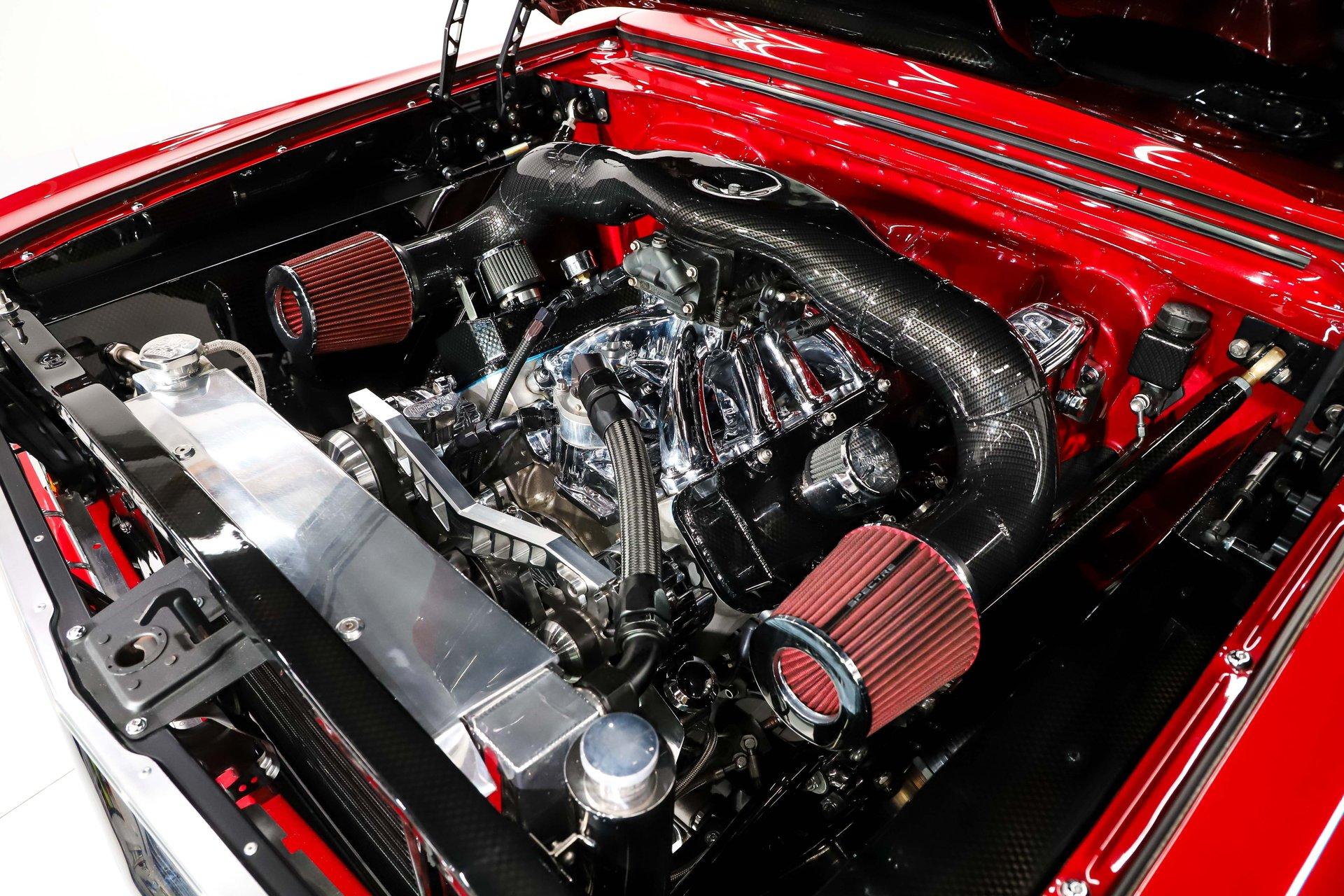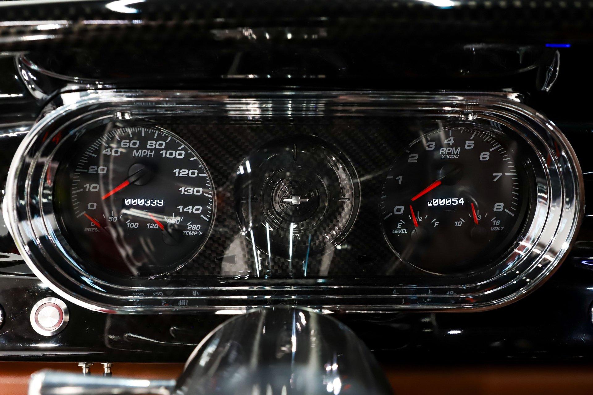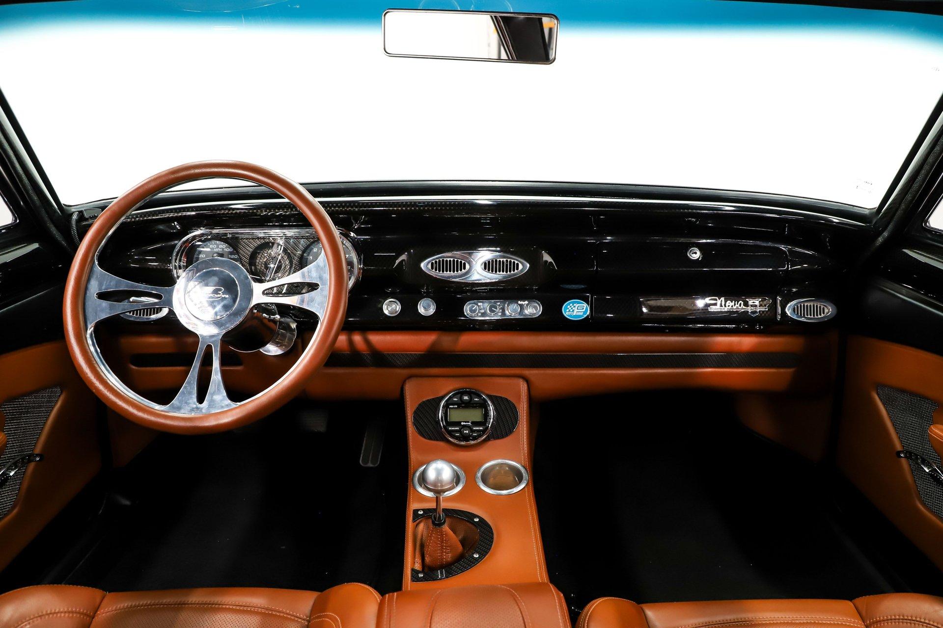 INTERIOR: First class in here! My words won't do it justice but I'll try, look at the pictures. Every square inch was professionally customized. There's so much sculpturing and 1 of a kind hand fabrication. It's upholstered in hand stitched, glove soft Italian leather. There are 4 bucket seats and a very nice center console. Custom sculpted side panels and rear shelf. The dash panel has a carbon fiber effect and premium billet Vintage Air controls and vents. A custom lower panel was made for a very finished look. The custom gauges show just 339 miles on the odometer. It uses an electric e-brake and a keyless ignition! You hit unlock on the key fob then push the starter button to fire up that NASCAR motor. The console is home to luxury items like power windows, a 12 volt receptacle, JBL Bluetooth stereo and cup holders. Too high class for you? That manual 6-speed shifter will remind you that you're in a wolf with sheep's clothes! You won't see the Fat Mat sound deadener or the amps and speakers but you will appreciate that they are there. The leather wrapped Billet Specialties wheel is on a polished column.