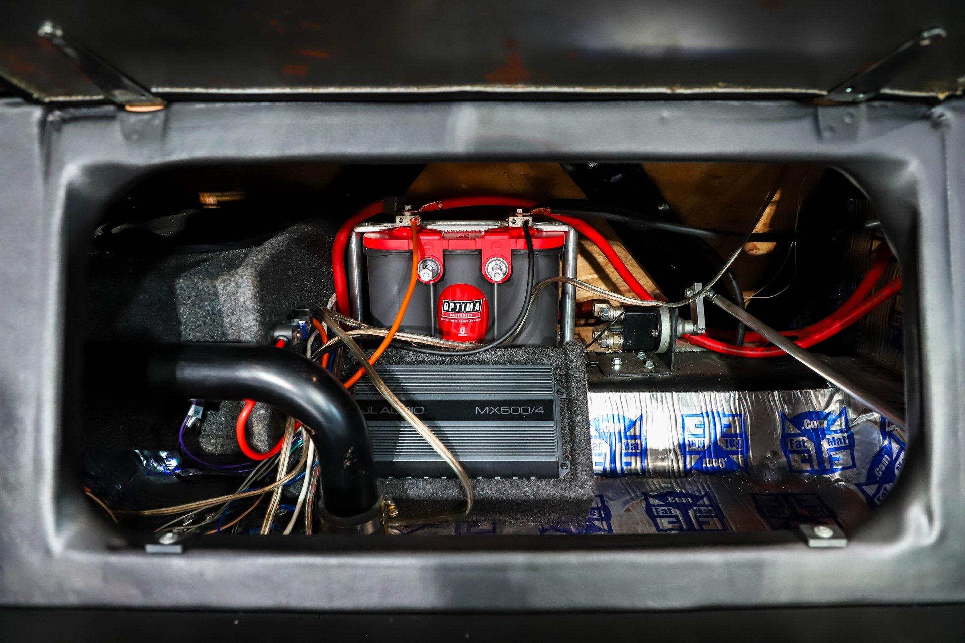 TRUNK COMPARTMENT: It is completely boxed and upholstered, even under the trunk lid. The battery is relocated behind the panel, it has a discount switch and remote terminals under the car.