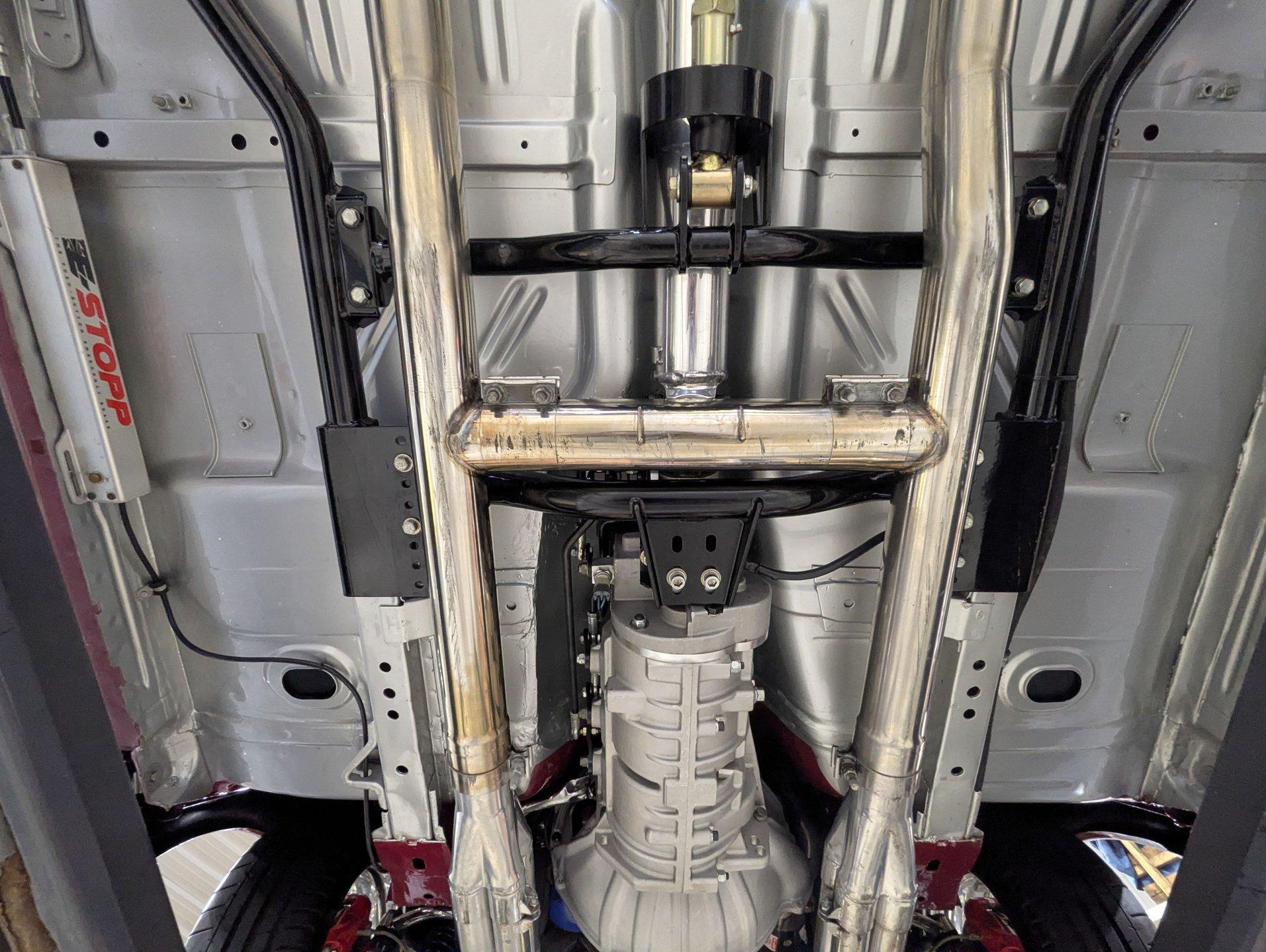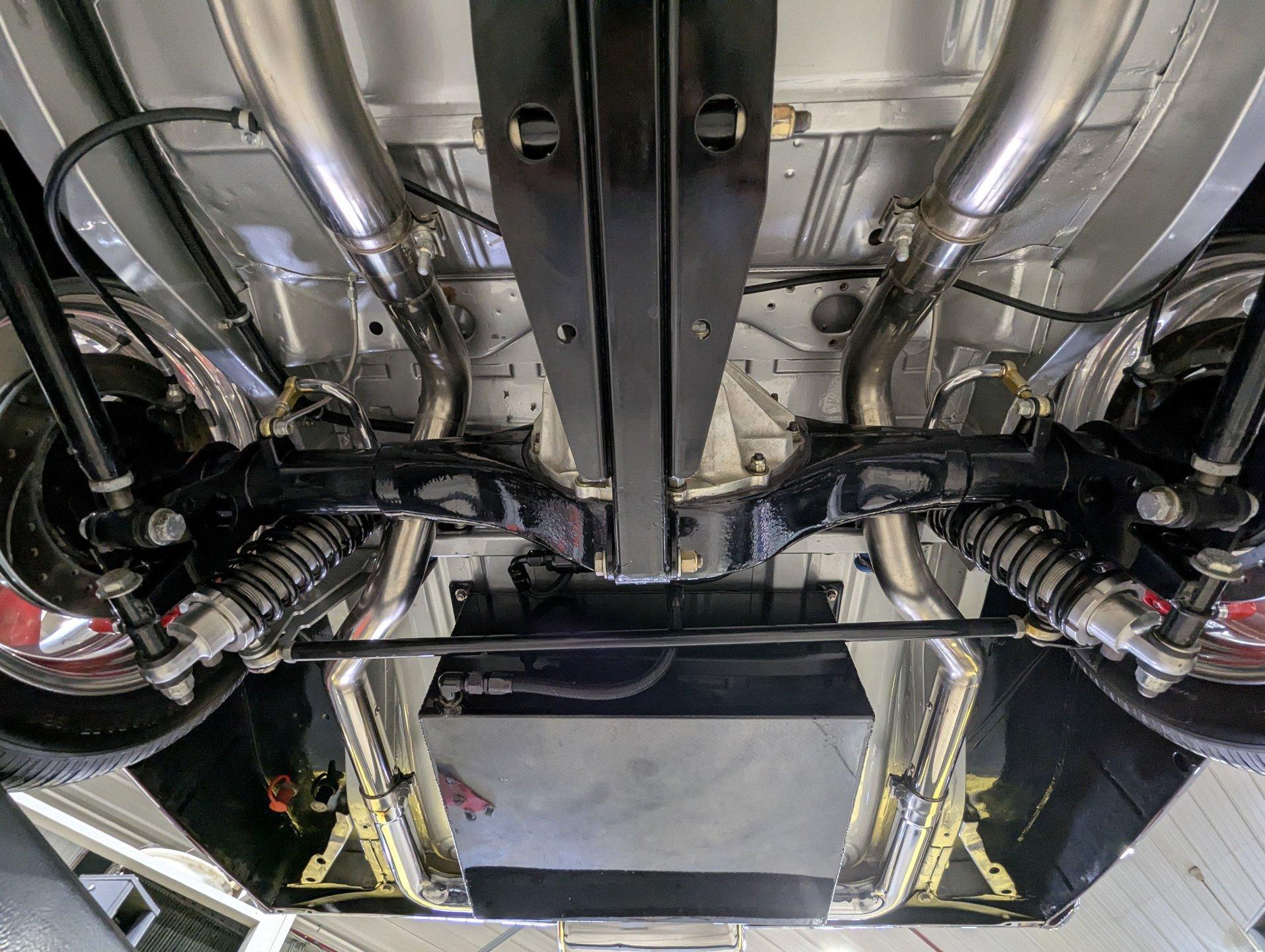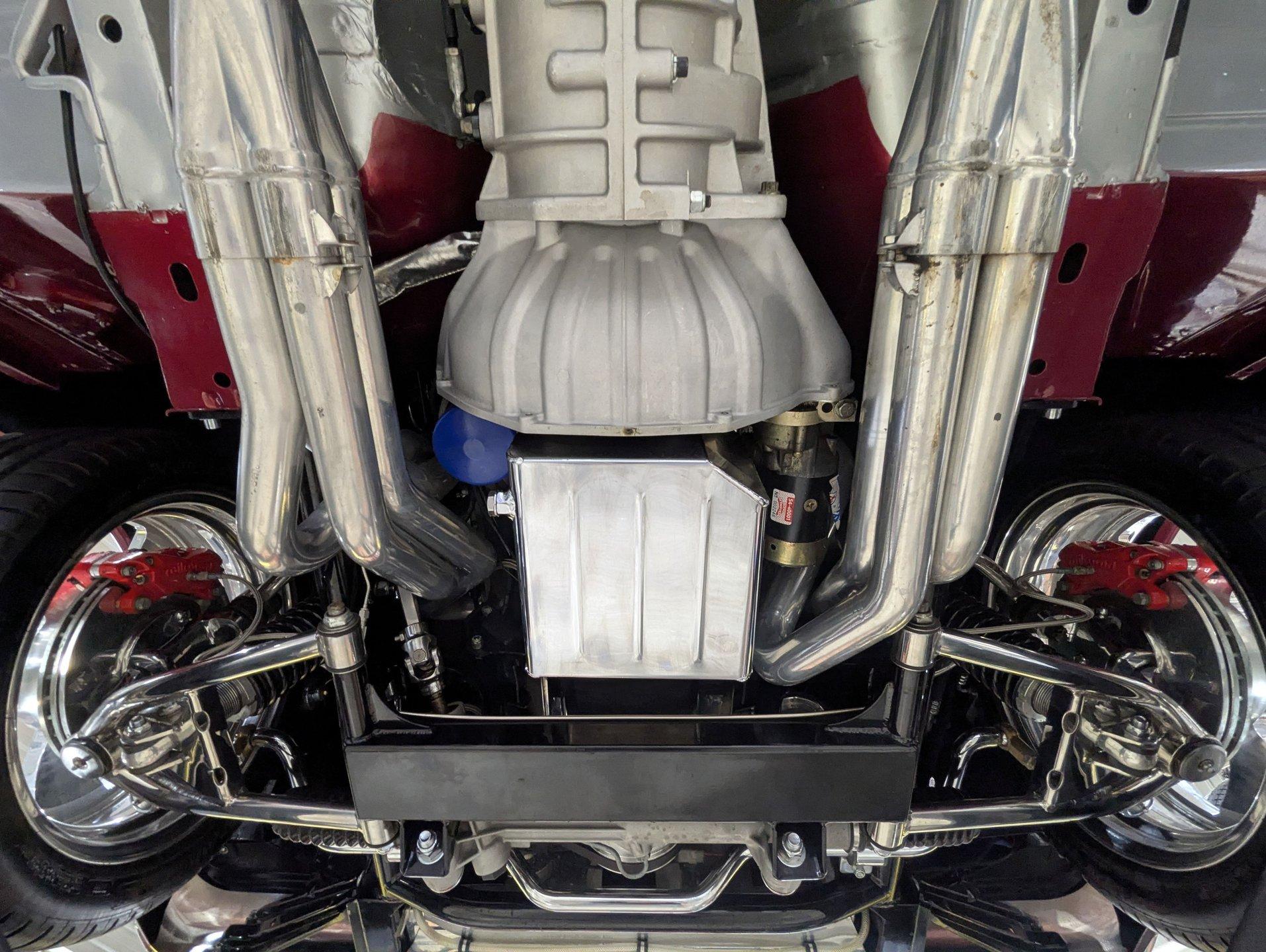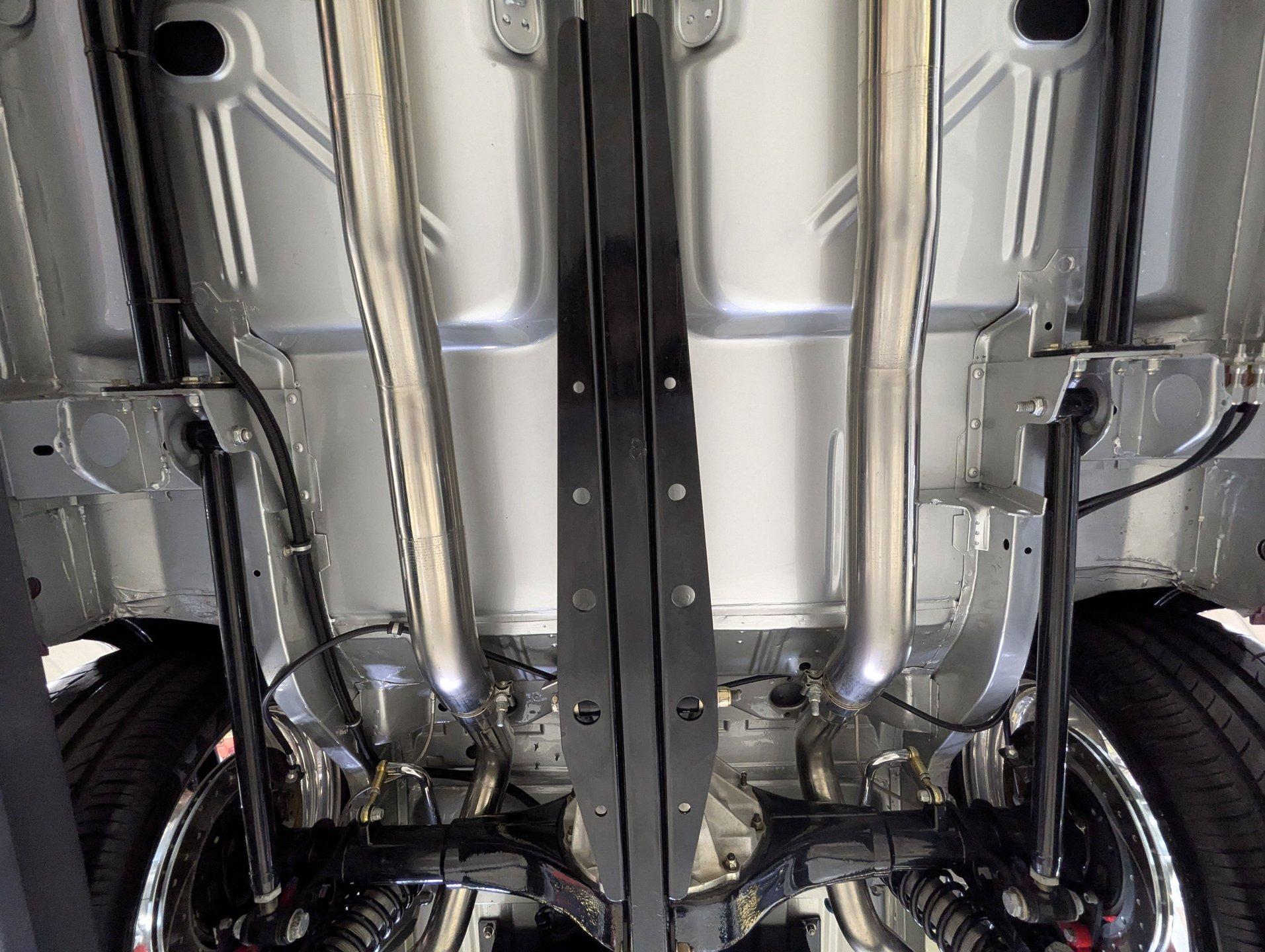 UNDERSIDE: It offers incredible all around high performance driving with a TCI Pro Touring chassis! Upfront it has a dual camber front clip with polished tubular control arms, polished drop spindles, polished swaybar, coilover adjustable gas shocks, rack & pinion steering. It has tubular frame connectors to prevent body twist. In back is a Torque Arm suspension which eliminates binding. It includes a telescoping torque arm, tubular control arms and panhard bar, polished swaybar and coilover adjustable gas shocks. Wilwood big brake kit with drilled and slotted discs at all 4 wheels, the e-brake lines are hidden and it uses the electric E-Stopp emergency brake. Highly polished stainless fabricated exhaust with crossover pipe and it is routed to a center exit NASCAR style tip. The custom fuel system with uses premium fittings, pump and braided lines. Looking up at the motor there is an extra capacity oil pan and a high torque starter. The trans is a Richmond Super Street 5-speed manual trans with a triple disc clutch and a lightweight flywheel. The driveshaft is polished aluminum and there's a Currie 9 inch rear with aluminum center section, 31 spline axles and 3.73 posi gears. The floors are clean metal painted silver. It is still new looking under this car.
