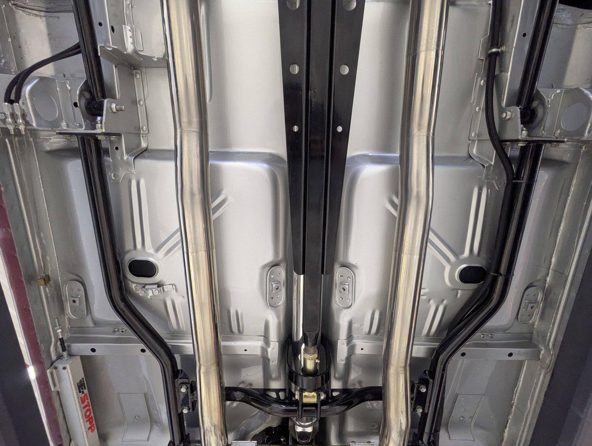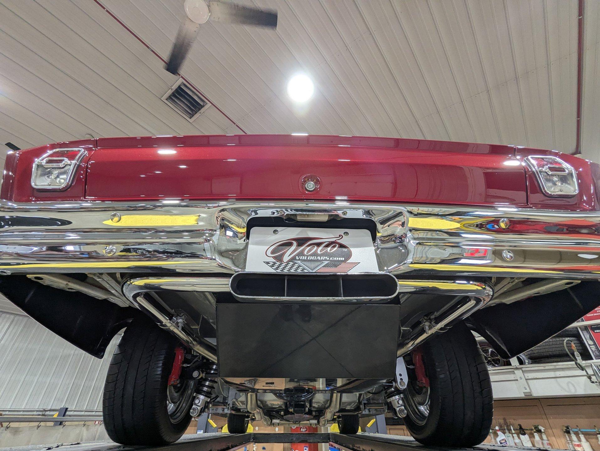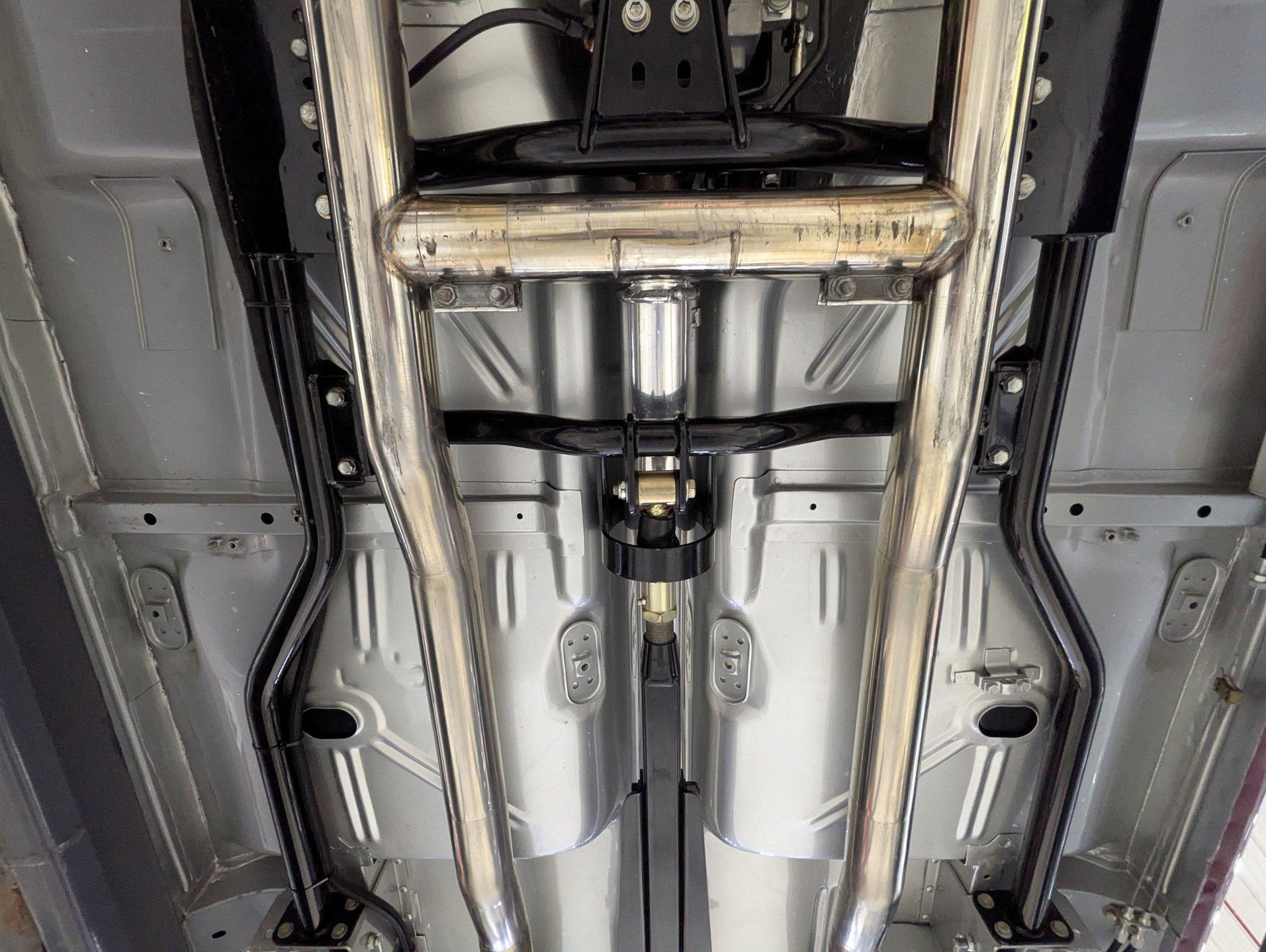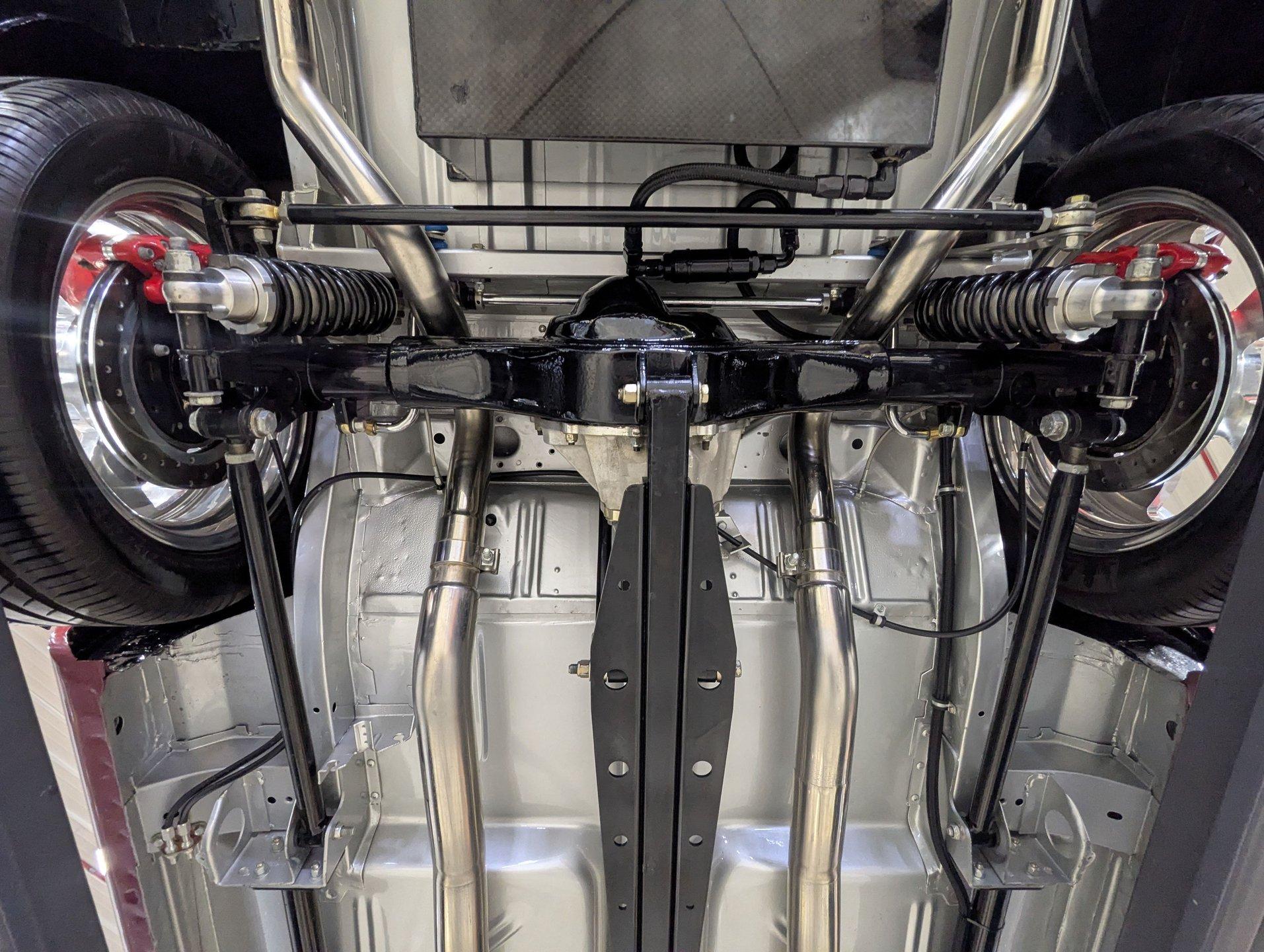 UNDERSIDE: It offers incredible all around high performance driving with a TCI Pro Touring chassis! Upfront it has a dual camber front clip with polished tubular control arms, polished drop spindles, polished swaybar, coilover adjustable gas shocks, rack & pinion steering. It has tubular frame connectors to prevent body twist. In back is a Torque Arm suspension which eliminates binding. It includes a telescoping torque arm, tubular control arms and panhard bar, polished swaybar and coilover adjustable gas shocks. Wilwood big brake kit with drilled and slotted discs at all 4 wheels, the e-brake lines are hidden and it uses the electric E-Stopp emergency brake. Highly polished stainless fabricated exhaust with crossover pipe and it is routed to a center exit NASCAR style tip. The custom fuel system with uses premium fittings, pump and braided lines. Looking up at the motor there is an extra capacity oil pan and a high torque starter. The trans is a Richmond Super Street 5-speed manual trans with a triple disc clutch and a lightweight flywheel. The driveshaft is polished aluminum and there's a Currie 9 inch rear with aluminum center section, 31 spline axles and 3.73 posi gears. The floors are clean metal painted silver. It is still new looking under this car.