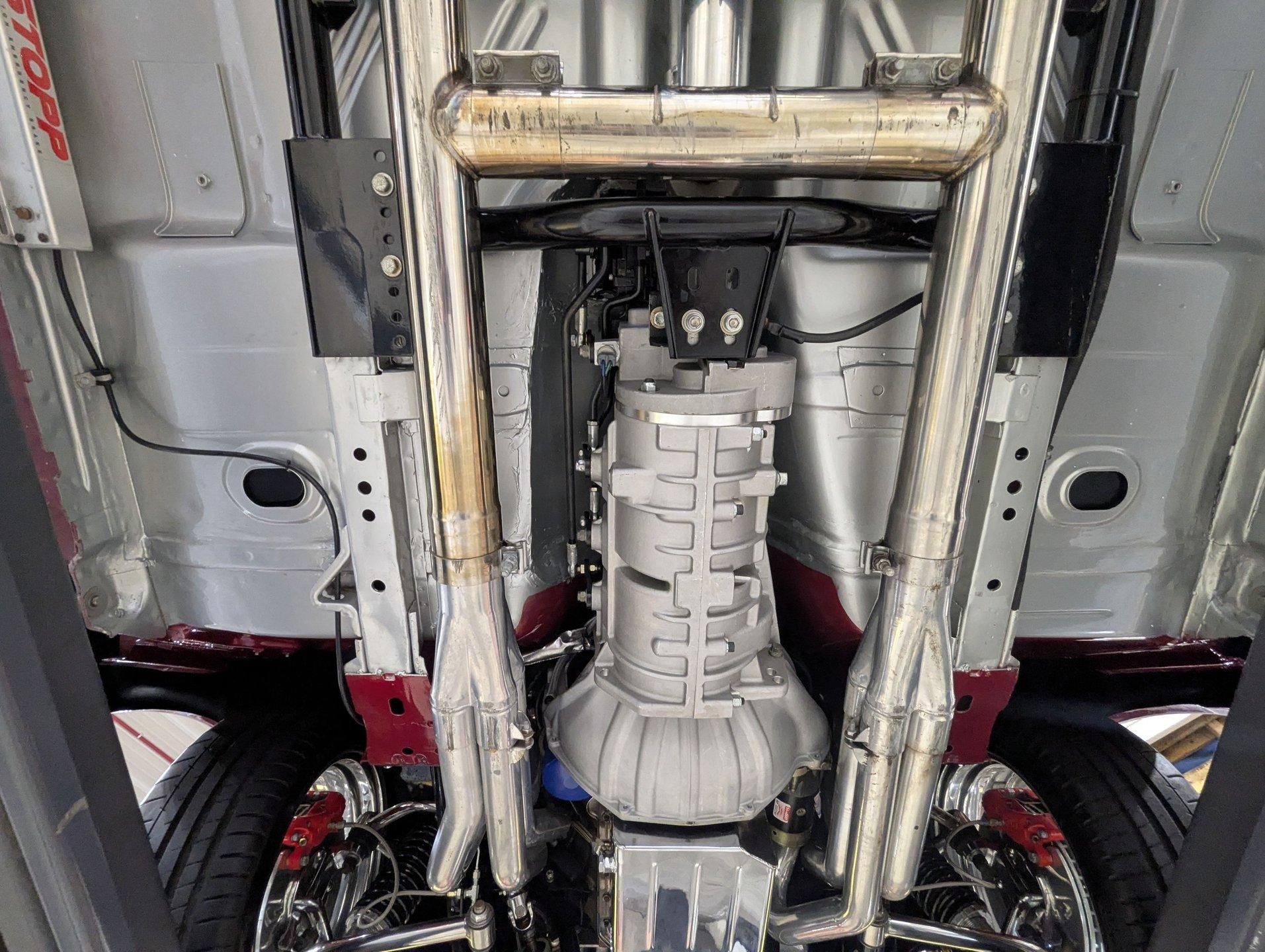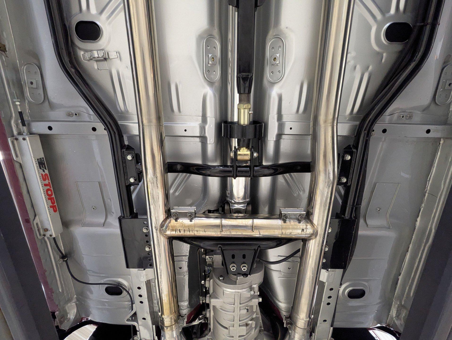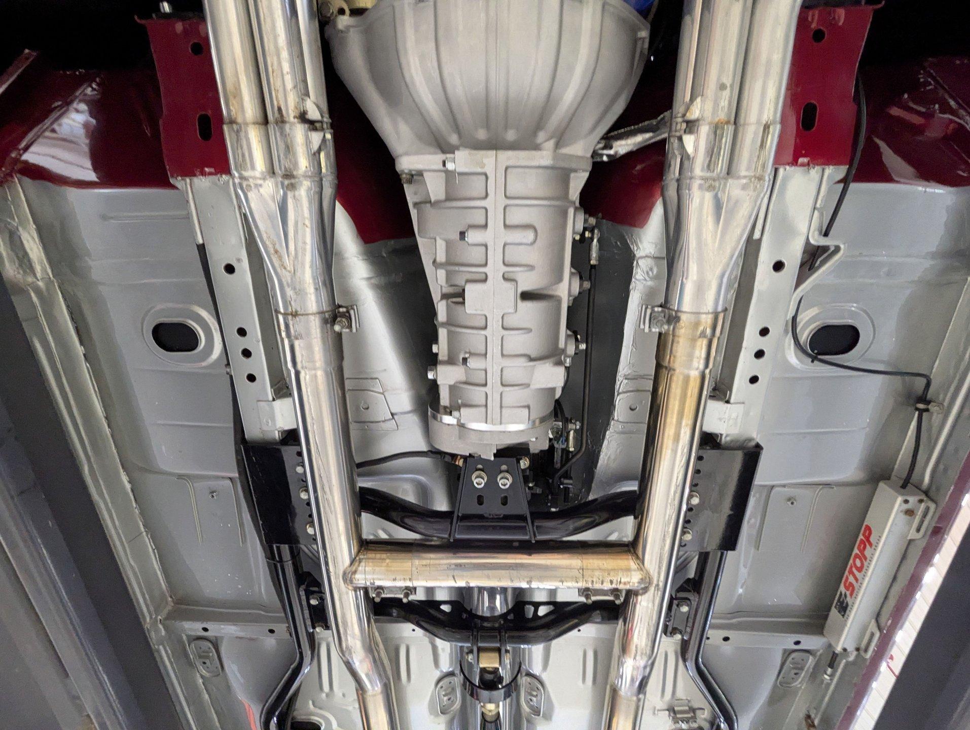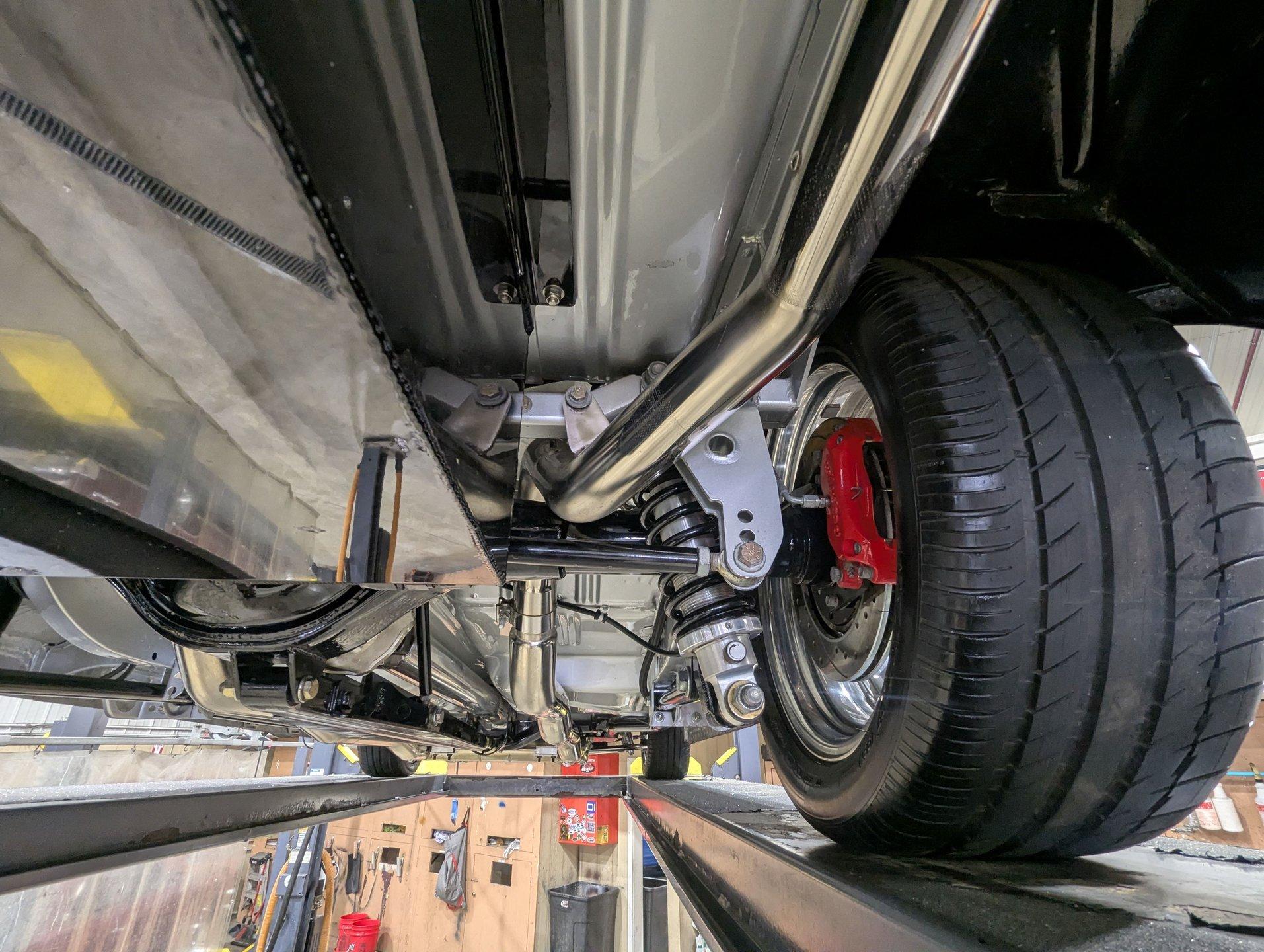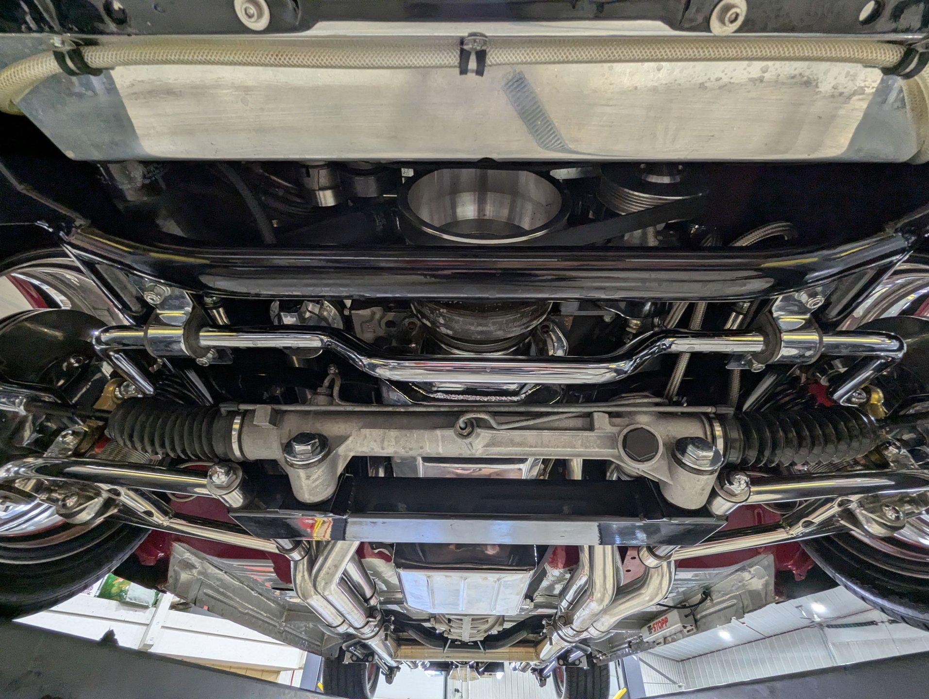 UNDERSIDE: It offers incredible all around high performance driving with a TCI Pro Touring chassis! Upfront it has a dual camber front clip with polished tubular control arms, polished drop spindles, polished swaybar, coilover adjustable gas shocks, rack & pinion steering. It has tubular frame connectors to prevent body twist. In back is a Torque Arm suspension which eliminates binding. It includes a telescoping torque arm, tubular control arms and panhard bar, polished swaybar and coilover adjustable gas shocks. Wilwood big brake kit with drilled and slotted discs at all 4 wheels, the e-brake lines are hidden and it uses the electric E-Stopp emergency brake. Highly polished stainless fabricated exhaust with crossover pipe and it is routed to a center exit NASCAR style tip. The custom fuel system with uses premium fittings, pump and braided lines. Looking up at the motor there is an extra capacity oil pan and a high torque starter. The trans is a Richmond Super Street 5-speed manual trans with a triple disc clutch and a lightweight flywheel. The driveshaft is polished aluminum and there's a Currie 9 inch rear with aluminum center section, 31 spline axles and 3.73 posi gears. The floors are clean metal painted silver. It is still new looking under this car.