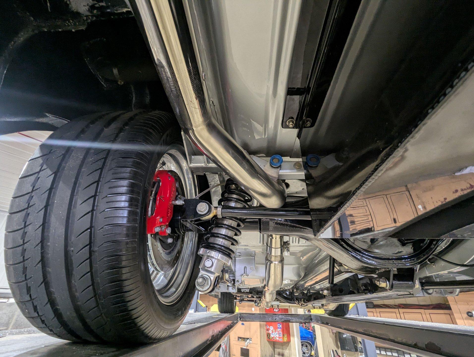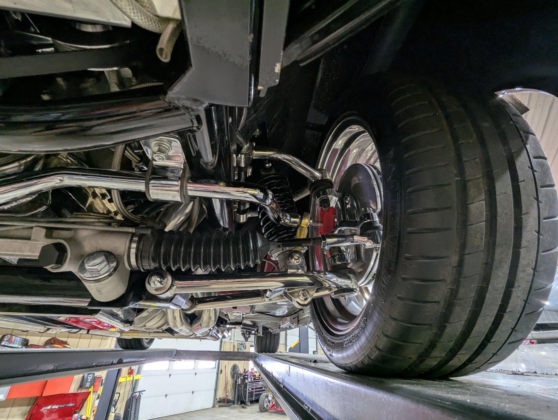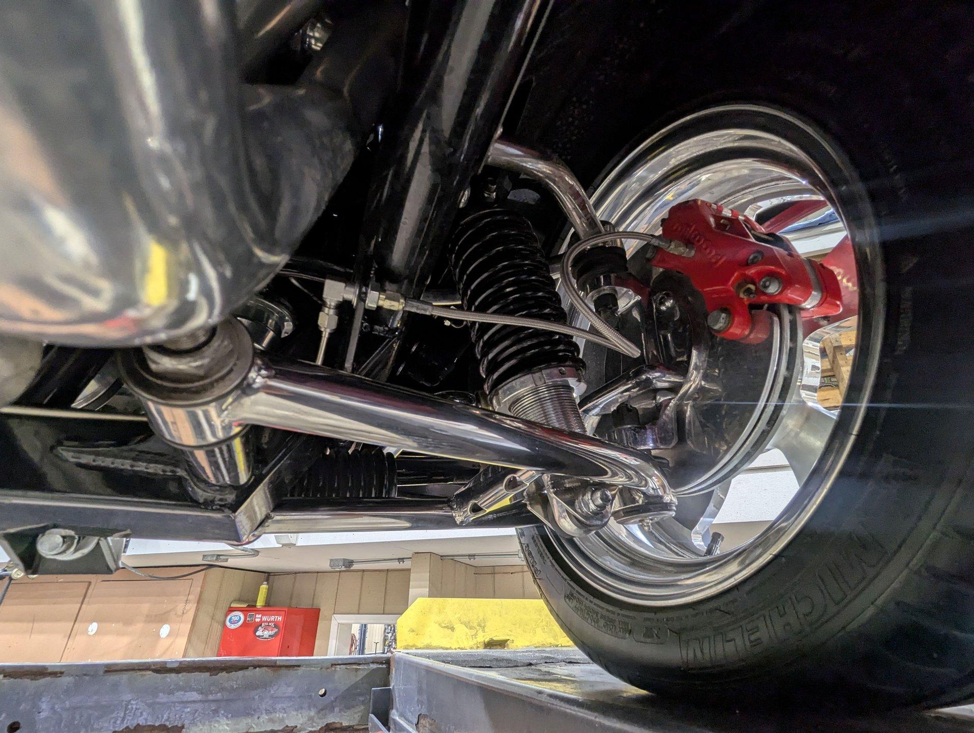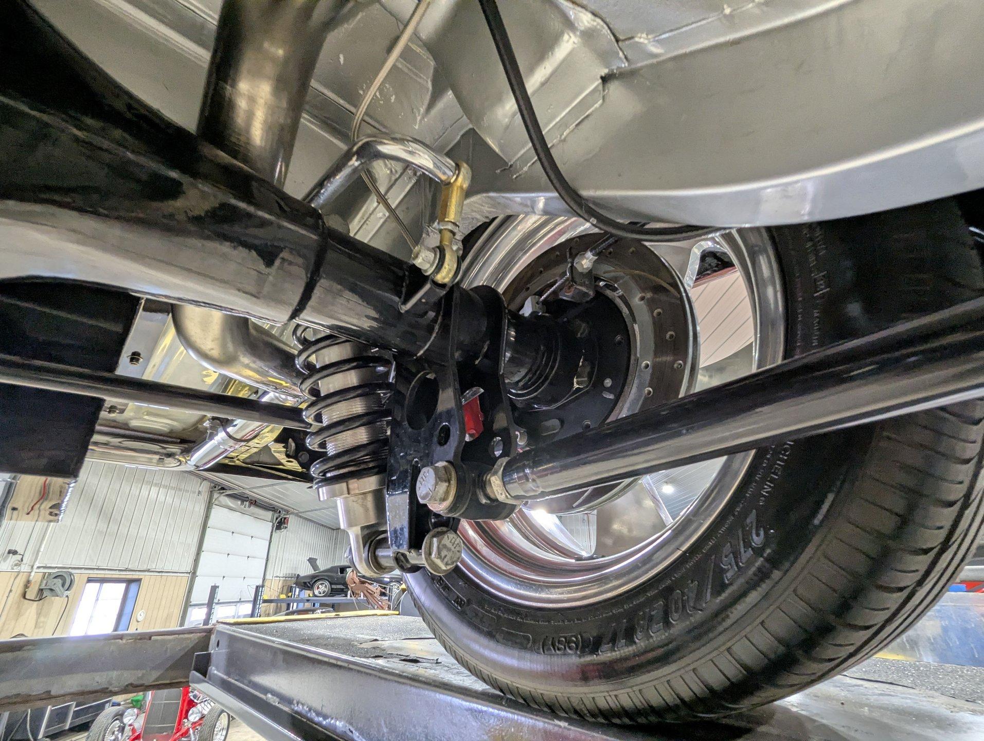 UNDERSIDE: It offers incredible all around high performance driving with a TCI Pro Touring chassis! Upfront it has a dual camber front clip with polished tubular control arms, polished drop spindles, polished swaybar, coilover adjustable gas shocks, rack & pinion steering. It has tubular frame connectors to prevent body twist. In back is a Torque Arm suspension which eliminates binding. It includes a telescoping torque arm, tubular control arms and panhard bar, polished swaybar and coilover adjustable gas shocks. Wilwood big brake kit with drilled and slotted discs at all 4 wheels, the e-brake lines are hidden and it uses the electric E-Stopp emergency brake. Highly polished stainless fabricated exhaust with crossover pipe and it is routed to a center exit NASCAR style tip. The custom fuel system with uses premium fittings, pump and braided lines. Looking up at the motor there is an extra capacity oil pan and a high torque starter. The trans is a Richmond Super Street 5-speed manual trans with a triple disc clutch and a lightweight flywheel. The driveshaft is polished aluminum and there's a Currie 9 inch rear with aluminum center section, 31 spline axles and 3.73 posi gears. The floors are clean metal painted silver. It is still new looking under this car.