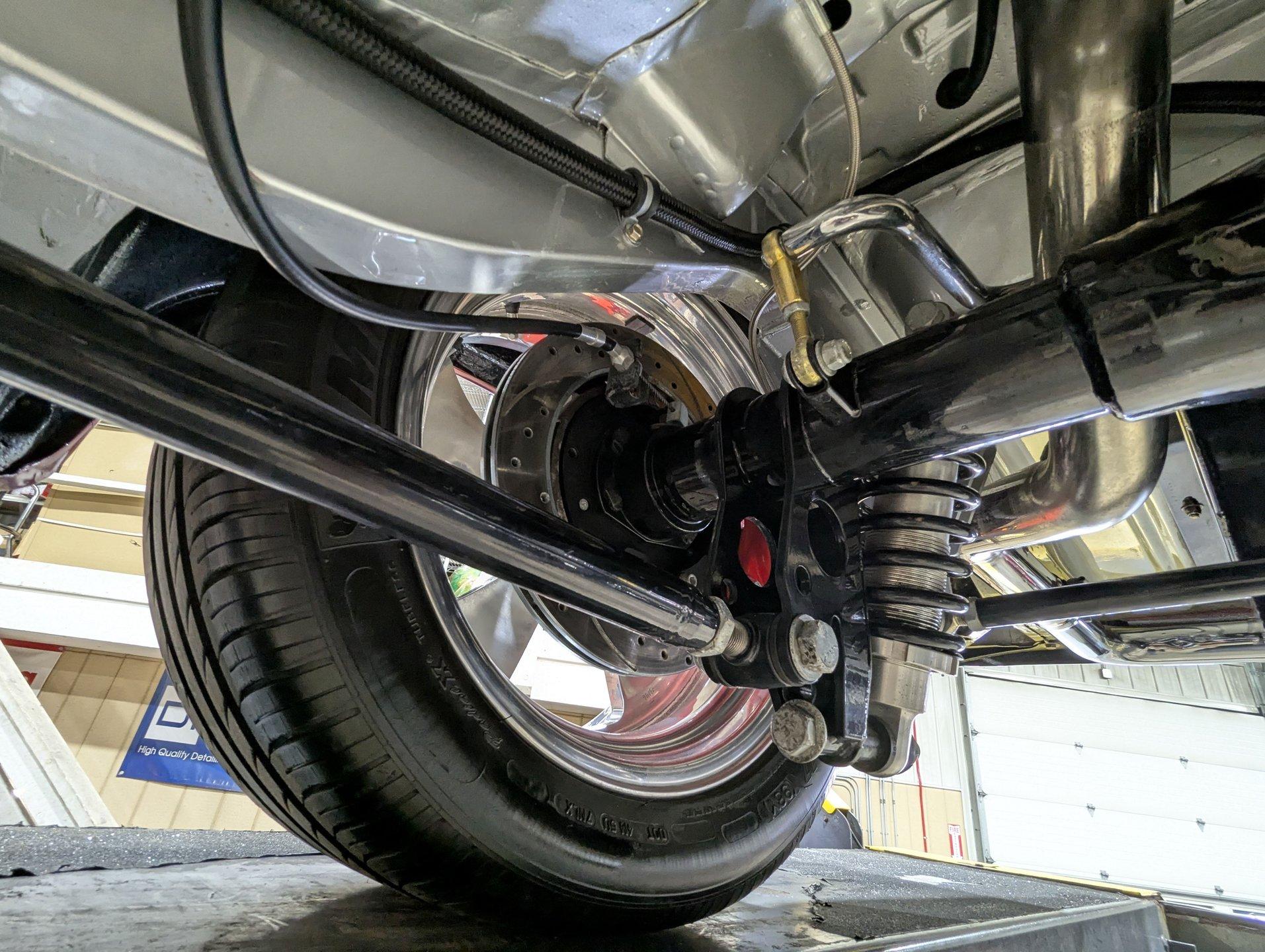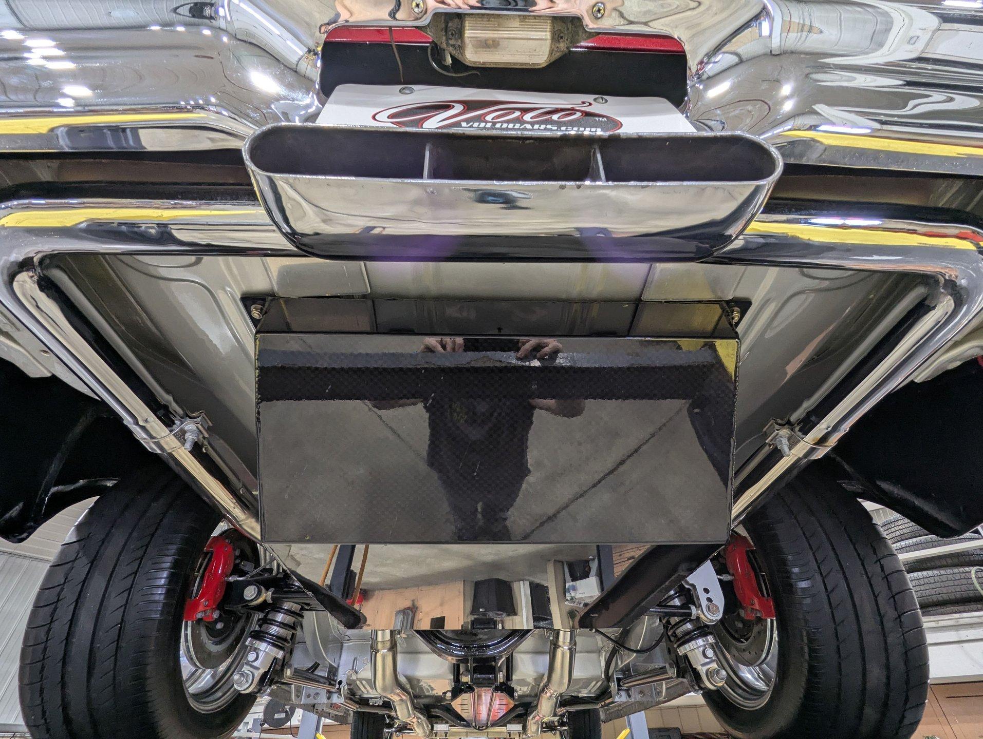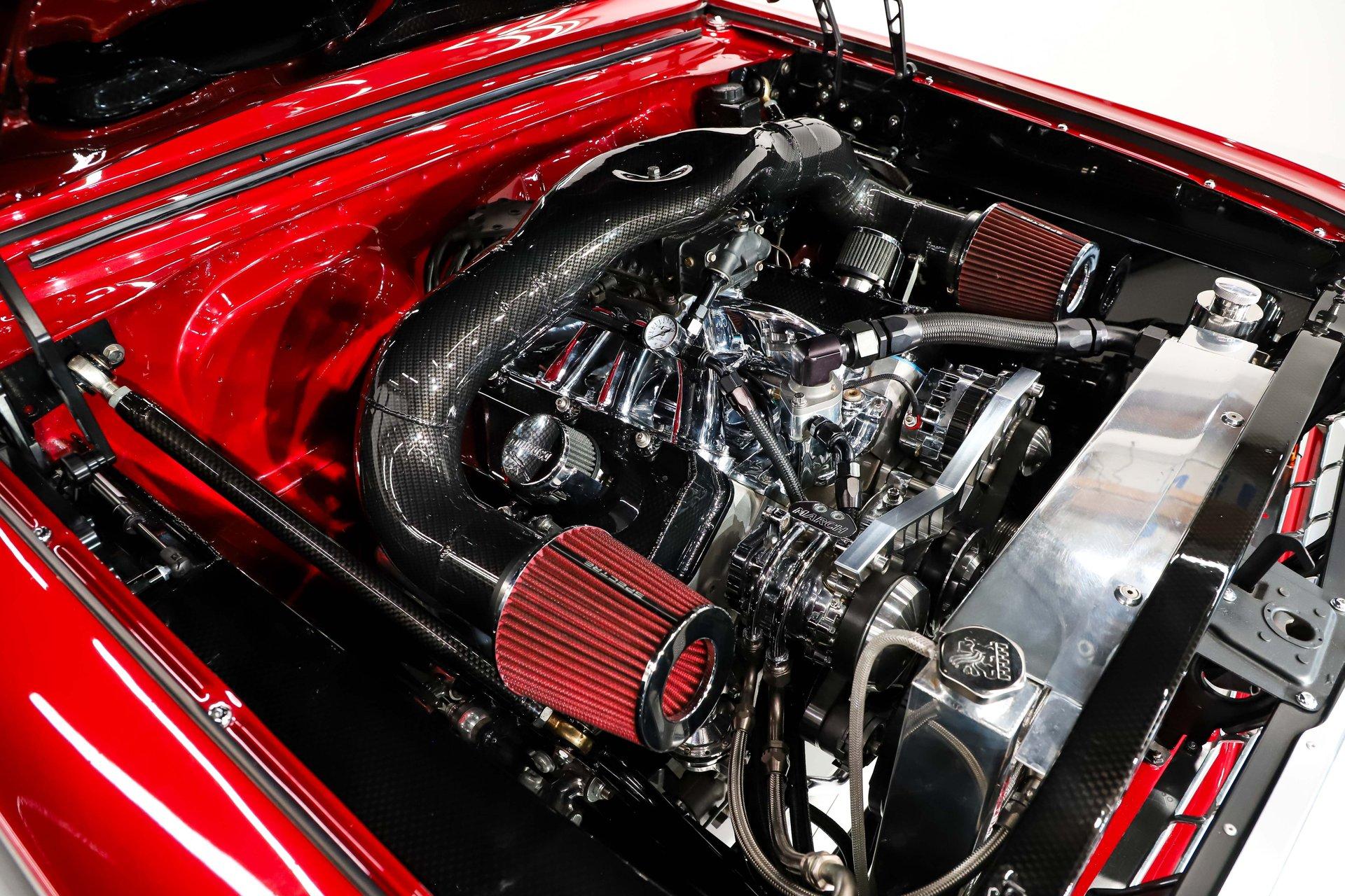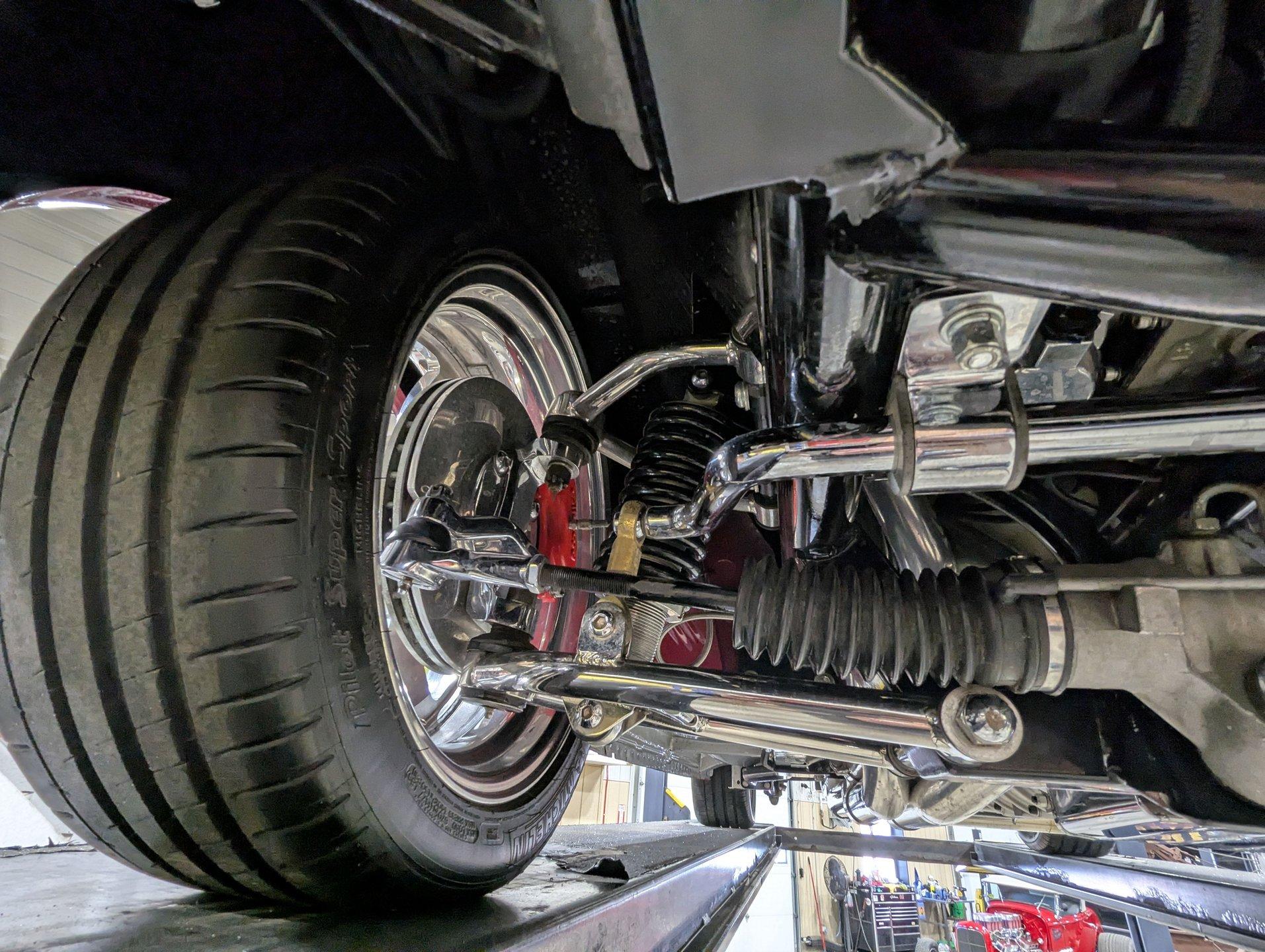 UNDERSIDE: It offers incredible all around high performance driving with a TCI Pro Touring chassis! Upfront it has a dual camber front clip with polished tubular control arms, polished drop spindles, polished swaybar, coilover adjustable gas shocks, rack & pinion steering. It has tubular frame connectors to prevent body twist. In back is a Torque Arm suspension which eliminates binding. It includes a telescoping torque arm, tubular control arms and panhard bar, polished swaybar and coilover adjustable gas shocks. Wilwood big brake kit with drilled and slotted discs at all 4 wheels, the e-brake lines are hidden and it uses the electric E-Stopp emergency brake. Highly polished stainless fabricated exhaust with crossover pipe and it is routed to a center exit NASCAR style tip. The custom fuel system with uses premium fittings, pump and braided lines. Looking up at the motor there is an extra capacity oil pan and a high torque starter. The trans is a Richmond Super Street 5-speed manual trans with a triple disc clutch and a lightweight flywheel. The driveshaft is polished aluminum and there's a Currie 9 inch rear with aluminum center section, 31 spline axles and 3.73 posi gears. The floors are clean metal painted silver. It is still new looking under this car.