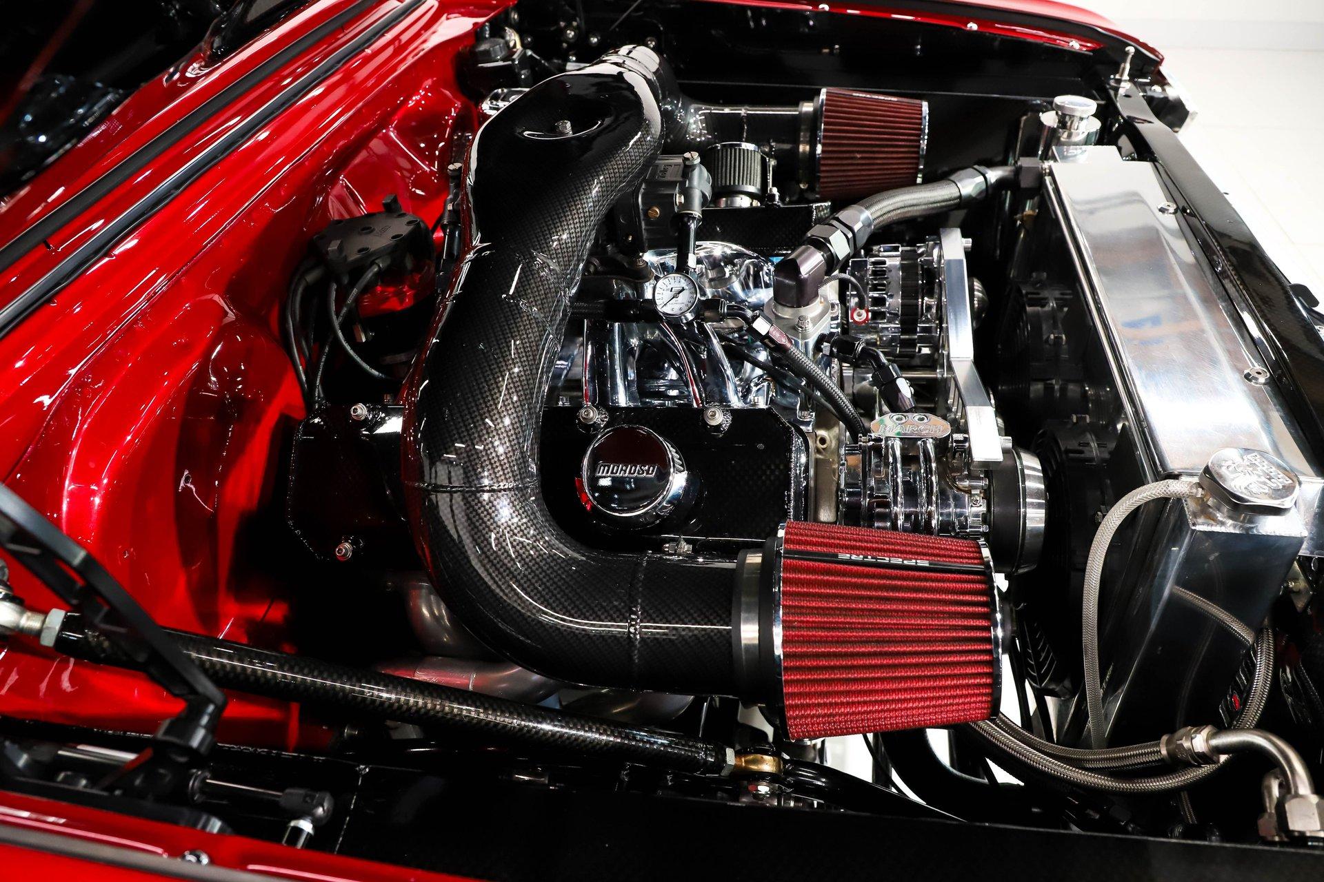 EXTERIOR: Phenomenal fit and finish! The body is straight as a rifle barrel from rockers to roof! It was cleaned up with flush door handles, shaved rain gutters, a flush mount fuel door and the emblems, antenna and moldings were shaved. The composite Manta scooped hood has racing locks. The wine metallic paint looks like a piece of hard candy, its polished smooth and glossy. There's some high end painted graphics on each side that's smooth to the touch. All of the stainless is polished like chrome. All of the chrome is replaced including the window frames. All new smoked glass and weatherstrips. Intro wheels wrapped in Pilot Sport performance tires.