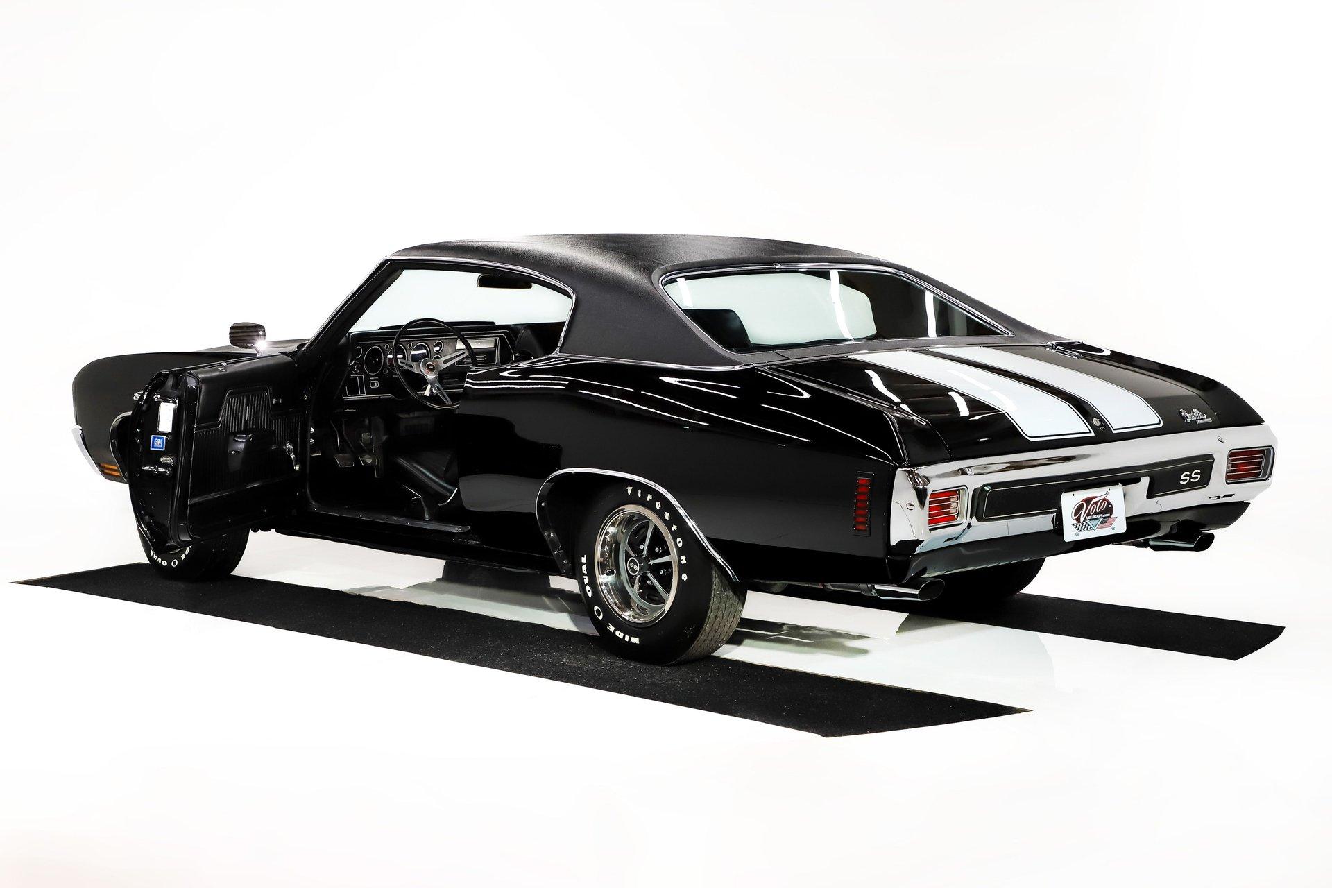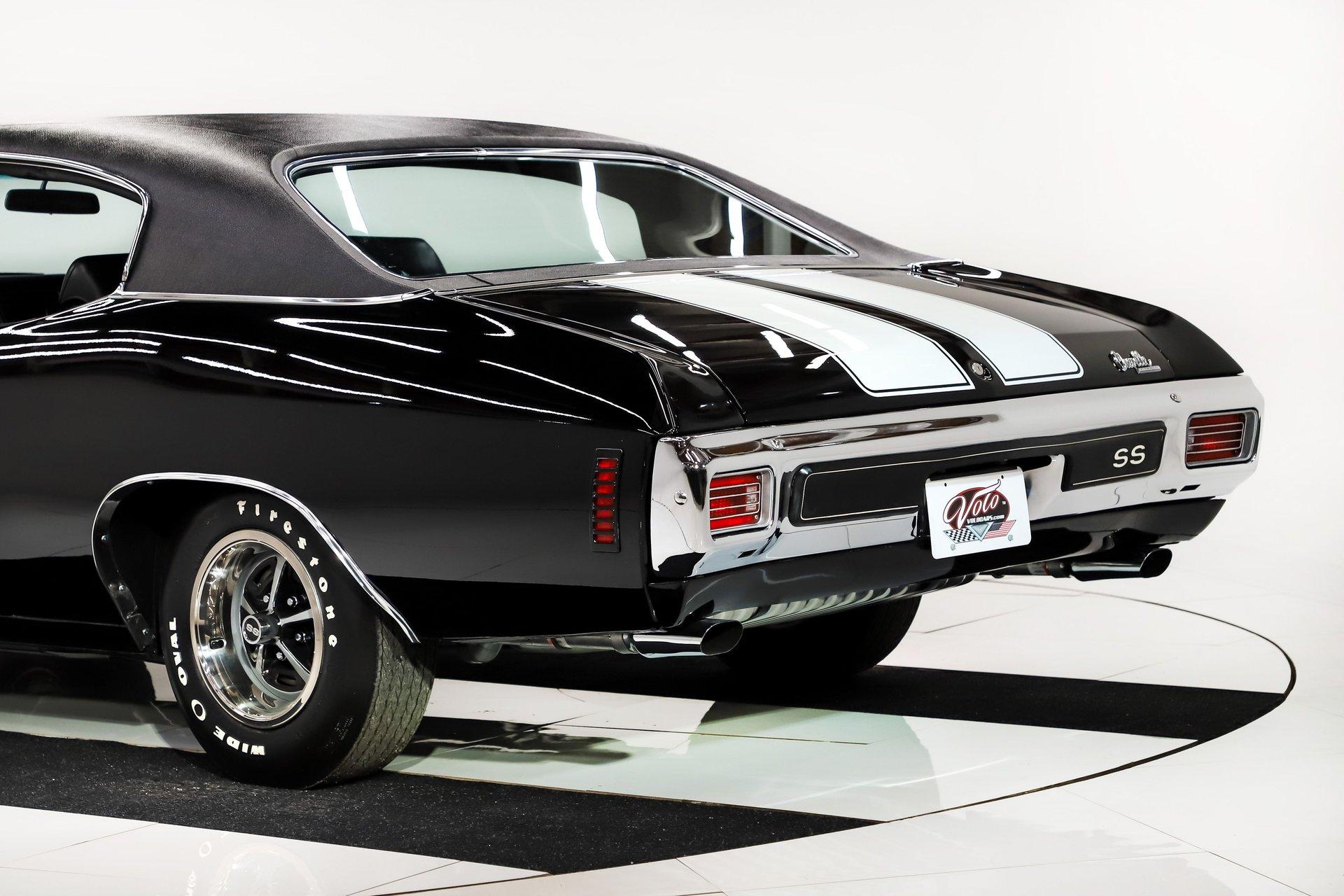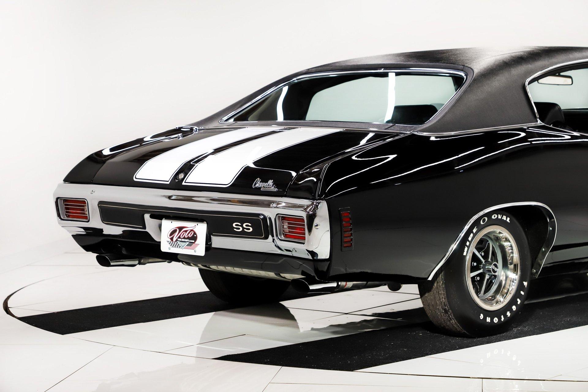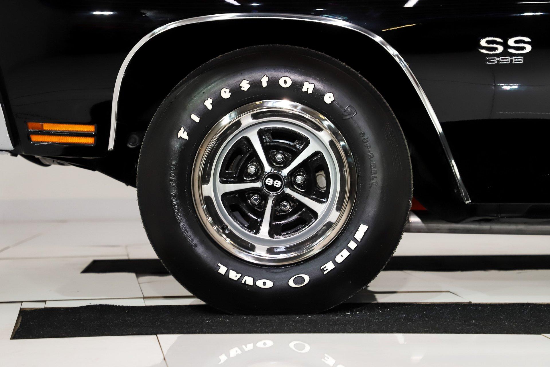 EXTERIOR: This the best looking skunk I've ever seen! Stunning factory tuxedo black with the white SS stripes. The body is laser beam straight and smooth all the way down to the rockers. The gaps fit exceptionally well and the paint is polished to a very smooth high gloss finish. It looks like all of the trim has been replaced including the moldings, door handles, emblems, bumpers etc. The vinyl top and weatherstrips were replaced. All of the glass was even replaced! Brought back exactly to 1970 specs with T3 headlights and Firestone Wide Oval tires!