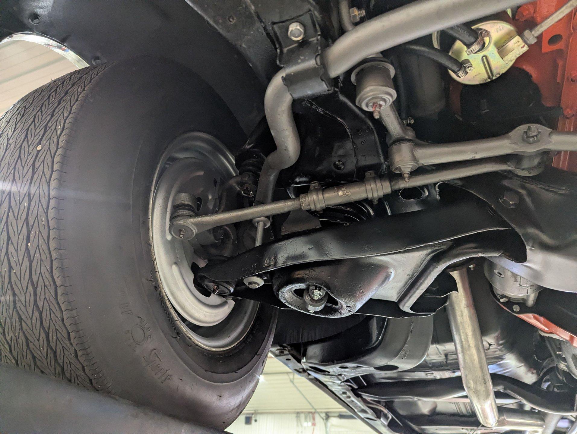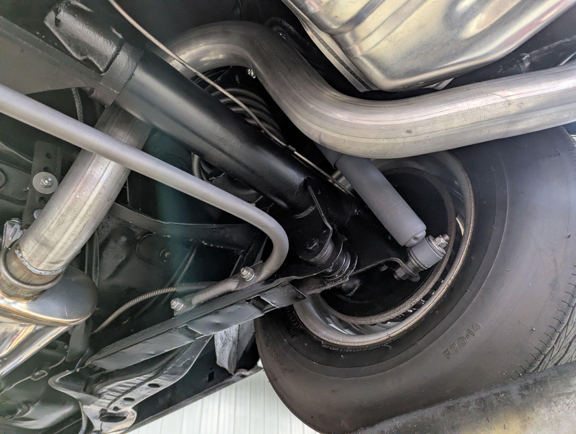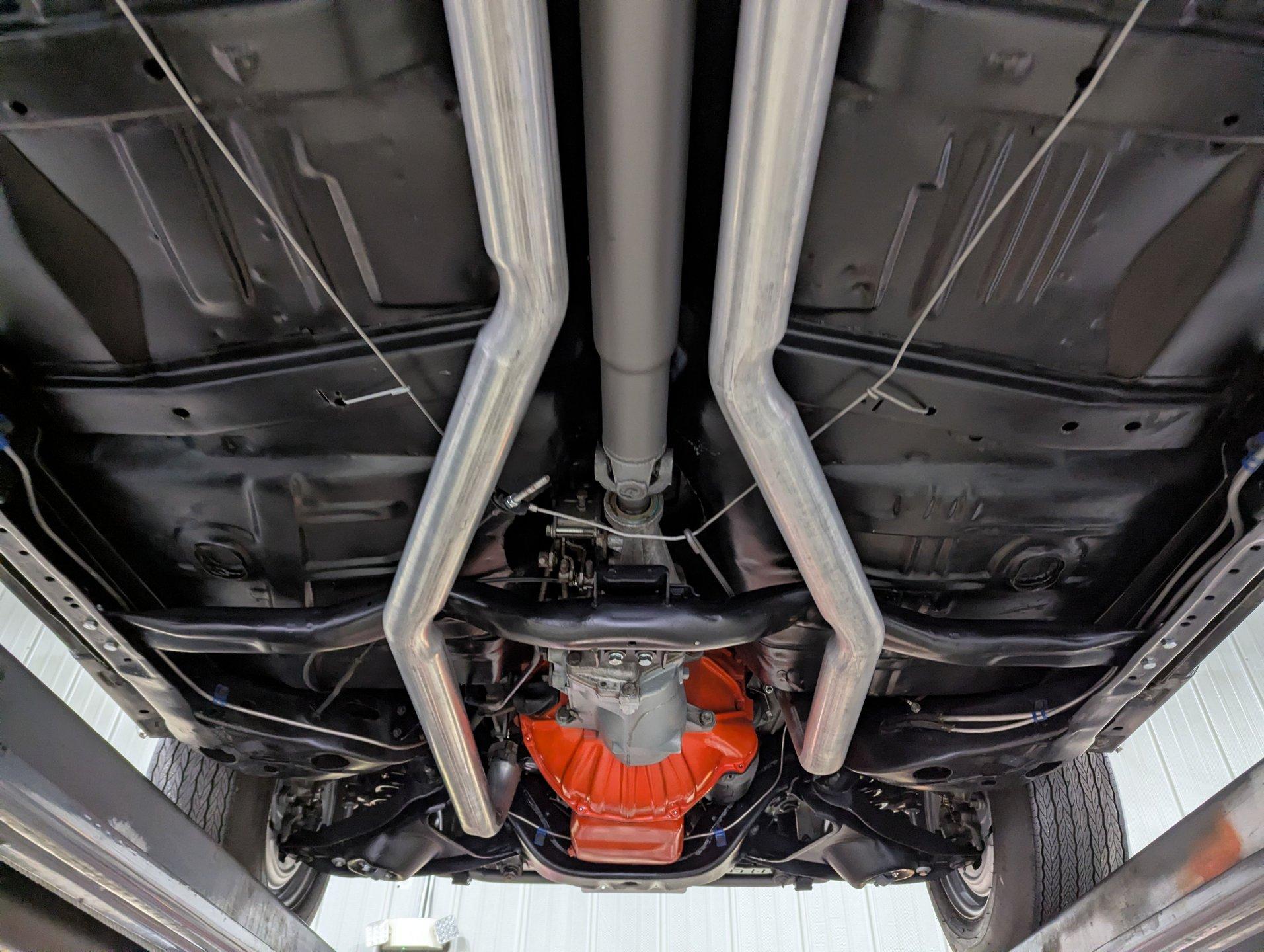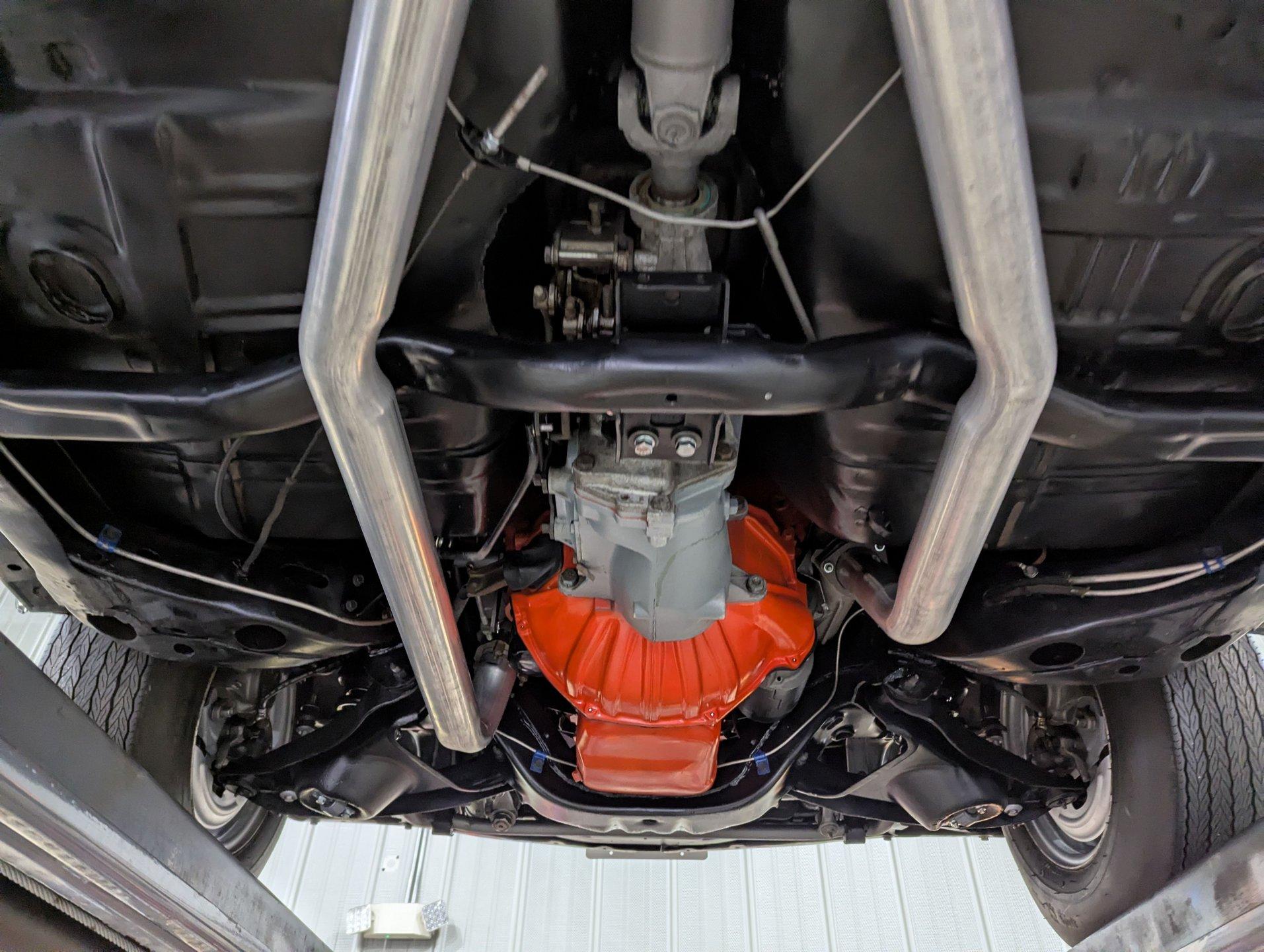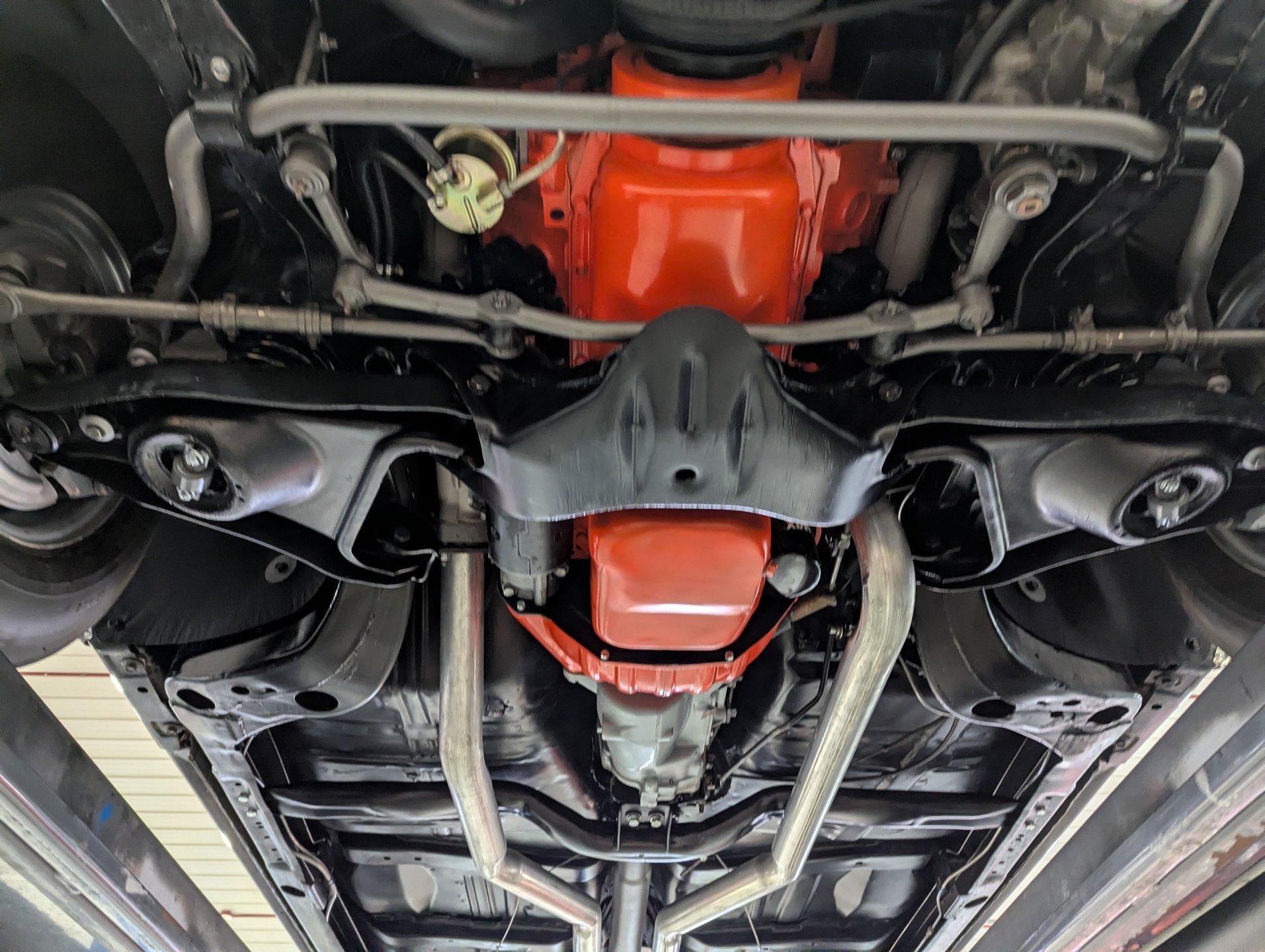 UNDERSIDE: It practically looks like a new 1970 Chevelle underneath this one! It's fully detailed and restored. It has the F-41 suspension which includes front and rear sway bars, and boxed rear control arms. The dual exhaust has stainless Street Max mufflers and correct SS tips. The brake system was completely redone and has disc in front, drum in back and the e-brake assembly is new. The fuel system was replaced including the tank. Looking up at the motor it is clean Chevy orange and has the factory type starter. The correct Muncie 4-speed manual trans and the linkage look fresh. In back is the correct 12 bolt rear end with 3.31 gears. The floors, inner rockers and braces are super clean metal painted a nice, smooth semi gloss black.