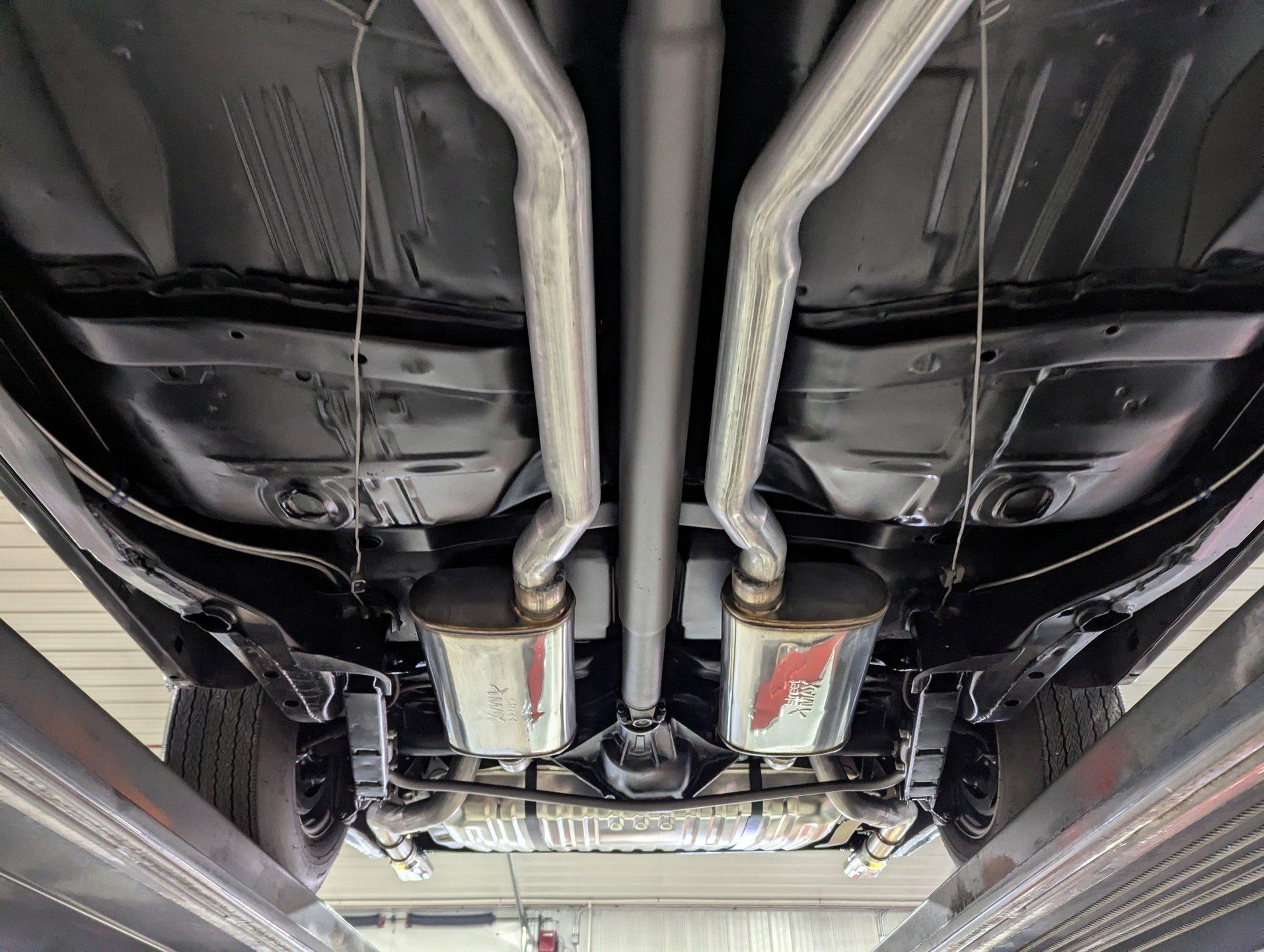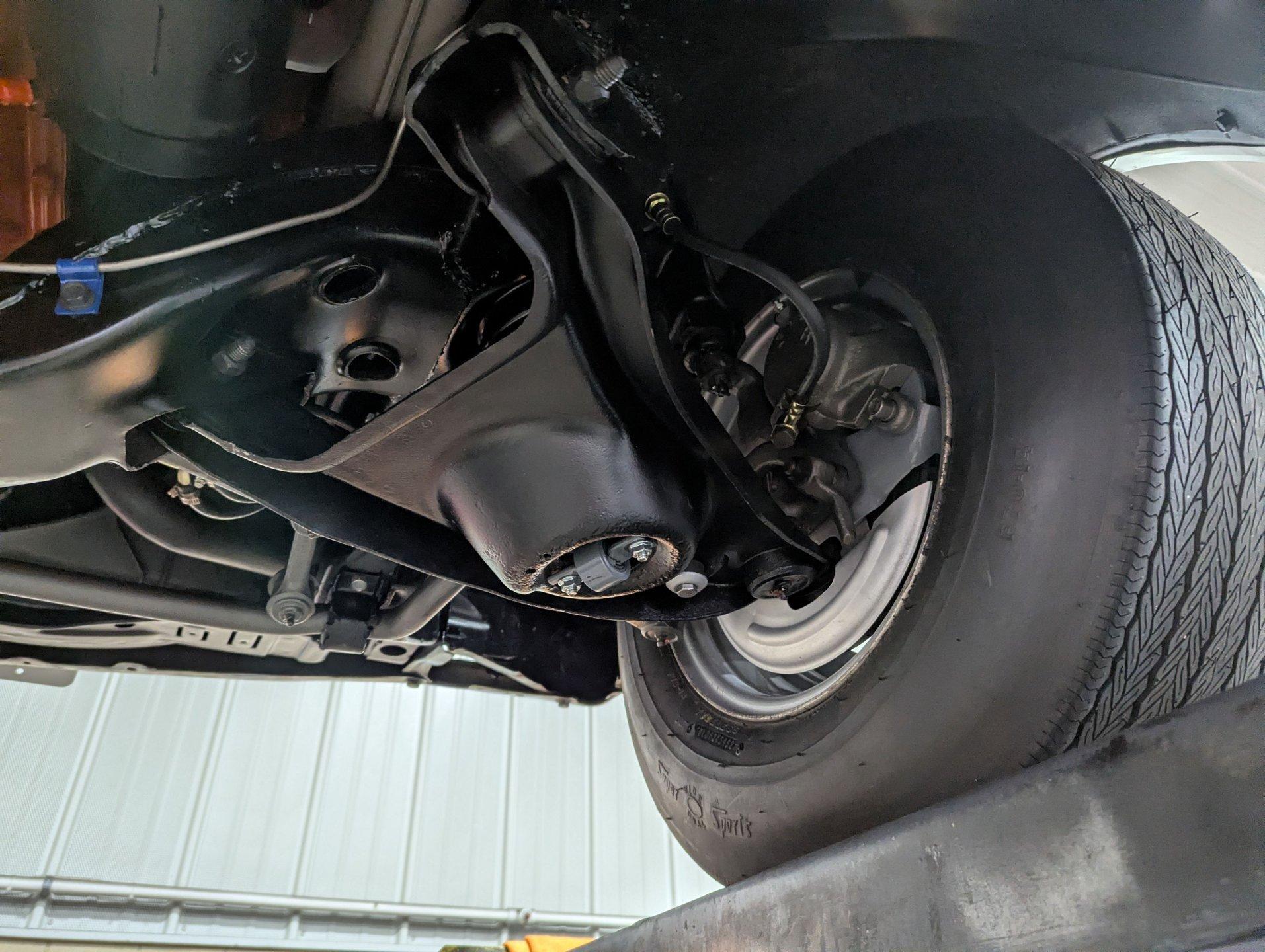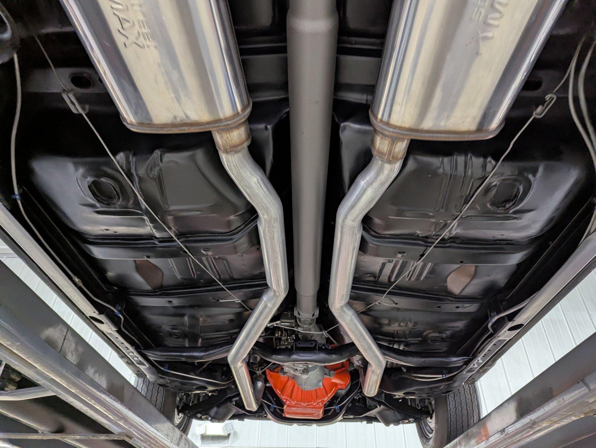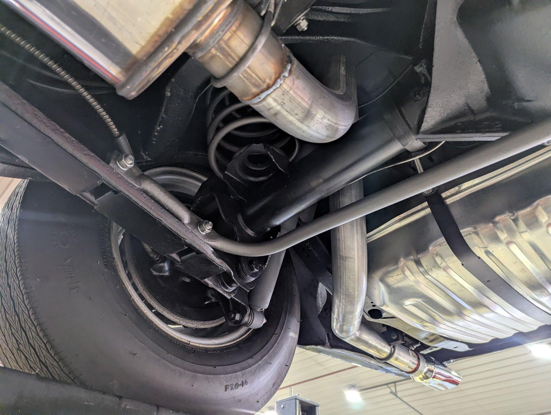 UNDERSIDE: It practically looks like a new 1970 Chevelle underneath this one! It's fully detailed and restored. It has the F-41 suspension which includes front and rear sway bars, and boxed rear control arms. The dual exhaust has stainless Street Max mufflers and correct SS tips. The brake system was completely redone and has disc in front, drum in back and the e-brake assembly is new. The fuel system was replaced including the tank. Looking up at the motor it is clean Chevy orange and has the factory type starter. The correct Muncie 4-speed manual trans and the linkage look fresh. In back is the correct 12 bolt rear end with 3.31 gears. The floors, inner rockers and braces are super clean metal painted a nice, smooth semi gloss black.