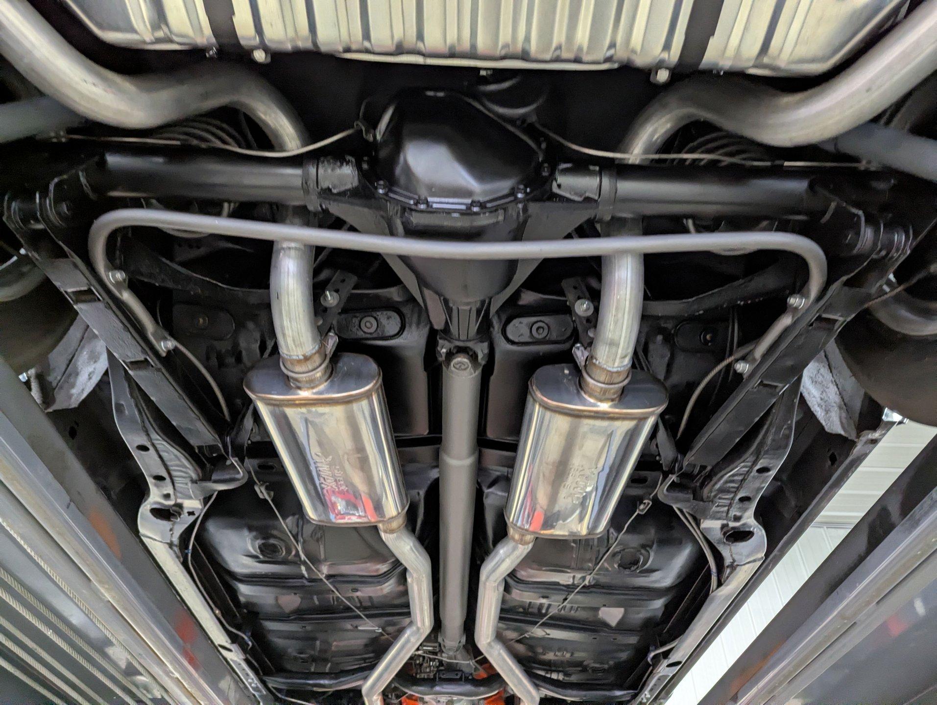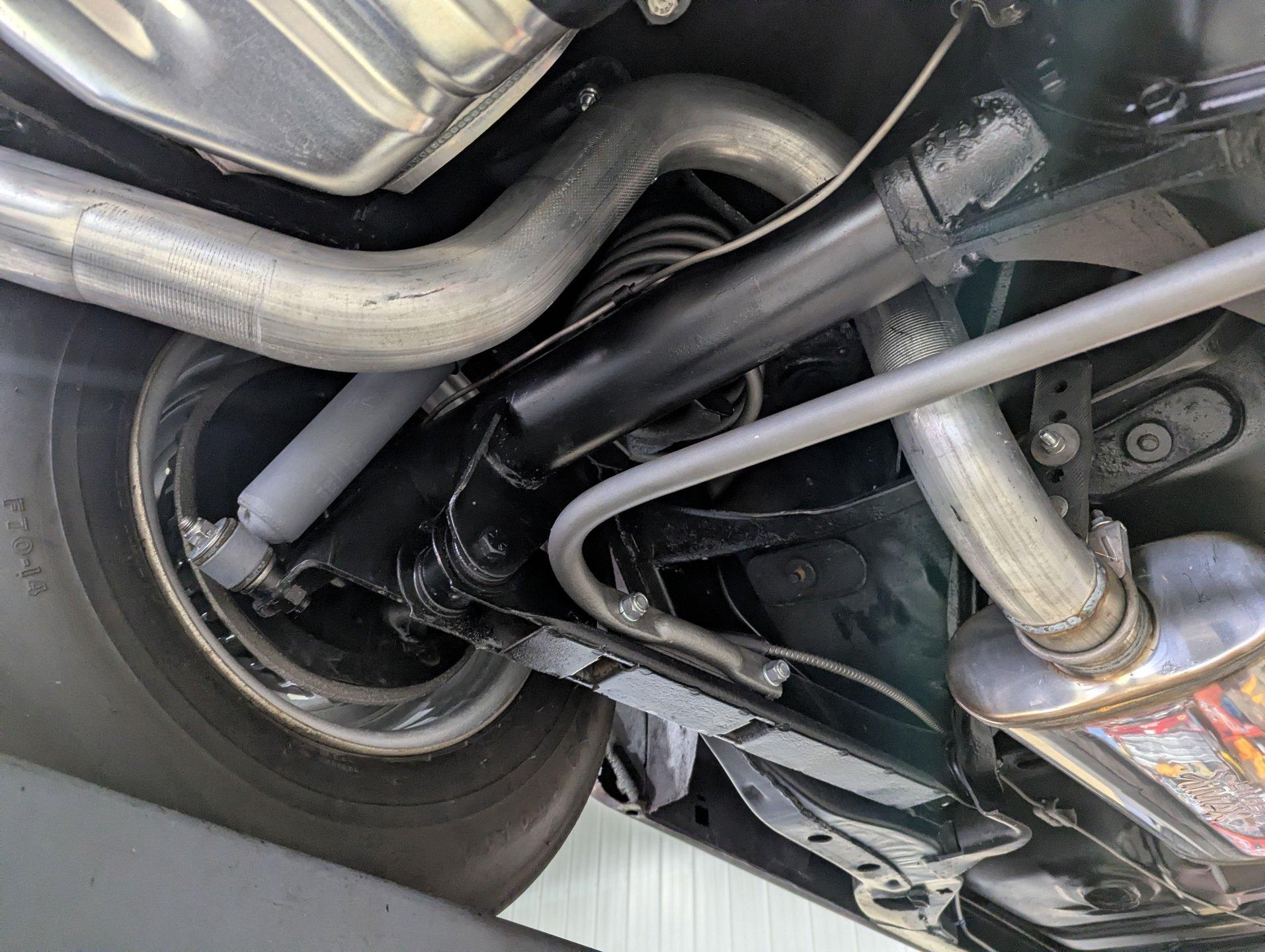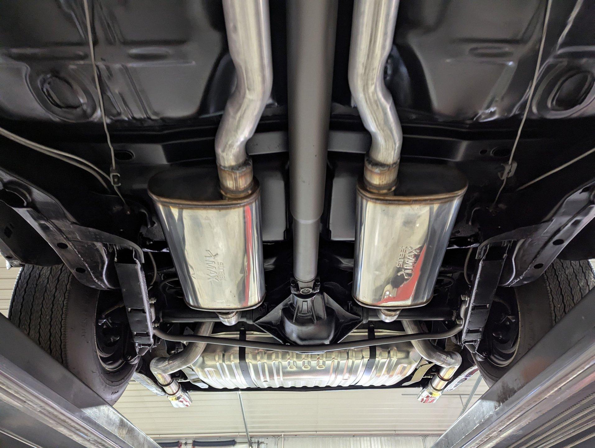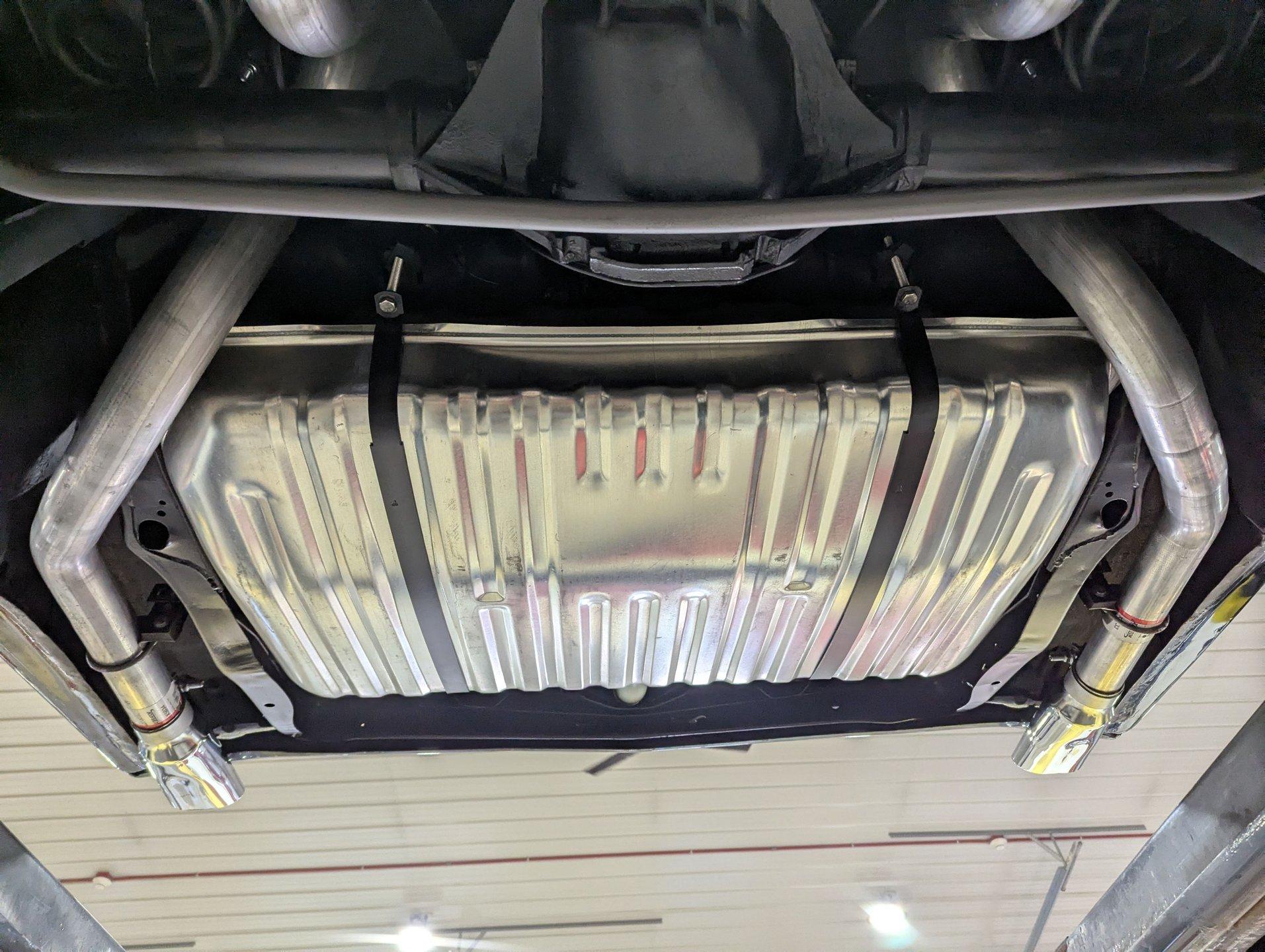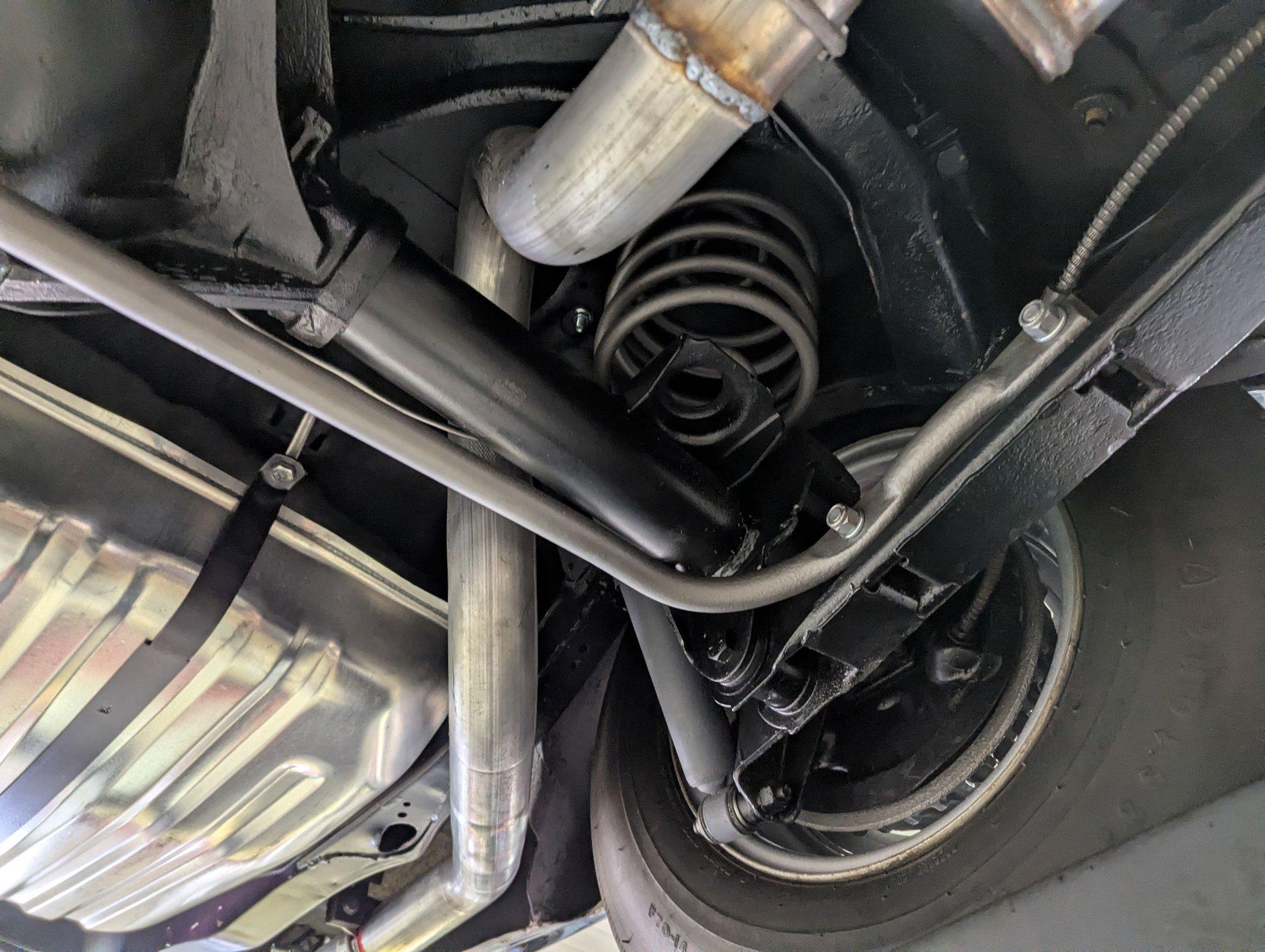 UNDERSIDE: It practically looks like a new 1970 Chevelle underneath this one! It's fully detailed and restored. It has the F-41 suspension which includes front and rear sway bars, and boxed rear control arms. The dual exhaust has stainless Street Max mufflers and correct SS tips. The brake system was completely redone and has disc in front, drum in back and the e-brake assembly is new. The fuel system was replaced including the tank. Looking up at the motor it is clean Chevy orange and has the factory type starter. The correct Muncie 4-speed manual trans and the linkage look fresh. In back is the correct 12 bolt rear end with 3.31 gears. The floors, inner rockers and braces are super clean metal painted a nice, smooth semi gloss black.