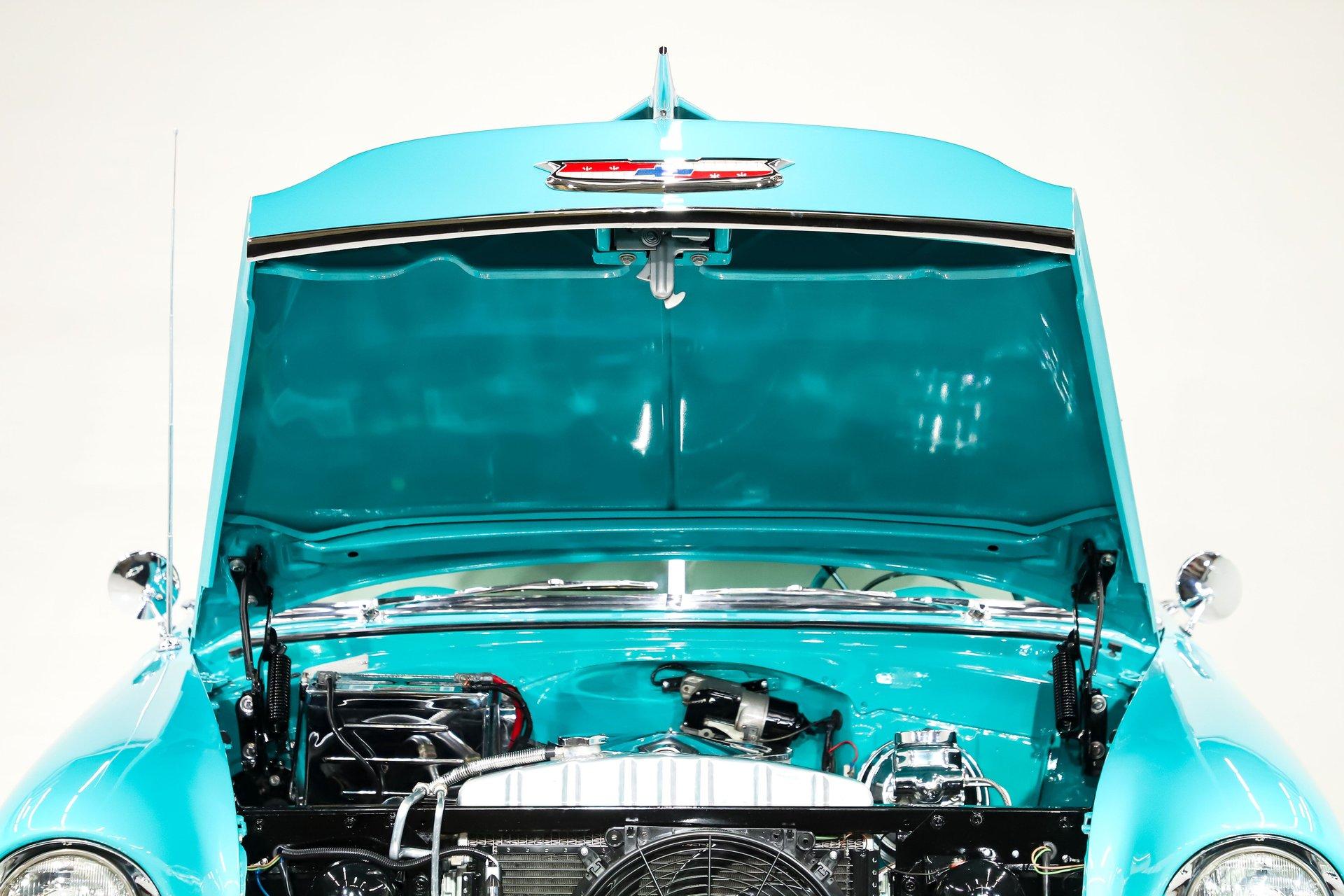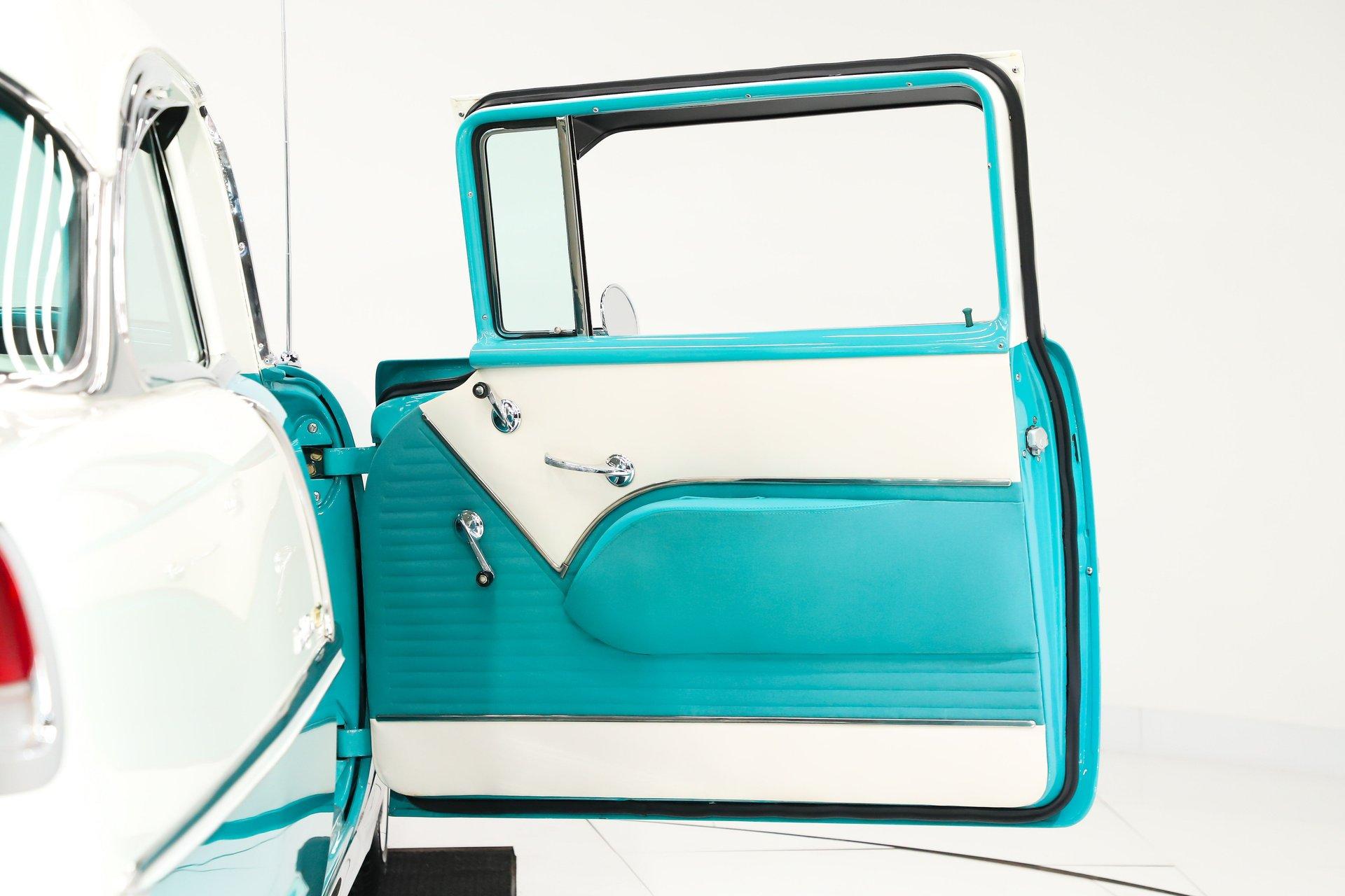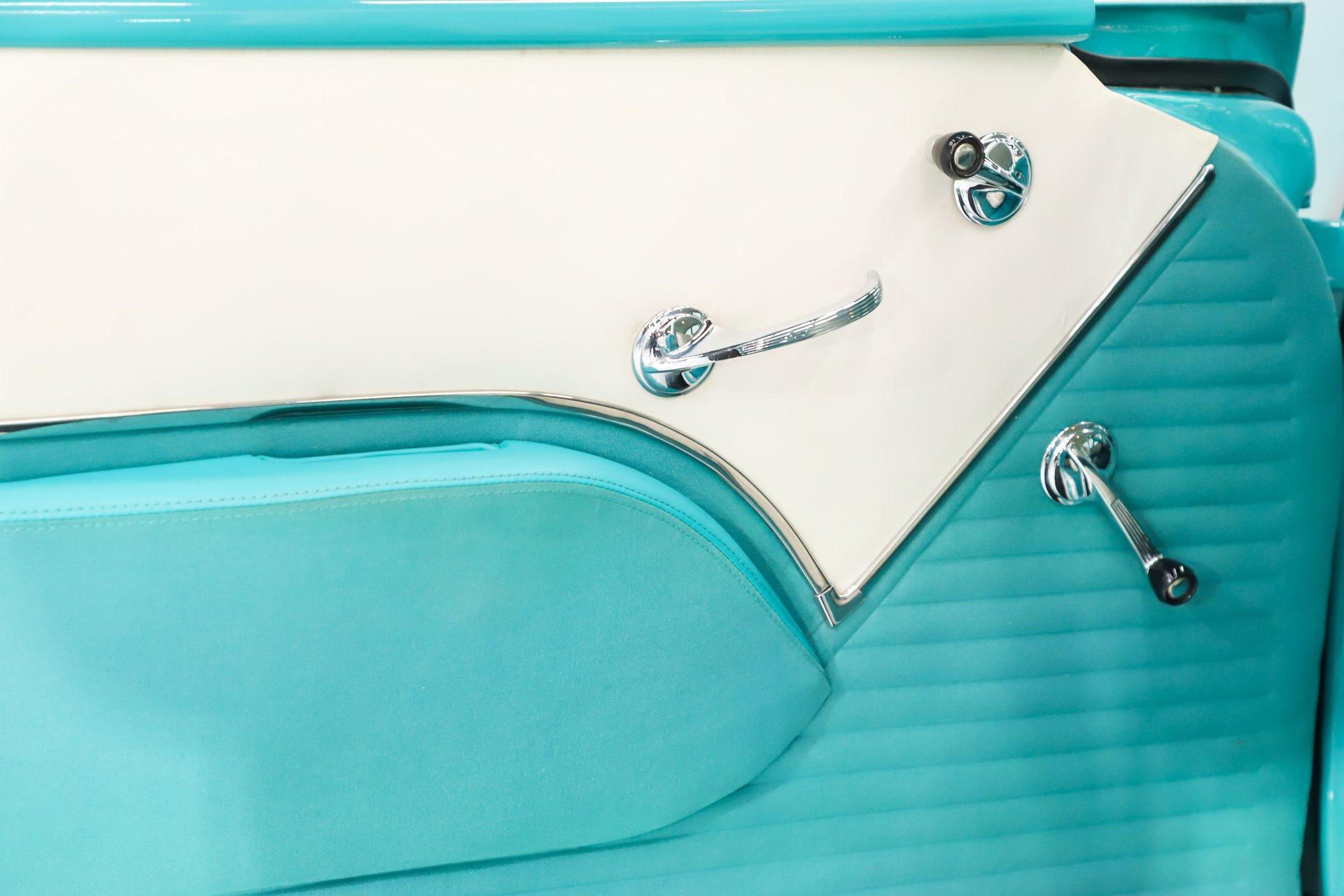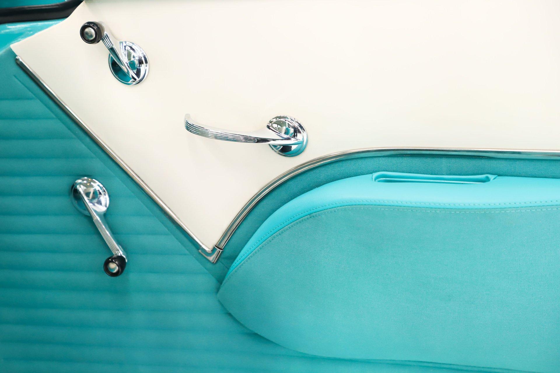 EXTERIOR: Really outstanding fit and finish! Every inch of the body is laser straight, the gaps are right on the money, the doors click shut. Repainted in its refreshing and cheery metallic turquoise and white. The paint has a mirror reflection. It's fully decked out with all of the accessory trim which is polished bright. The glass is really clear and weatherstrips were replaced. There's Halogen headlights in front and blue dots in back. So all that 1955 nostalgia is merged with a fantastic modern stance and a set of 18 inch Boyd Coddington wheels wrapped in G-Force tires.