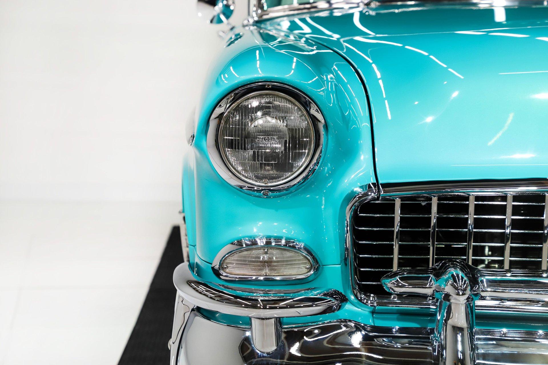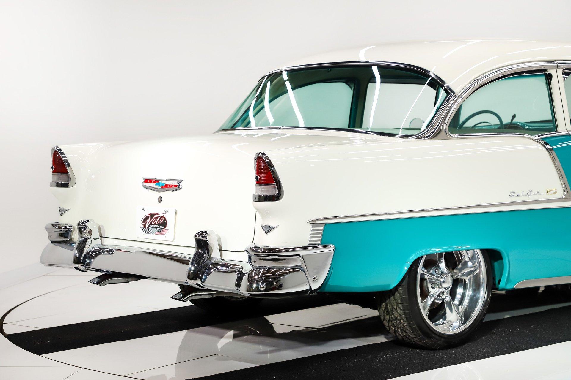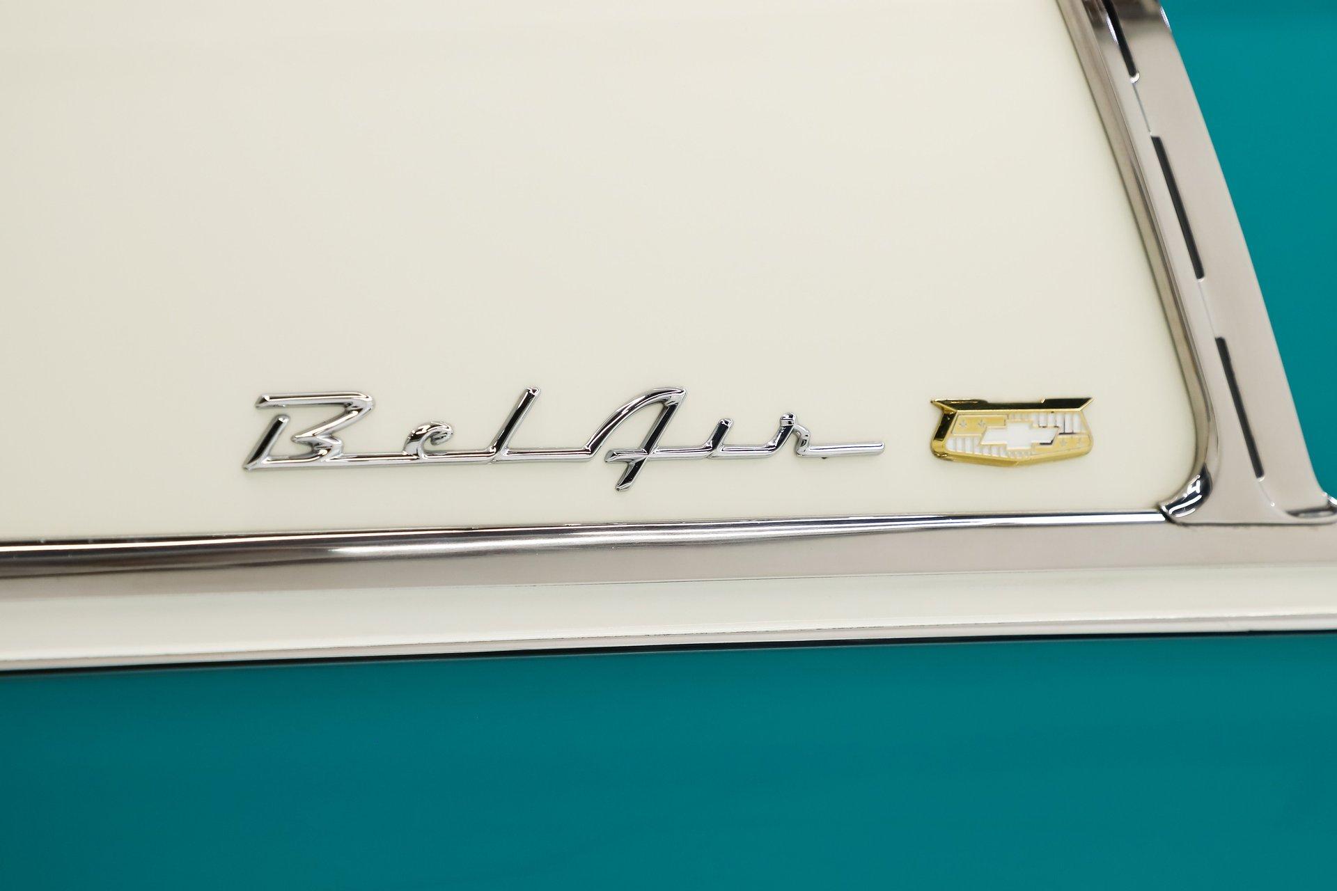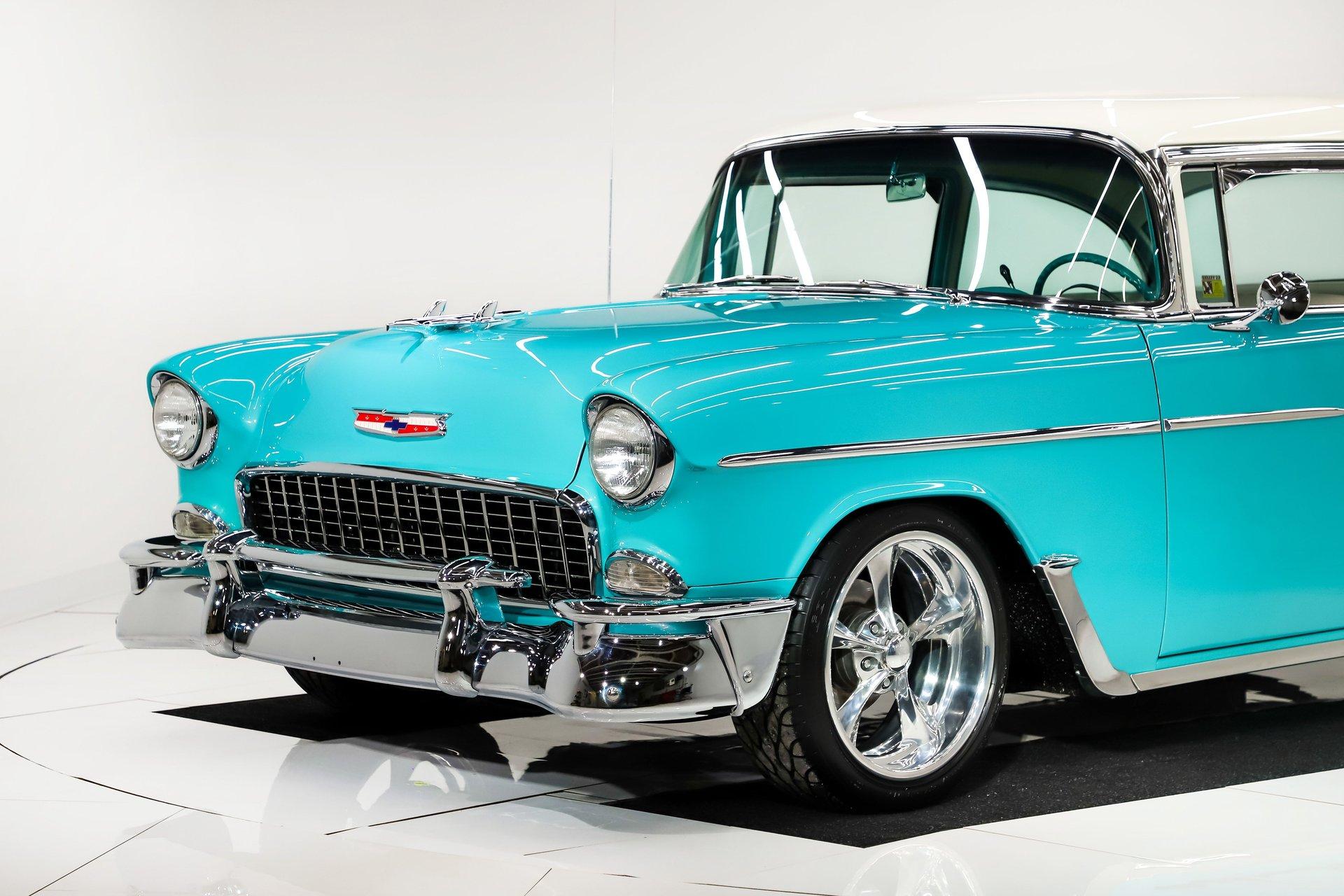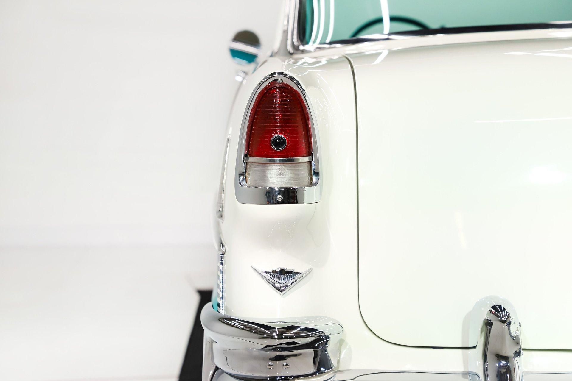 EXTERIOR: Really outstanding fit and finish! Every inch of the body is laser straight, the gaps are right on the money, the doors click shut. Repainted in its refreshing and cheery metallic turquoise and white. The paint has a mirror reflection. It's fully decked out with all of the accessory trim which is polished bright. The glass is really clear and weatherstrips were replaced. There's Halogen headlights in front and blue dots in back. So all that 1955 nostalgia is merged with a fantastic modern stance and a set of 18 inch Boyd Coddington wheels wrapped in G-Force tires.