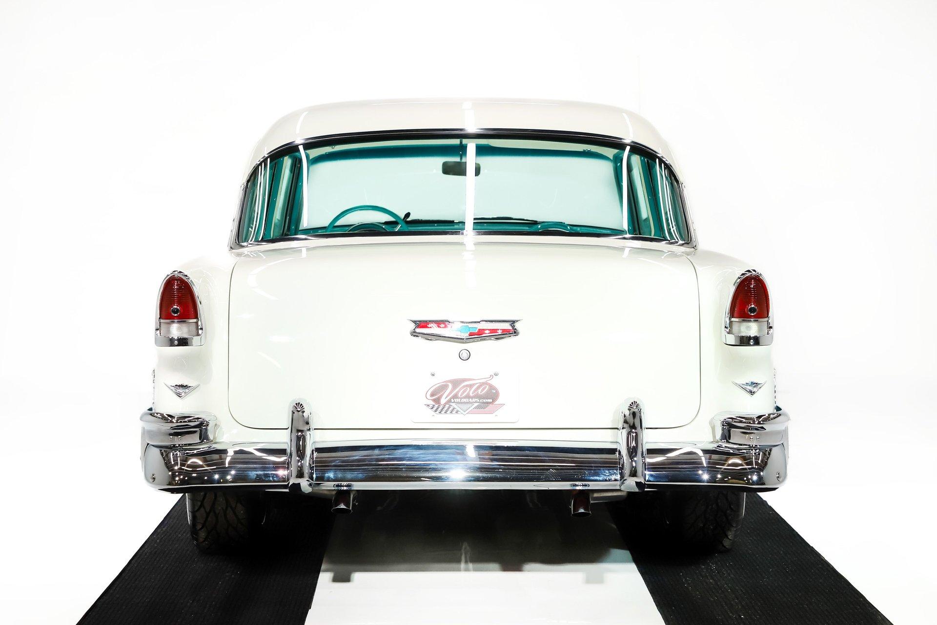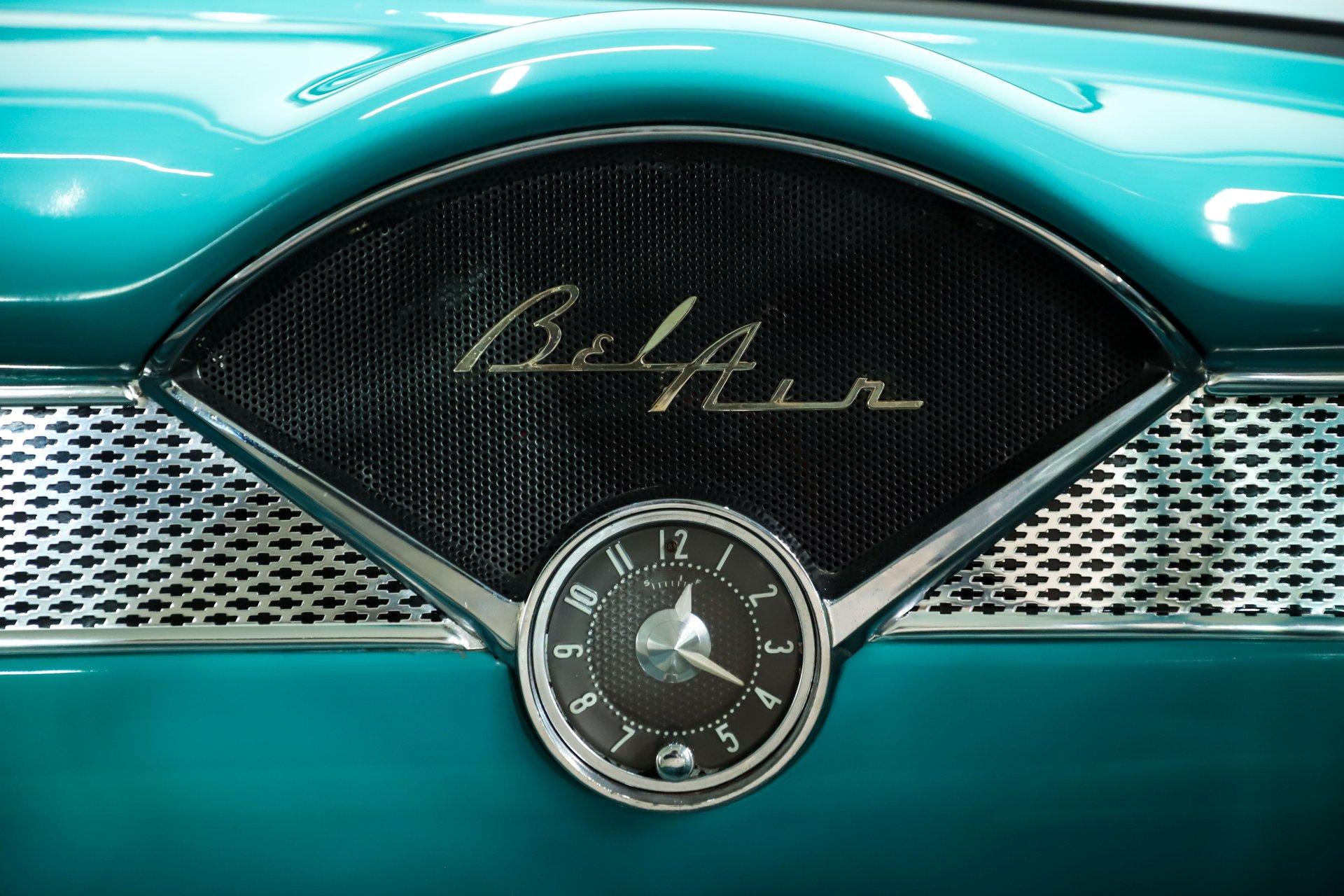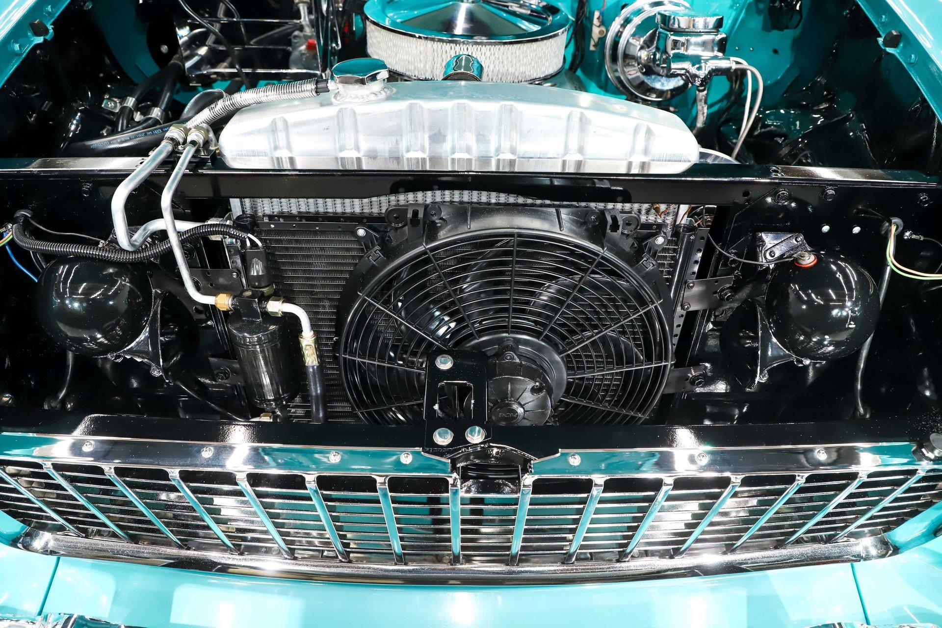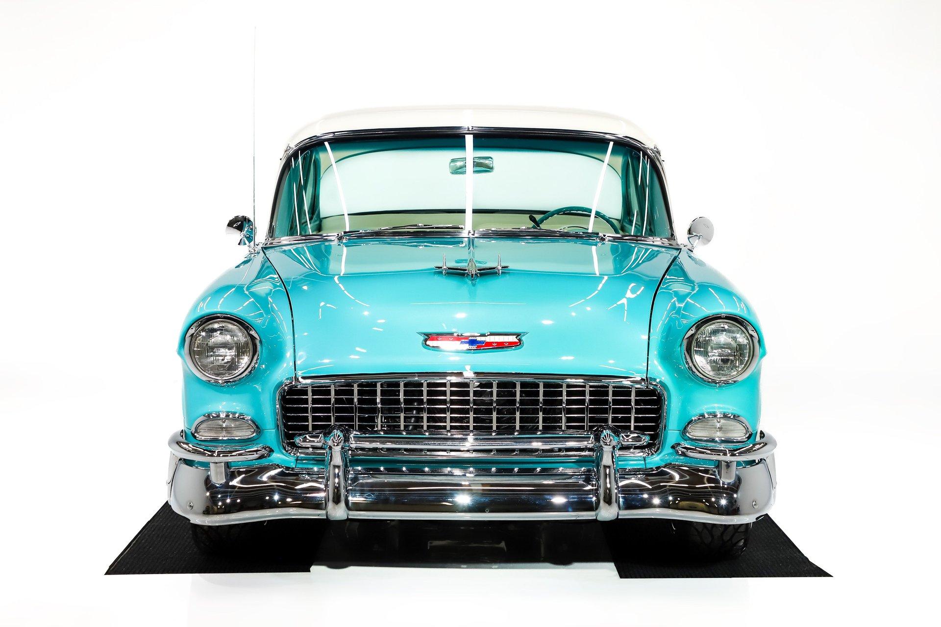 EXTERIOR: Really outstanding fit and finish! Every inch of the body is laser straight, the gaps are right on the money, the doors click shut. Repainted in its refreshing and cheery metallic turquoise and white. The paint has a mirror reflection. It's fully decked out with all of the accessory trim which is polished bright. The glass is really clear and weatherstrips were replaced. There's Halogen headlights in front and blue dots in back. So all that 1955 nostalgia is merged with a fantastic modern stance and a set of 18 inch Boyd Coddington wheels wrapped in G-Force tires.
