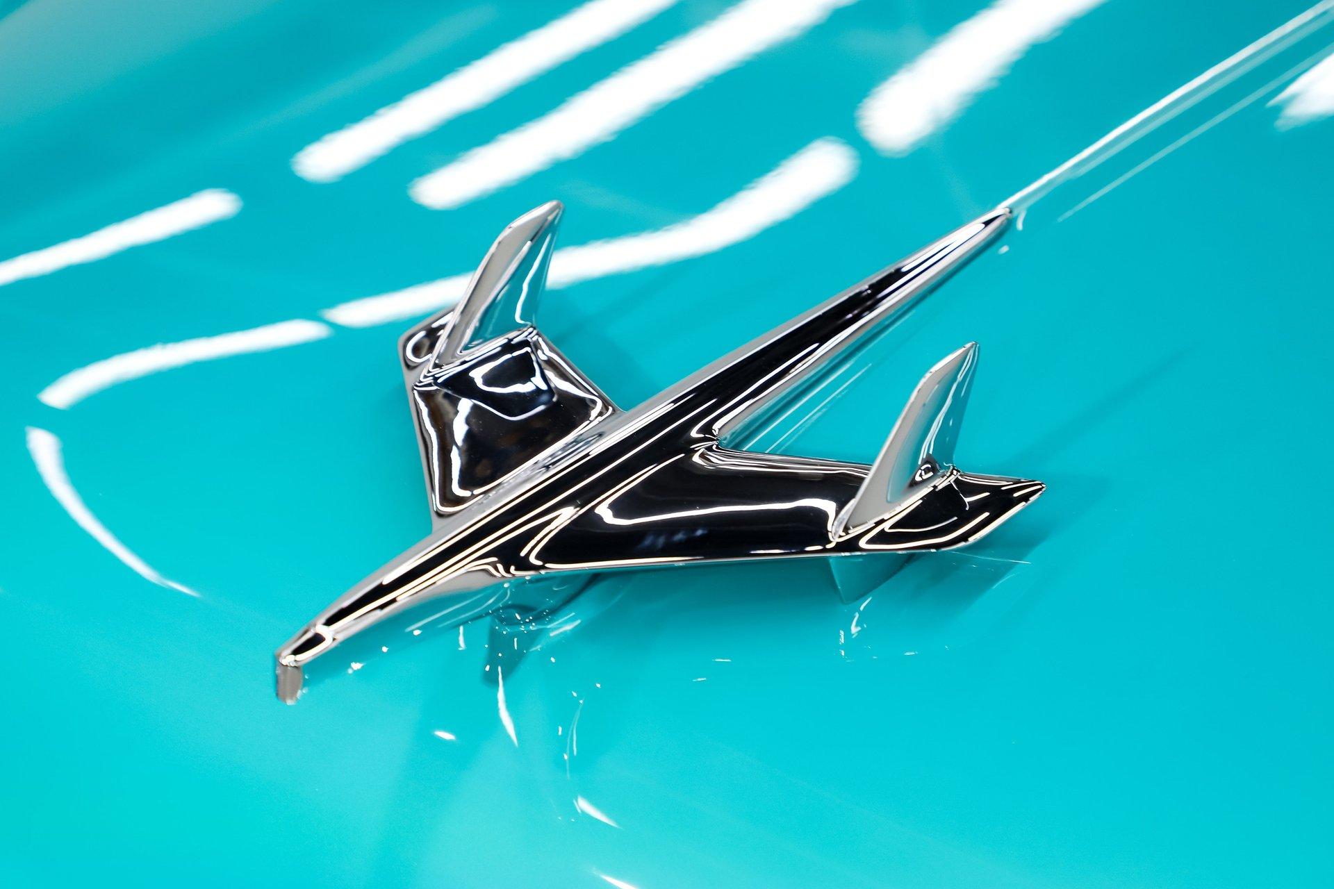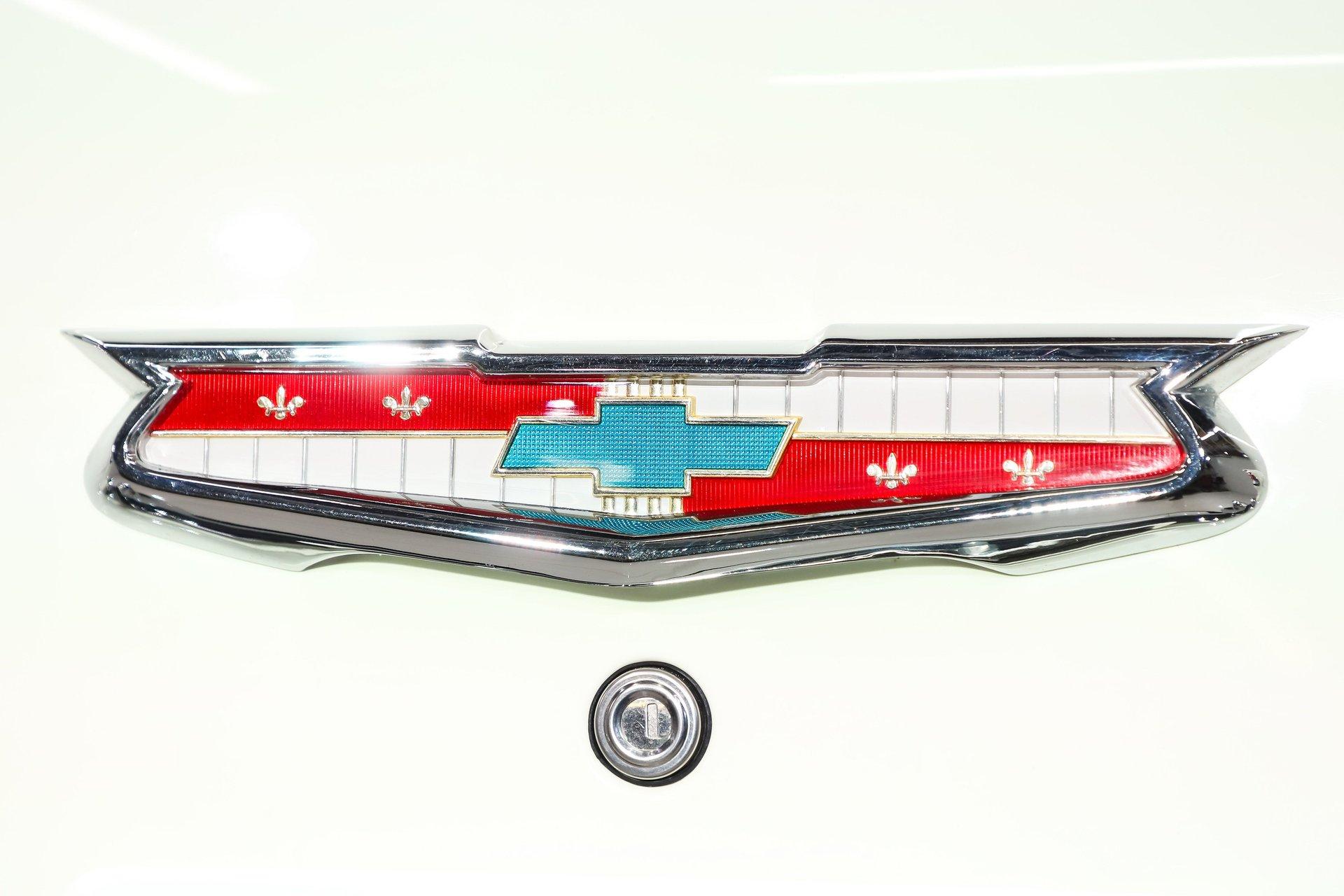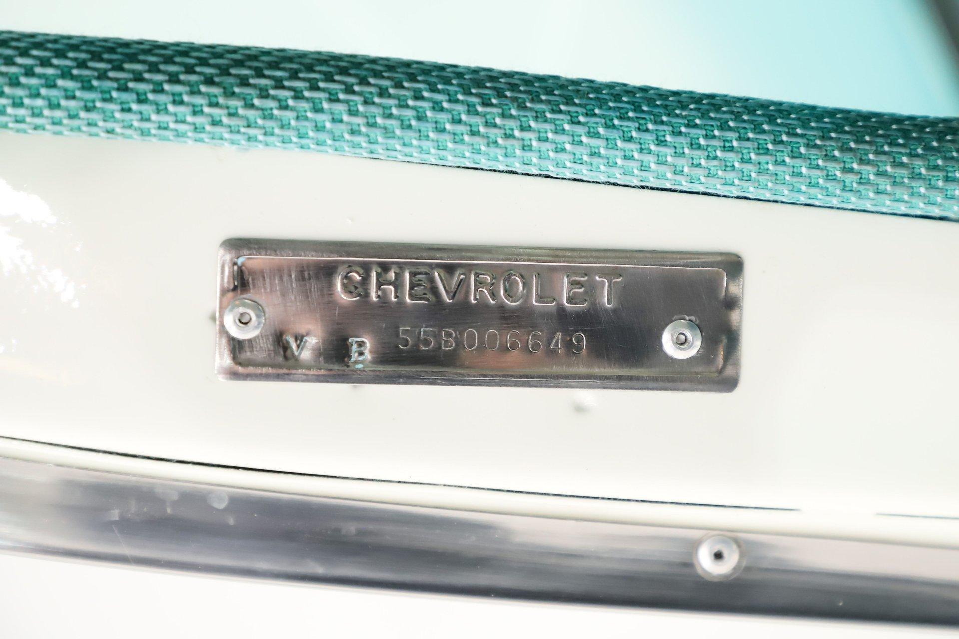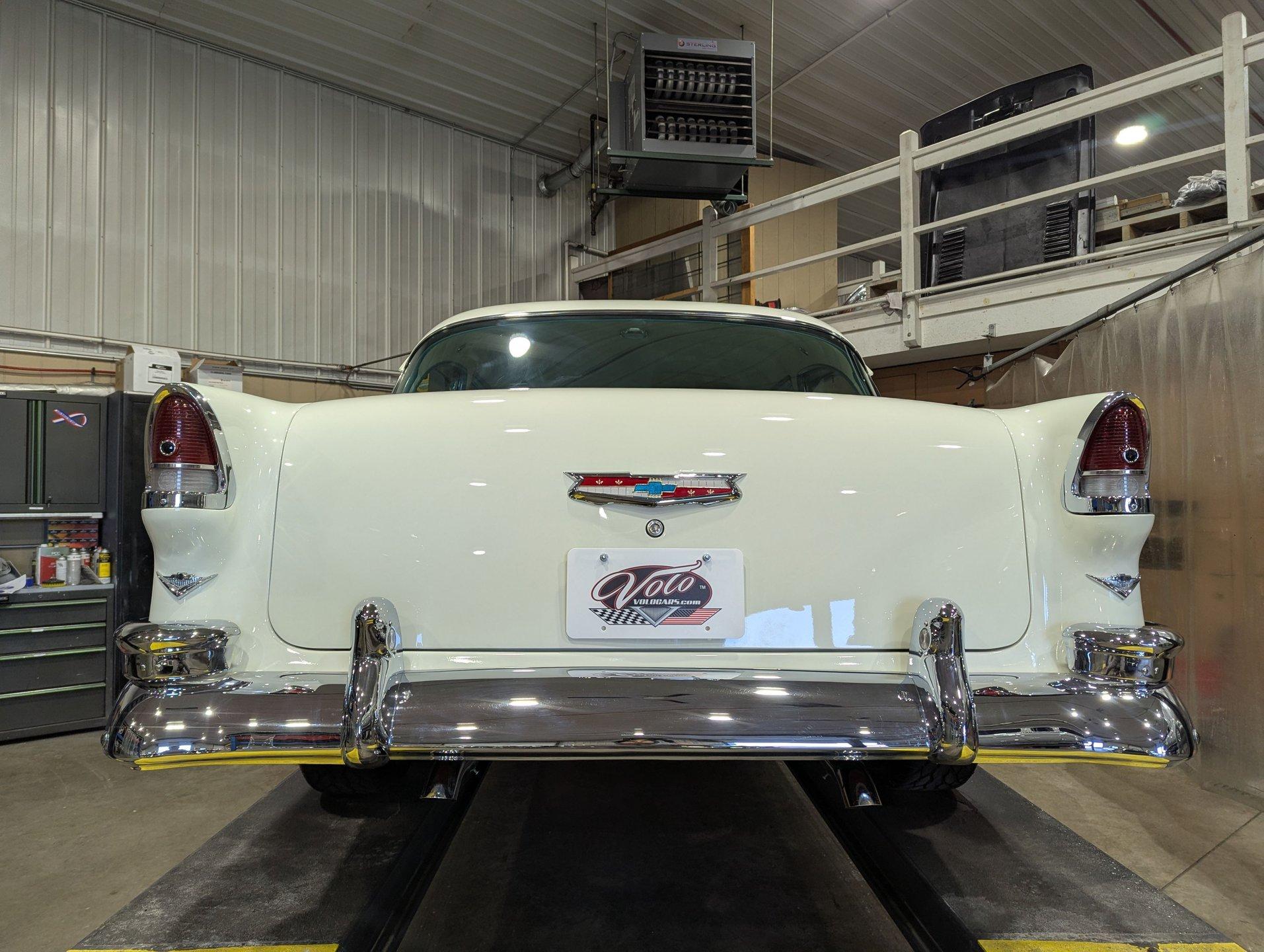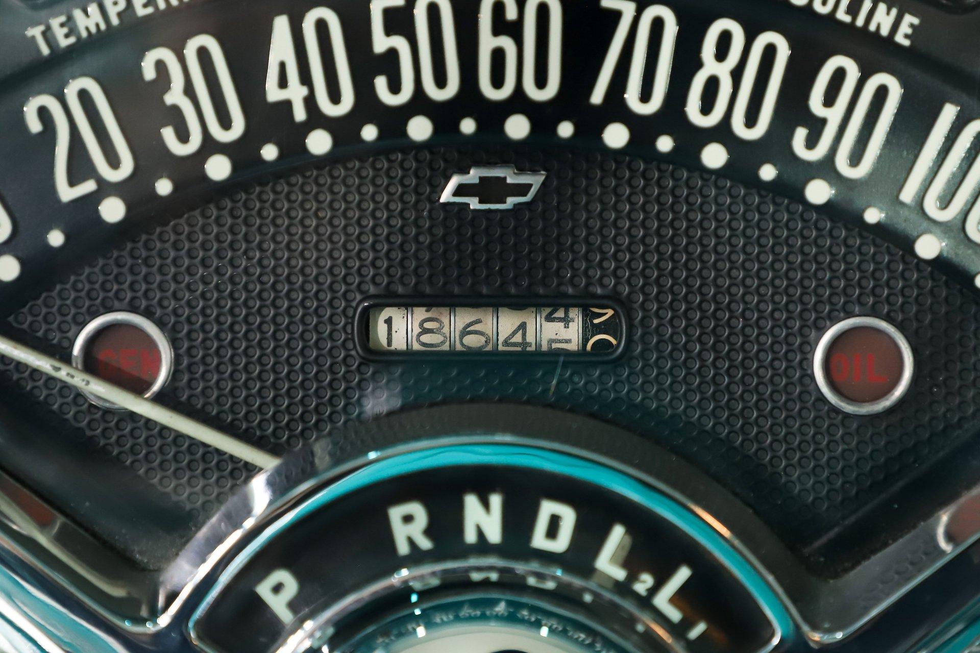 EXTERIOR: Really outstanding fit and finish! Every inch of the body is laser straight, the gaps are right on the money, the doors click shut. Repainted in its refreshing and cheery metallic turquoise and white. The paint has a mirror reflection. It's fully decked out with all of the accessory trim which is polished bright. The glass is really clear and weatherstrips were replaced. There's Halogen headlights in front and blue dots in back. So all that 1955 nostalgia is merged with a fantastic modern stance and a set of 18 inch Boyd Coddington wheels wrapped in G-Force tires.